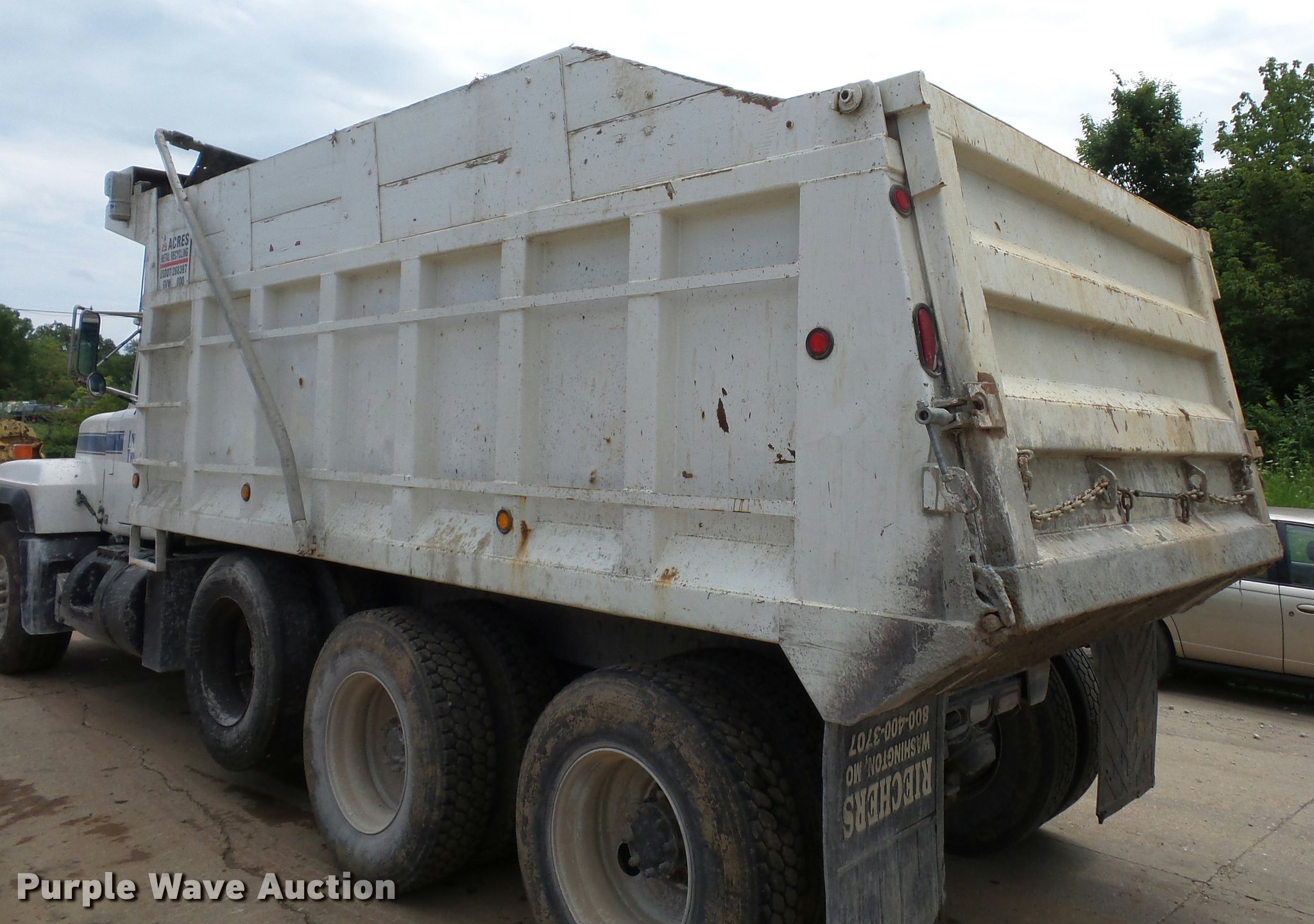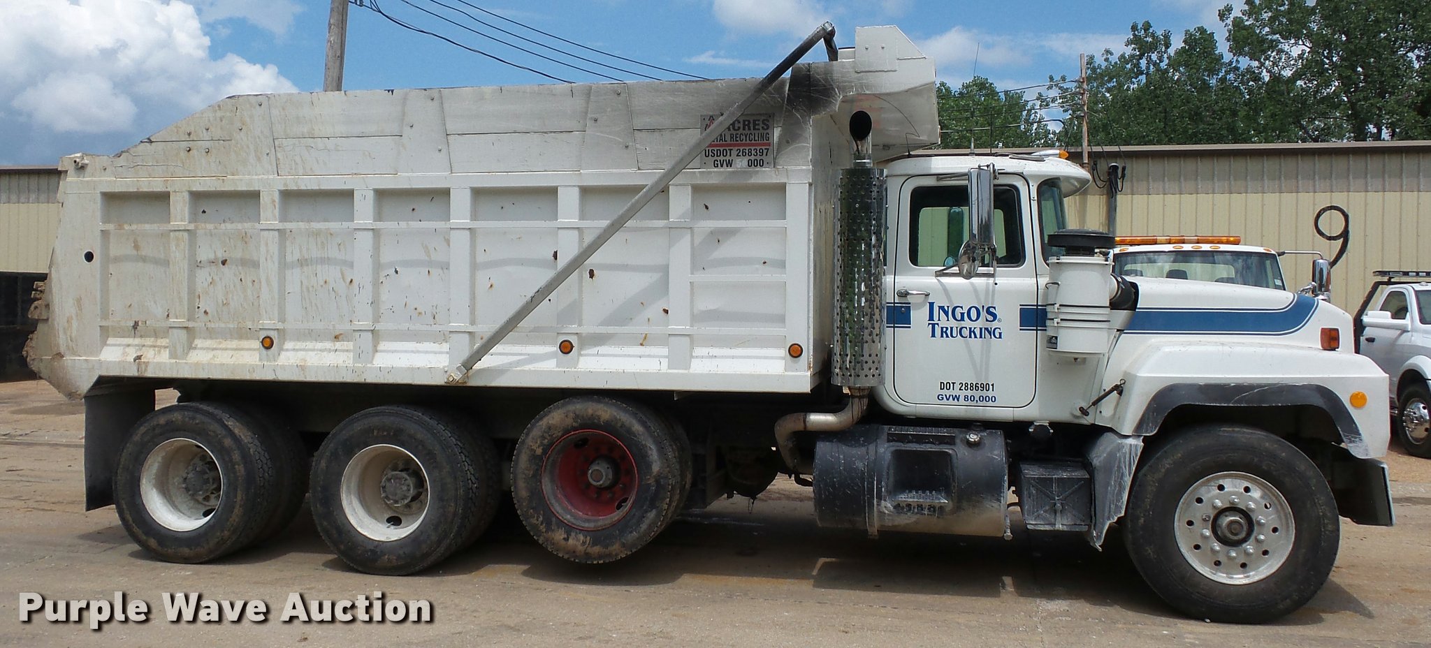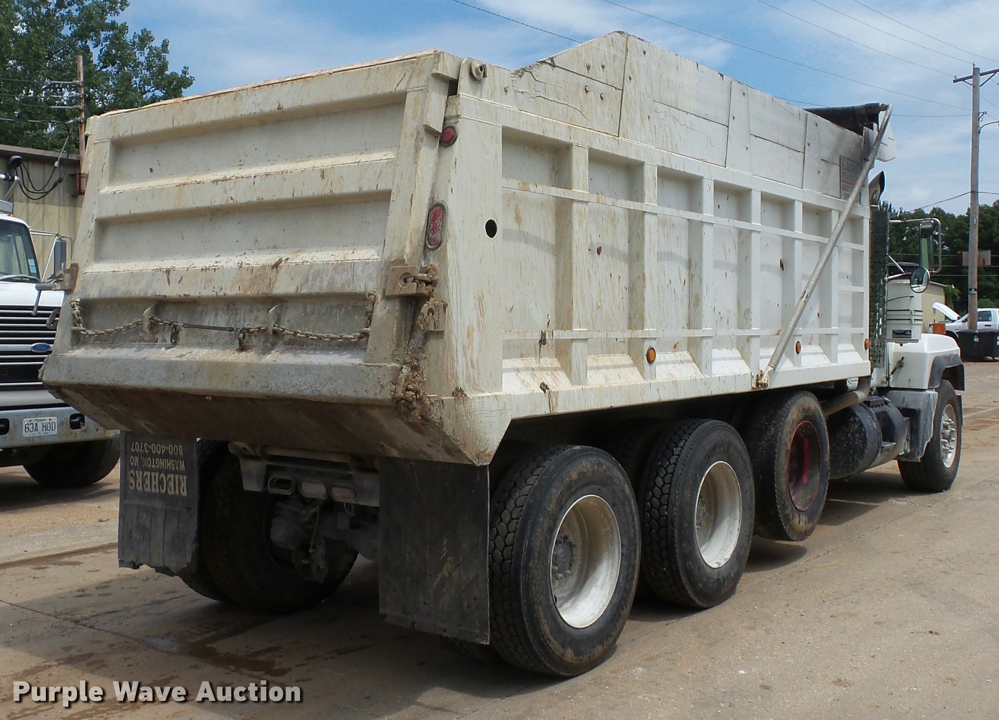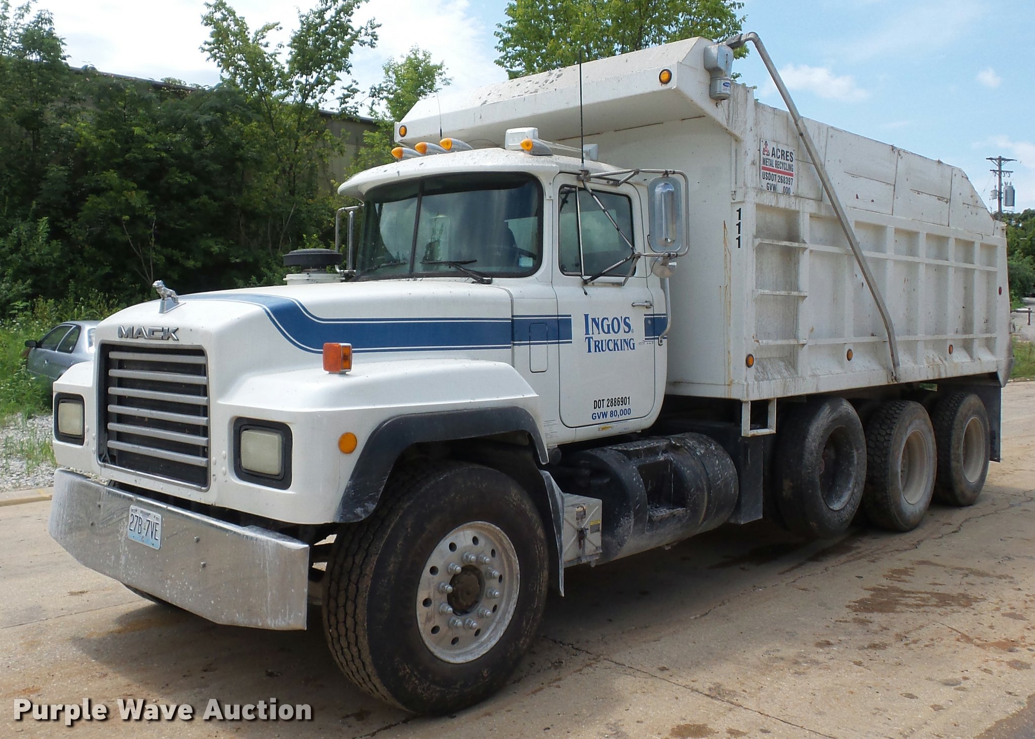 Purple Wave is selling a used Construction Dump Truck in Missouri. This item is a 2003 Mack RD688S dump truck with the following: 242,121 miles on odometer, 13,353 hours on meter, Mack E7 12.0L L6 turbo diesel engine, Manual transmission, Triple axle, Tag axle, AC and heat, Cruise, AM/FM/cassette, Power and heated mirrors, Air suspension seat, PTO, 17'L x 8'W steel dump bed, 46" side height, 21" side board height, Rollover tarp, Air operated end gate, Single ram hoist, Camelback suspension, Air brakes, 385/65R22.5 front tires, 11R22.5 rear tires, 295/75R22.5 tag axle tires, ABS light on