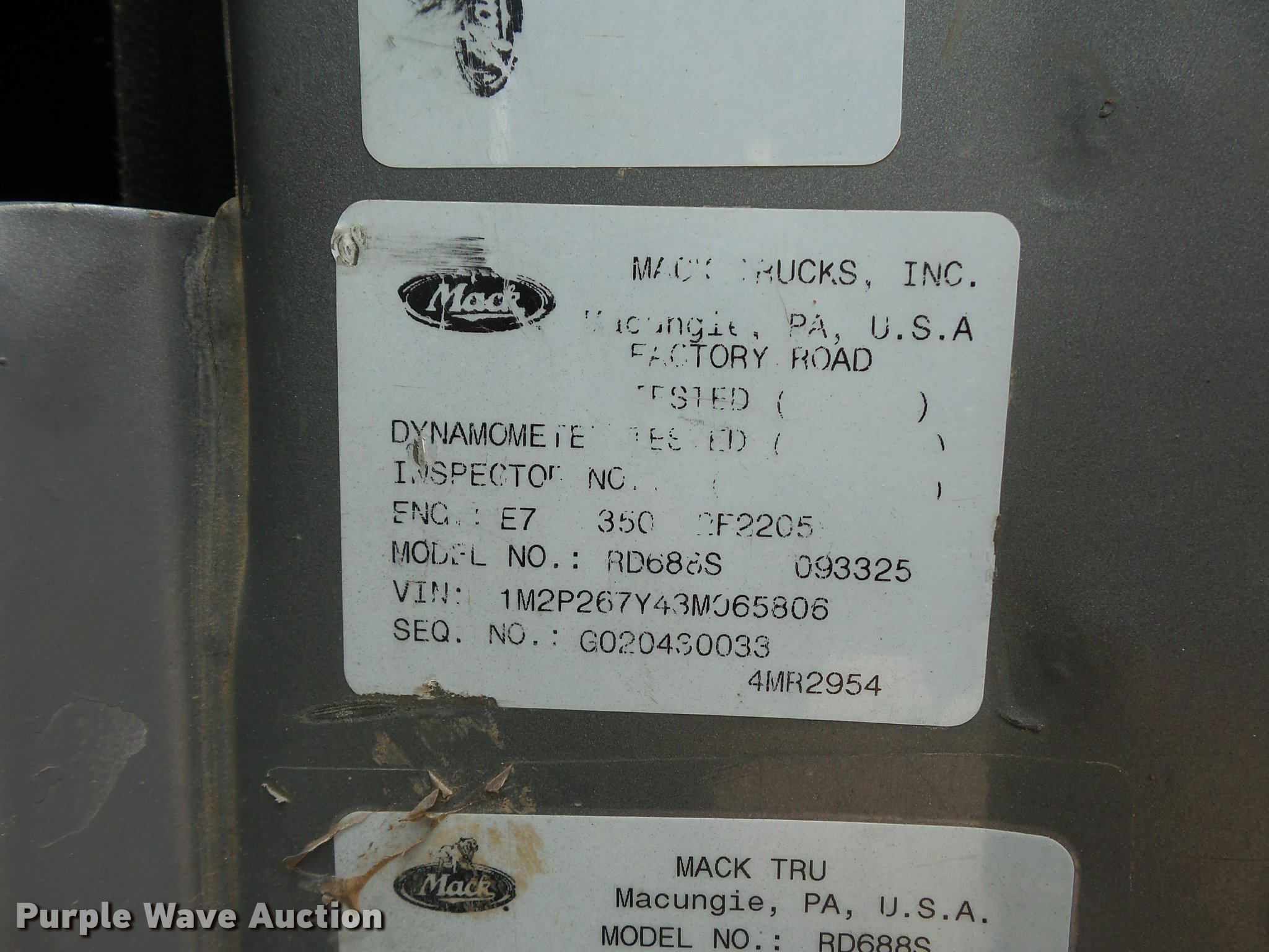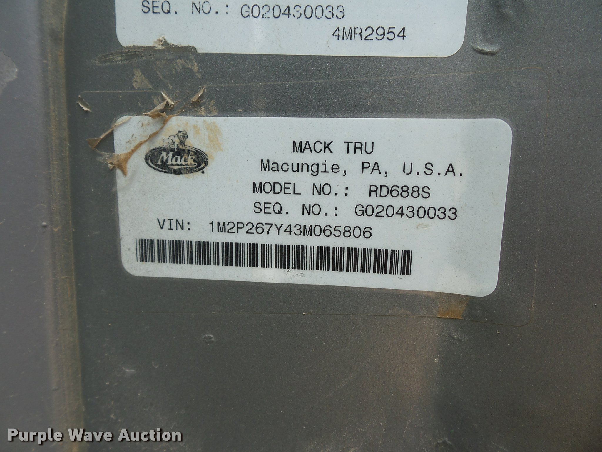 Take a look at this used 2003 Mack RD688S dump truck being sold on September 29th, 2016 in the SOLD! September 29 Construction Equipment Auction made by Mack. Take a look at all of the item information below or take a look at similar auctions for Construction Trucks.