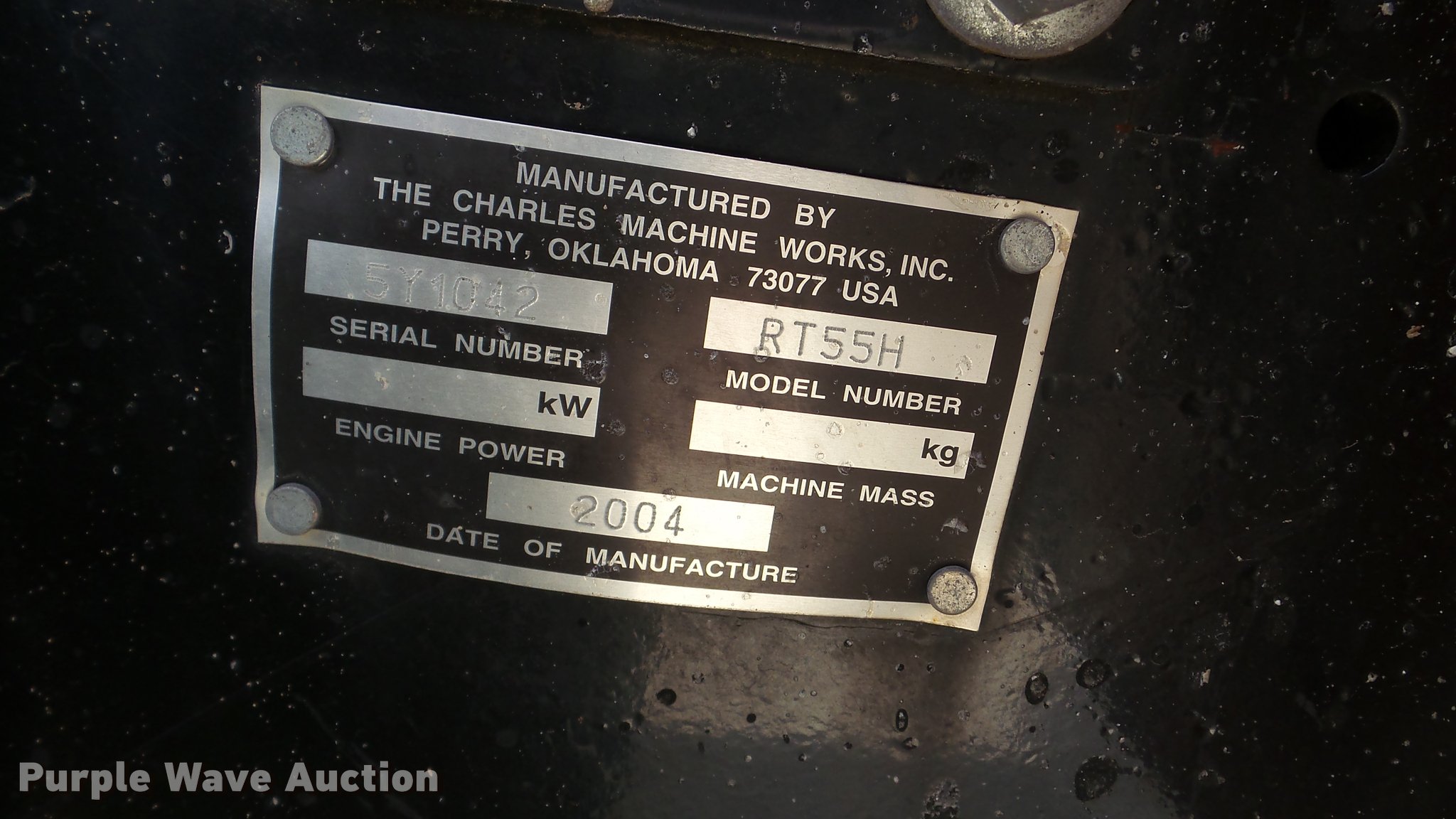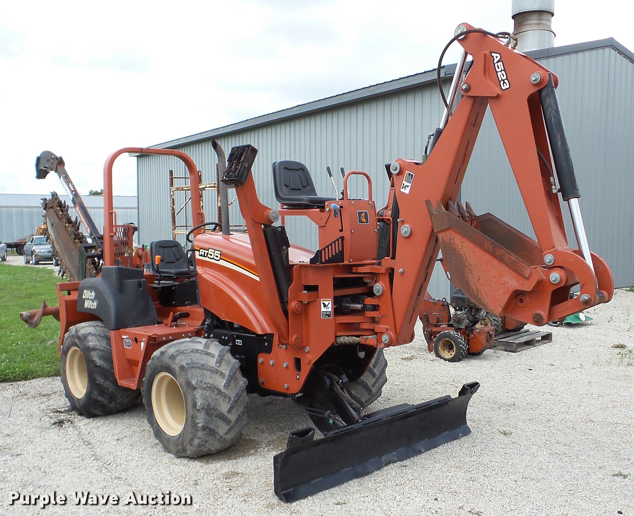 Purple Wave is selling a used Trencher or Rock Saw in Illinois. This item is a 2004 Ditch Witch RT55 trencher with the following: 262 hours on meter, Four cylinder diesel engine, Hydrostatic transmission, OROPS, 6'W four way back fill blade, Model H515 trencher, 5' maximum digging depth, 6"W trench capacity, Hydraulic side shift, Serial 5Y1112, Model A523 backhoe, 4' stick length, 18"W bucket, (5) teeth, Hydraulic outriggers, Serial 520747, 35 x 19.00-16.1 tires, Serial 5Y1042