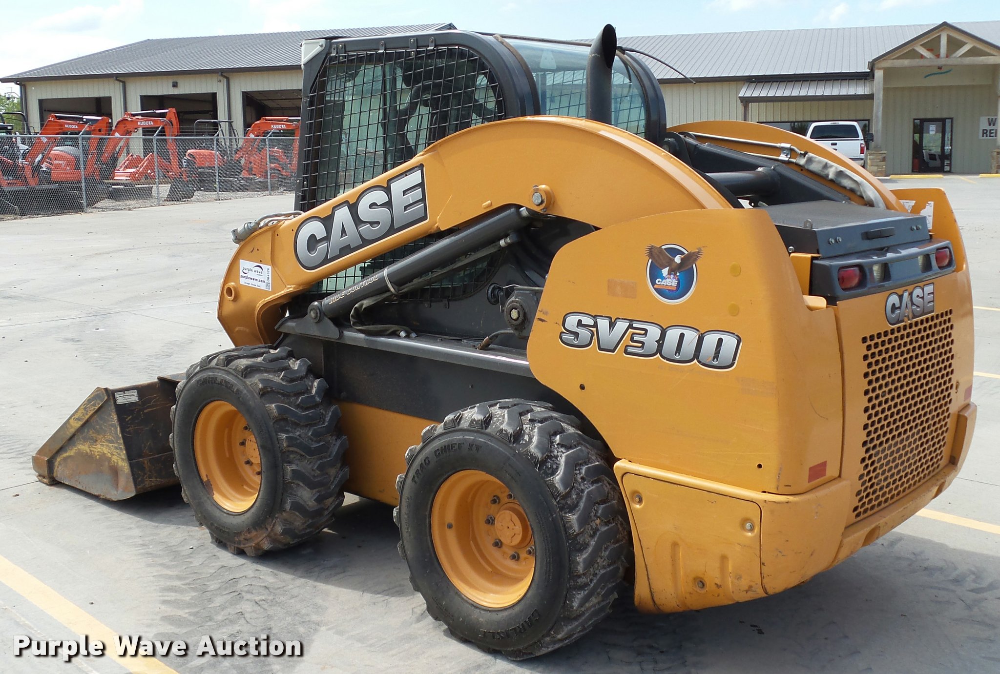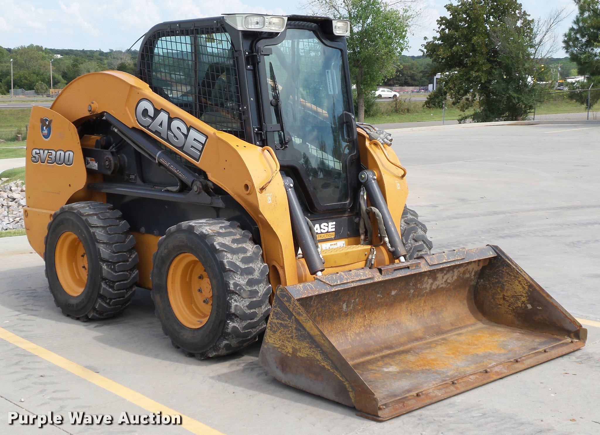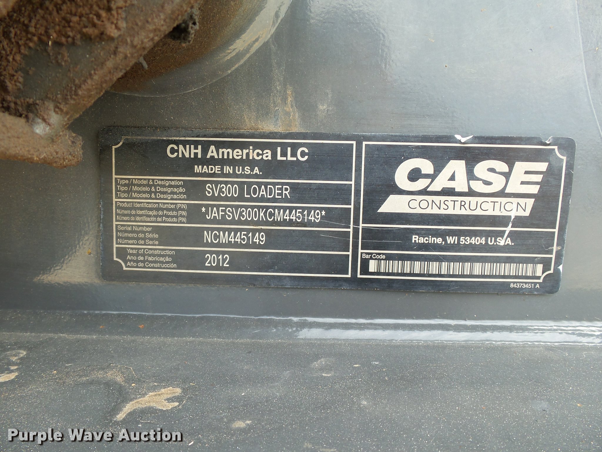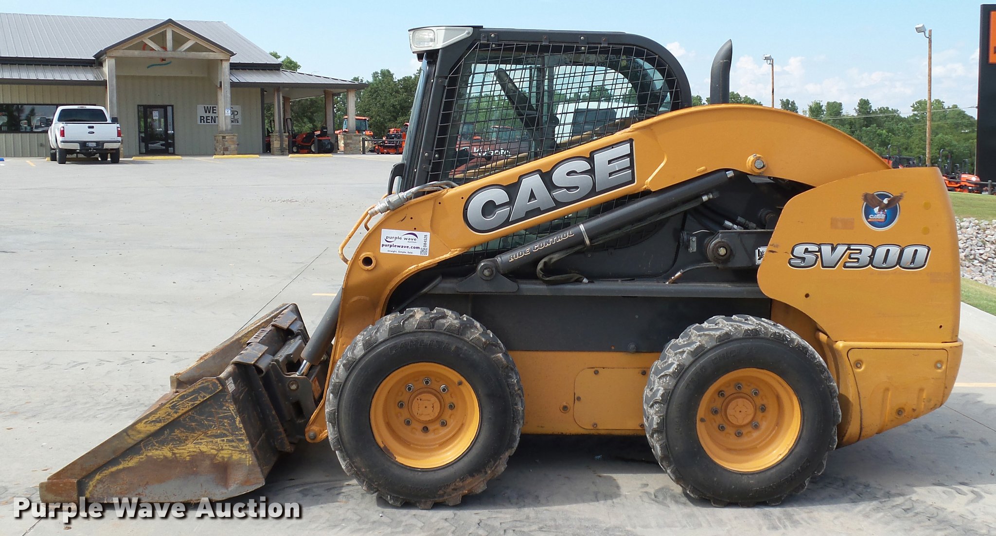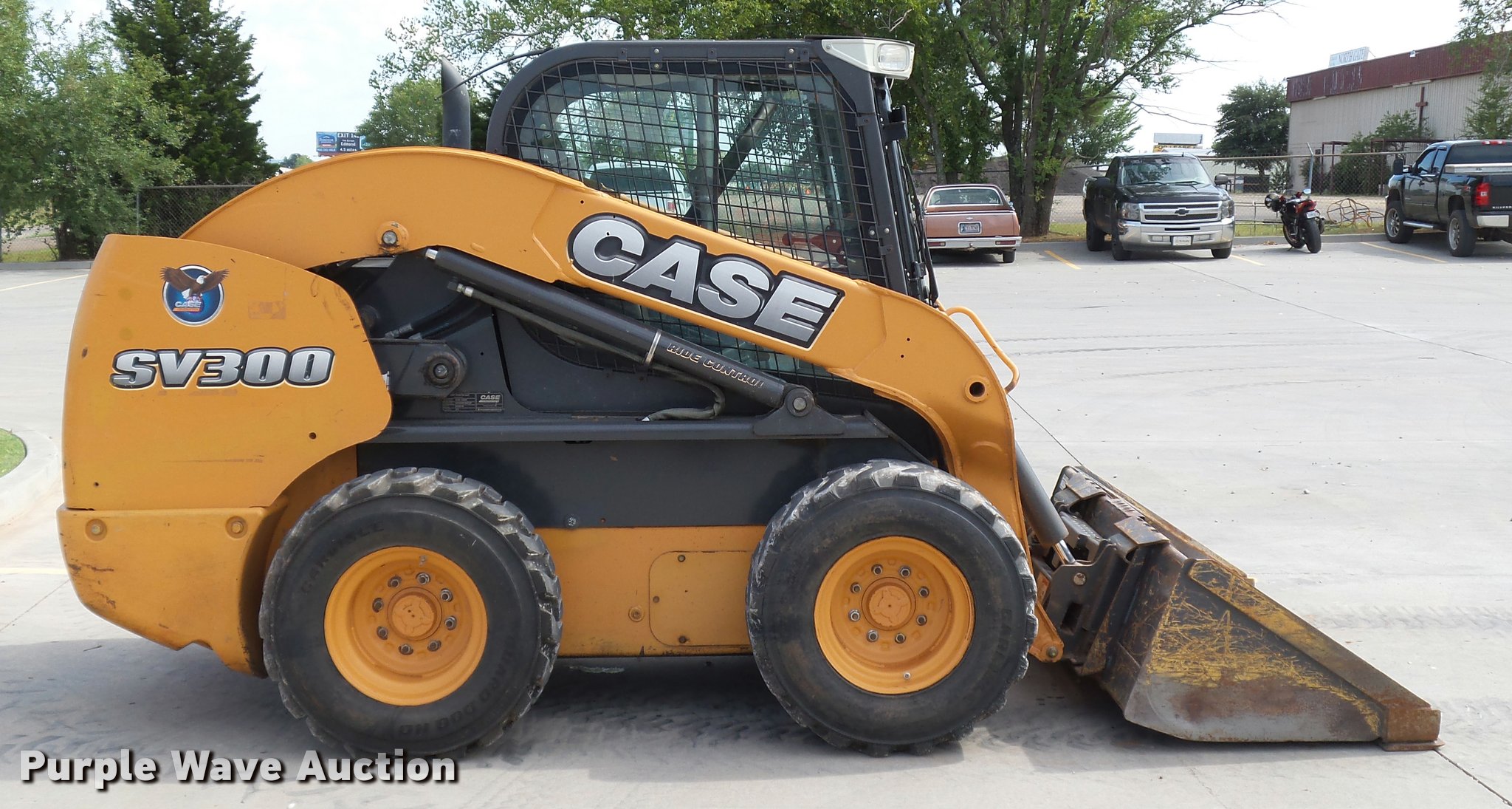 Purple Wave is selling a used Skid Steer Loader in Oklahoma. This item is a 2012 Case SV300 skid steer with the following: 1,433 hours on meter, Case 3.4L four cylinder turbo diesel engine, Two speed hydrostatic transmission, EROPS cab, AC and heat, AM/FM, Joystick controls, Pattern changer, Spring suspension seat, Ride control, Wipers, Front and rear work lights, Case 72"W bucket, Bolt-on cutting edge, Self leveling, Hydraulic quick coupler, High Flow auxiliary hydraulics, 12-16.5 tires, 3,000 lbs load capacity, Serial JAFSV300KCM445149