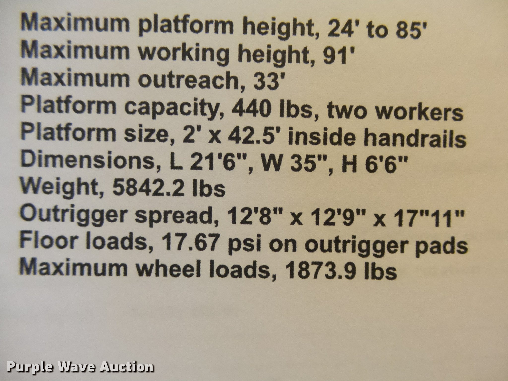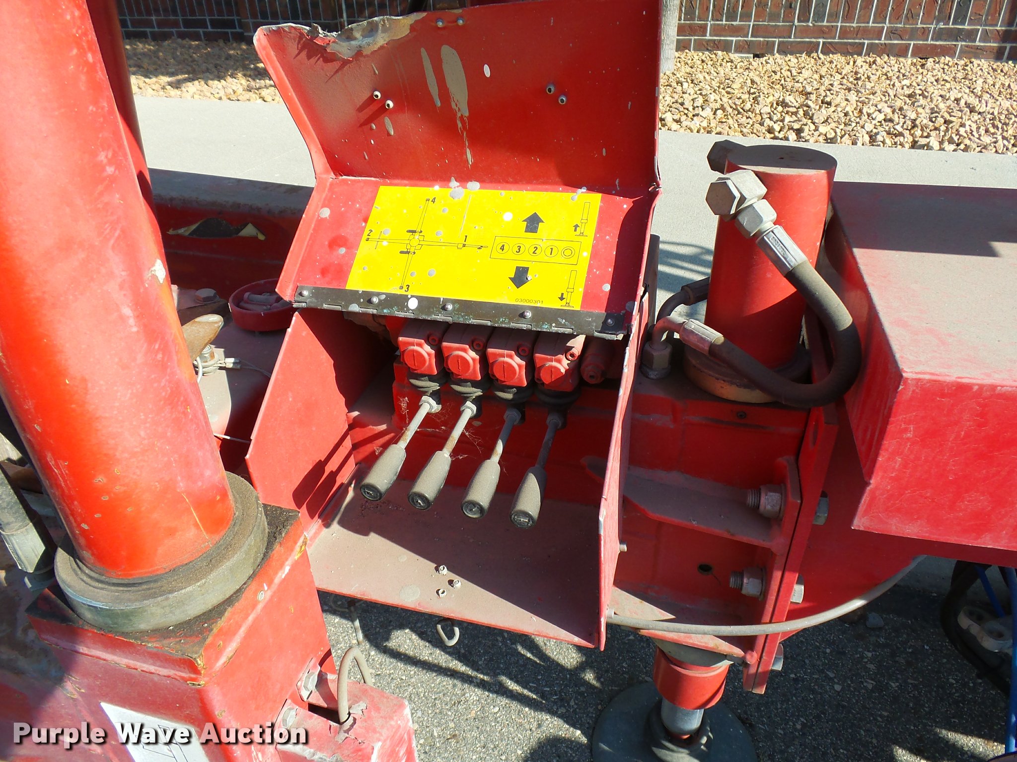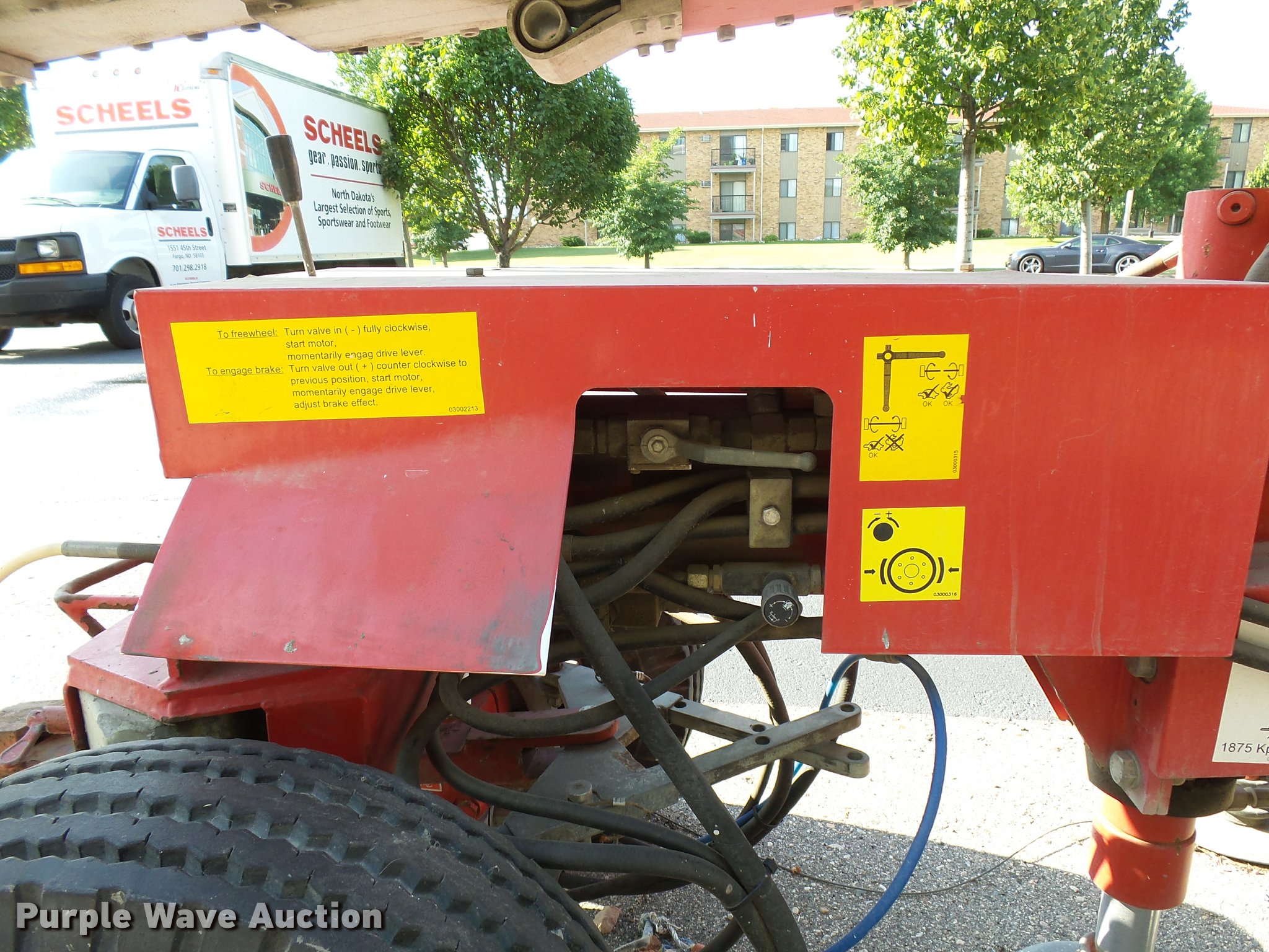 1997 Denka DKN3MK28 boom lift. Electric operation, 440 lbs maximum lift capacity, 75' maximum lift height, 42.5" x 24" platform Powered platform extensions, Platform controls, Self leveling, AC power outlet, Hydraulic outriggers Floor protection pads, Tarp, 6.00 x 9 tires, Serial UJ1DN3M28VDK10228. Scheels All Sports. 1551 45th Street SW. Fargo, ND 58103