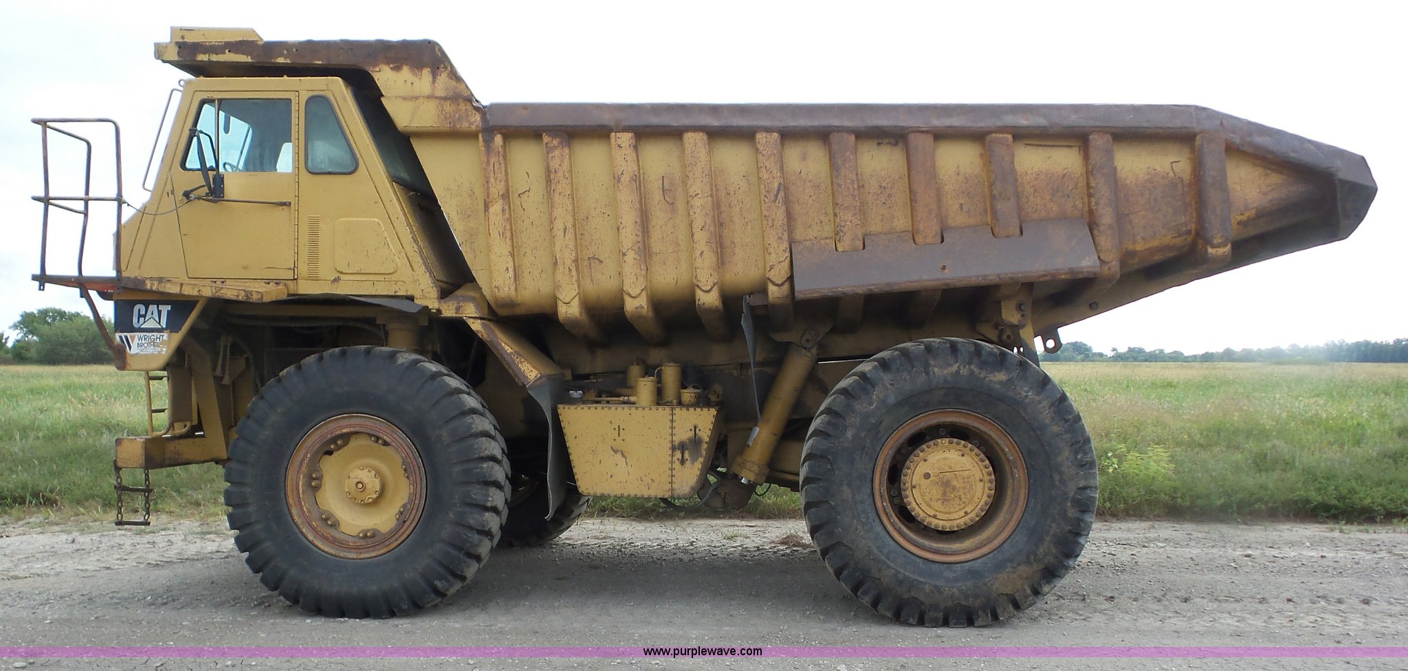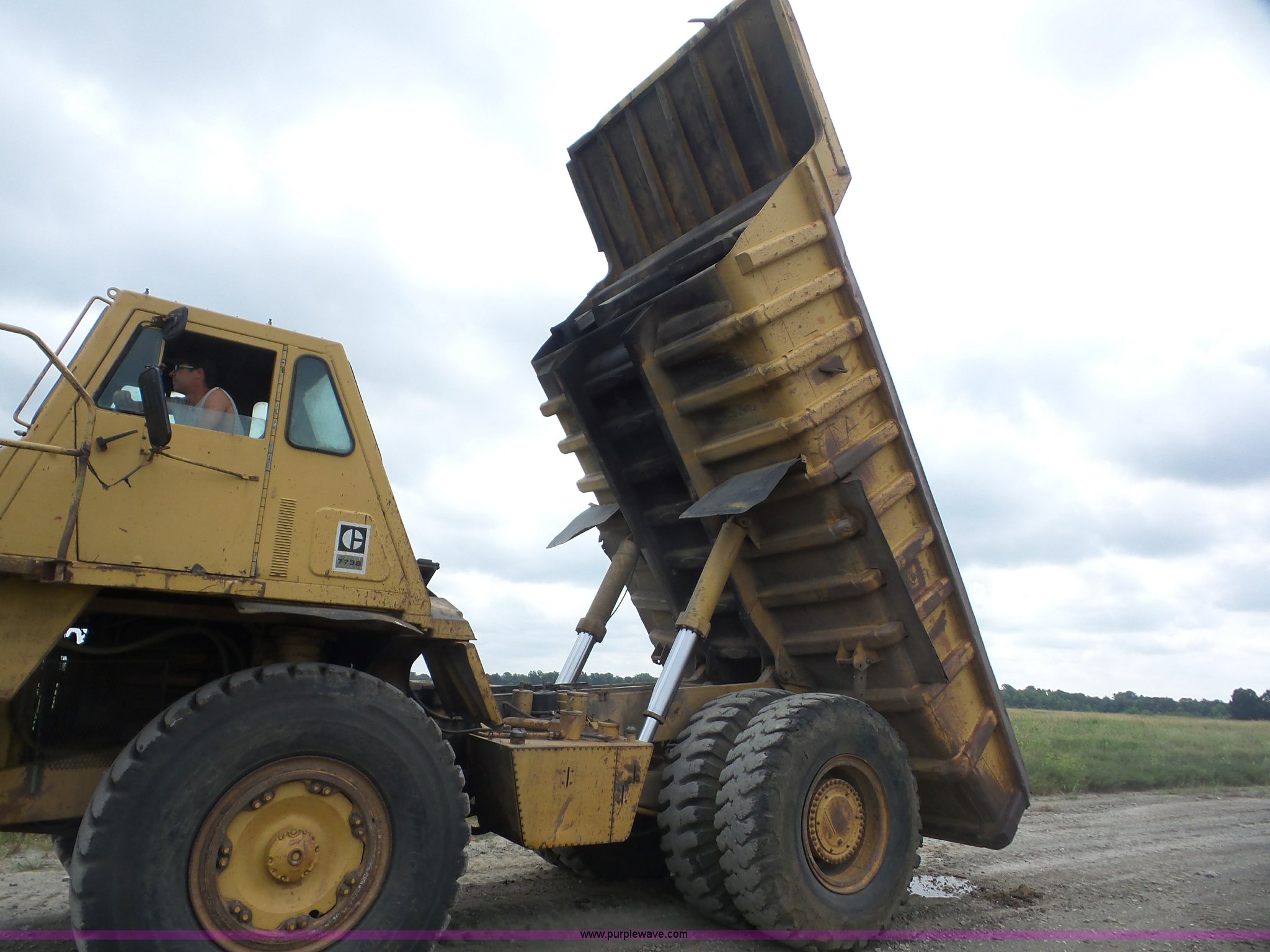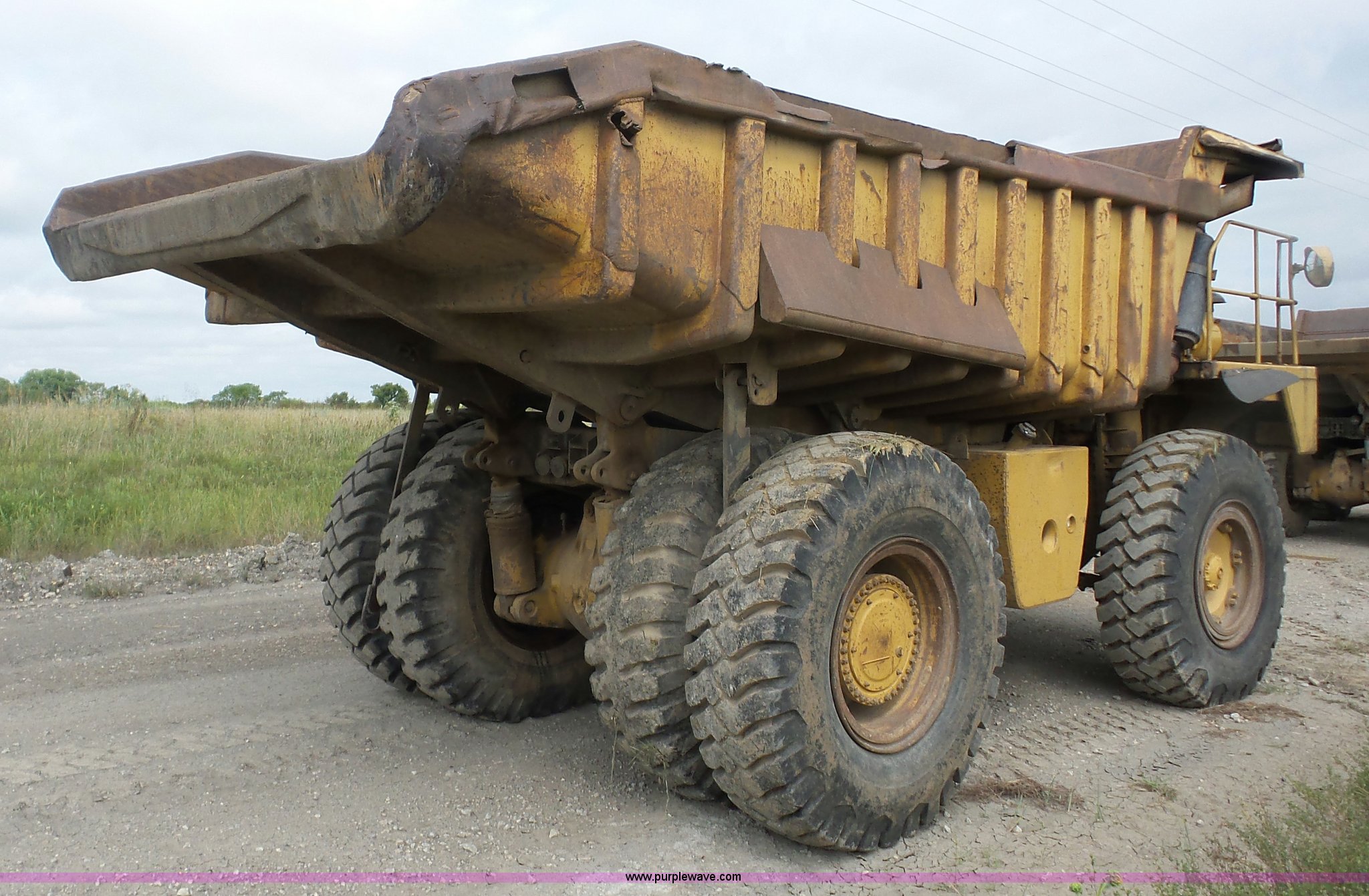 Purple Wave is selling a used Off Road Haul Truck in Kansas. This item is a 1987 Caterpillar 773B haul truck with the following: 60,442 miles on odometer, Approximately 40,182 hours on meter, Caterpillar 3412 12 cylinder twin turbo diesel engine, Automatic transmission, Single axle, AC and heat, Steel dump bed, Dual ram hoist, 50 ton capacity, Air over hydraulic brakes, 21.00-35 tires, Unit# 506