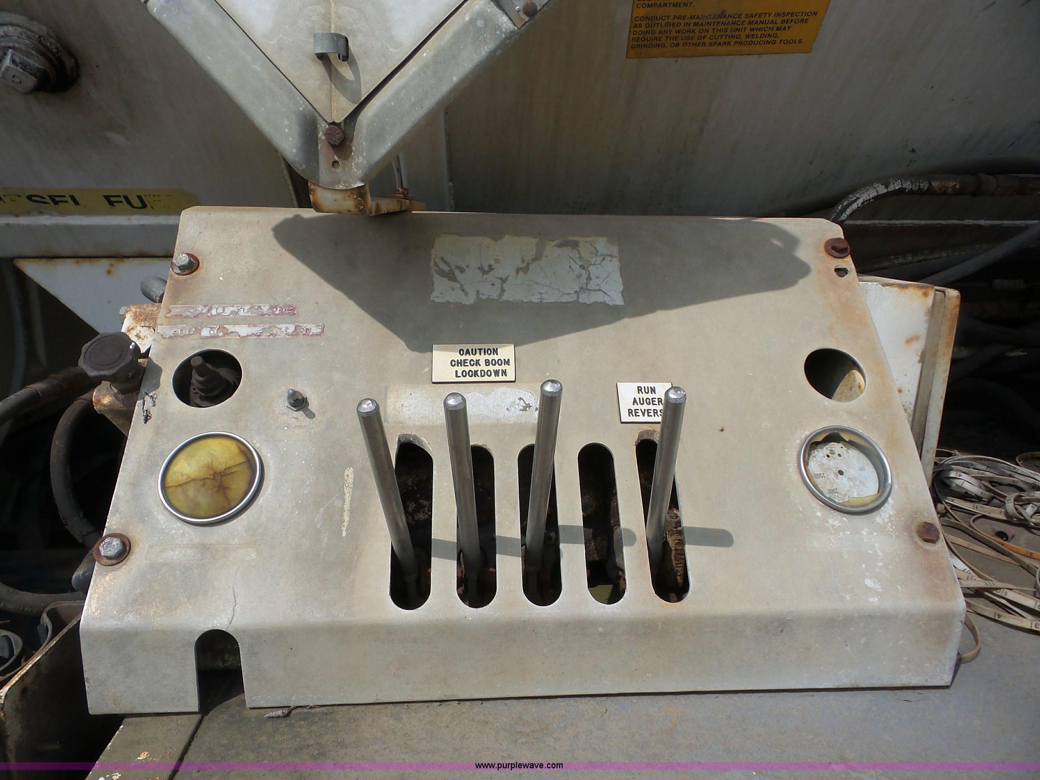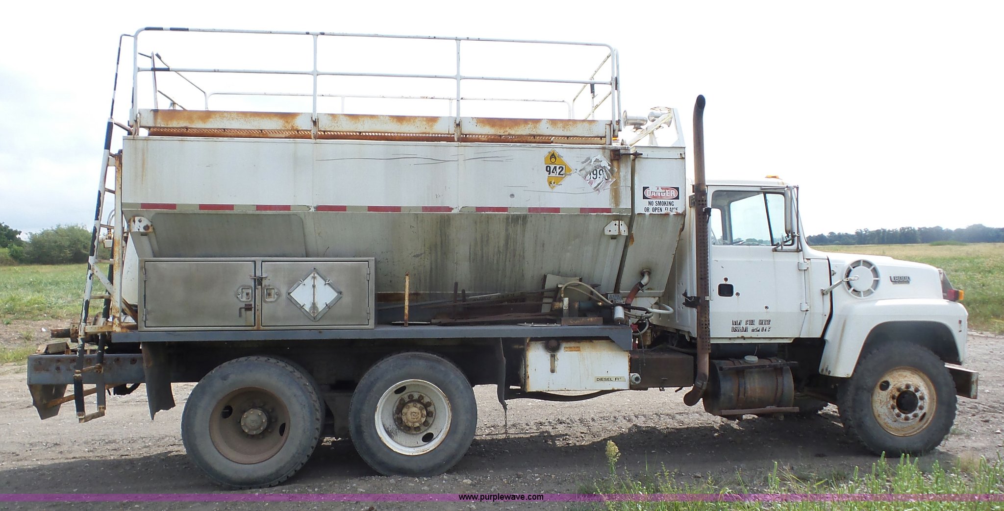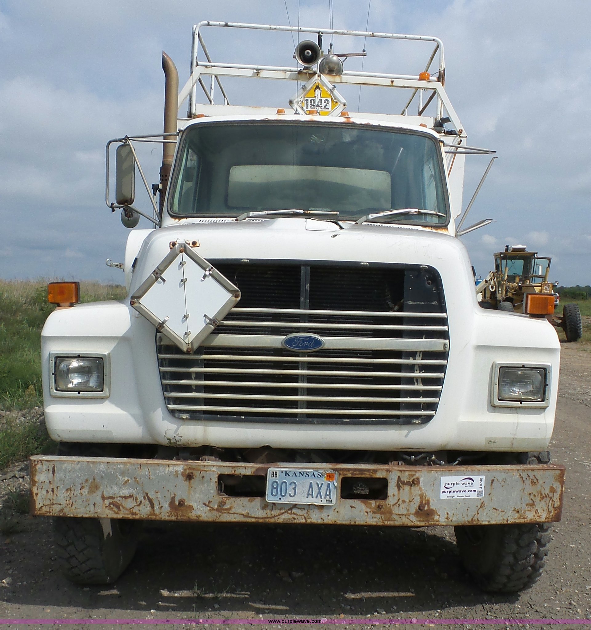 Purple Wave is selling a used Mining Equip. in Kansas. This item is a 1992 Ford LT8000 ANFO bulk handling truck with the following: 43,762 miles on odometer, 9,635 hours on meter, 7.8L L6 turbo diesel engine, Automatic transmission, Inter-axle differential lock, AC and heat, AM/FM, Treadbed ANFO 1614 bed, Hydraulic auger discharge, Side mounted toolbox, FM-530 fuel meter, On-board diesel fuel tank, Walking beam suspension, Air brakes, 11R24.5 tires, GVWR 50,000 lbs