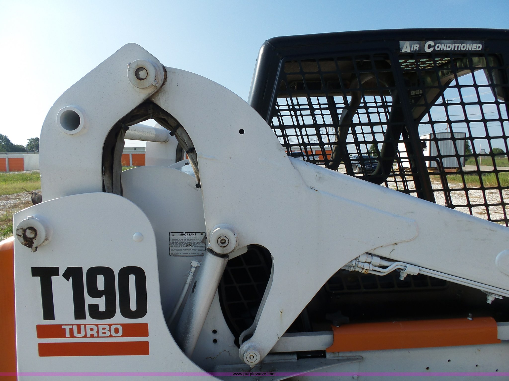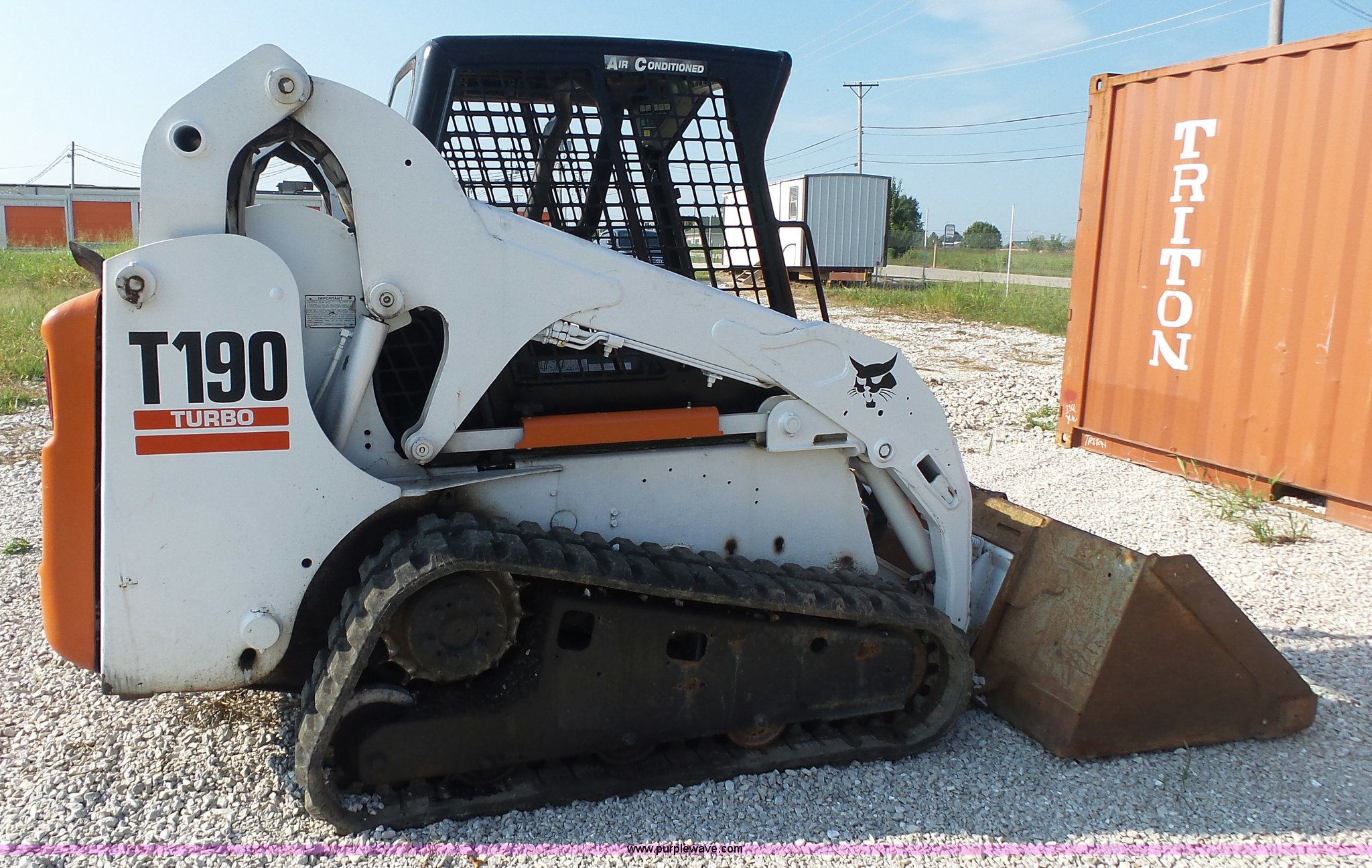 Purple Wave is selling a used Tracked Skid Steer Loader in Missouri. This item is a 2002 Bobcat T190 skid steer with the following: 3,243 hours on meter, Kubota V2003-T-E four cylinder turbo diesel engine, 44 kW, Open station/canopy, AC and heat, Hand and foot controls, Spring suspension seat, Front work lights, 78"W bucket, Bolt-on cutting edge, Manual quick coupler, High Flow auxiliary hydraulics, 12"W tracks, 7,775 lbs. base operating weight, Rust, Seat torn, Non-operational AC and heat, Cutting edge worn, One rear light missing, Engine issues, blows black smoke, Serial 519313803
