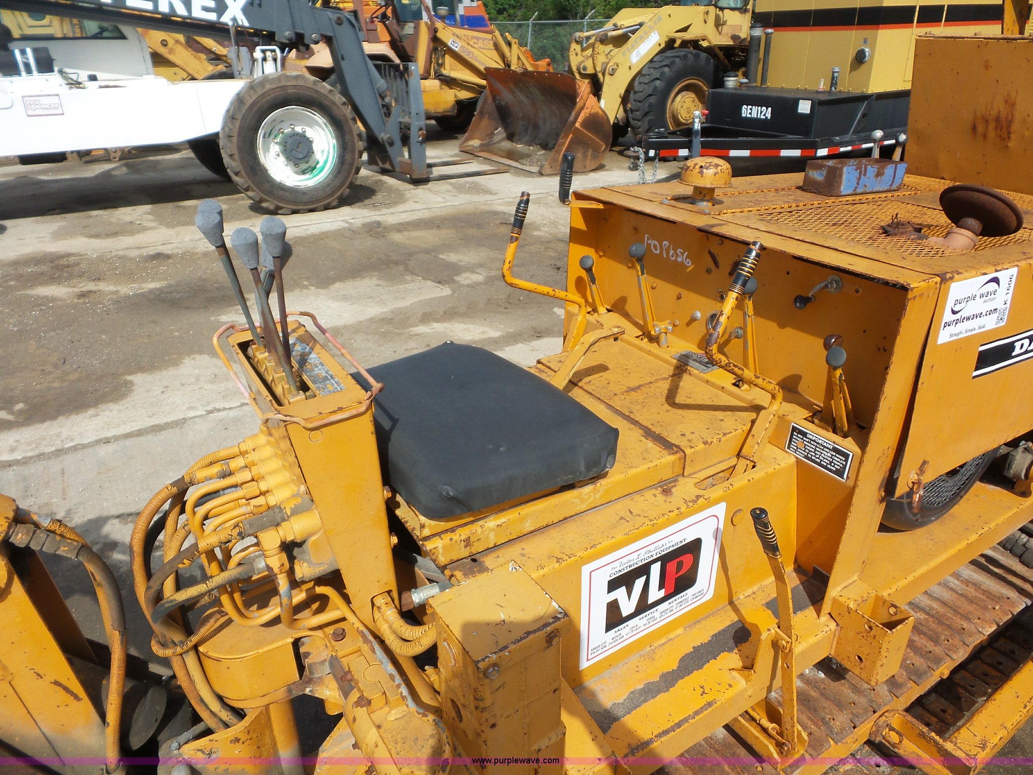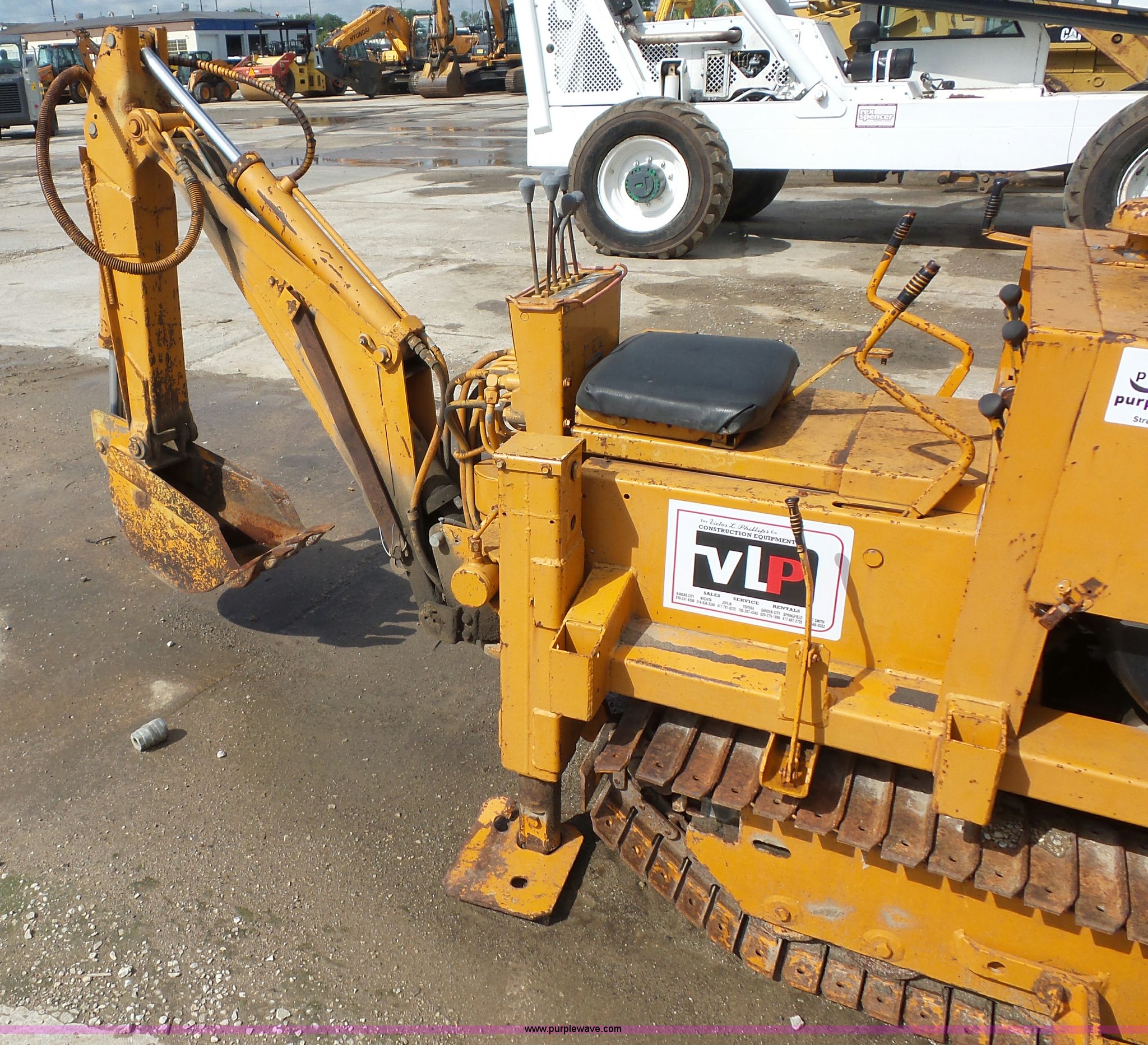 Case Davis TF700 trencher. Wisconsin VH4D four cylinder gas engine Serial 98110426, 6'L trencher bar 7"W chain, 10"W side conveyor, 53"W back fill blade, 11"W backhoe bucket, Rear outriggers, 10"W steel single grouser track pads, Serial 1136062. Victor L. Phillips Co.. 4100 Gardner Avenue. Kansas City, MO 64120