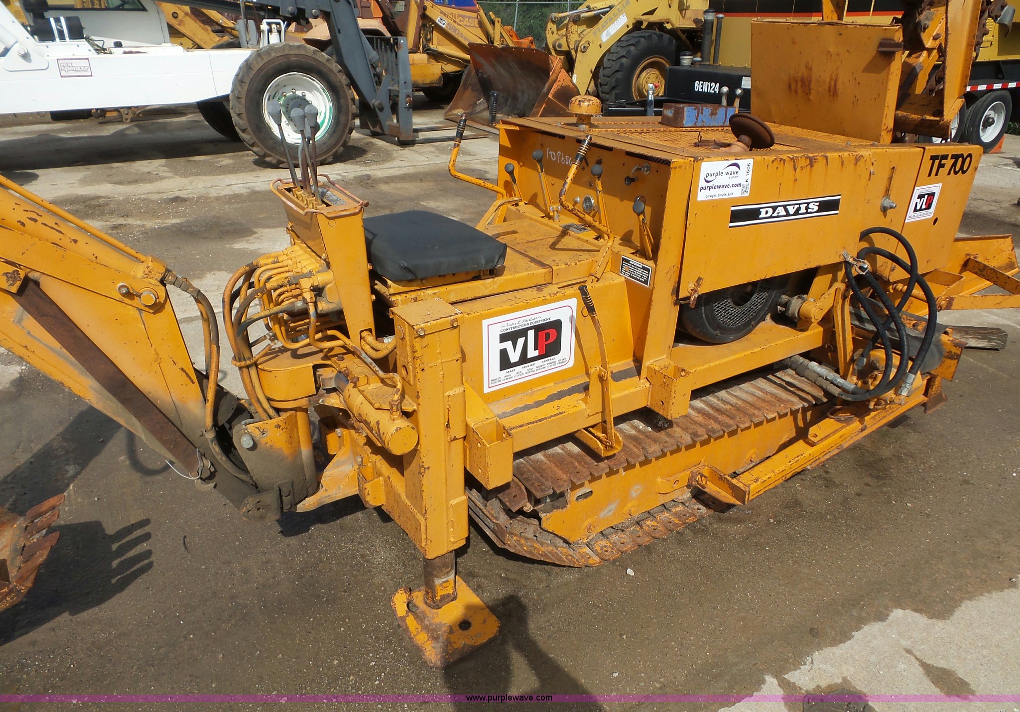 Purple Wave is selling a used Trencher or Rock Saw in Missouri. This item is a Case Davis TF700 trencher with the following: Wisconsin VH4D four cylinder gas engine, Serial 98110426, 6'L trencher bar, 7"W chain, 10"W side conveyor, 53"W back fill blade, 11"W backhoe bucket, Rear outriggers, 10"W steel single grouser track pads, Serial 1136062