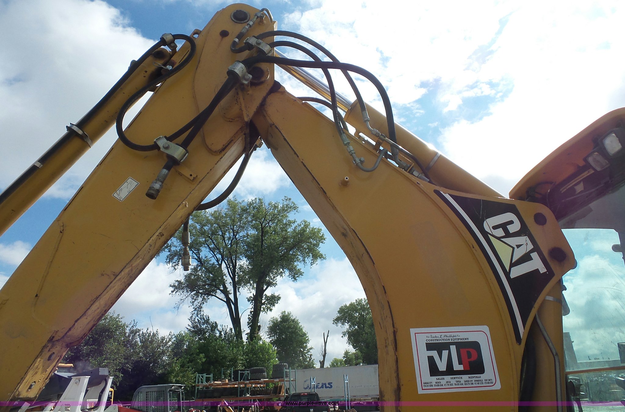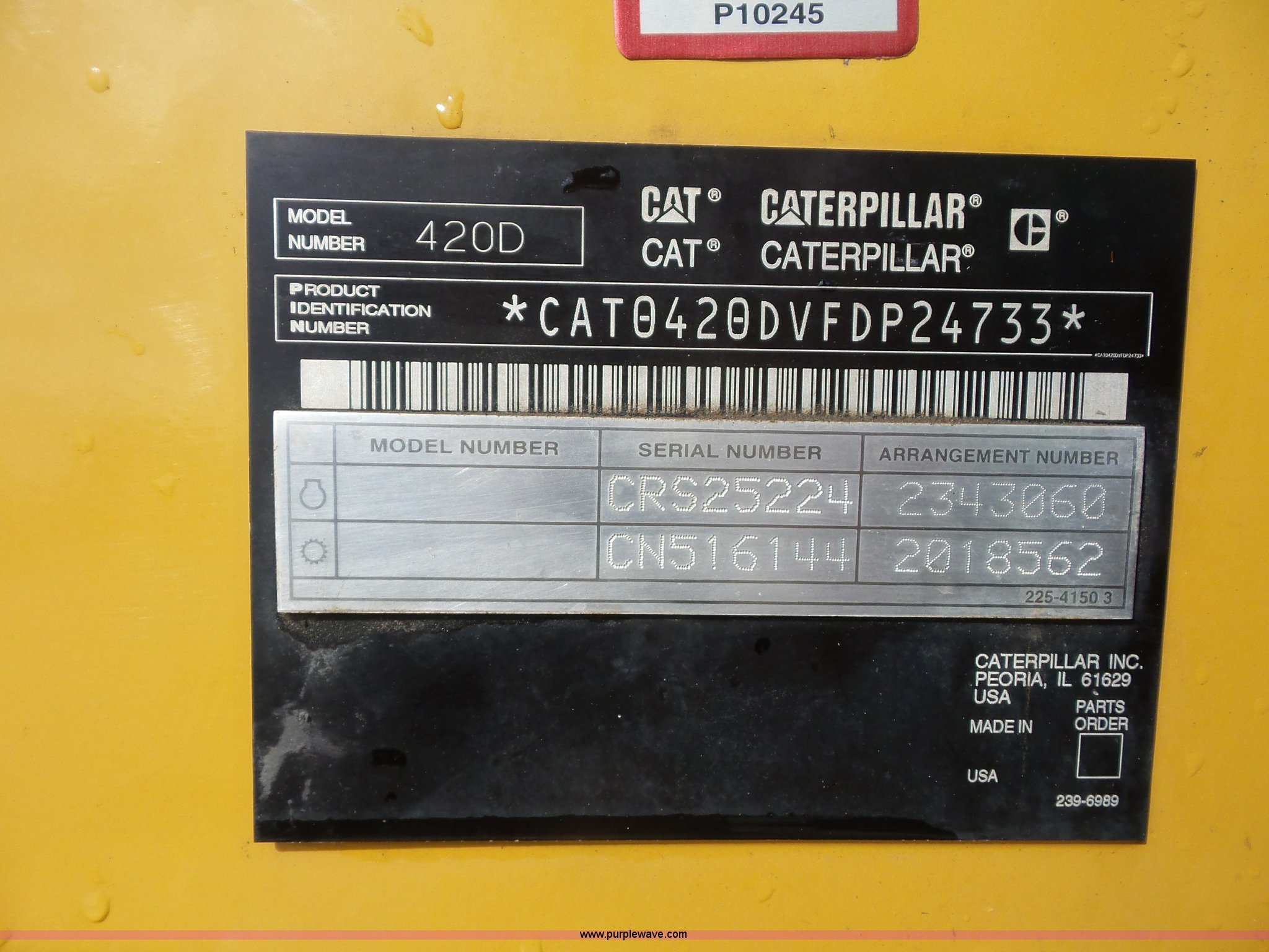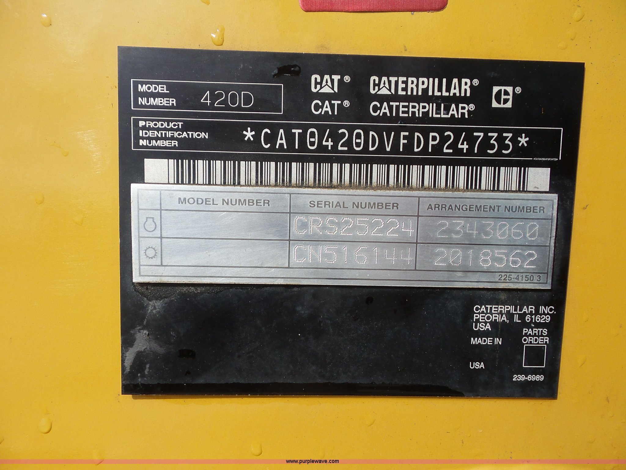 2005 Caterpillar 420D backhoe. 4,570 hours on meter, Caterpillar four cylinder turbo diesel engine, Shuttle shift transmission 4F-4R gears, Four wheel drive, EROPS, AC and heat, Wobble stick backhoe controls, Front and rear work lights, 87"W loader bucket, E-stick, 30"W backhoe bucket (5) teeth, Manual quick coupler, Auxiliary hydraulics, 12.5/80/18 front tires, 19.5-24 rear tires, 15,772 lbs. base operating weight, Serial CAT0420DVFDP24733. Victor L. Phillips Co.. 4100 Gardner Avenue. Kansas City, MO 64120