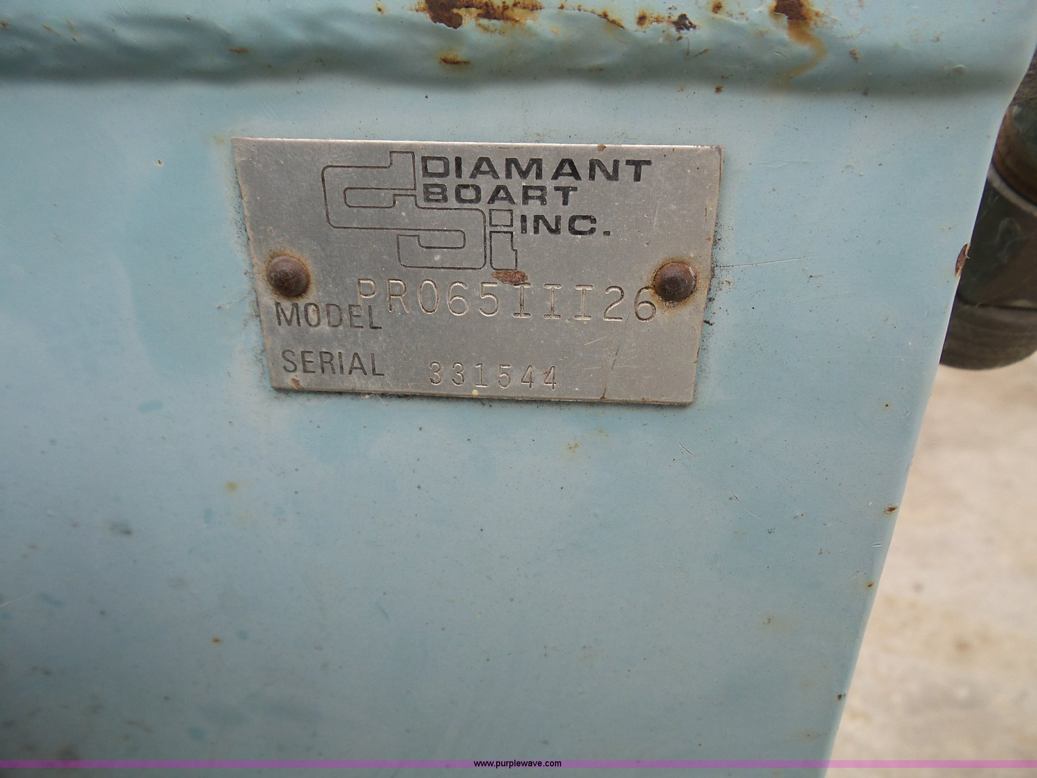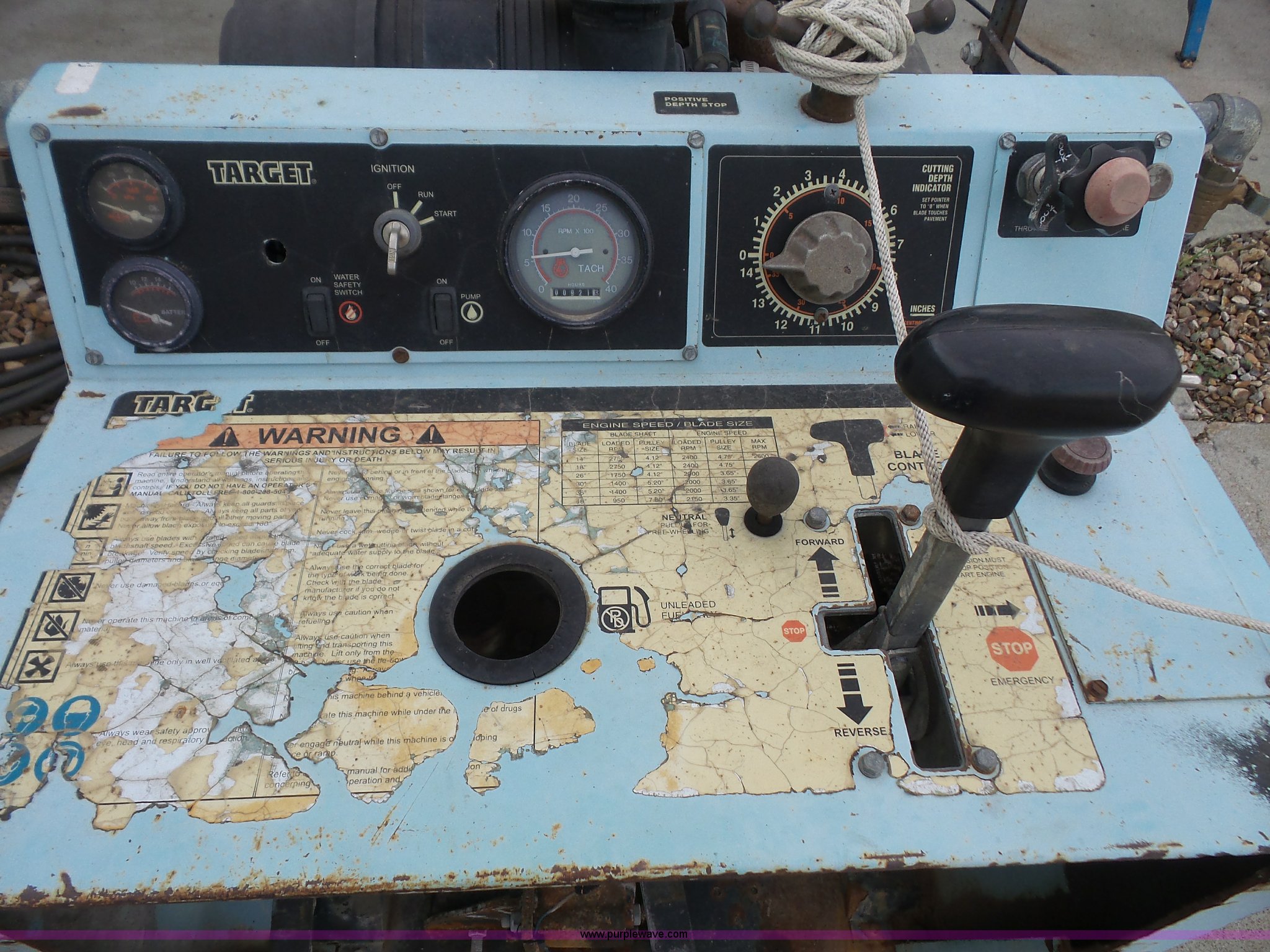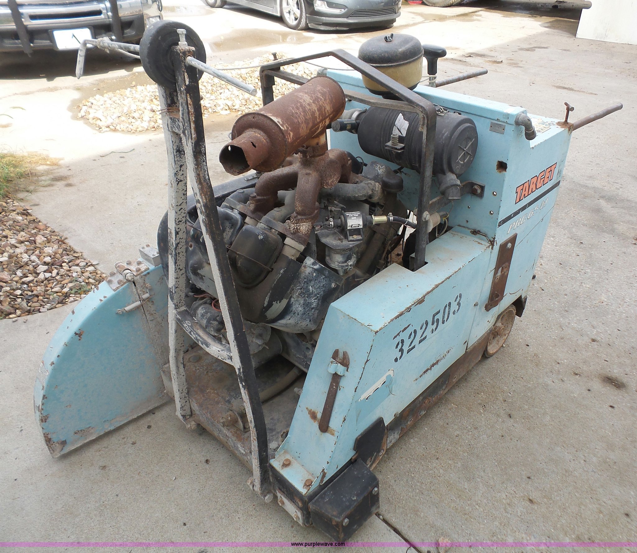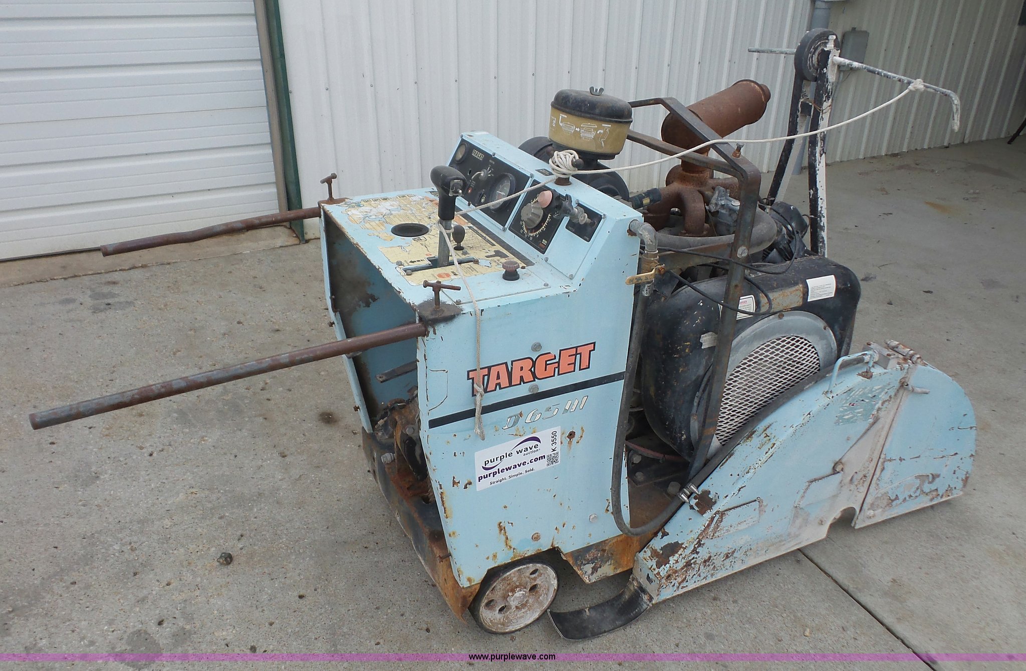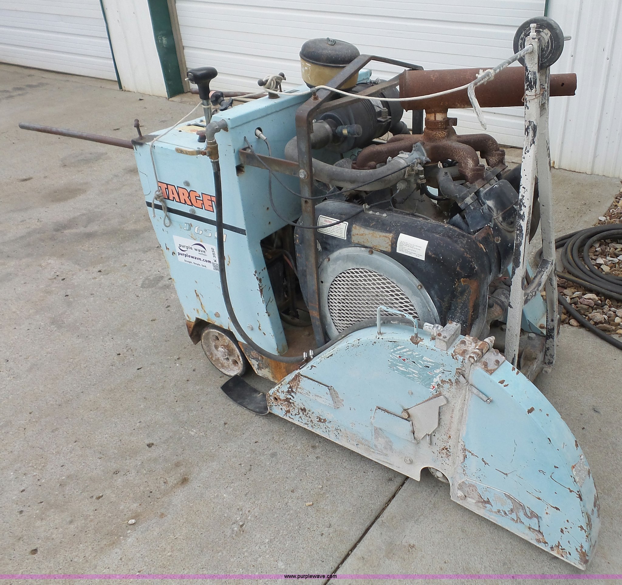 Purple Wave is selling a used Concrete Equip. or Acces. in Kansas. This item is a Target Pro 65III concrete saw with the following: 921 hours on meter, Wisconsin four cylinder gas engine, 36" blade capacity, Fuel tank leaks