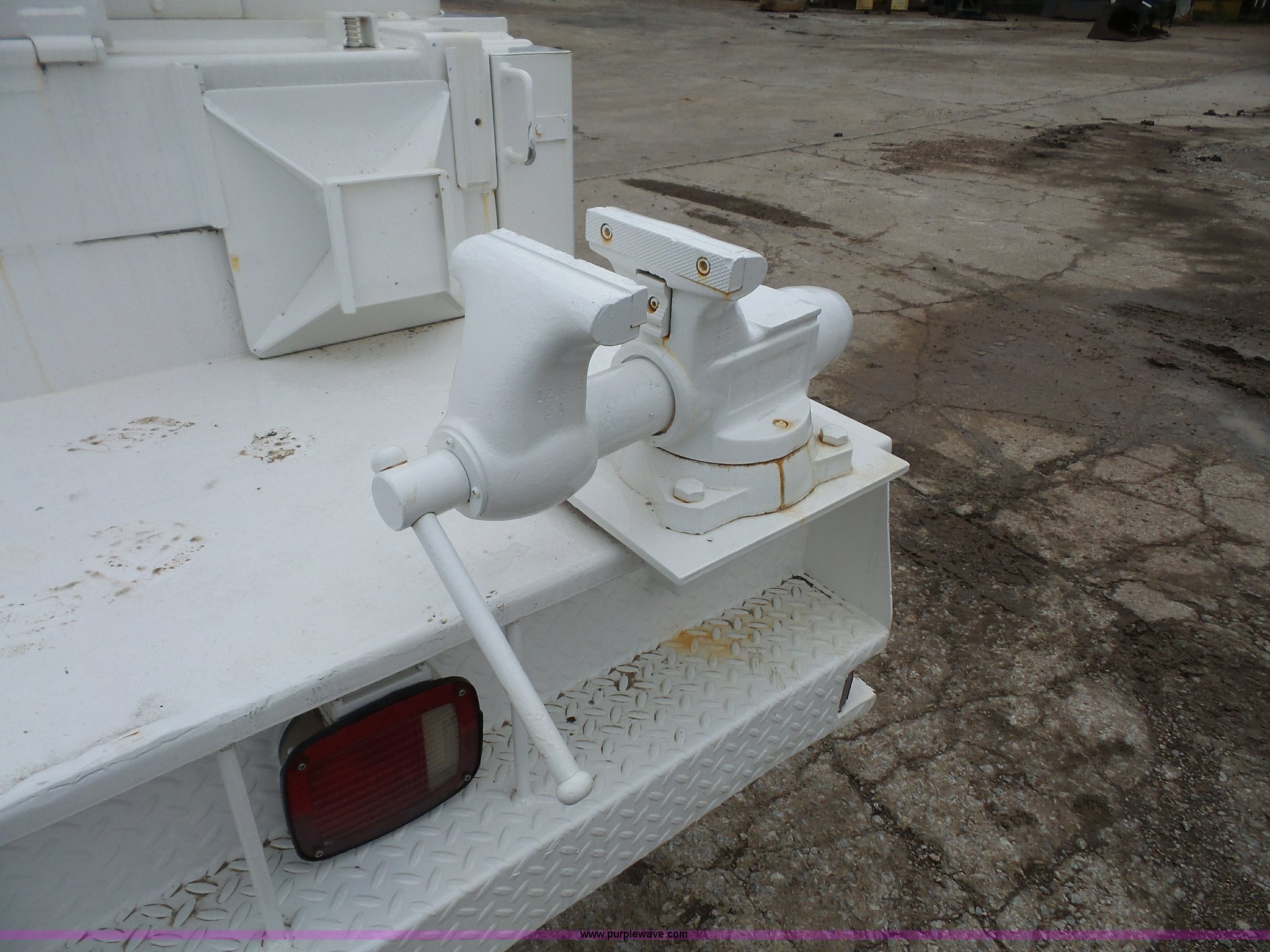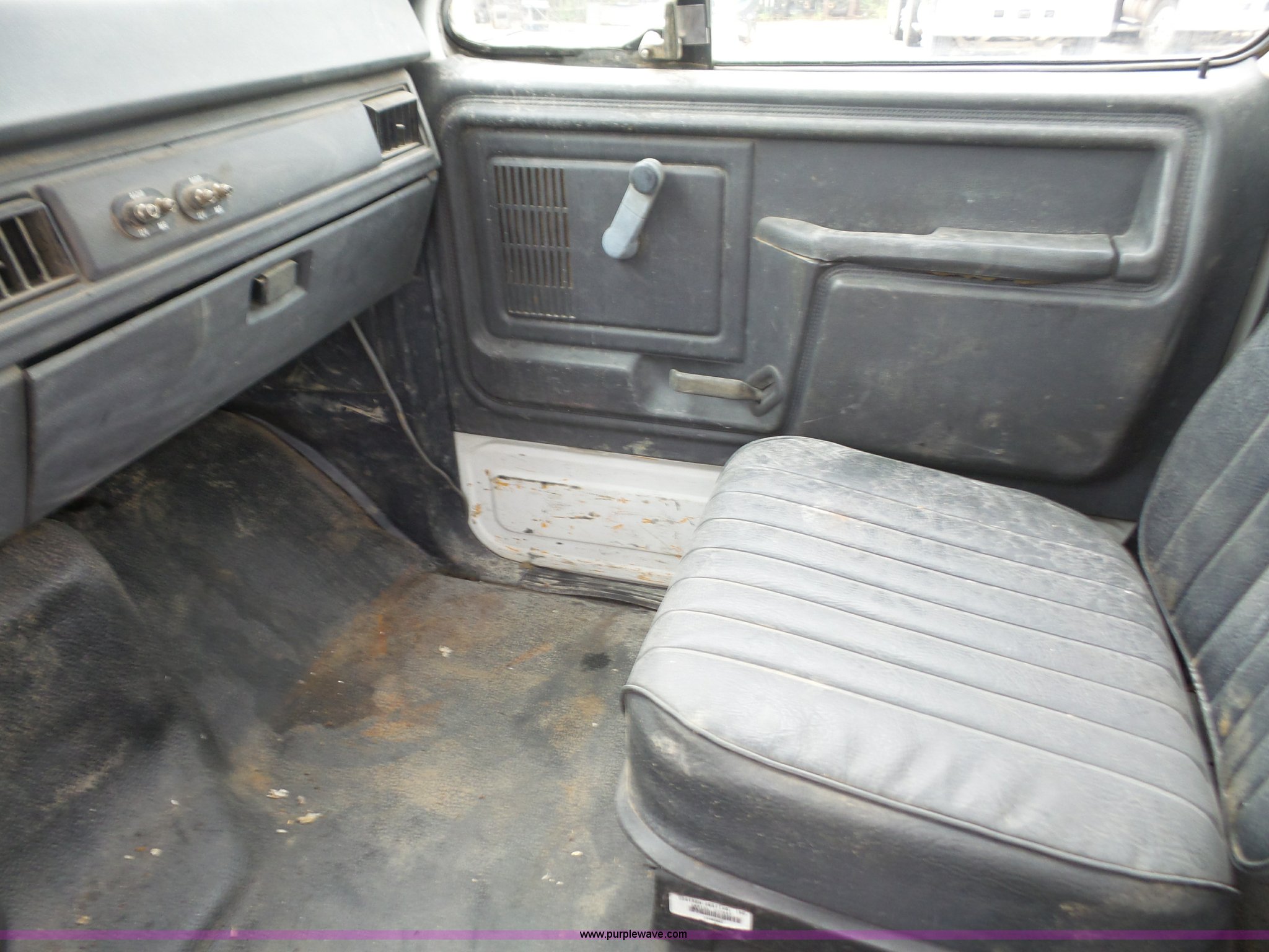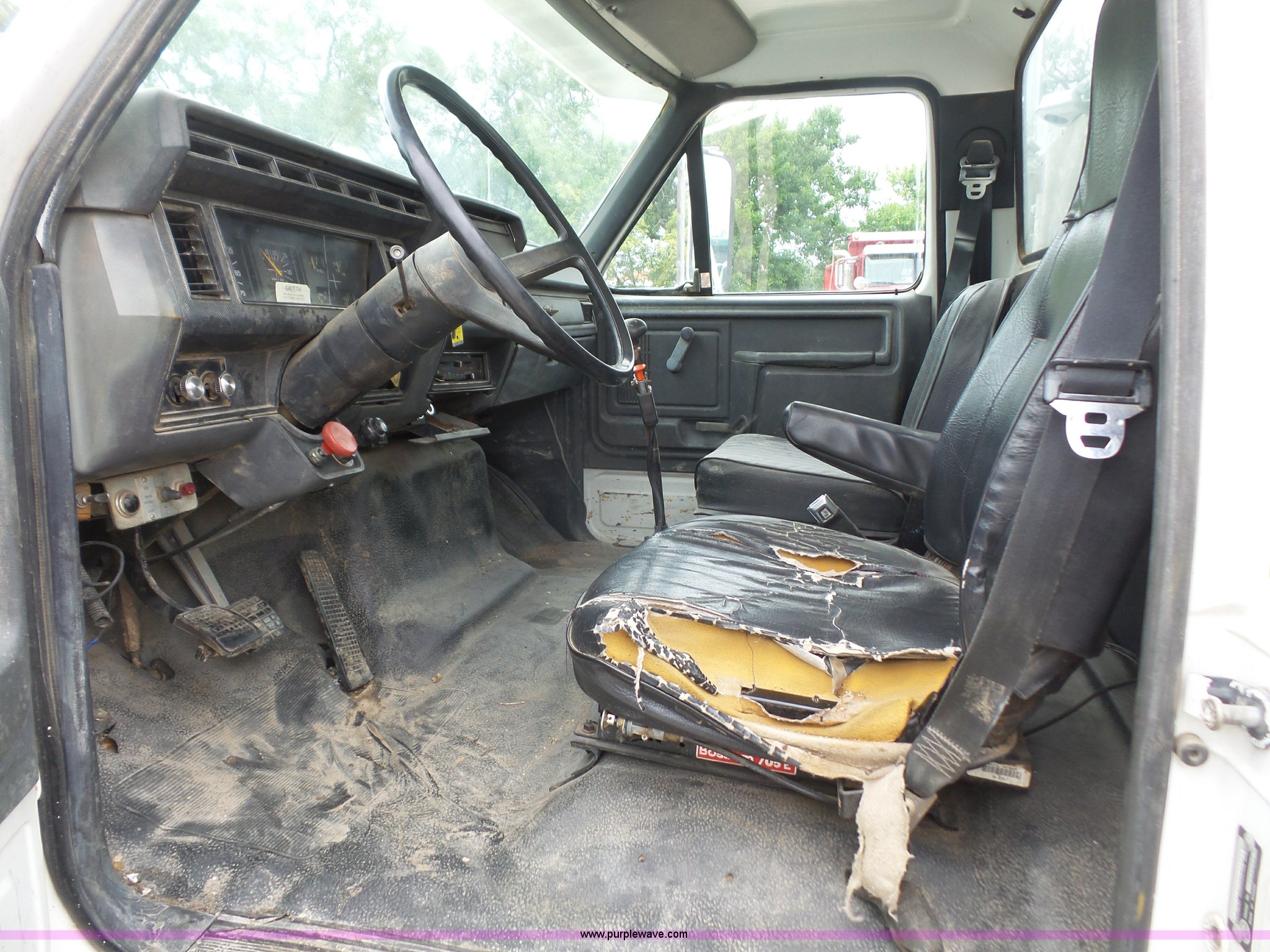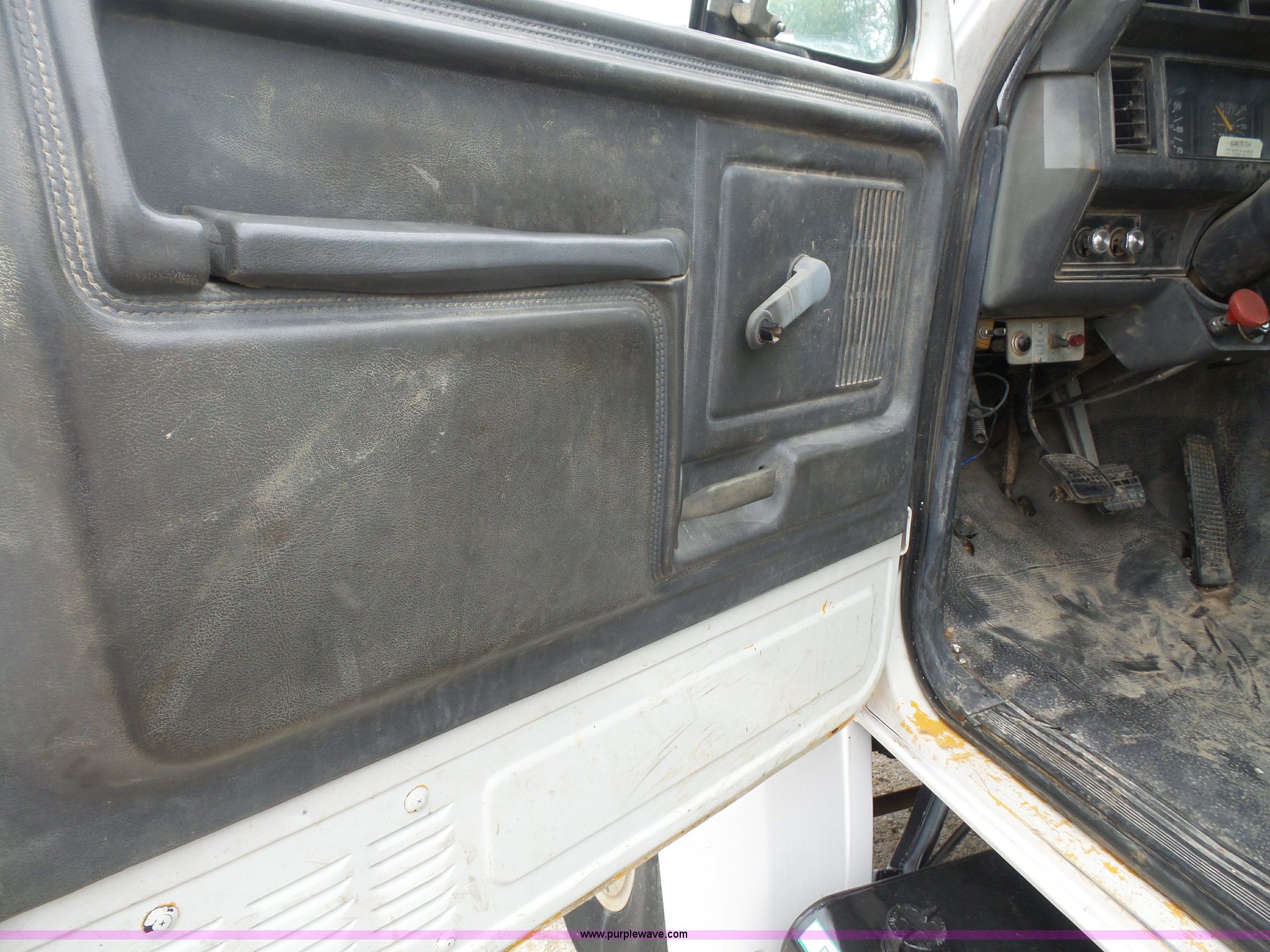 Purple Wave is selling a used Service Truck in Kansas. This item is a 1994 Ford F700 service truck with crane with the following: 188,224 miles on odometer, Cummins ISB 5.9L L6 diesel engine, 210 HP, Five speed manual transmission, Two speed rear end, Single axle, Heat, AM/FM/cassette, Air suspension seat, PTO, Maintainer service bed, 11'L, Shelving, Slide-out drawers, Mounted vise, 2' rear platform bumper, Pintle hitch, Hydraulic driven air compressor, Lube container, Maintainer I-145 crane, Remote, Outriggers, Single exhaust stack, Dual fuel tanks, Spring suspension, Air brakes, 11R22.5 tires