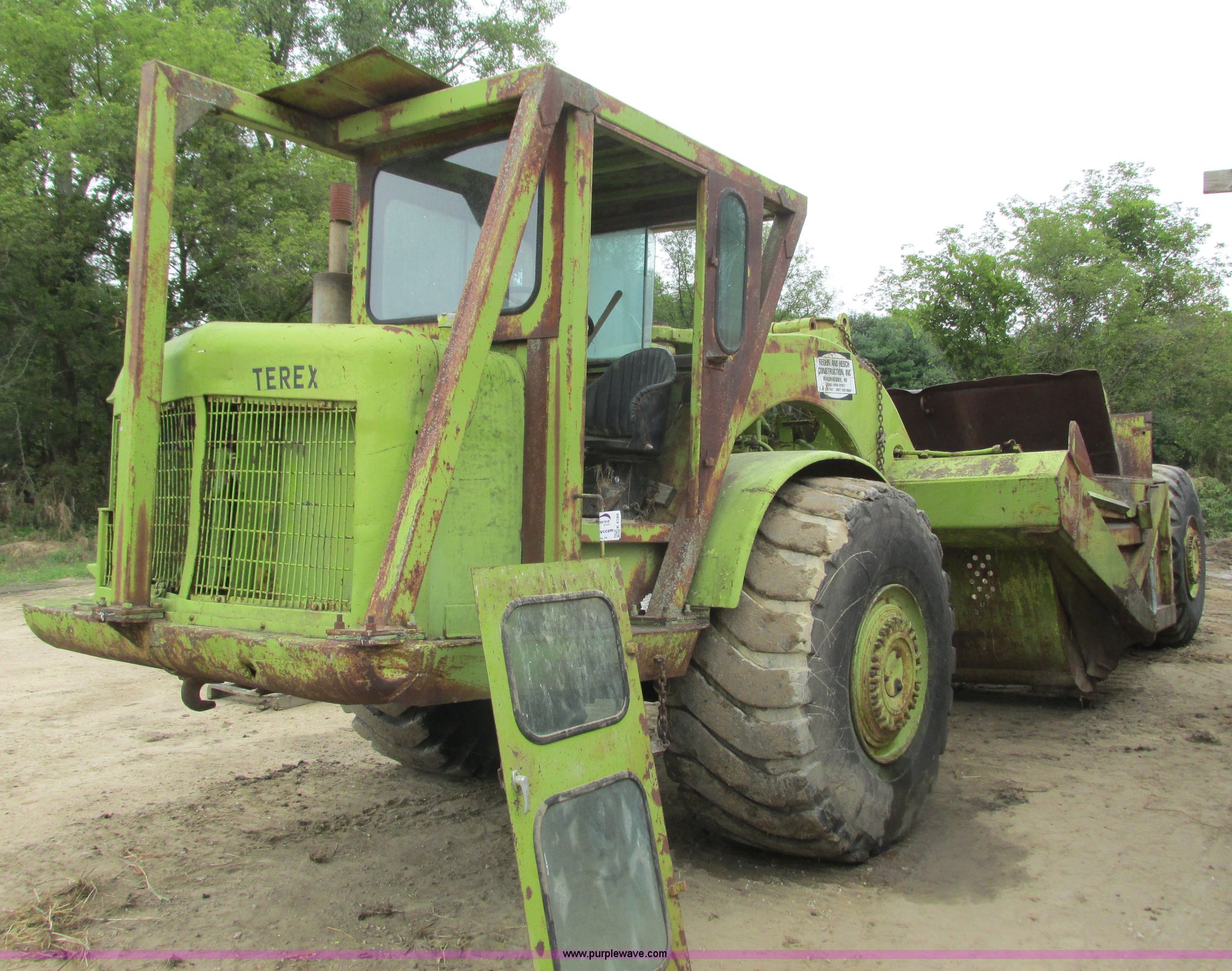 Terex TS14 conventional scraper. Detroit Diesel V471 six cylinder diesel front engine, Powershift transmission, Enclosed cab, Heat, Air suspension seat, 14 cu. yd. bowl capacity, Reversible cutting edge, Three lever controls, Rear push block, Air brakes, Goodyear 29.5-25 front tires, General 29.5-25 rear tires, Parts only, Rear engine missing, Both transmissions missing, Parts missing, Serial 20254. Reglin & Hesch Construction. S2012 A County Road U. Waumandee, WI 54622