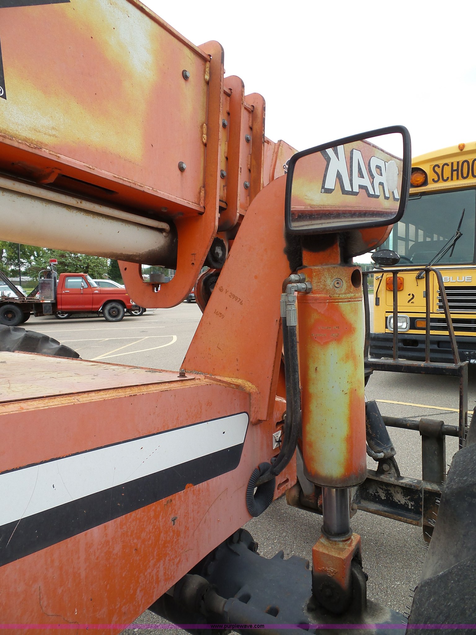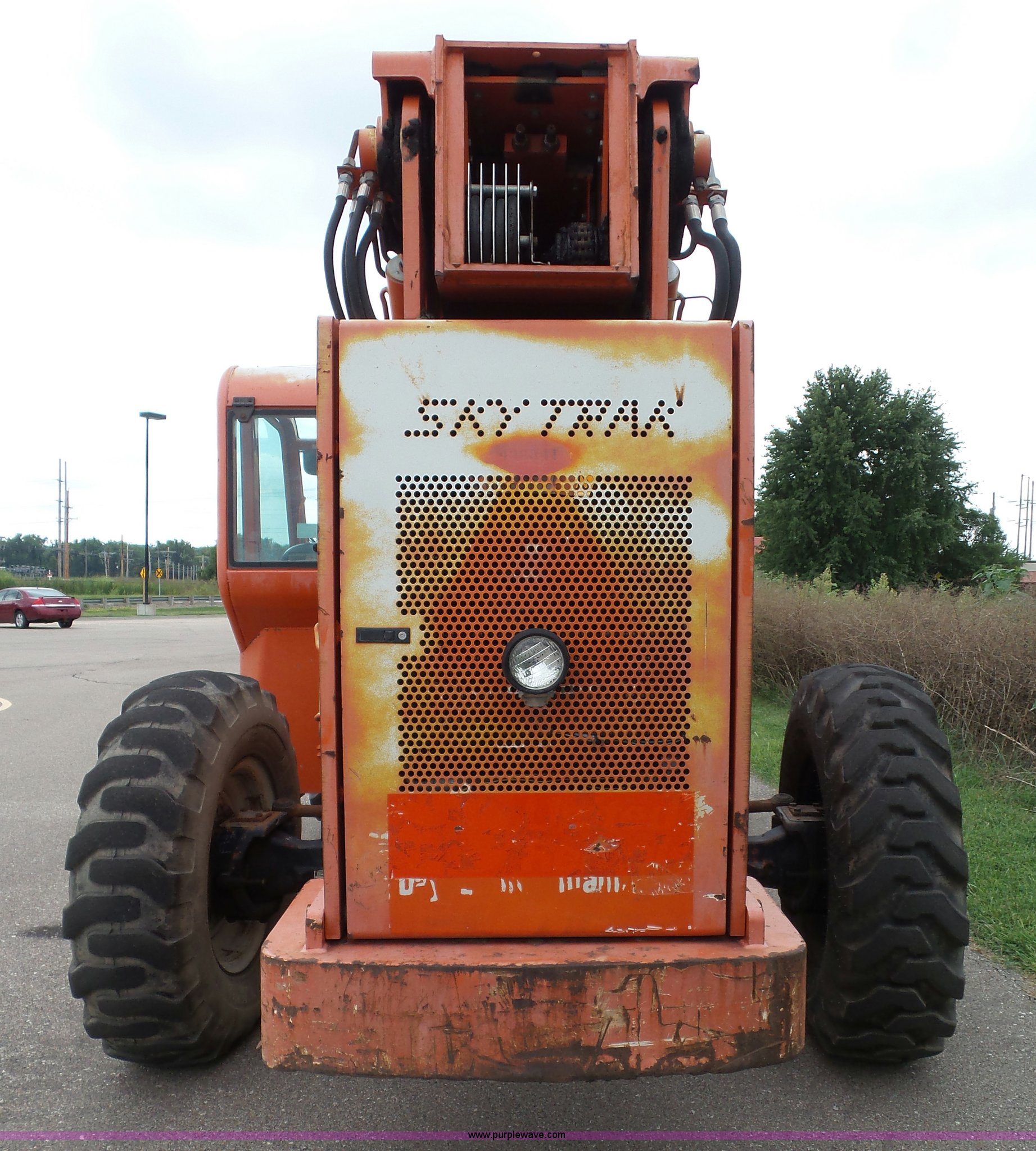 Purple Wave is selling a used Telehandler in Kansas. This item is a 2002 Sky Trak 8042 telehandler with the following: 8,969 hours on meter, Cummins 4BT 3.9L four cylinder diesel engine, 110 HP, Powershift transmission, 3F-3R gears, Full time four wheel drive, Two wheel steer, Four wheel steer, Crab steer, Block heater, Enclosed cab, Vinyl seat, 8,000 lbs maximum lift capacity, 28' maximum reach length, 40' maximum lift height, Three stage mast, 48"L x 4"W x 2.5"H forks, Tilt, Lev-O-Gage frame tilt, Up to 10 degree, Backup alarm, 26,230 lbs. base operating weight, Serial 17080