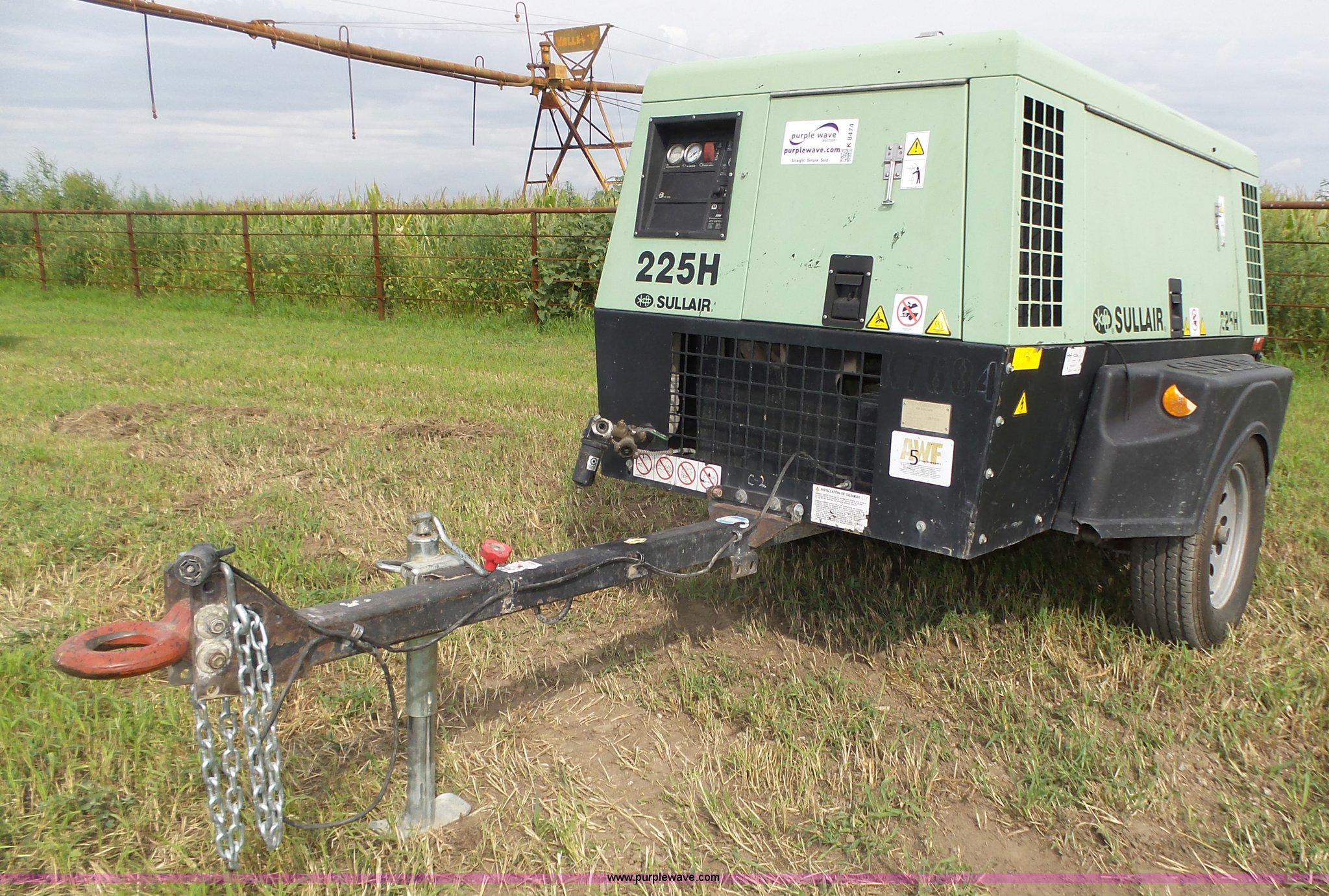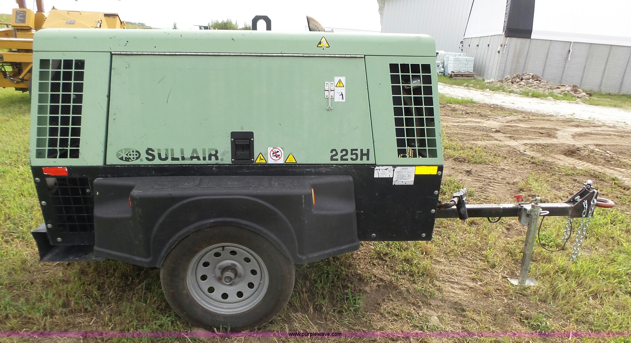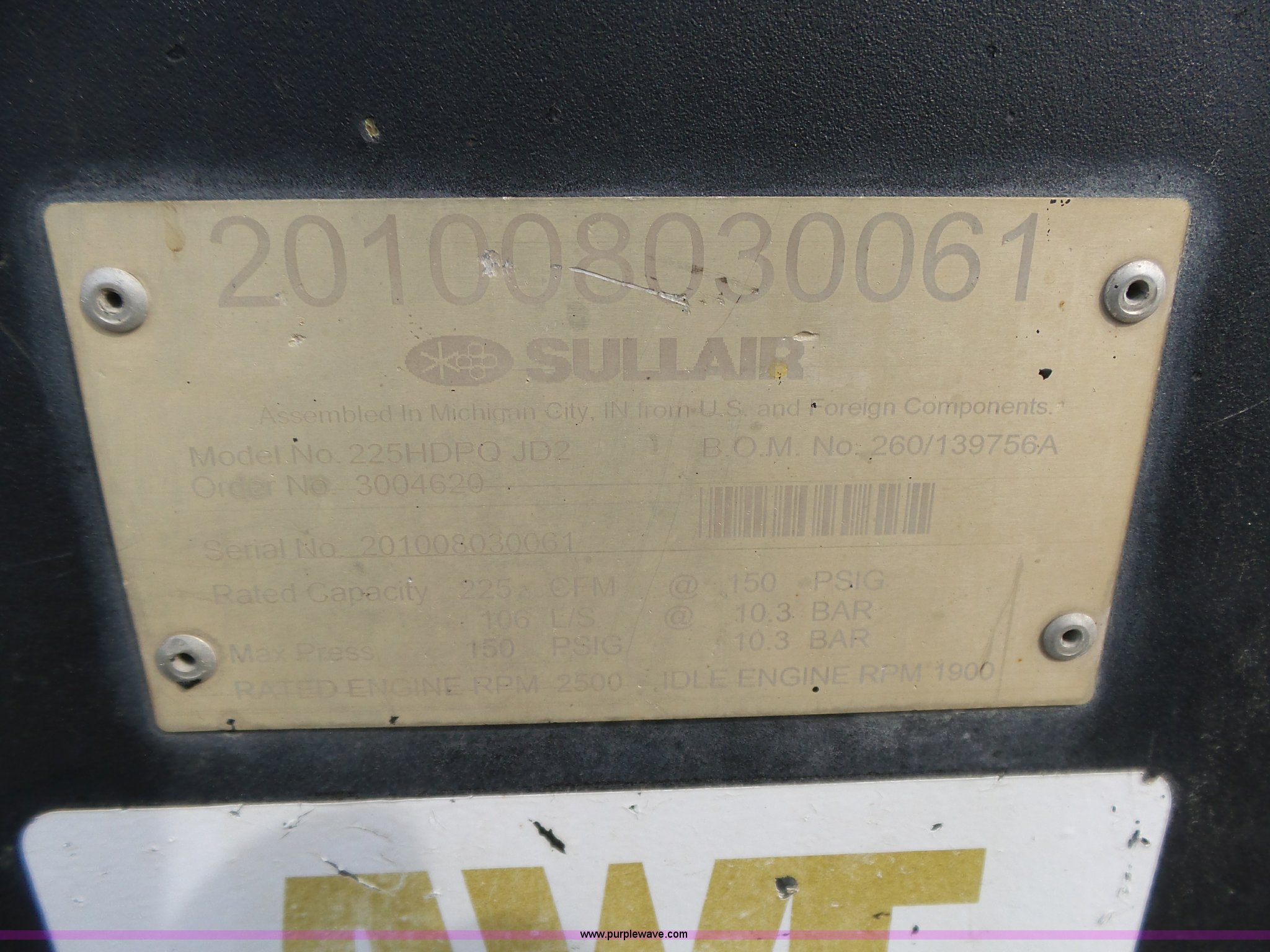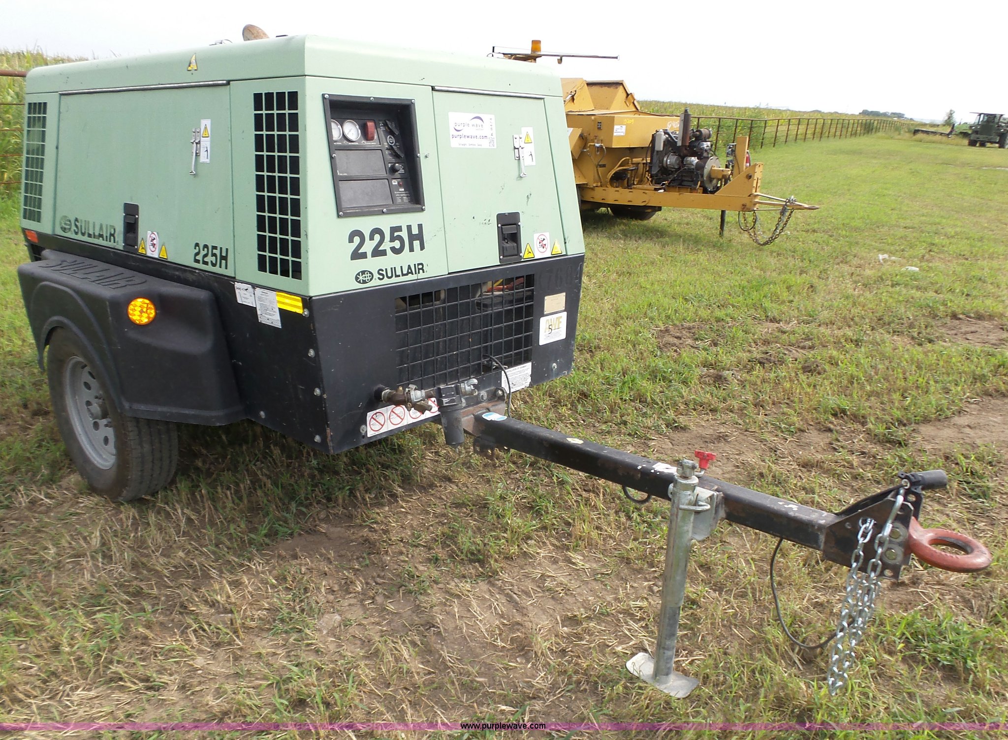 Purple Wave is selling a used Air Compressor in Iowa. This item is a 2010 Sullair 225HDPQJD2 air compressor with the following: 619 hours on meter, John Deere 5030TF270B 3.0L four cylinder turbo diesel engine, 61.5 kW, Serial PE5030T187342, 225 CFM, 150 psi, In-line water separator, Tool storage, Hose safety cable, Jack stand, Pintle hitch, ST205/75R15 tires, Serial 201008030061