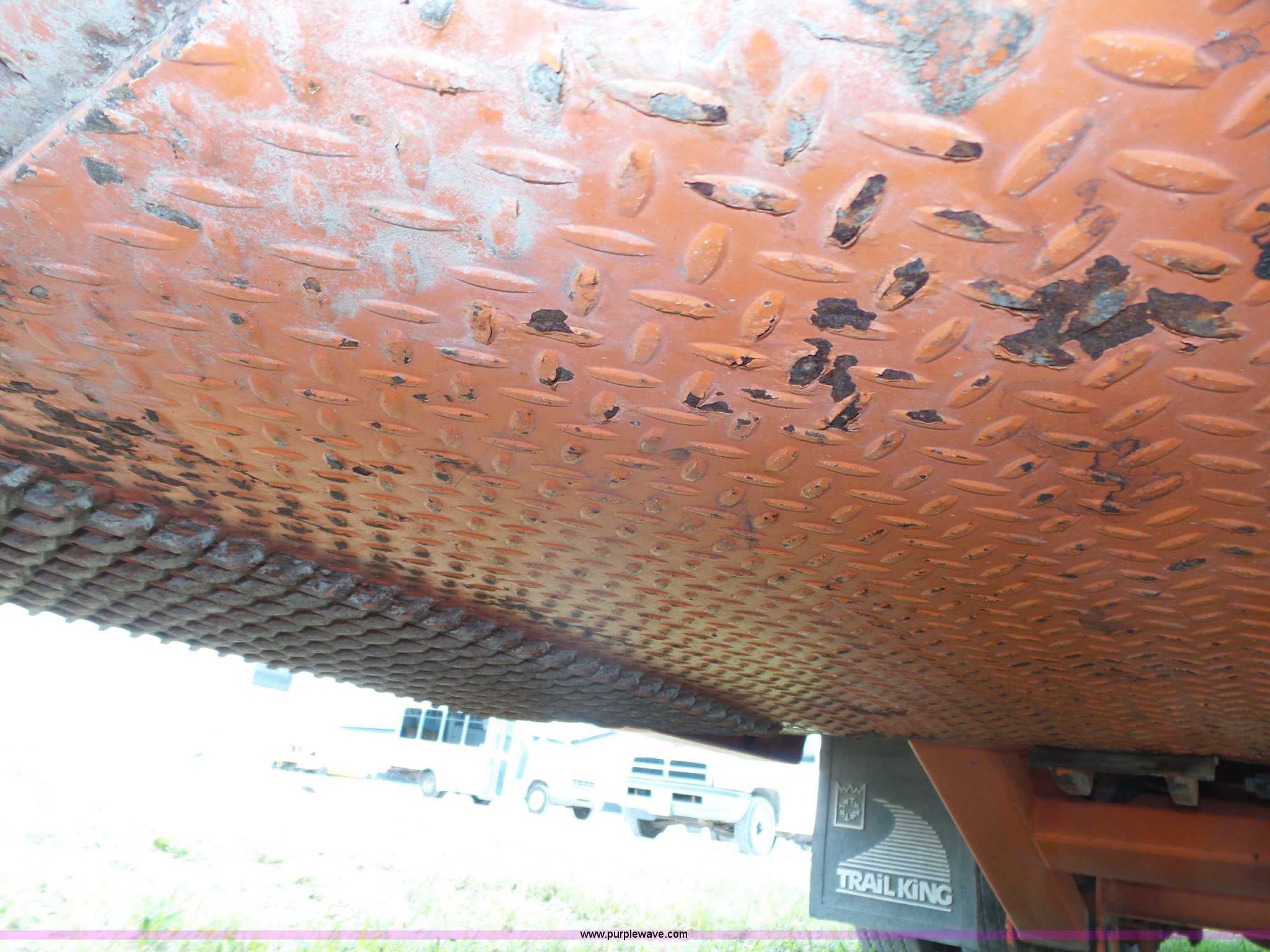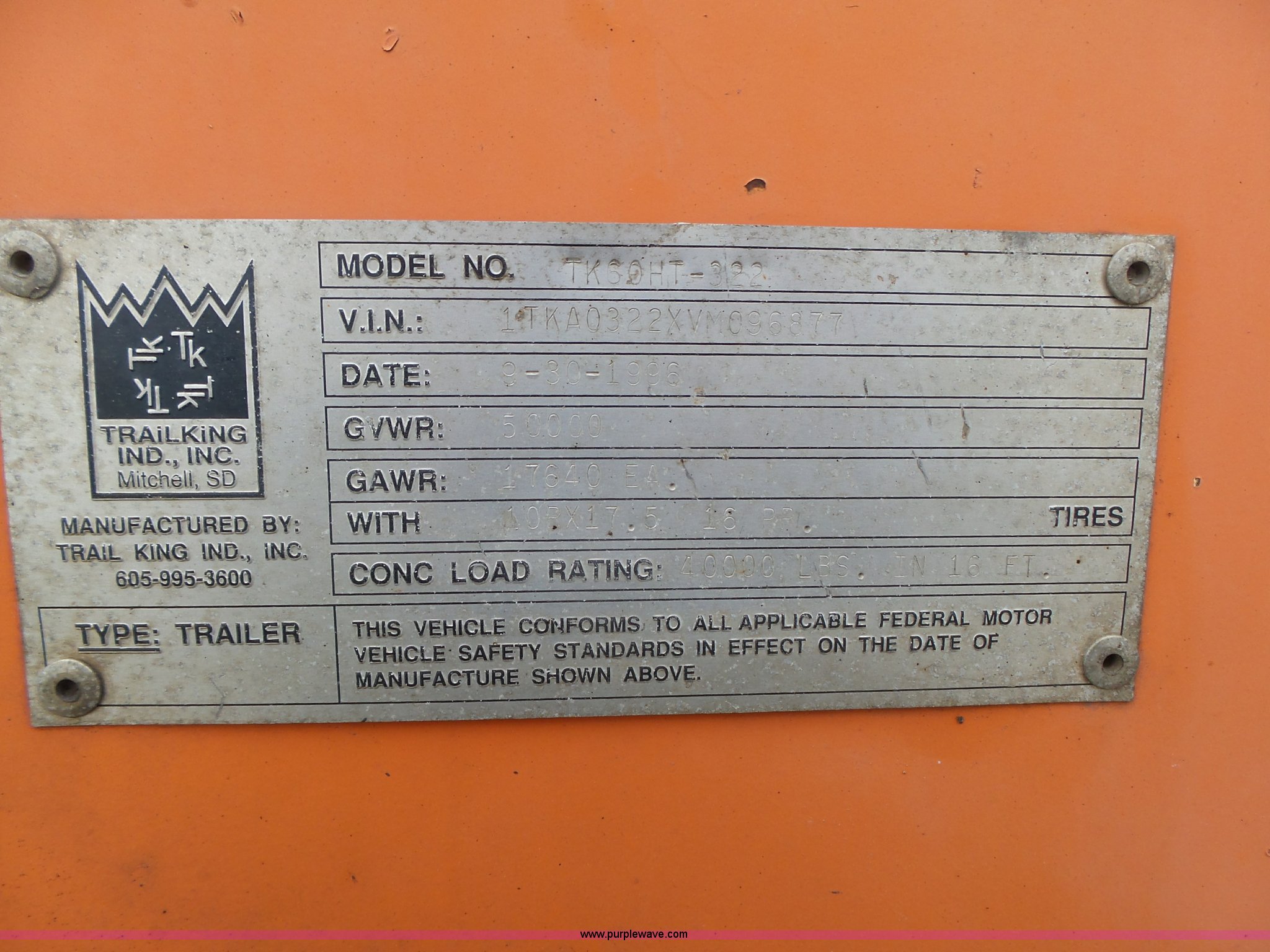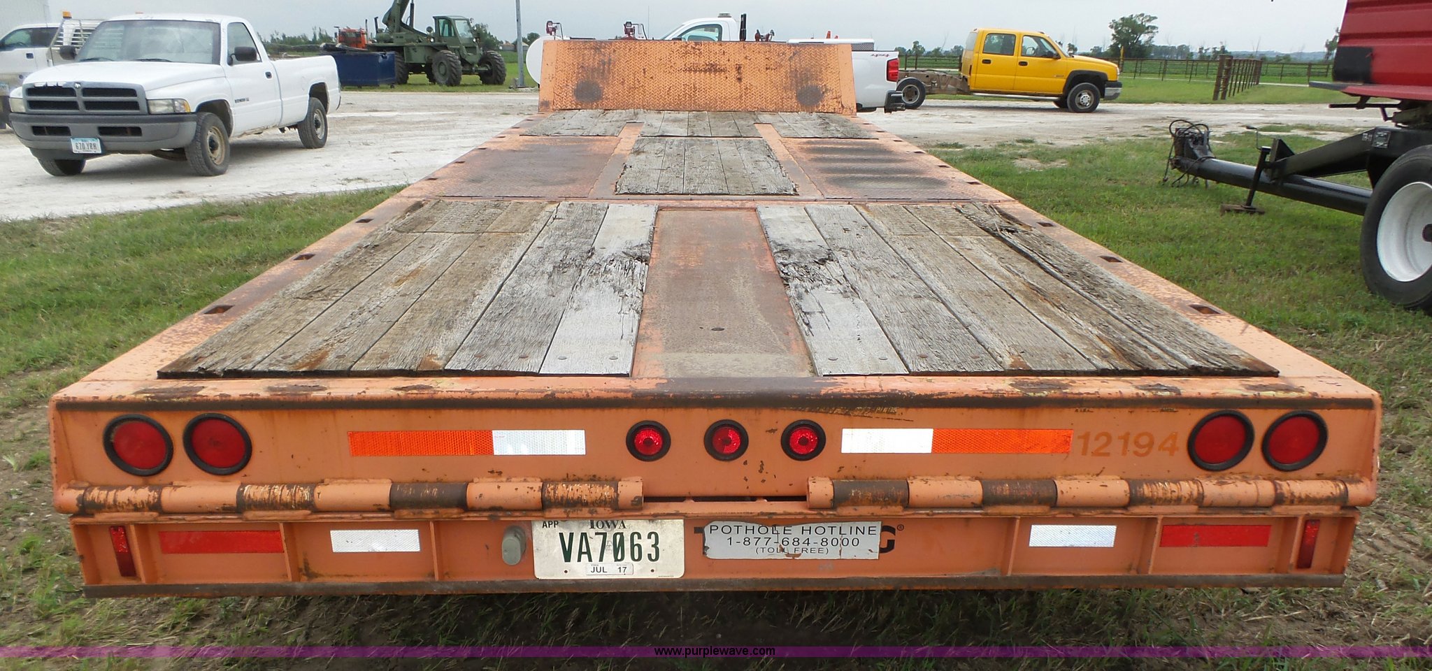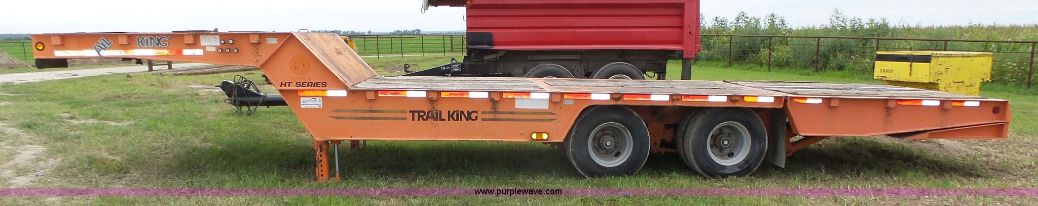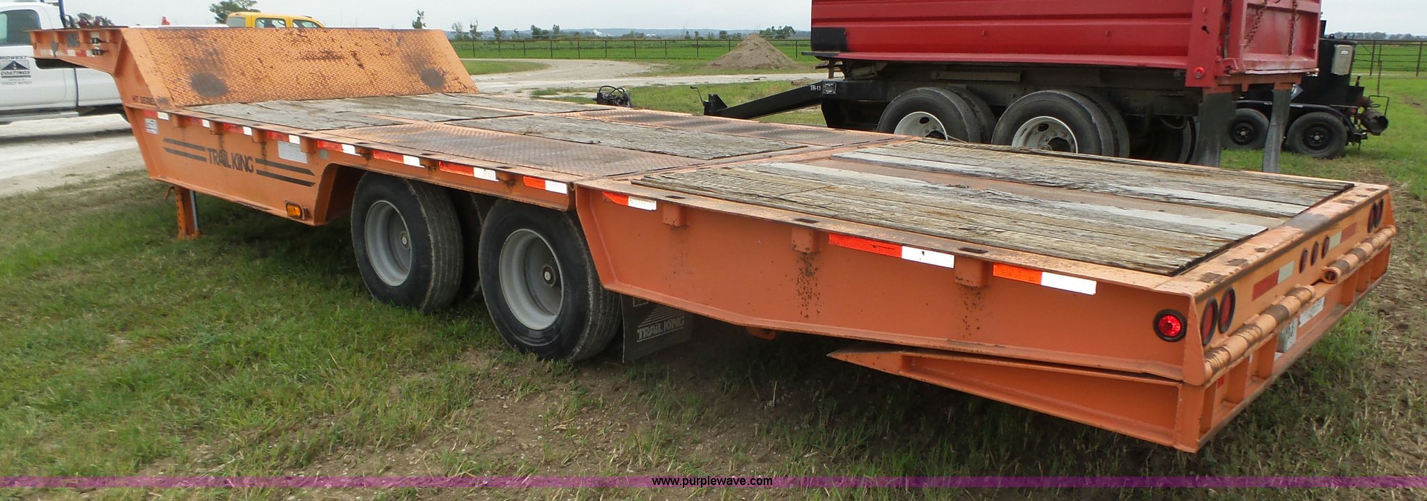 Purple Wave is selling a used Flat or Drop Deck Trailer in Iowa. This item is a 1997 Trail King TK60HT-322 drop deck equipment trailer with the following: 32'L x 102"W overall, 38" floor height, 8'L upper deck, 170"L main deck, 46"L dovetail, 93"L hydrualic ramps, Steel and wood construction, Stake side pockets, Recessed toolbox, Dual leg hydraulic landing gear, 33,000 lbs pay load capacity, Fifth wheel plate, Spring suspension, Air brakes, Steel wheels, 10R17.5 tires, GVWR 50,000 lbs, GAWR 17,640 lbs