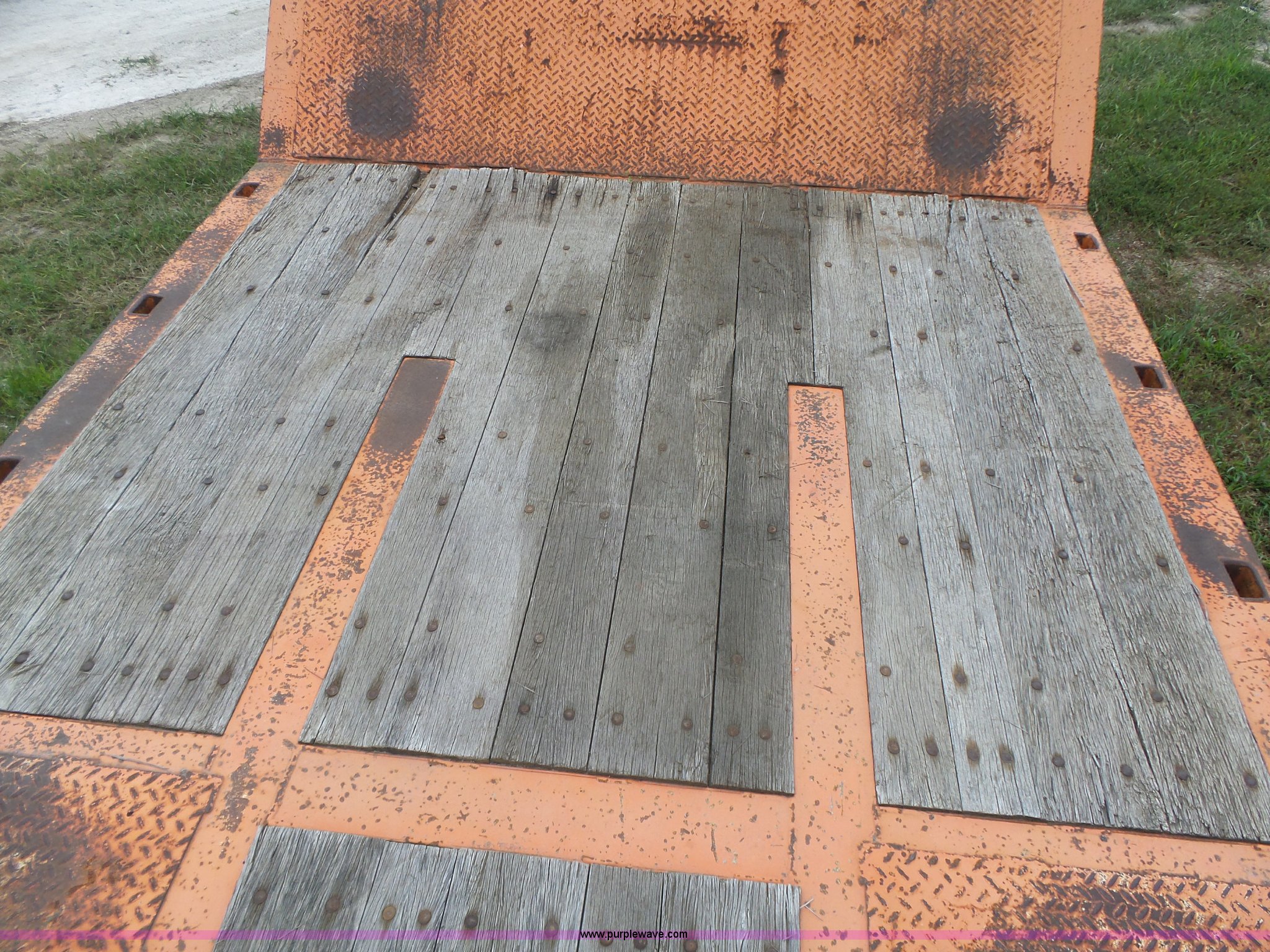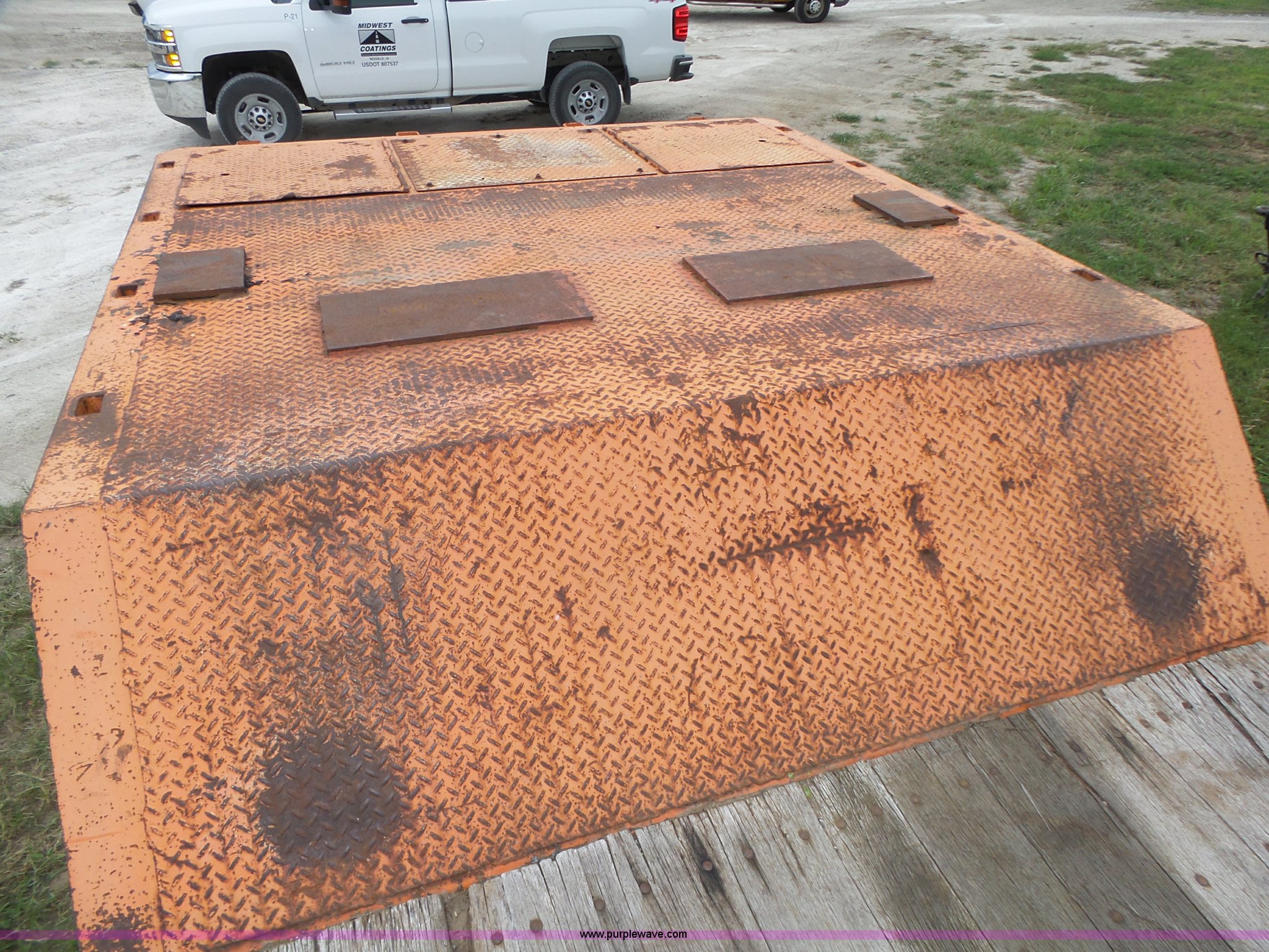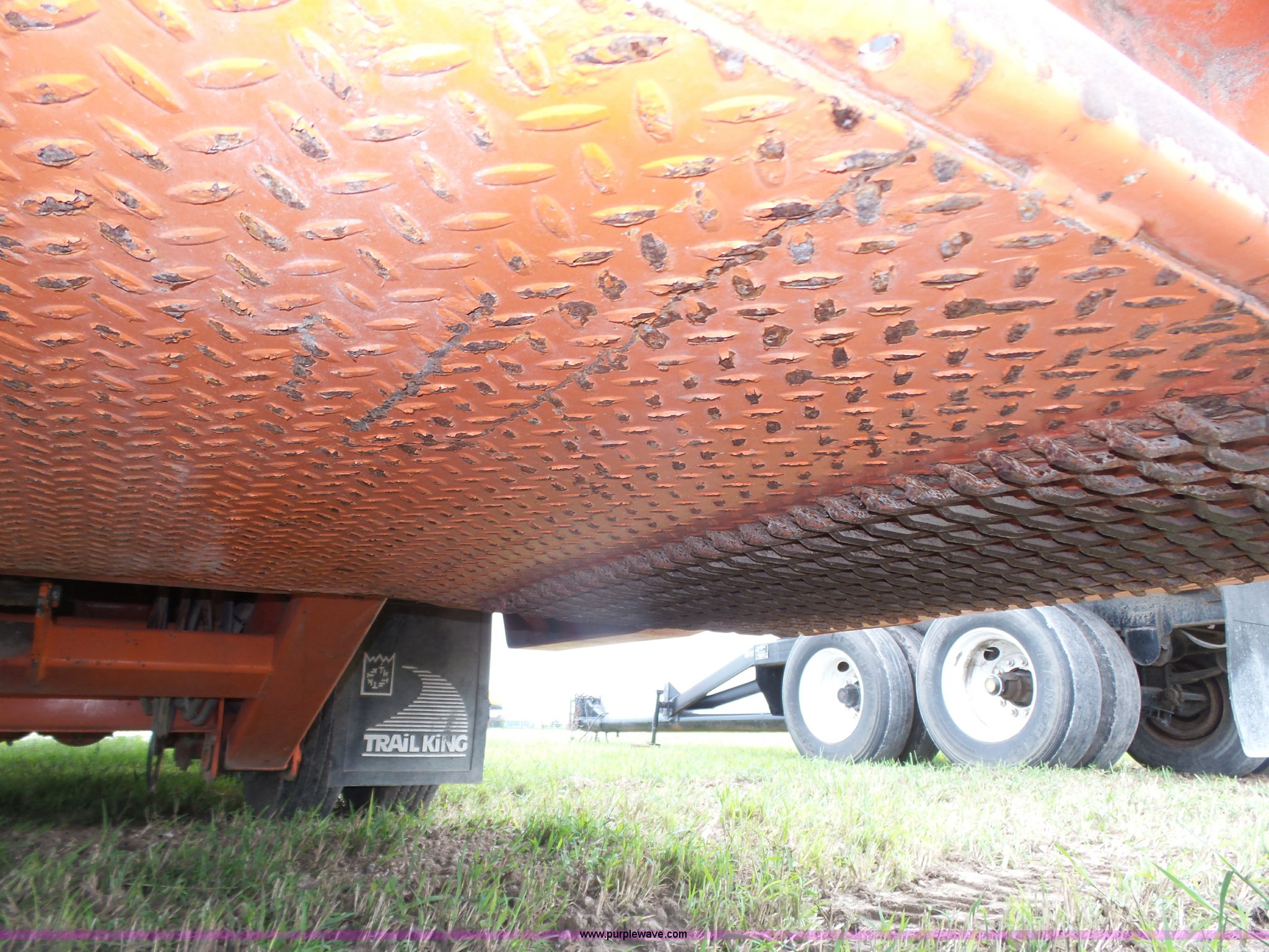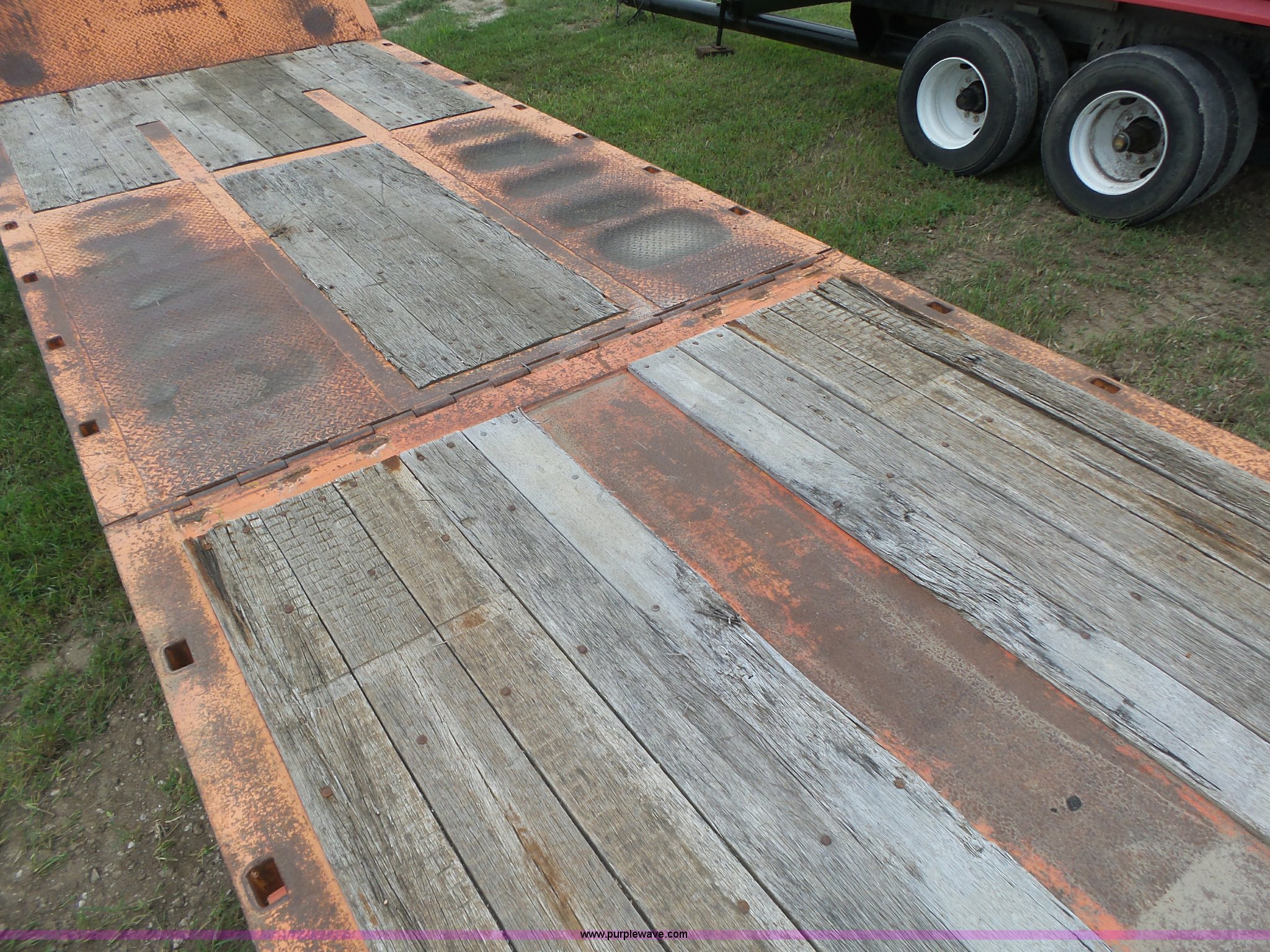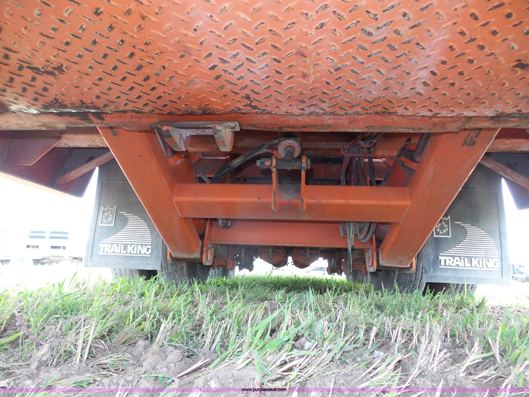 Purple Wave is selling a used Flat or Drop Deck Trailer in Iowa. This item is a 1997 Trail King TK60HT-322 drop deck equipment trailer with the following: 32'L x 102"W overall, 38" floor height, 8'L upper deck, 170"L main deck, 46"L dovetail, 93"L hydrualic ramps, Steel and wood construction, Stake side pockets, Recessed toolbox, Dual leg hydraulic landing gear, 33,000 lbs pay load capacity, Fifth wheel plate, Spring suspension, Air brakes, Steel wheels, 10R17.5 tires, GVWR 50,000 lbs, GAWR 17,640 lbs