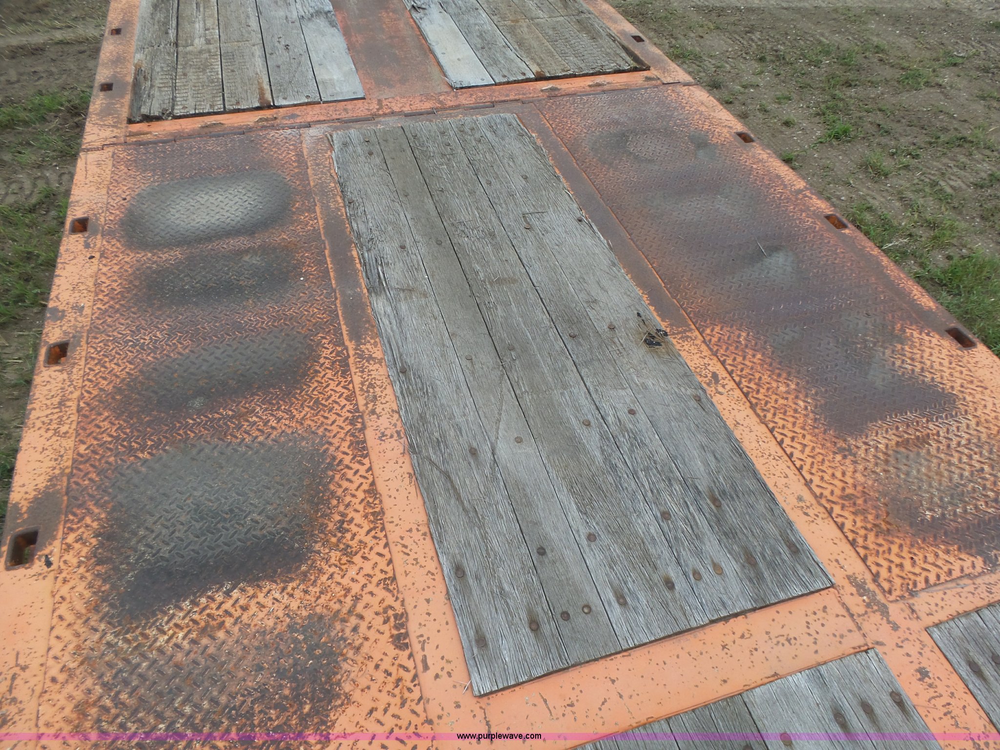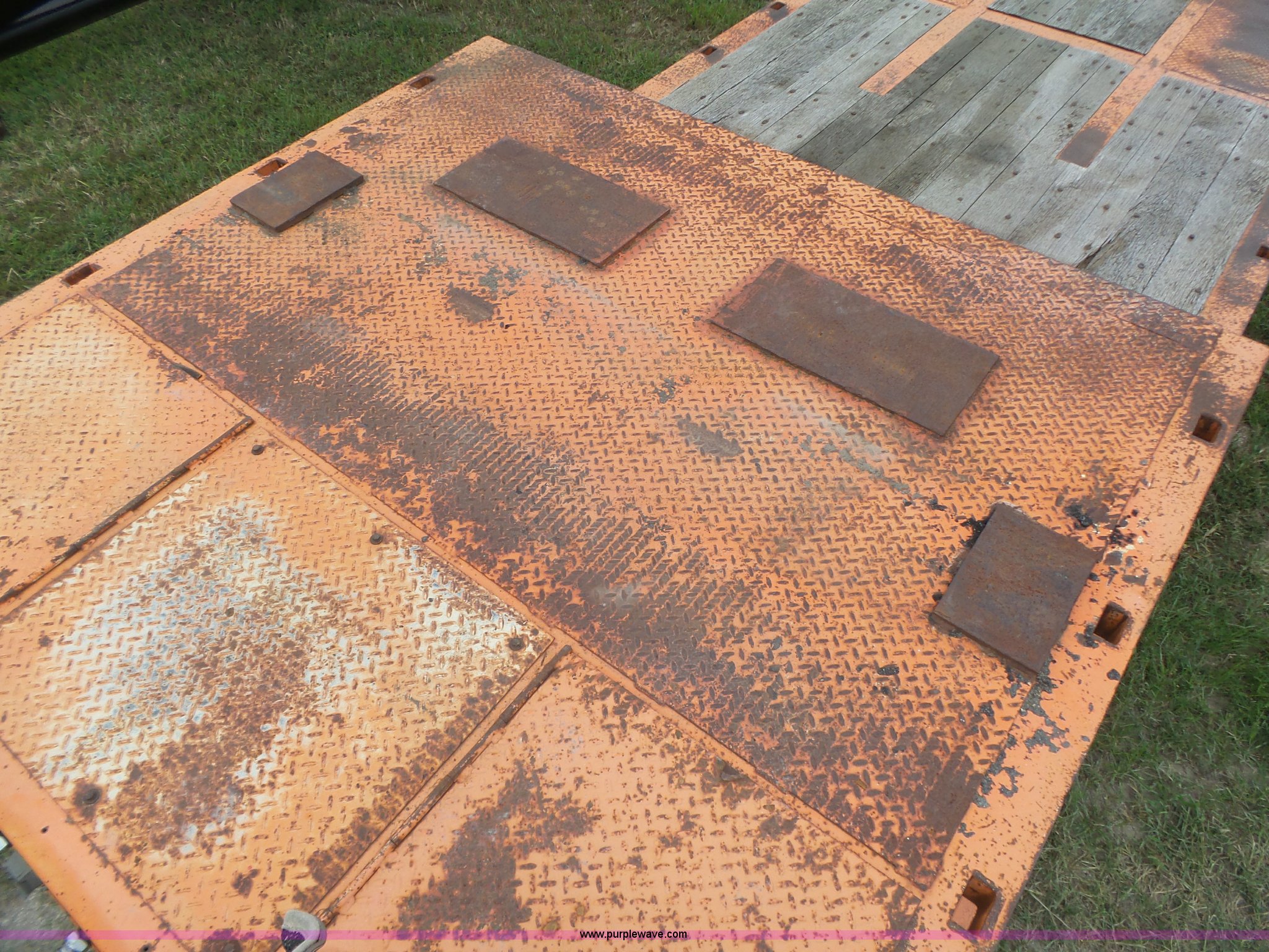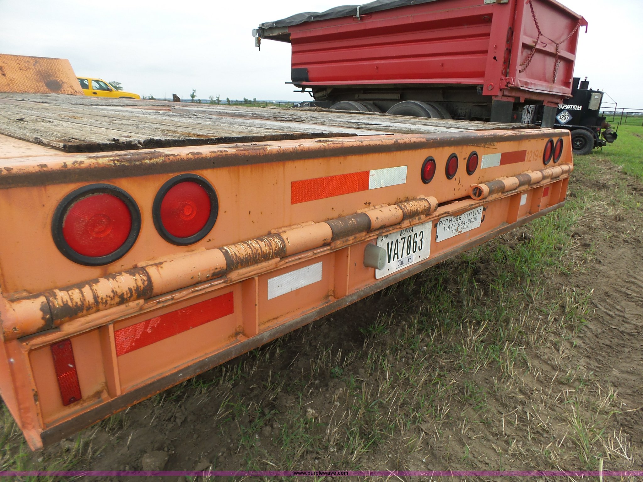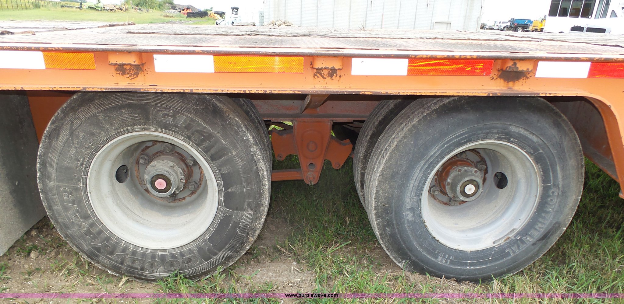 Purple Wave is selling a used Flat or Drop Deck Trailer in Iowa. This item is a 1997 Trail King TK60HT-322 drop deck equipment trailer with the following: 32'L x 102"W overall, 38" floor height, 8'L upper deck, 170"L main deck, 46"L dovetail, 93"L hydrualic ramps, Steel and wood construction, Stake side pockets, Recessed toolbox, Dual leg hydraulic landing gear, 33,000 lbs pay load capacity, Fifth wheel plate, Spring suspension, Air brakes, Steel wheels, 10R17.5 tires, GVWR 50,000 lbs, GAWR 17,640 lbs