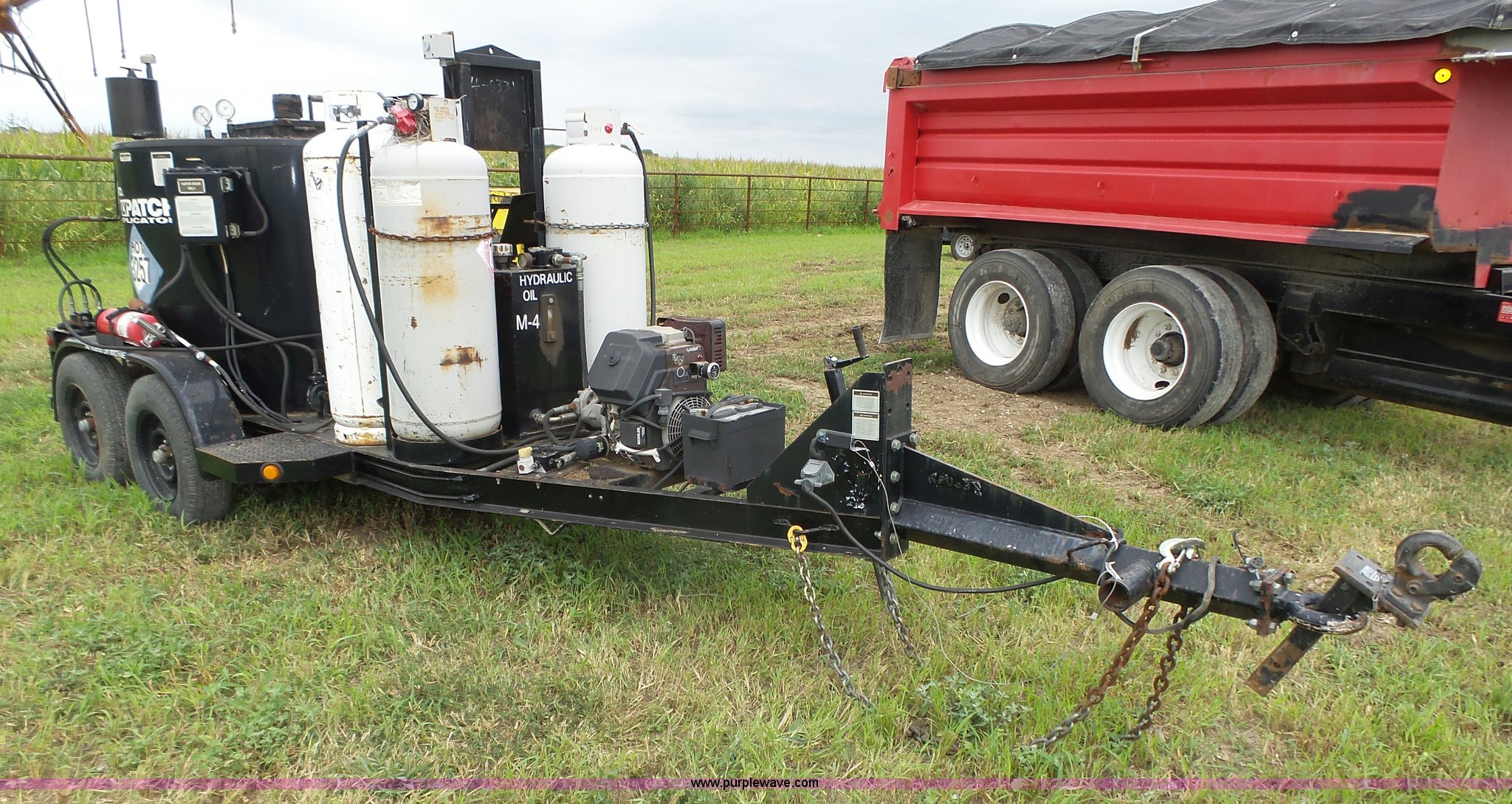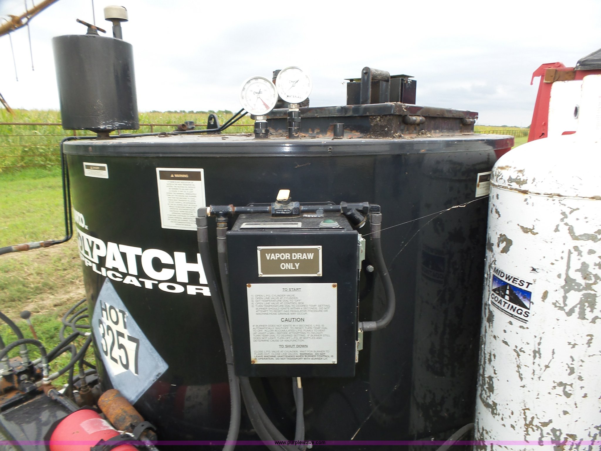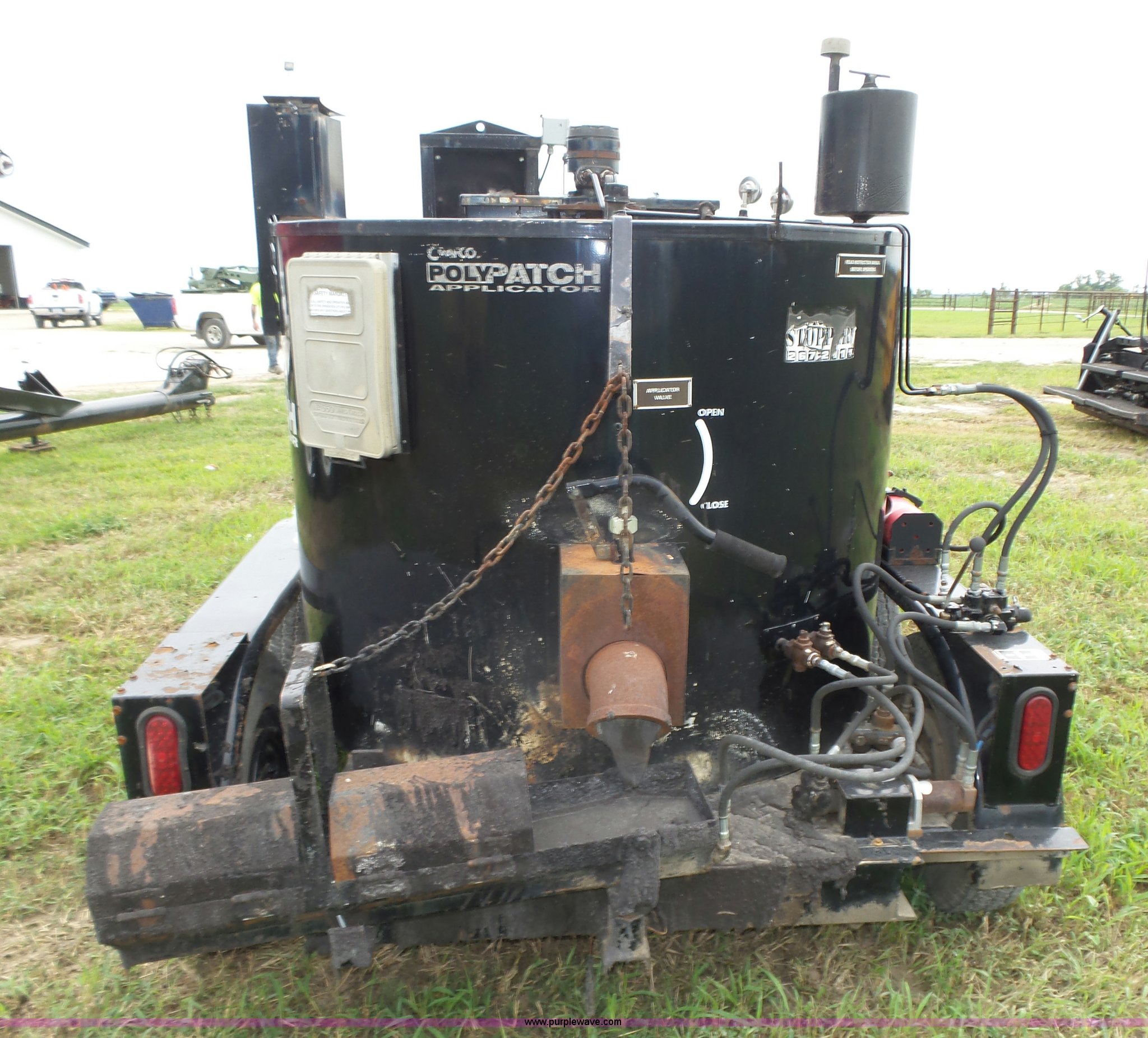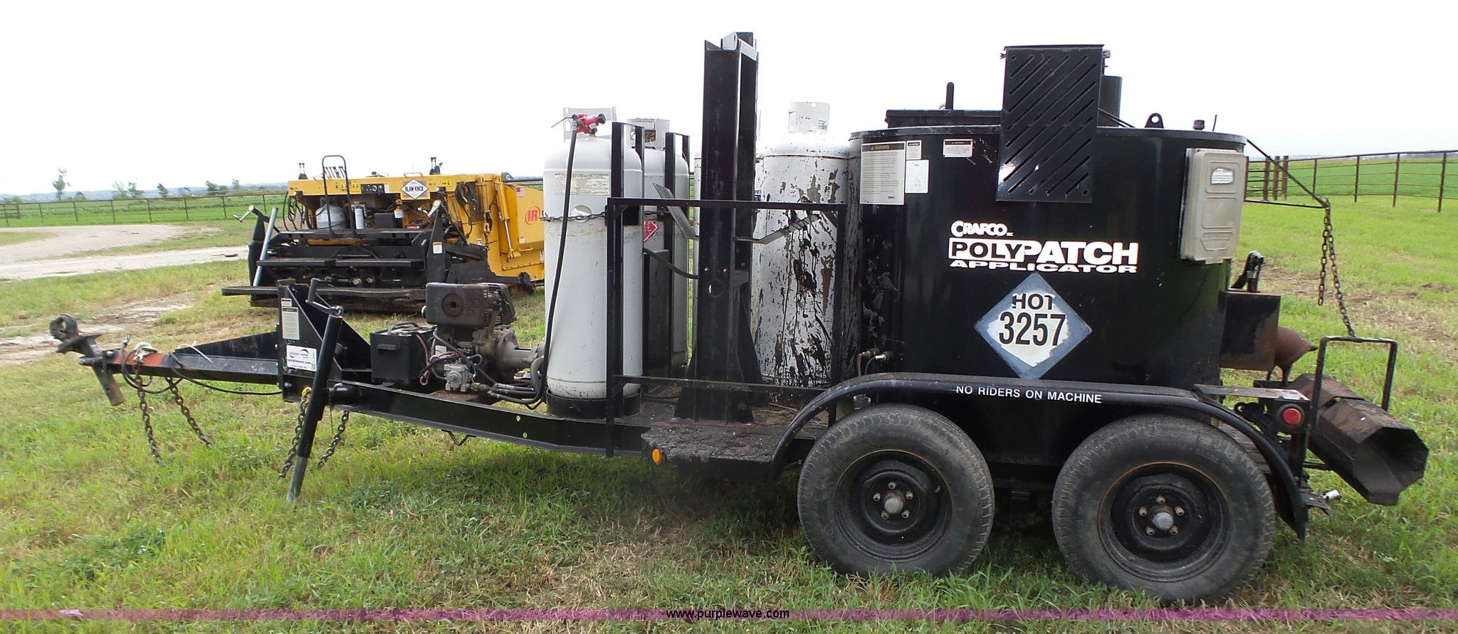 Purple Wave is selling a used Pot Hole Patcher in Iowa. This item is a 2001 Crafco Poly Patch Applicator pot hole patcher with the following: 191 hours on meter, Kohler Command Pro14 single cylinder gas engine, Control valve body for tank mixer, Heating torch, Product hydraulic splitter, (2) propane bottles, 100 lbs per bottle capacity, Rear applicator adjustable swing chute, Safety chains, Break-away cable, Pintle hitch, Truck pintle receiver hitch included, Tandem axle, Yokohama 185/R14 tires, Patch application product included, Unit# 4-0331