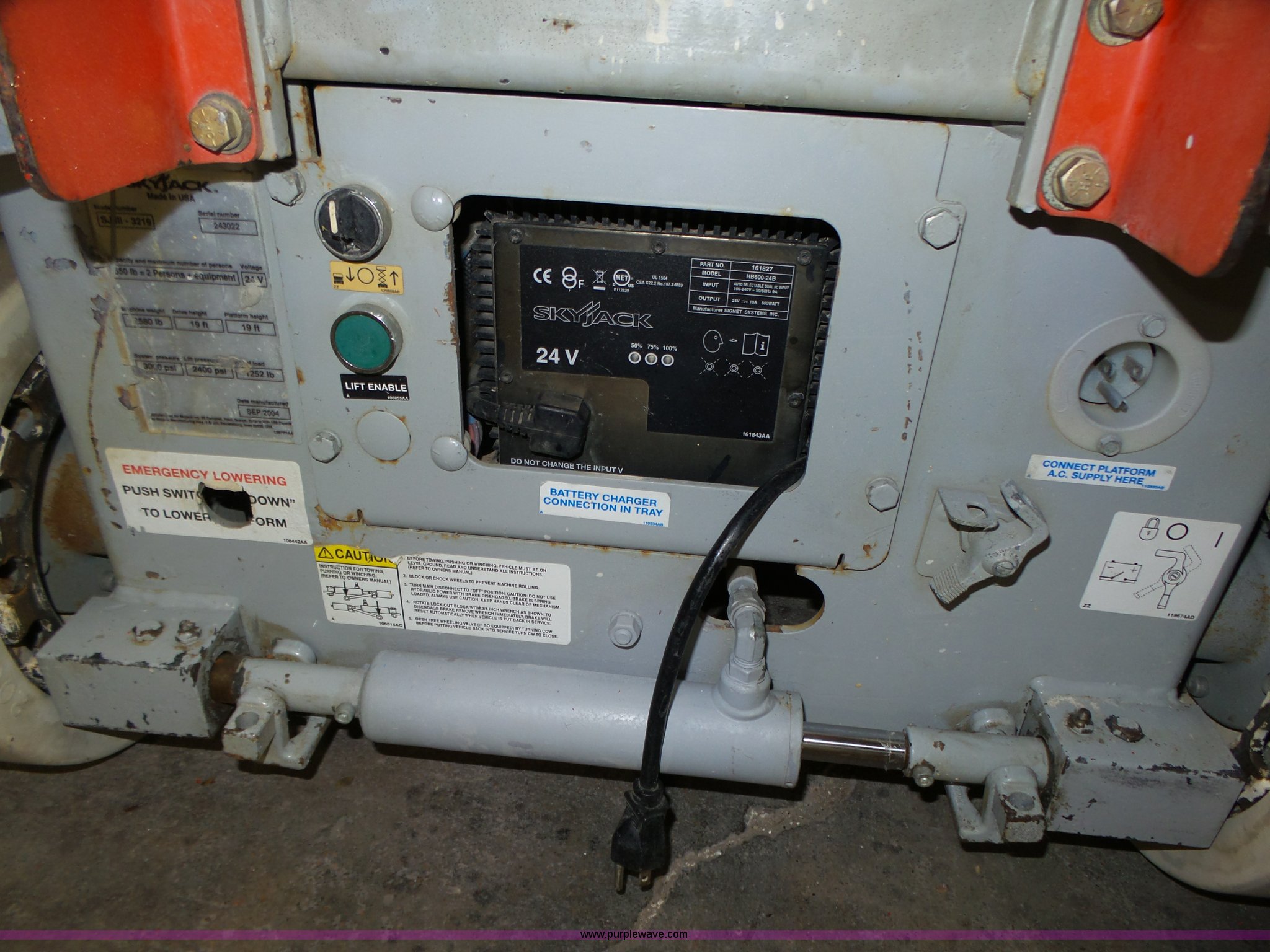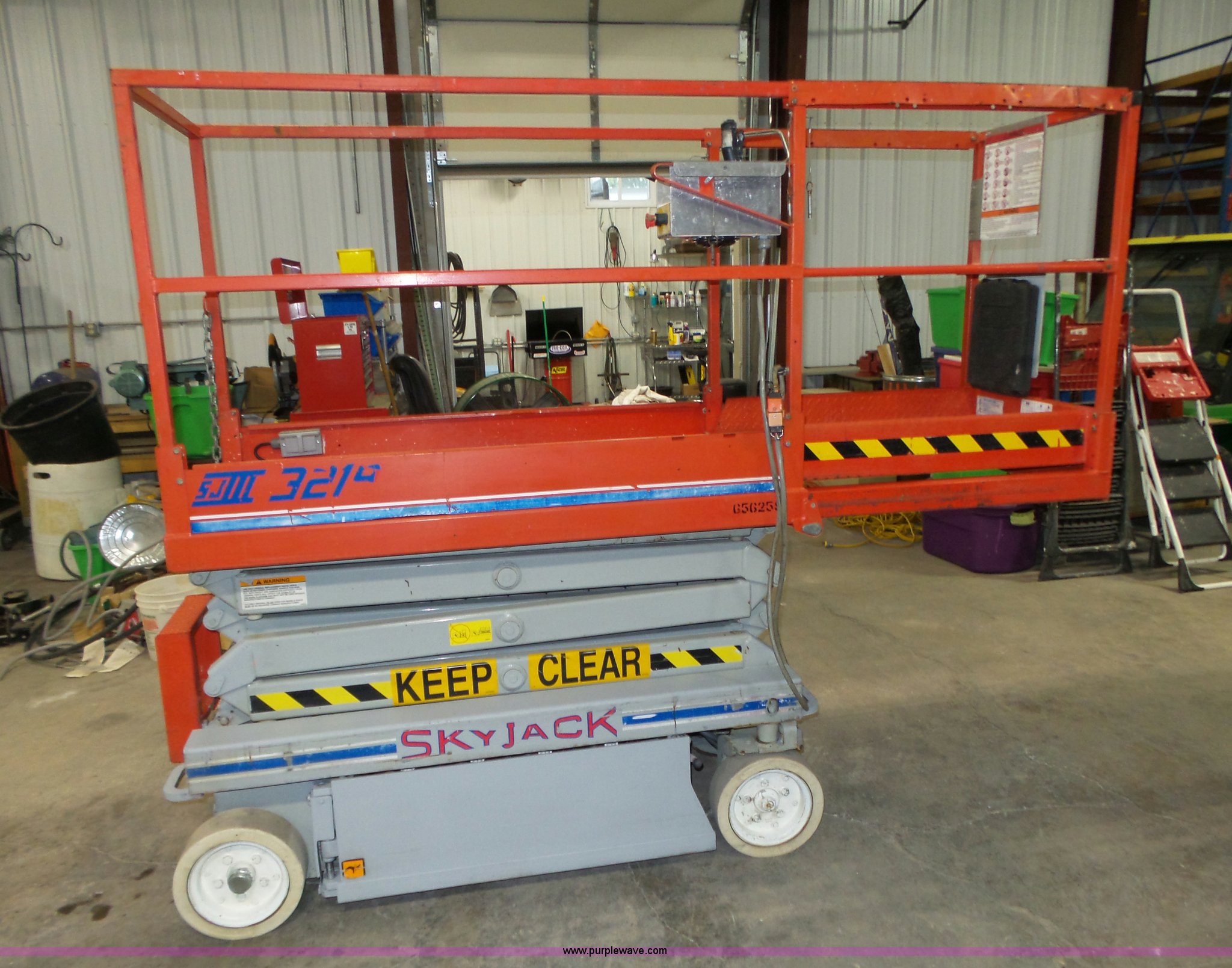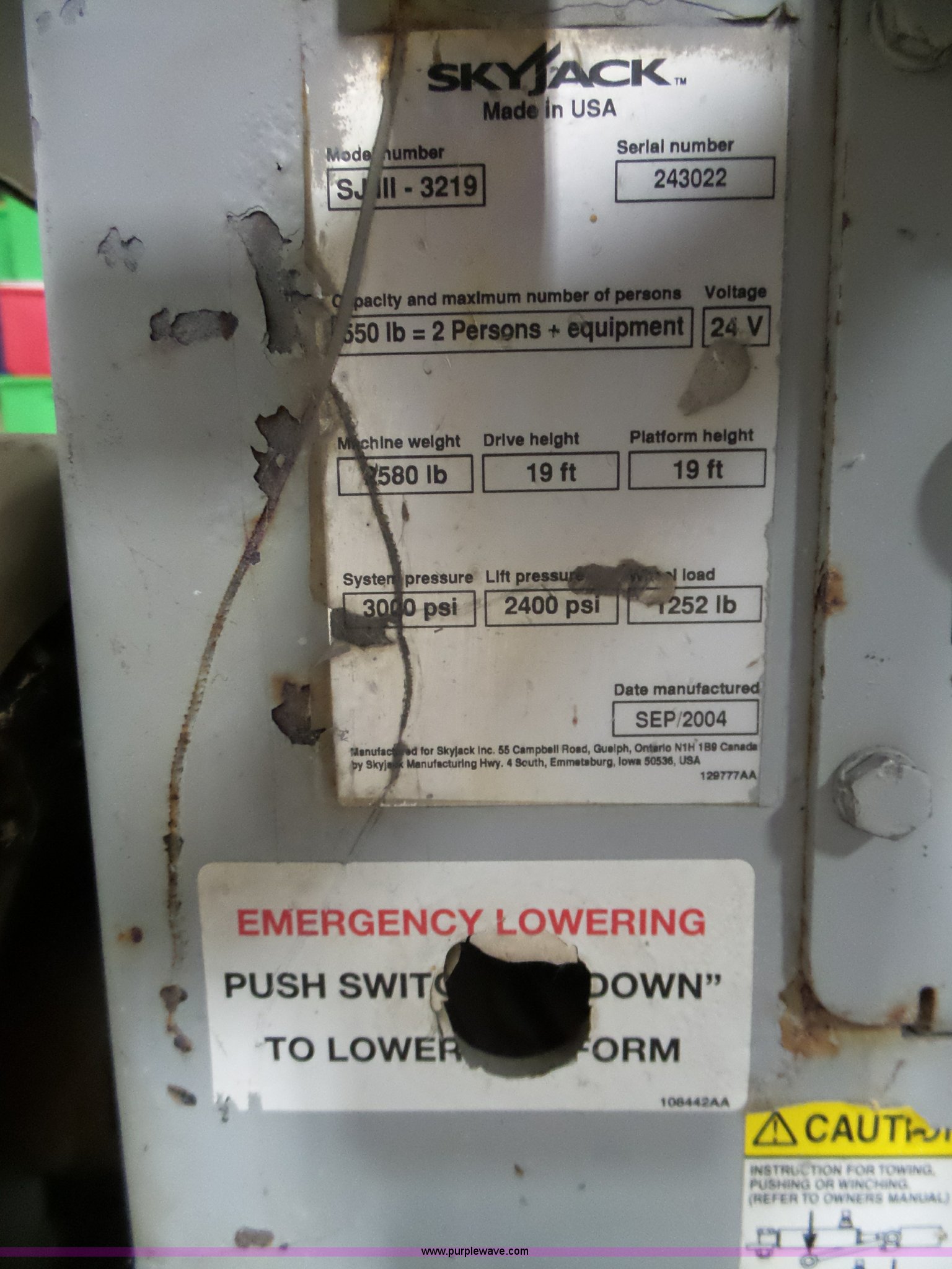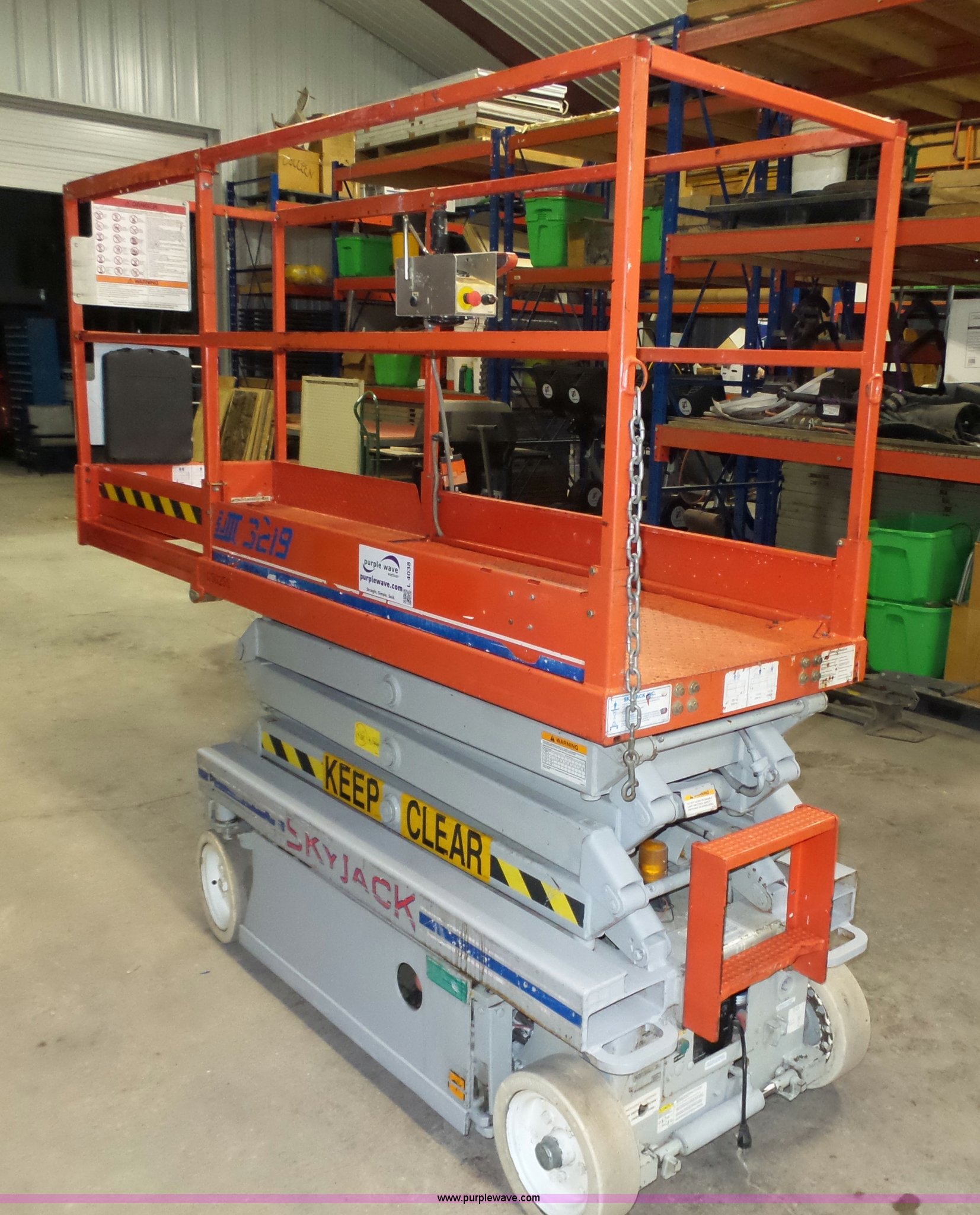 Purple Wave is selling a used Scissor or Vertical Lift in Nebraska. This item is a 2004 Sky Jack SJIII 3219 scissor lift with the following: 280 hours on meter, Electric operation, 500 lbs maximum lift capacity, 19' maximum lift height, 19' full mast drive height, 80" lowered height, 64"L x 29"W platform, 36" deck extension, 97"L O.D. with deck extended, Platform and ground controls, AC power outlet, Floor mounted D-ring tie downs, Chain safety gate, Pot hole protectors, Safety alarm, Free wheeling capability, Master battery shutoff, Non-marking tires, Skyjack HB600-24B battery charger, 24V, Operator's manual, Safety manual, ANSI manual, Serial 243022, Unit# 656259