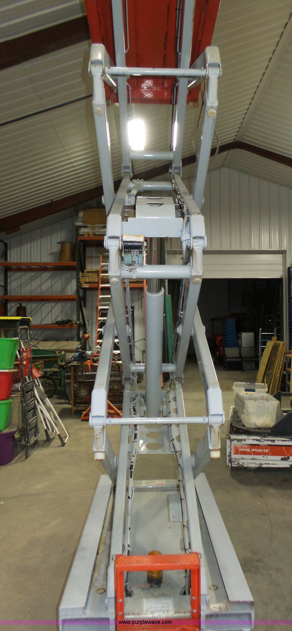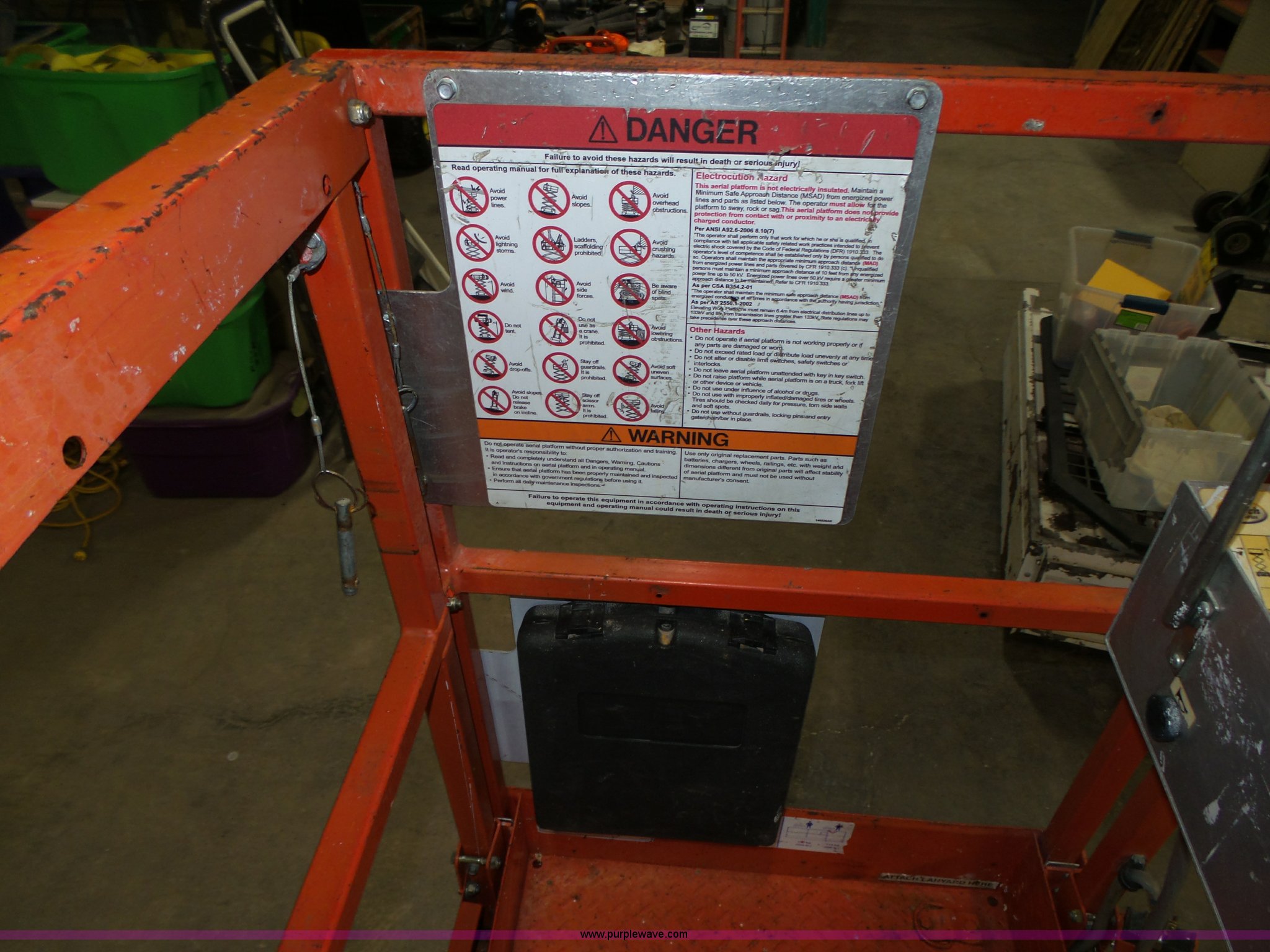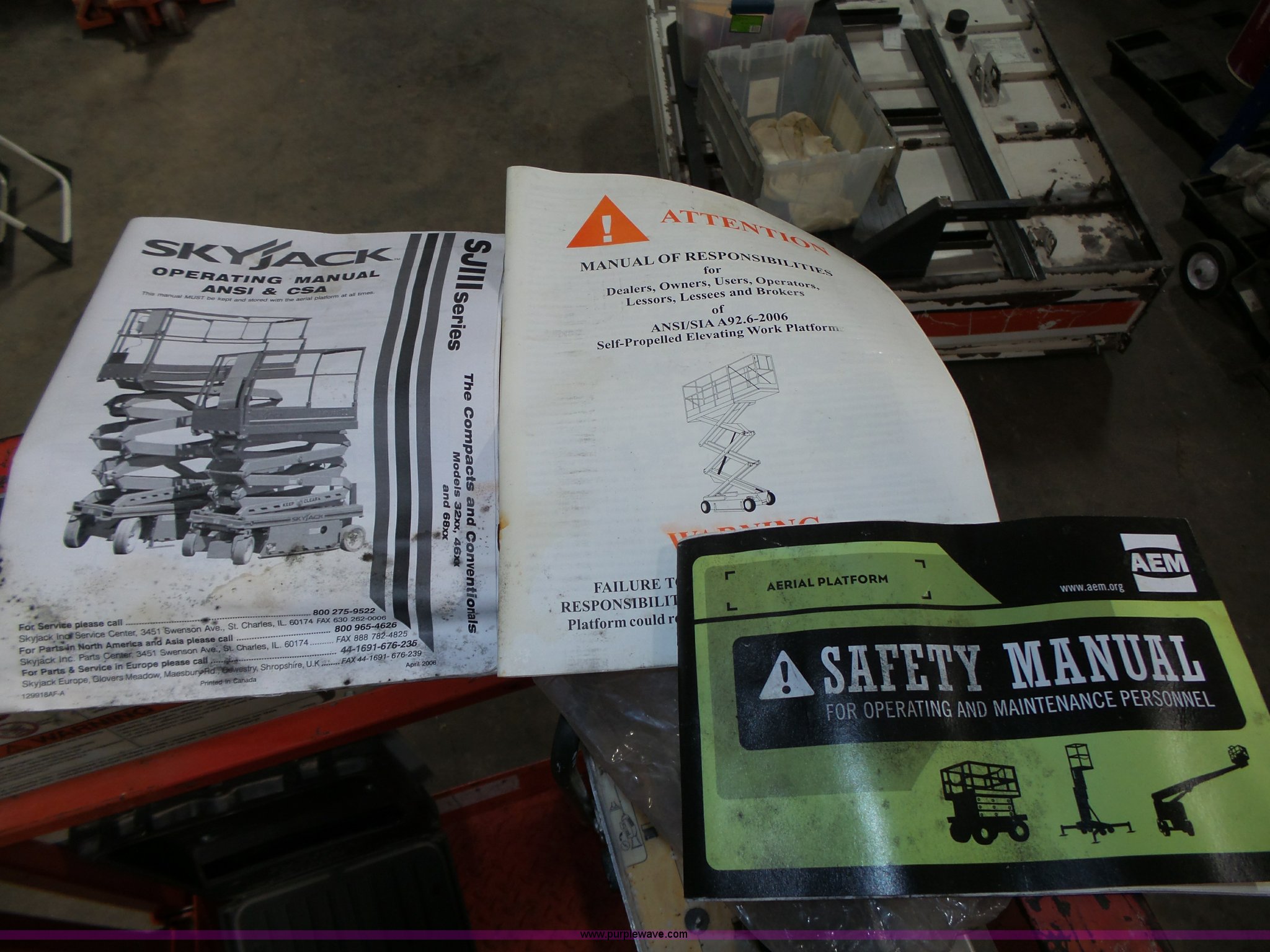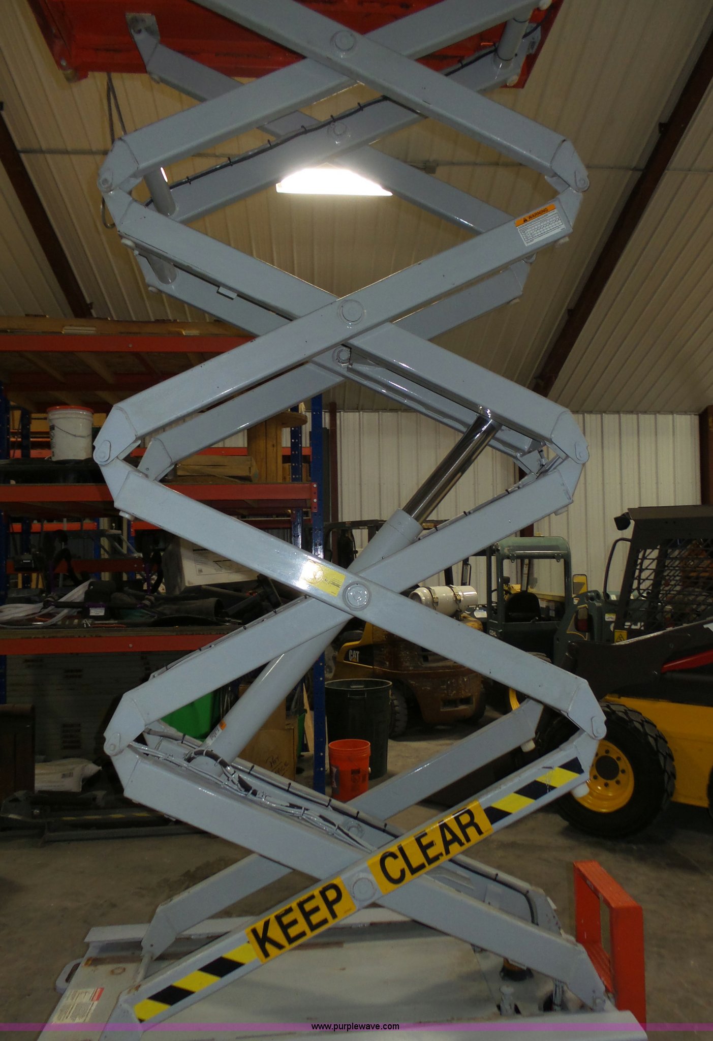 Purple Wave is selling a used Scissor or Vertical Lift in Nebraska. This item is a 2004 Sky Jack SJIII 3219 scissor lift with the following: 280 hours on meter, Electric operation, 500 lbs maximum lift capacity, 19' maximum lift height, 19' full mast drive height, 80" lowered height, 64"L x 29"W platform, 36" deck extension, 97"L O.D. with deck extended, Platform and ground controls, AC power outlet, Floor mounted D-ring tie downs, Chain safety gate, Pot hole protectors, Safety alarm, Free wheeling capability, Master battery shutoff, Non-marking tires, Skyjack HB600-24B battery charger, 24V, Operator's manual, Safety manual, ANSI manual, Serial 243022, Unit# 656259