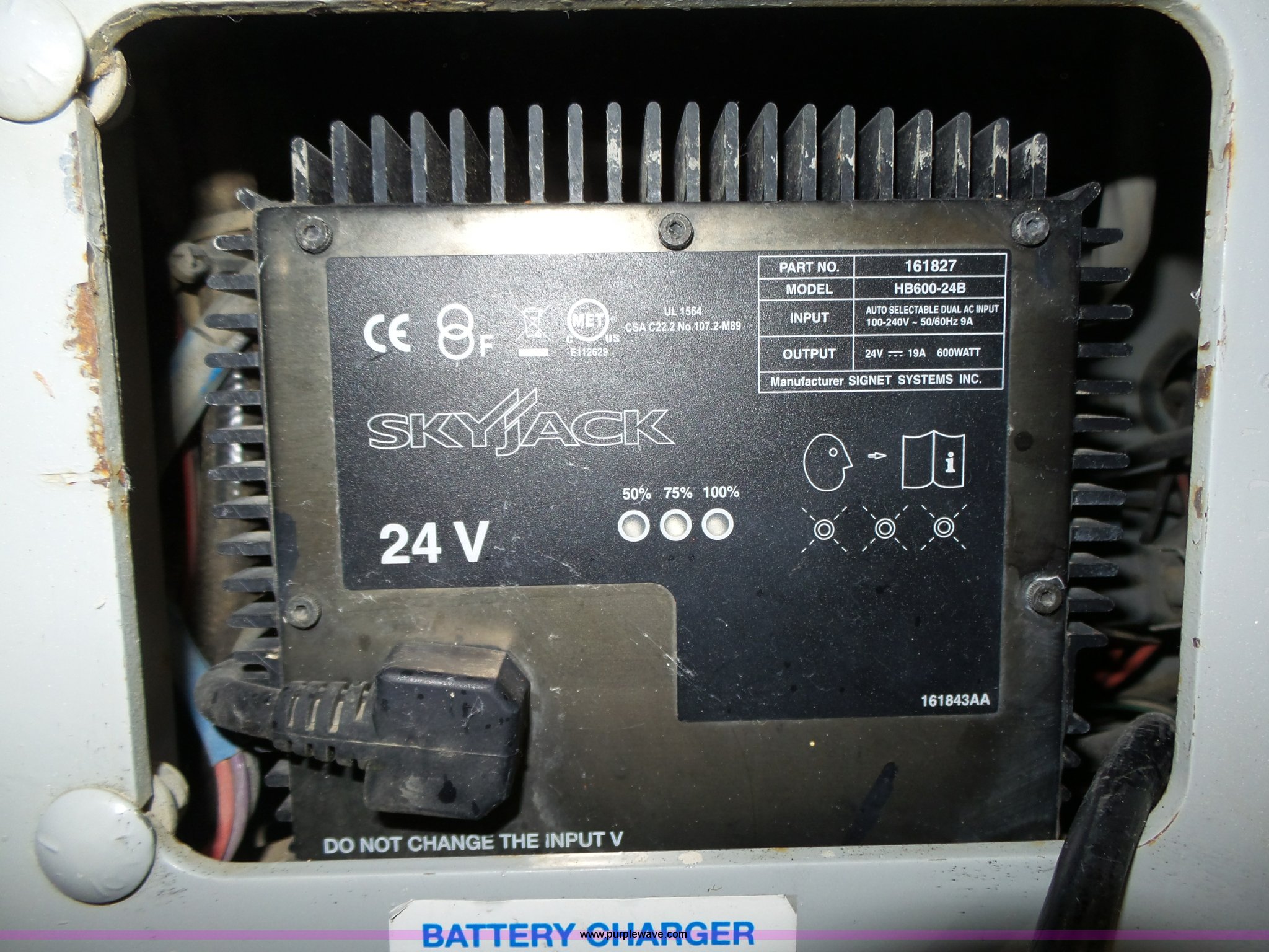 2004 Sky Jack SJIII 3219 scissor lift. 280 hours on meter, Electric operation, 500 lbs maximum lift capacity, 19' maximum lift height, 19' full mast drive height, 80" lowered height, 64"L x 29"W platform 36" deck extension, 97"L O.D. with deck extended, Platform and ground controls, AC power outlet, Floor mounted D-ring tie downs, Chain safety gate, Pot hole protectors, Safety alarm, Free wheeling capability, Master battery shutoff, Non-marking tires, Skyjack HB600-24B battery charger 24V, Operator's manual , Safety manual, ANSI manual, Serial 243022, Unit# 656259. Nebraska Building Services. 15505 A Street. Roca, NE 68430