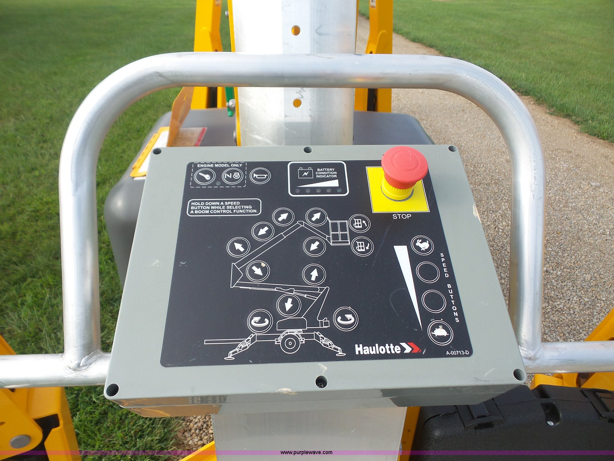Purple Wave is selling a used Boom Lift in Kansas. This item is a 2015 Haulotte 5533A towable boom lift with the following: 88 hours on meter, 943 total hours, 24V operation, 500 lbs maximum lift capacity, 33'5" maximum reach length, 55'3" maximum lift height, Articulating boom, 4'L x 2.5'W platform, Platform and ground controls, Hydraulic platform rotation, Hydraulic outriggers, 2" ball hitch, 225/75R15 tires, Unit has been tipped over and repaired, Serial 55A16-00025