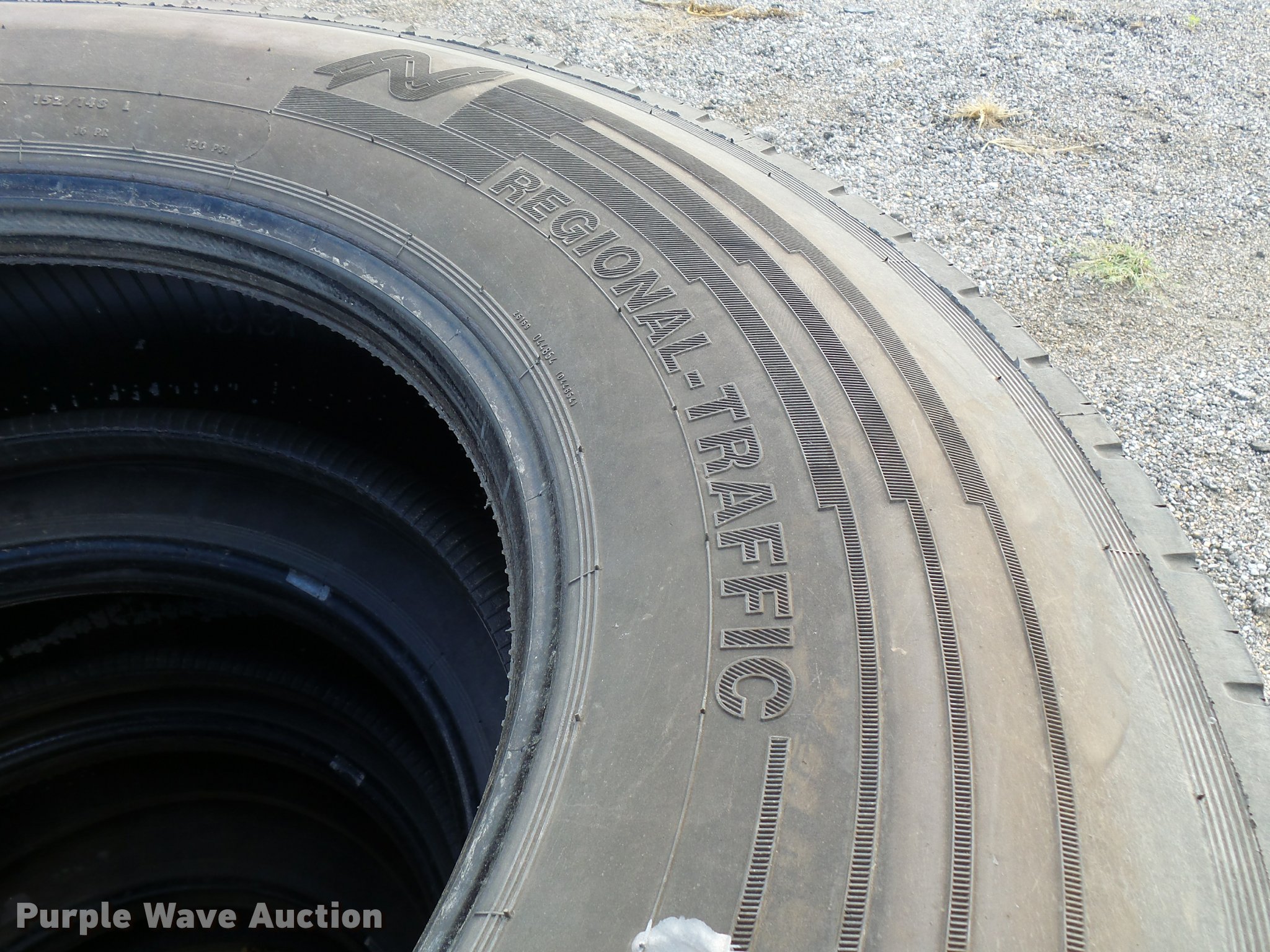 Purple Wave is selling a used Fleet Tires in Kansas. This item is a (4) Continental 12R22.5 tires with the following: Regroovable
