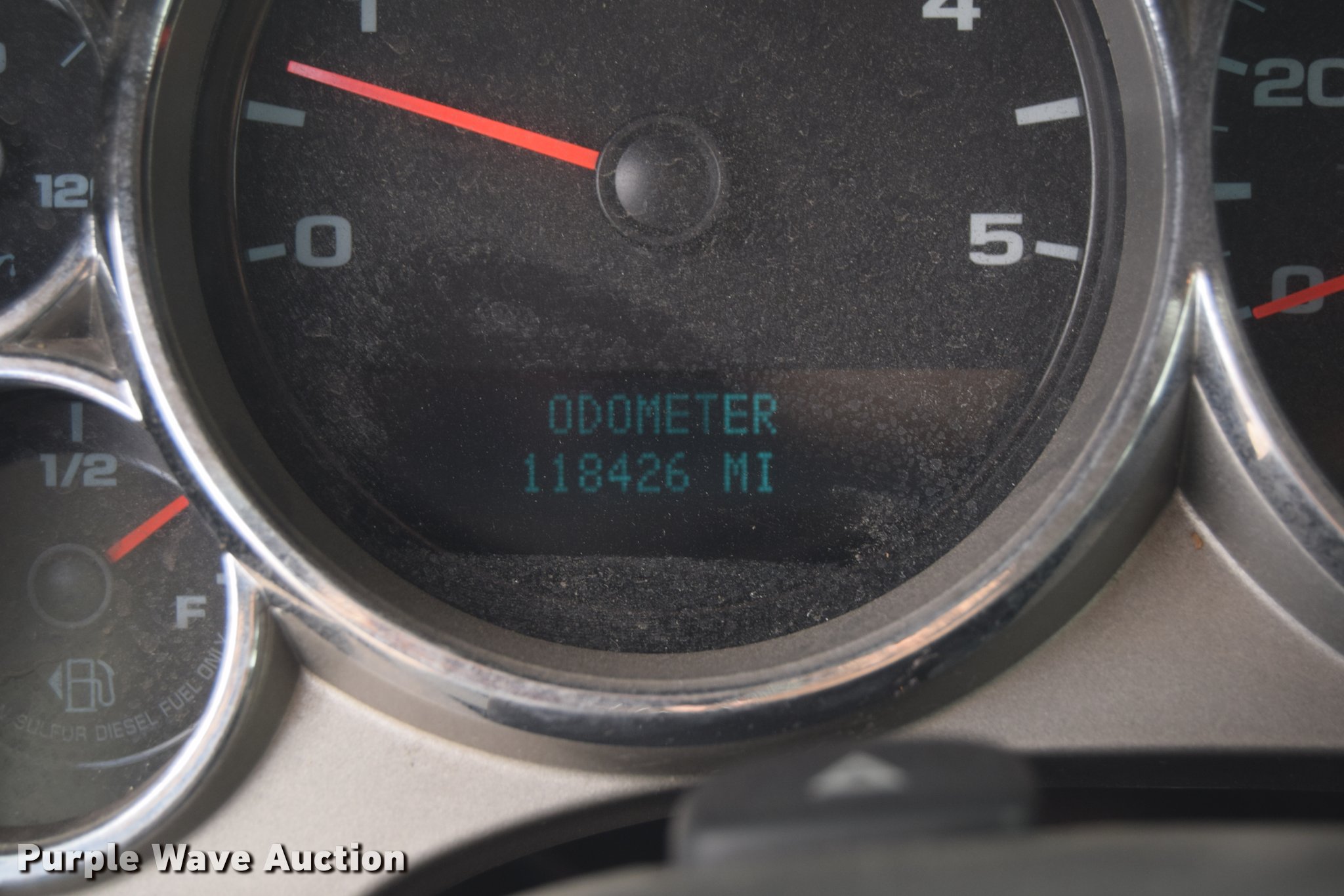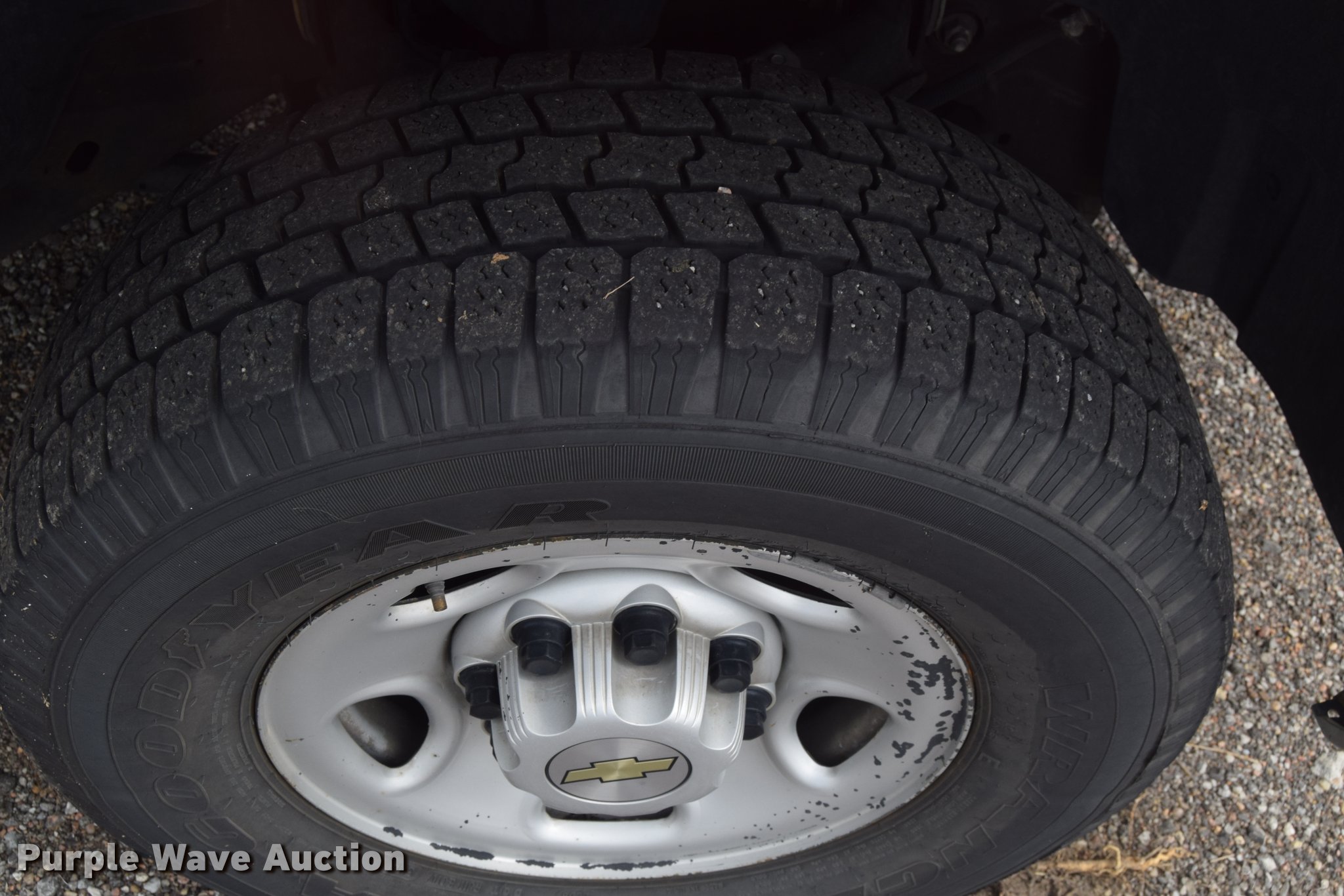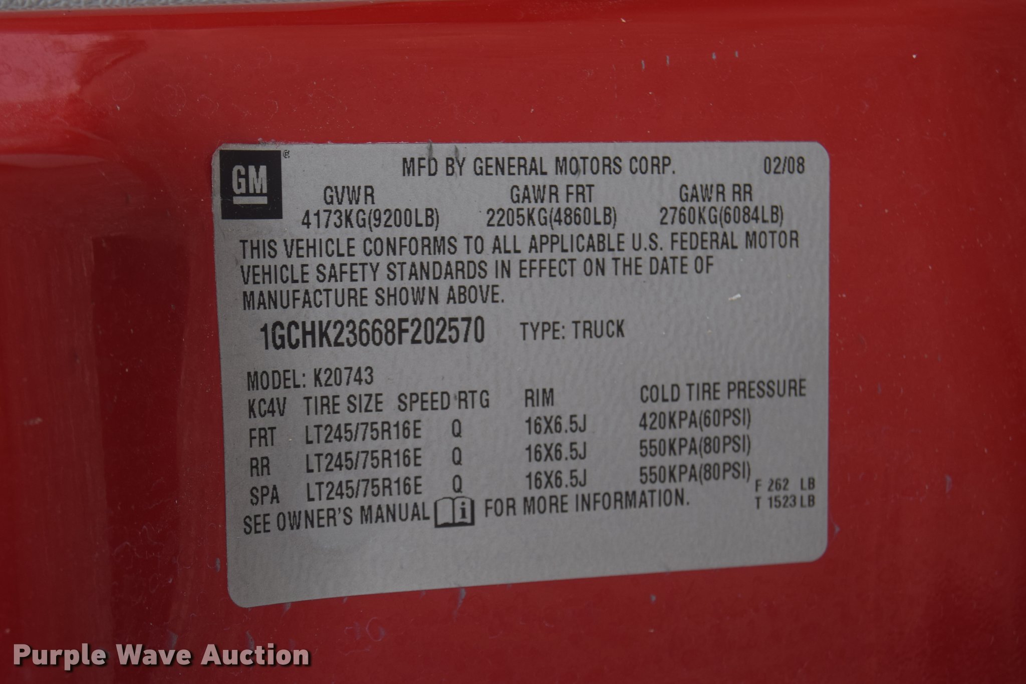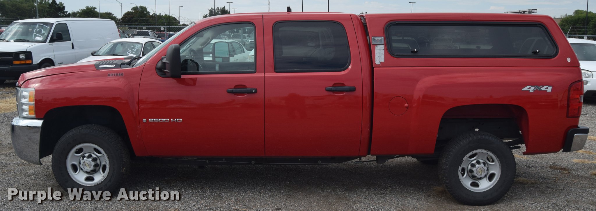 Purple Wave is selling a used 3/4 or 1 Ton Pickup or Van in Kansas. This item is a 2008 Chevrolet Silverado 2500HD Crew Cab pickup truck with the following: 118,426 miles on odometer, 6.6L V8 OHV 32V turbo diesel engine, Automatic transmission, Four wheel drive, AC and heat, Tilt, AM/FM, Power windows, locks, and mirrors, Vinyl interior, Fog lights, CTC fiberglass topper, Slide-out bed tray, Strobe bar, Front tow hooks, LT245/75R16 tires, Hail damage, One rear seat missing, Unit# 001686