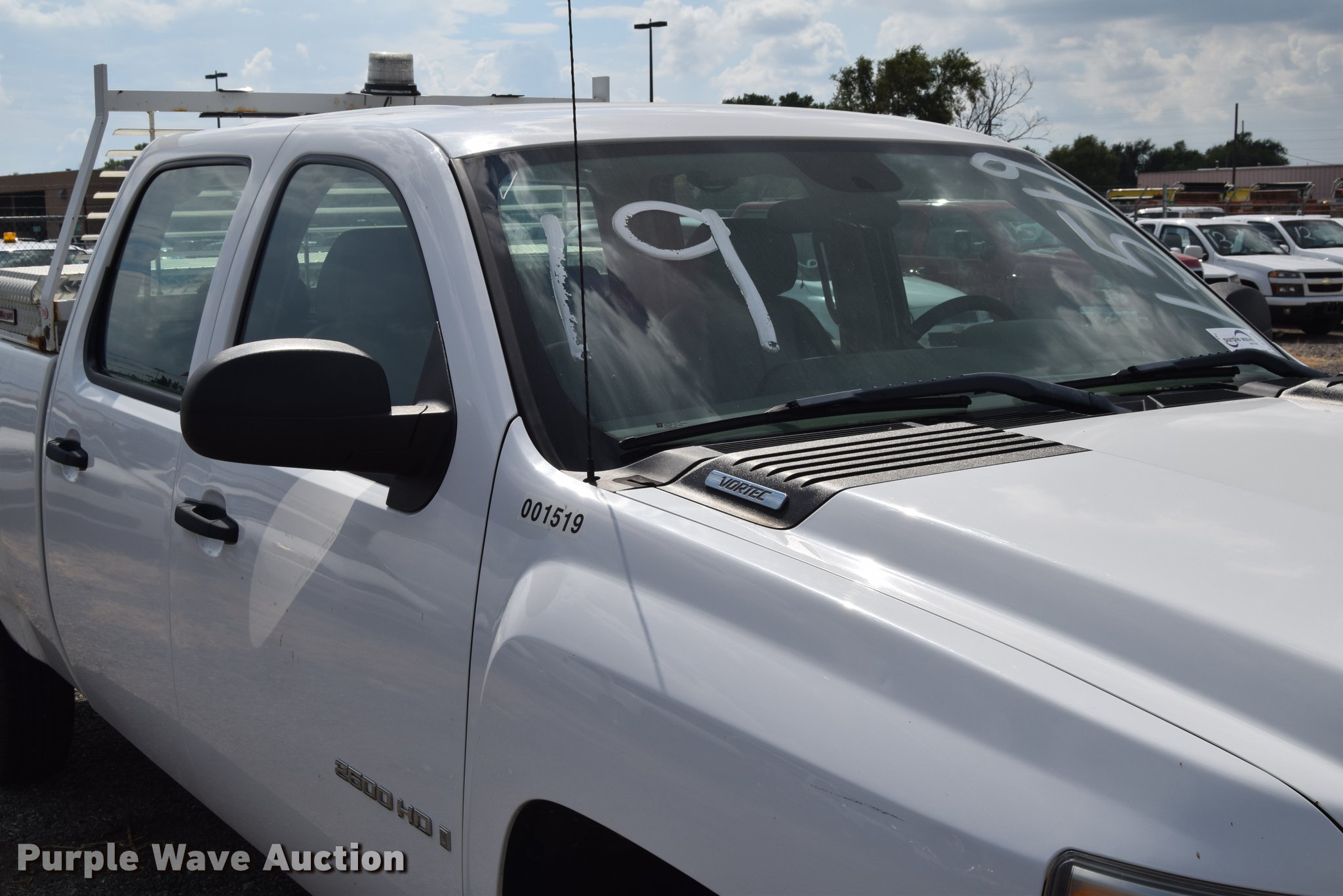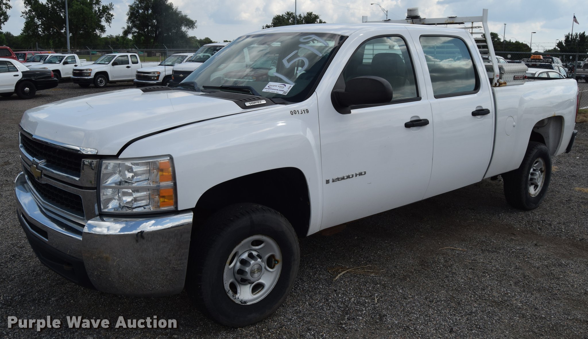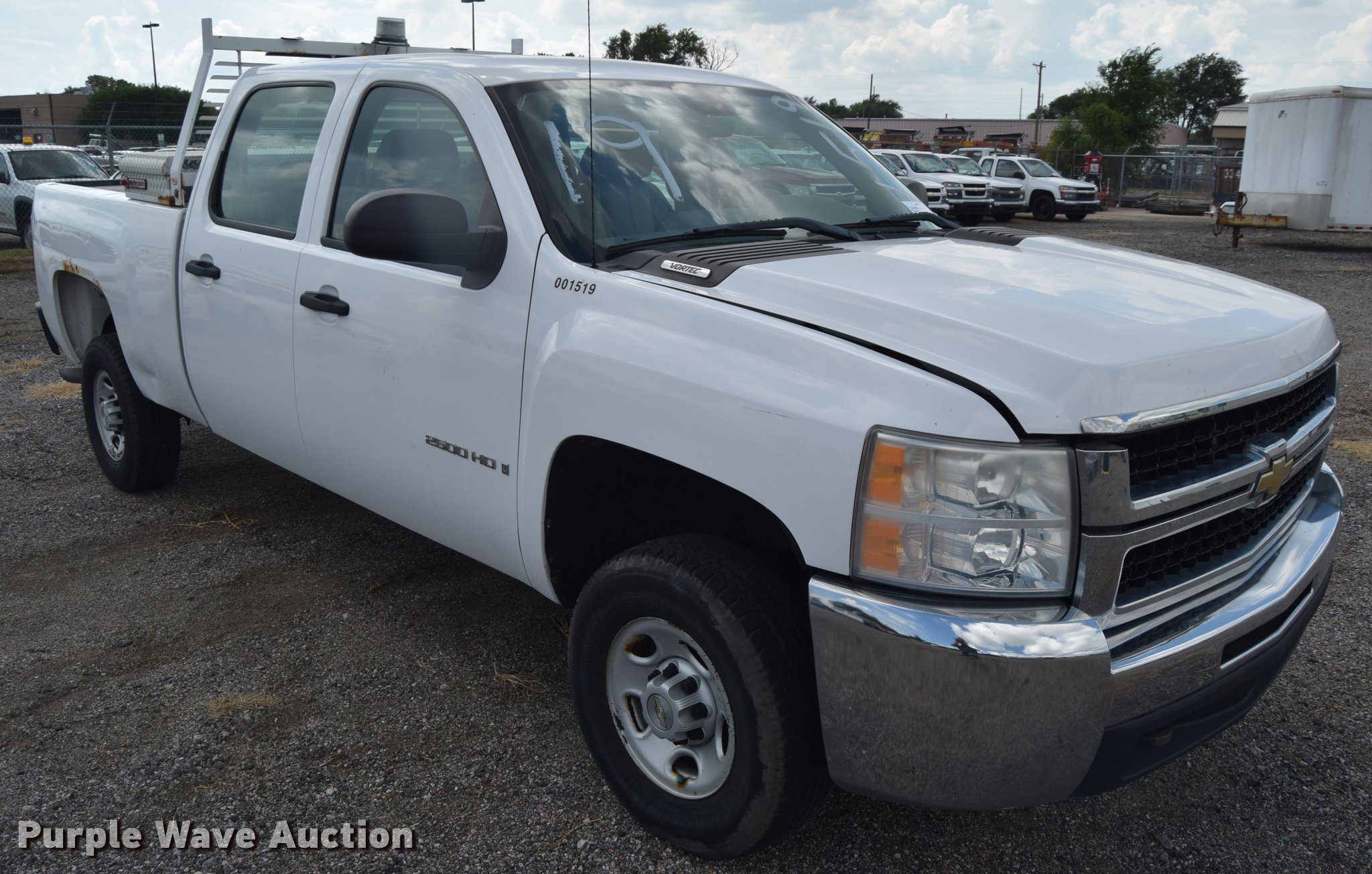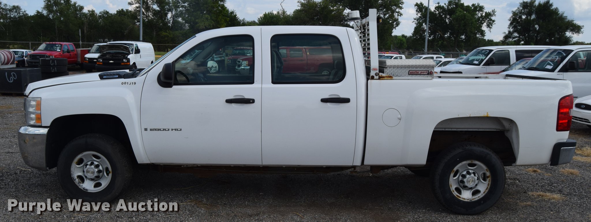 Purple Wave is selling a used 3/4 or 1 Ton Pickup or Van in Kansas. This item is a 2007 Chevrolet Silverado 2500HD Crew Cab pickup truck with the following: 82,162 miles on odometer, 6.0L V8 OHV 16V gas engine, Automatic transmission, AC and heat, Tilt, AM/FM, Manual windows, Power locks, Vinyl interior, Headache rack, Strobe light, Front tow hook, Receiver hitch, Trailer wiring, LT245/75R16 tires, Trailer outlet missing, Battery weak, Body damage, Rear bumper damage, Rust, Unit# 1519
