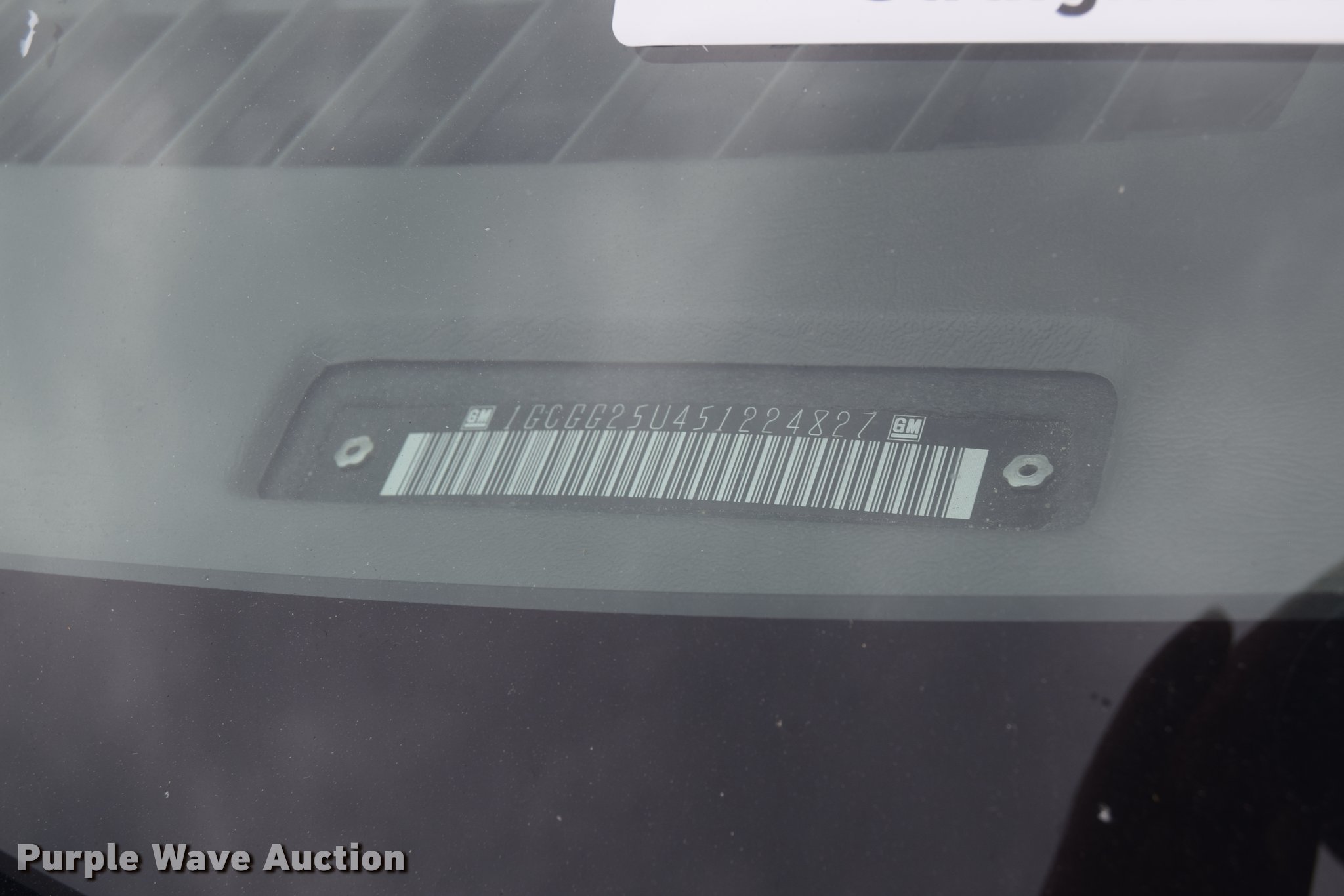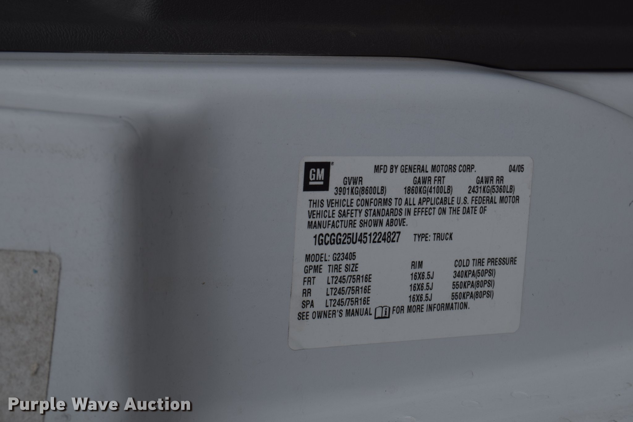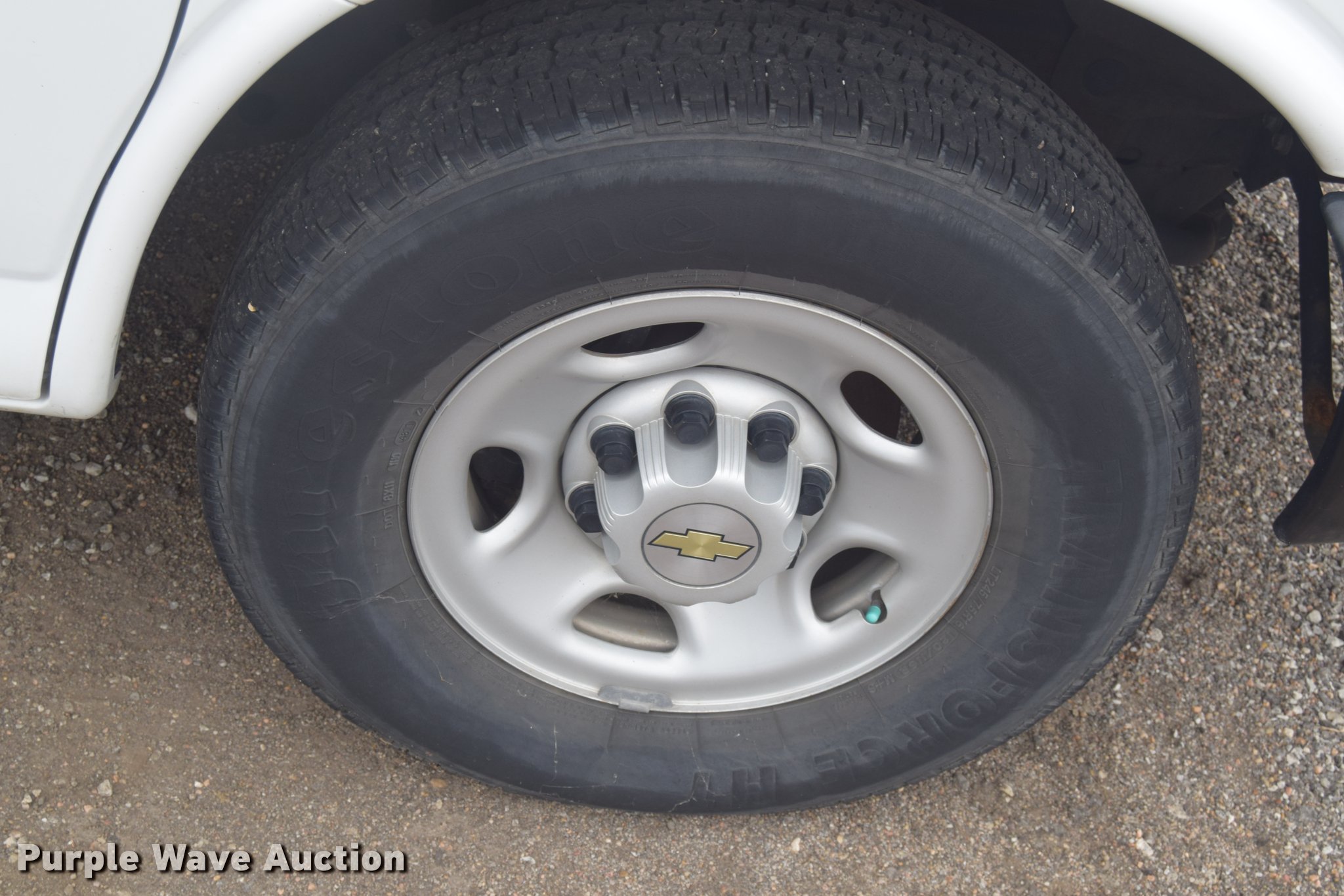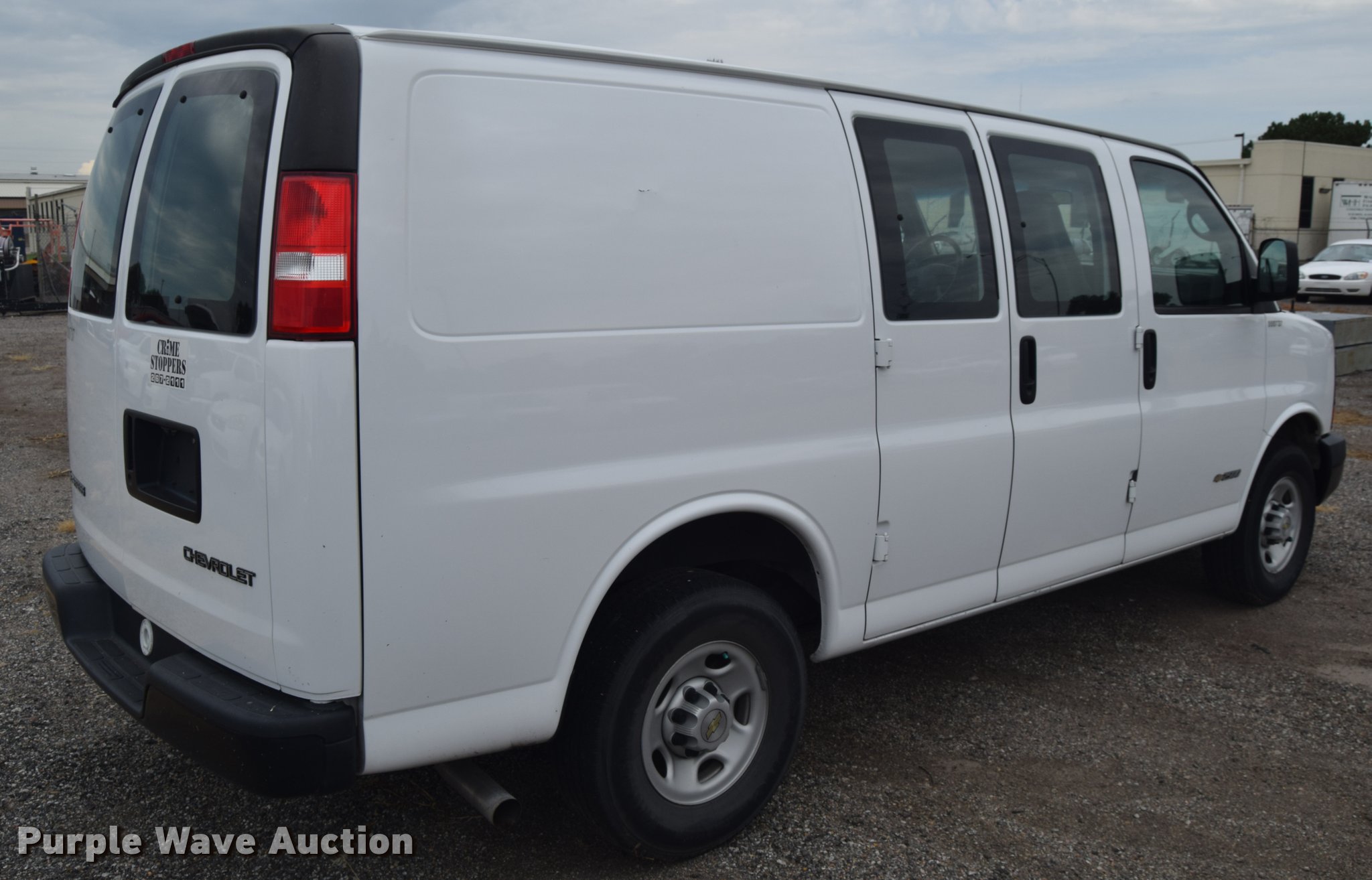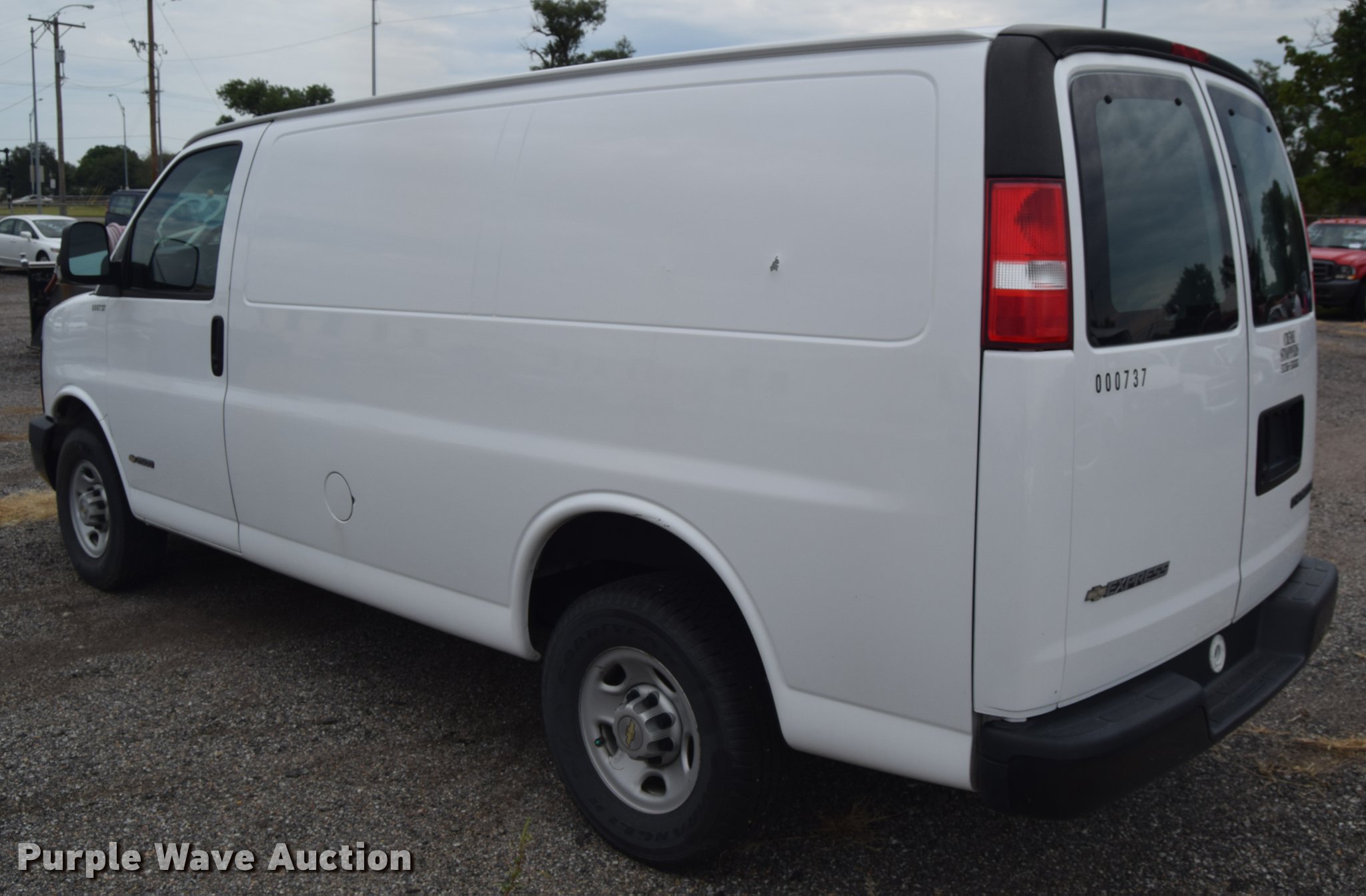 Purple Wave is selling a used 3/4 or 1 Ton Pickup or Van in Kansas. This item is a 2005 Chevrolet Express 2500 Cargo van with the following: 84,365 miles on odometer, 6.0L V8 OHV 16V gas engine, Automatic transmission, AC and heat, AM/FM, Power windows, locks, and mirrors, Vinyl interior, LT245/75R16 tires, Port hole in roof, Unit# 737