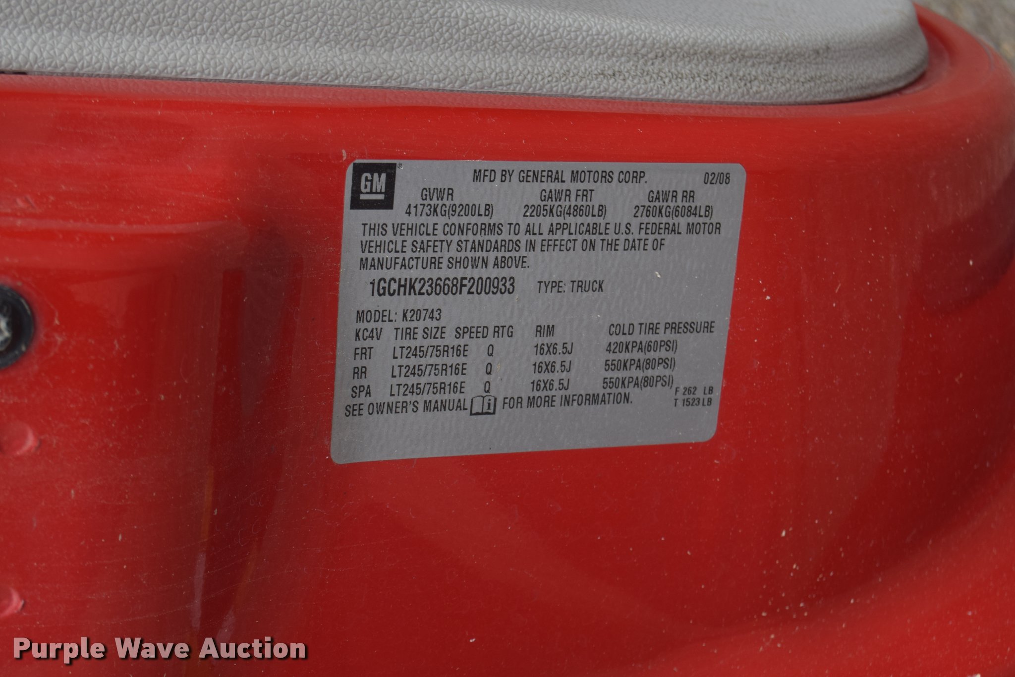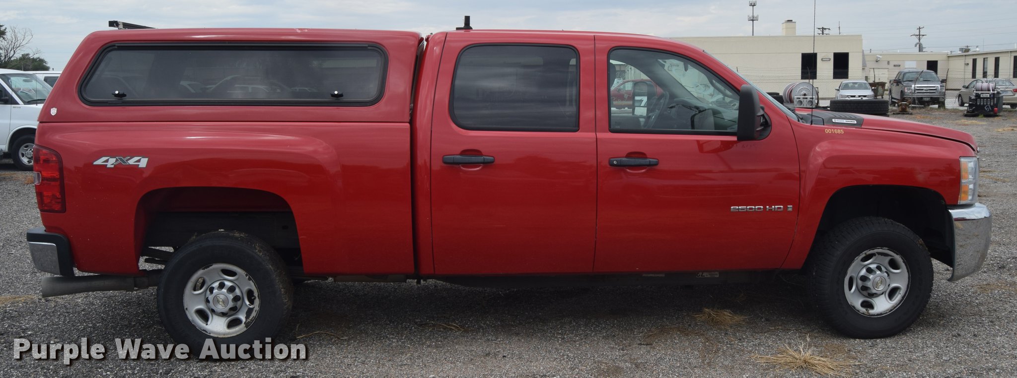 Purple Wave is selling a used 3/4 or 1 Ton Pickup or Van in Kansas. This item is a 2008 Chevrolet Silverado 2500HD Crew Cab pickup truck with the following: 98,813 miles on odometer, 6.6L V8 OHV 32V turbo diesel engine, Automatic transmission, Four wheel drive, AC and heat, Tilt, AM/FM, Power windows, locks, and mirrors, Vinyl interior, CTC fiberglass topper, Slide-out bed tray, Strobe light, Front tow hook, LT245/75R16 tires, Body damage, One rear seat missing, Interior cosmetic damage, Unit# 1685
