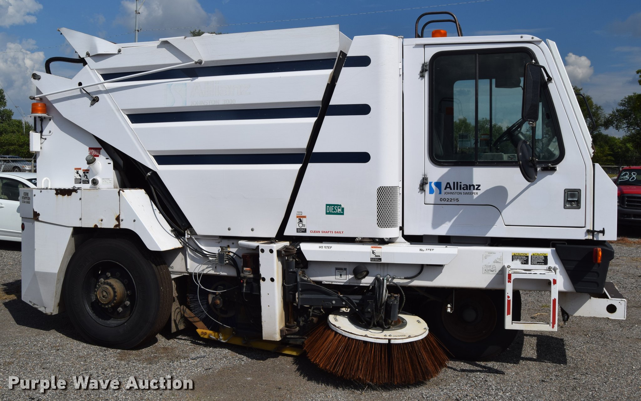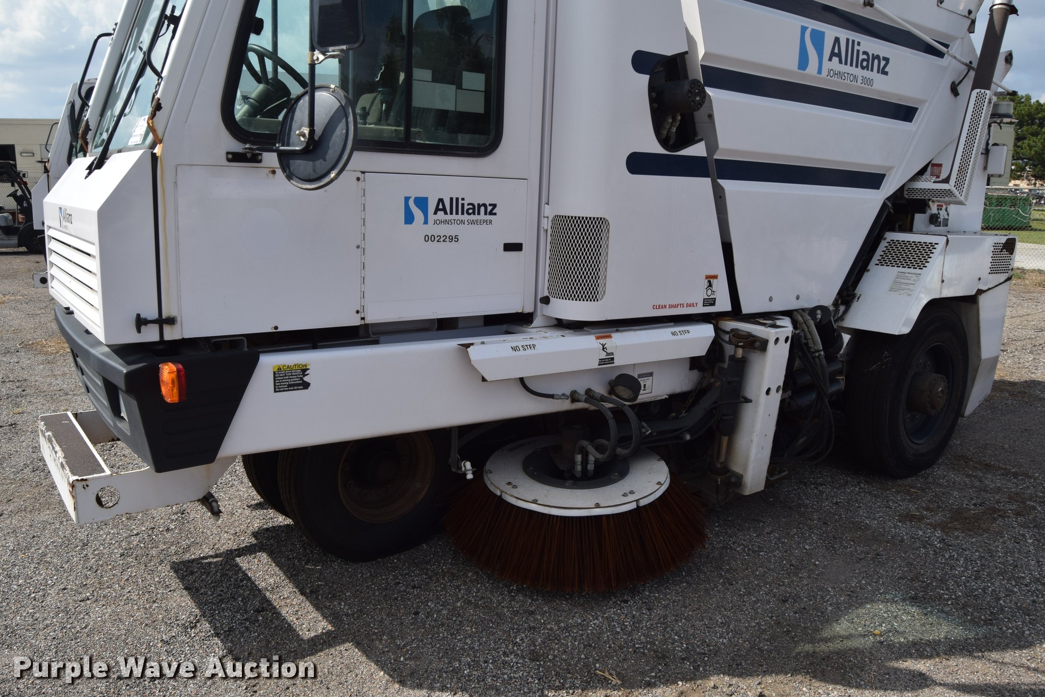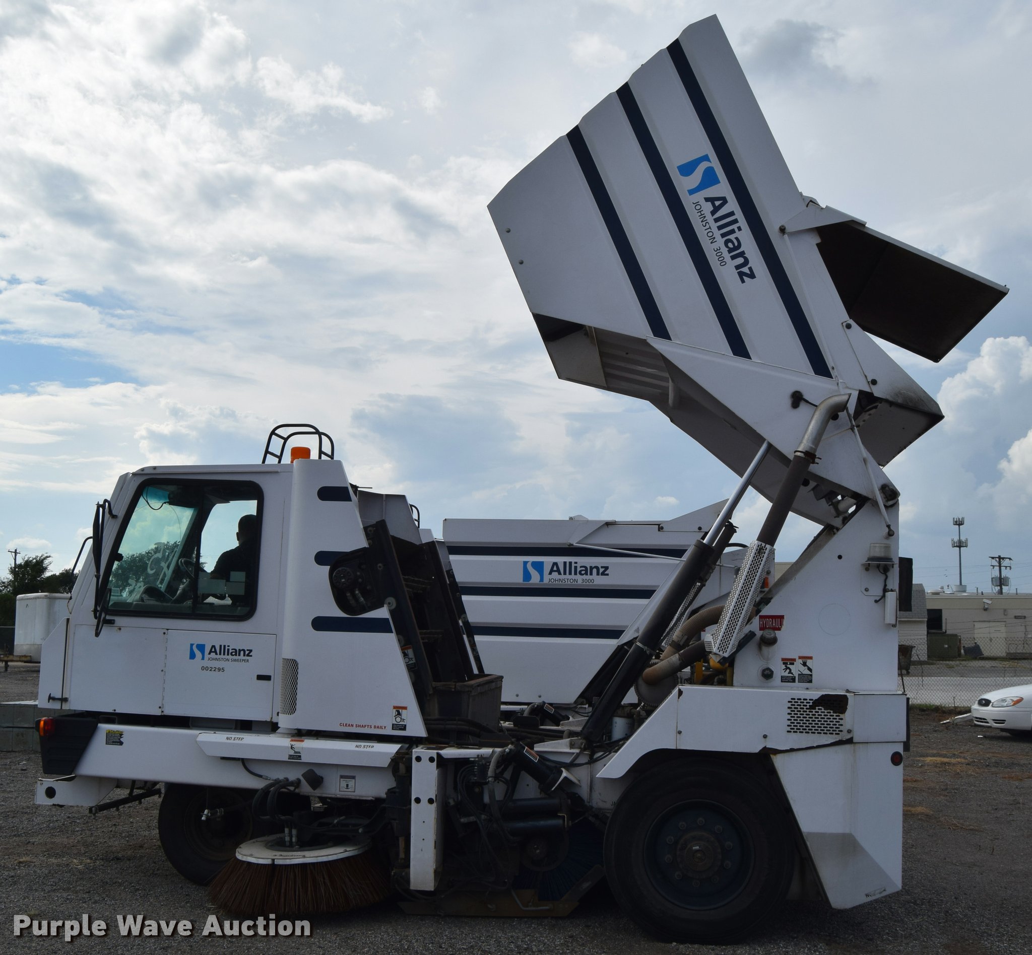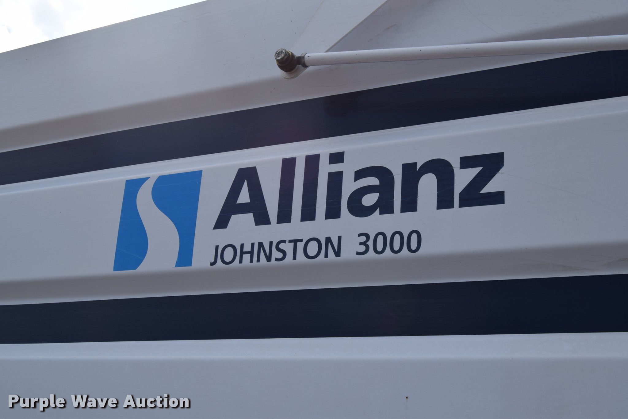 Purple Wave is selling a used Sweeper in Kansas. This item is a 2010 Allianz Johnston 3000 street sweeper with the following: 23,946 miles on odometer, 4,389 engine hours on meter, 2,162 left gutter broom hours, 2,190 right gutter broom hours, 2,375 pickup broom hours, John Deere 4045T turbo diesel engine, Automatic transmission, Enclosed cab, AC and heat, Tilt, Suspension seat, Instructor's seat, Video monitoring system, Traffic assist arrow, Beacon light, 47" left and right side gutter brooms, Main broom/sweeper elevator, 58" dirt conveying system, Dumping debris hopper, 5.6 cu. yd. capacity, Water system, Hydraulic drive sweeping system, 125" sweeping path, 23 mph road speed, 200 gallon water tank, 11R22.5 tires