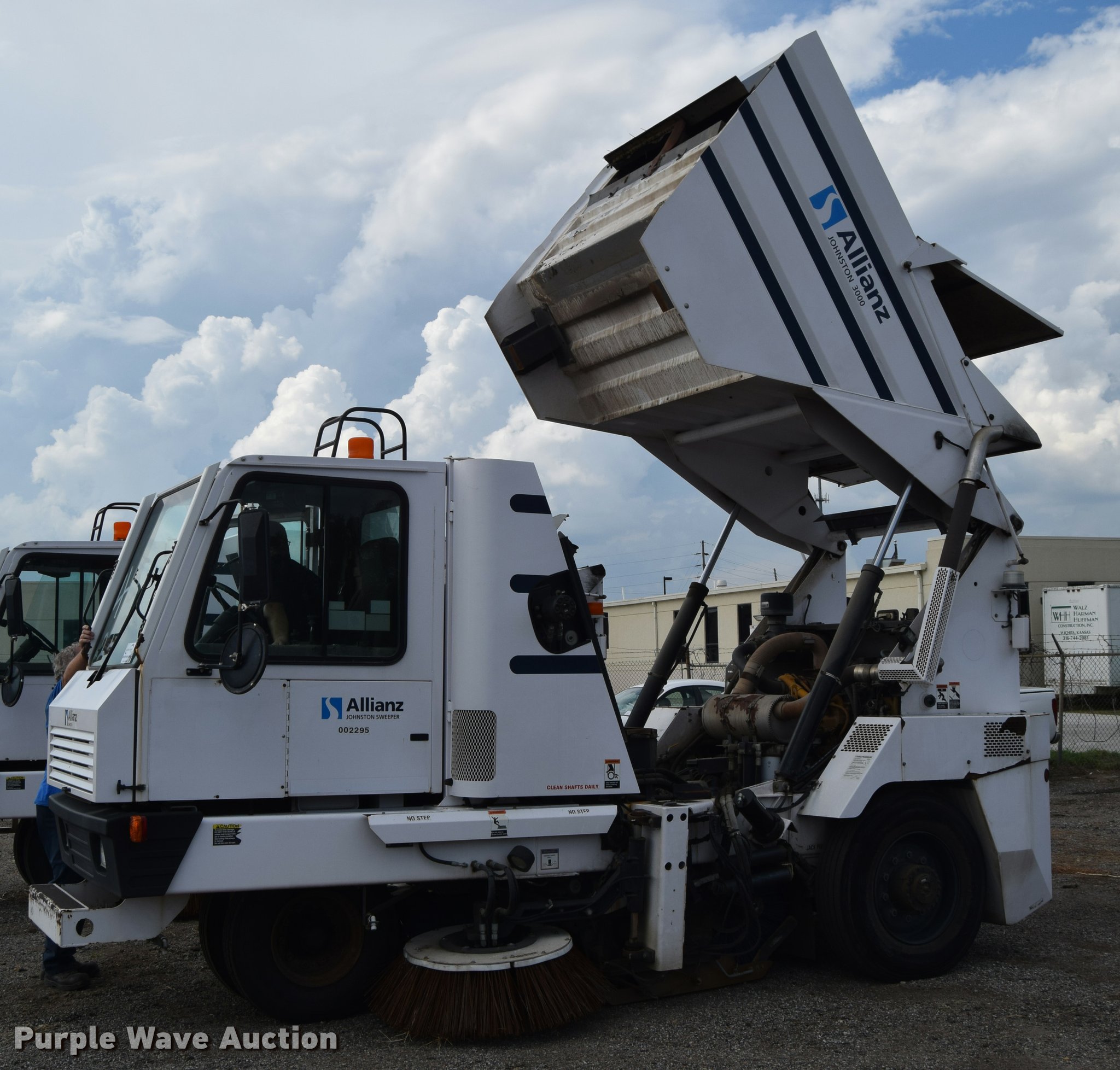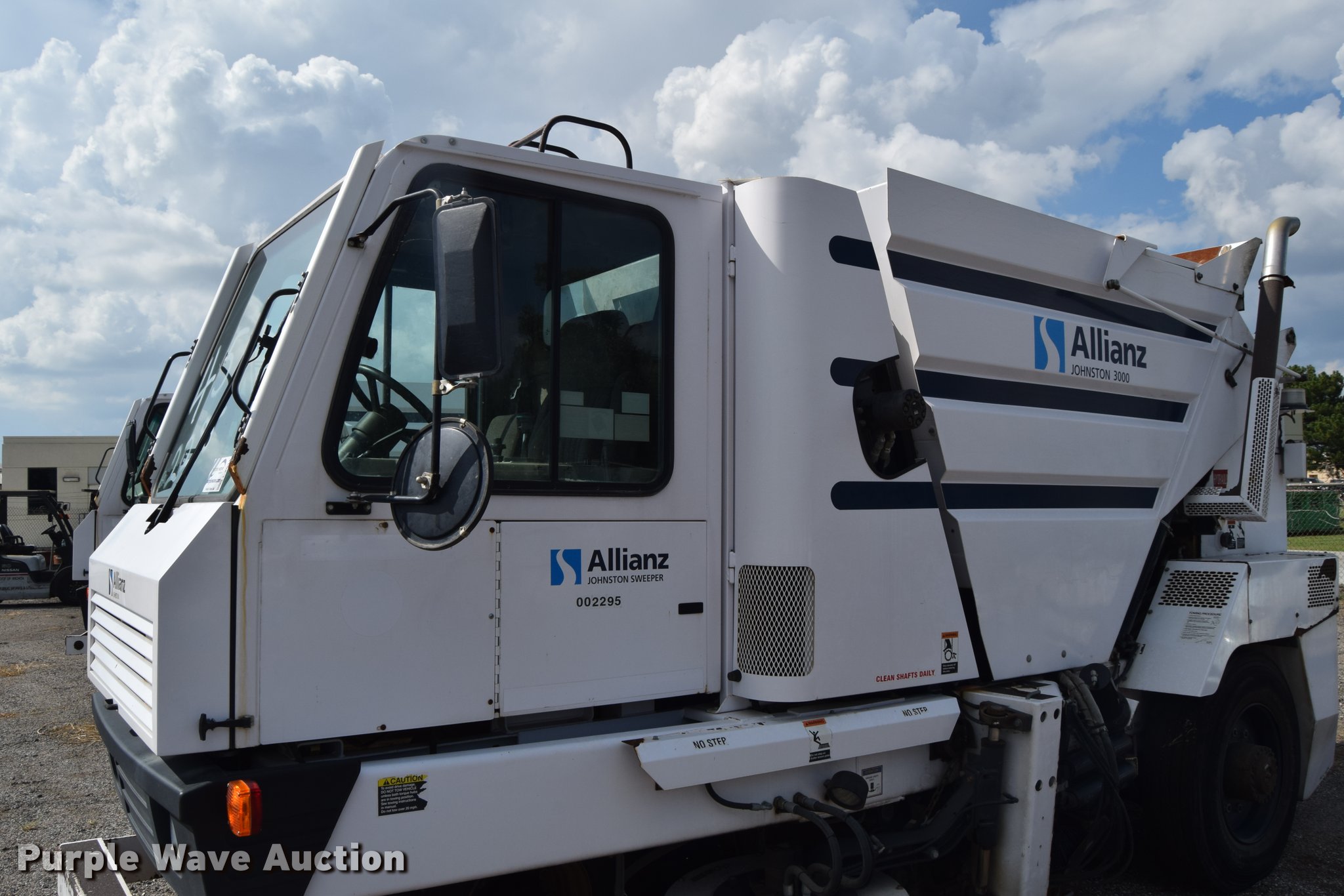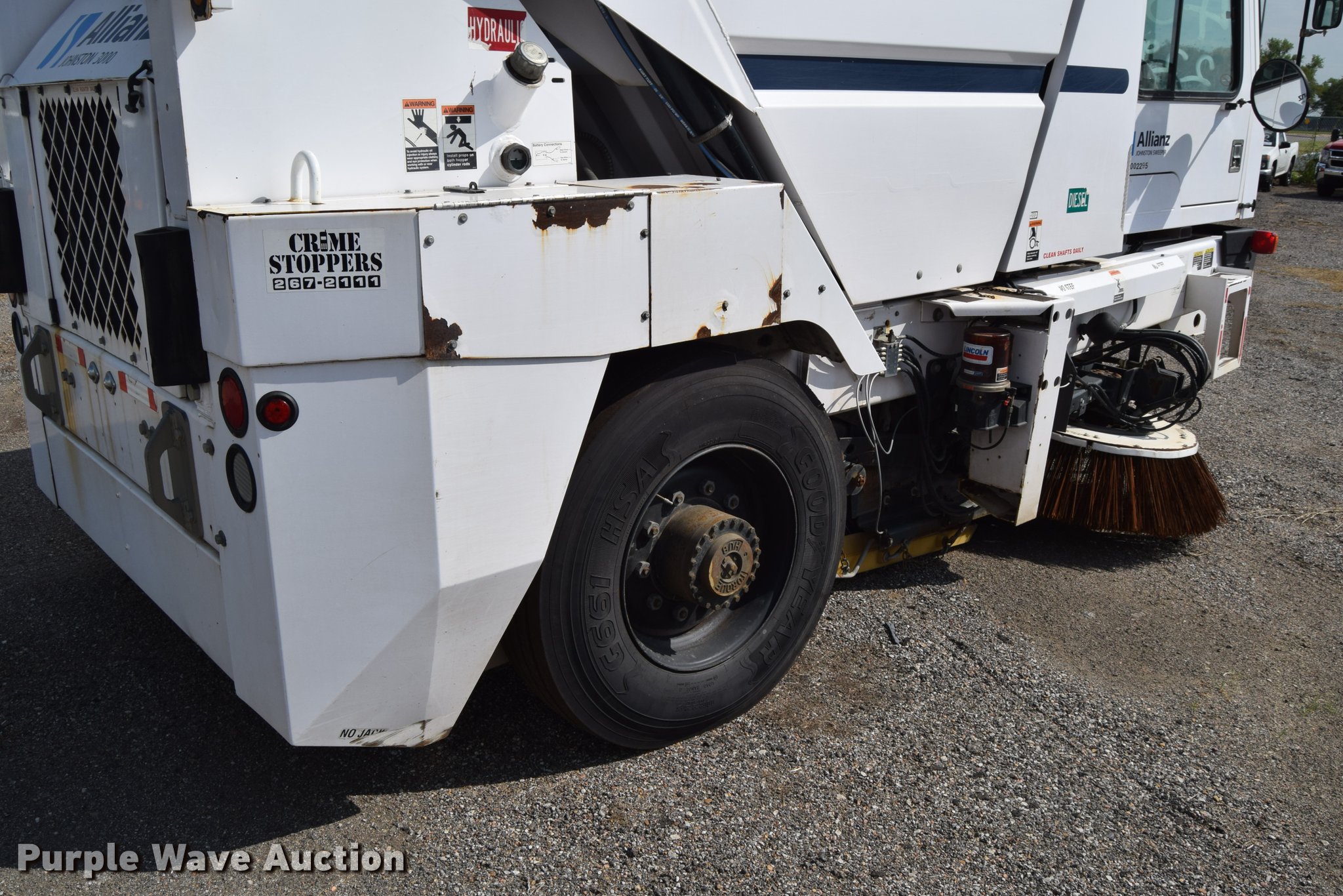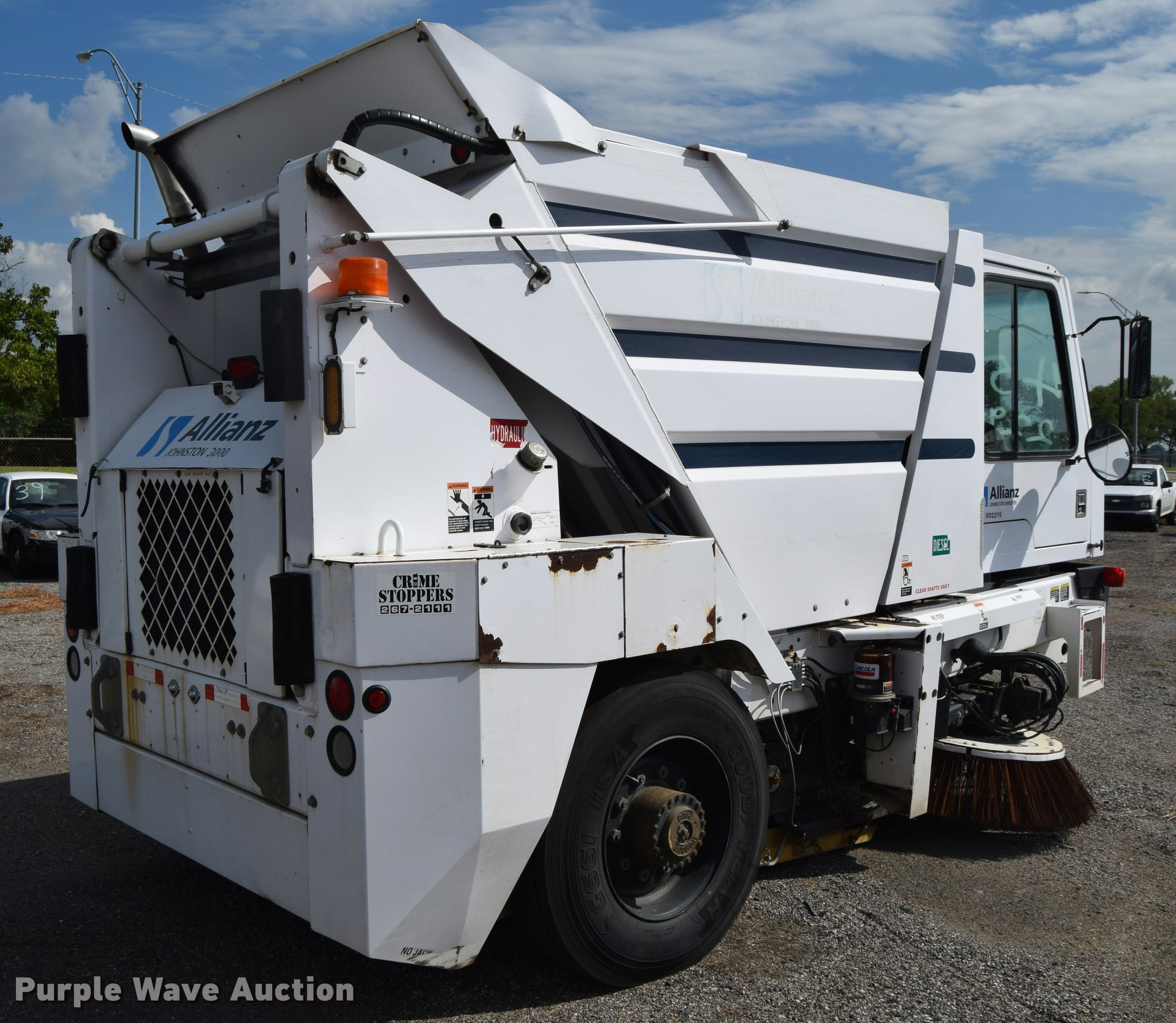 Purple Wave is selling a used Sweeper in Kansas. This item is a 2010 Allianz Johnston 3000 street sweeper with the following: 23,946 miles on odometer, 4,389 engine hours on meter, 2,162 left gutter broom hours, 2,190 right gutter broom hours, 2,375 pickup broom hours, John Deere 4045T turbo diesel engine, Automatic transmission, Enclosed cab, AC and heat, Tilt, Suspension seat, Instructor's seat, Video monitoring system, Traffic assist arrow, Beacon light, 47" left and right side gutter brooms, Main broom/sweeper elevator, 58" dirt conveying system, Dumping debris hopper, 5.6 cu. yd. capacity, Water system, Hydraulic drive sweeping system, 125" sweeping path, 23 mph road speed, 200 gallon water tank, 11R22.5 tires