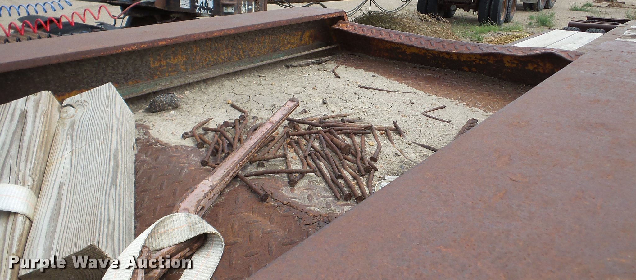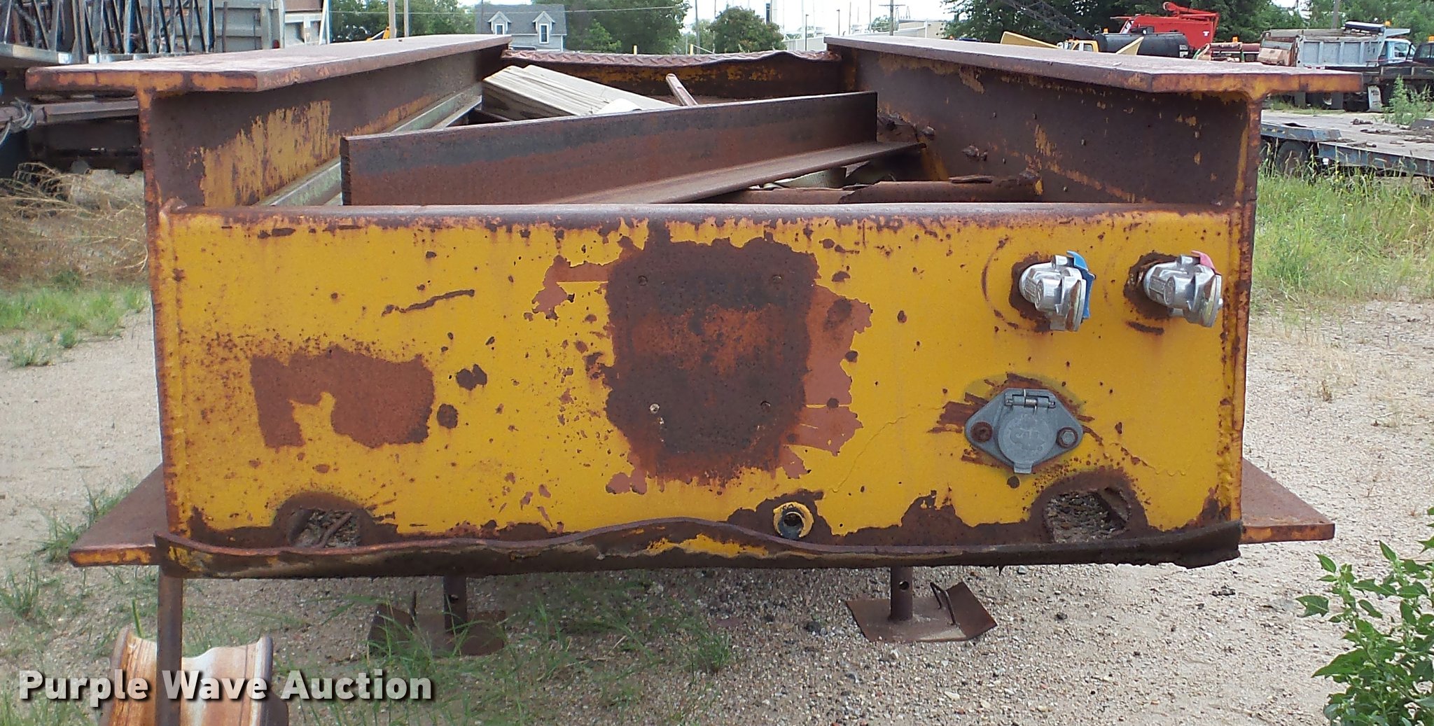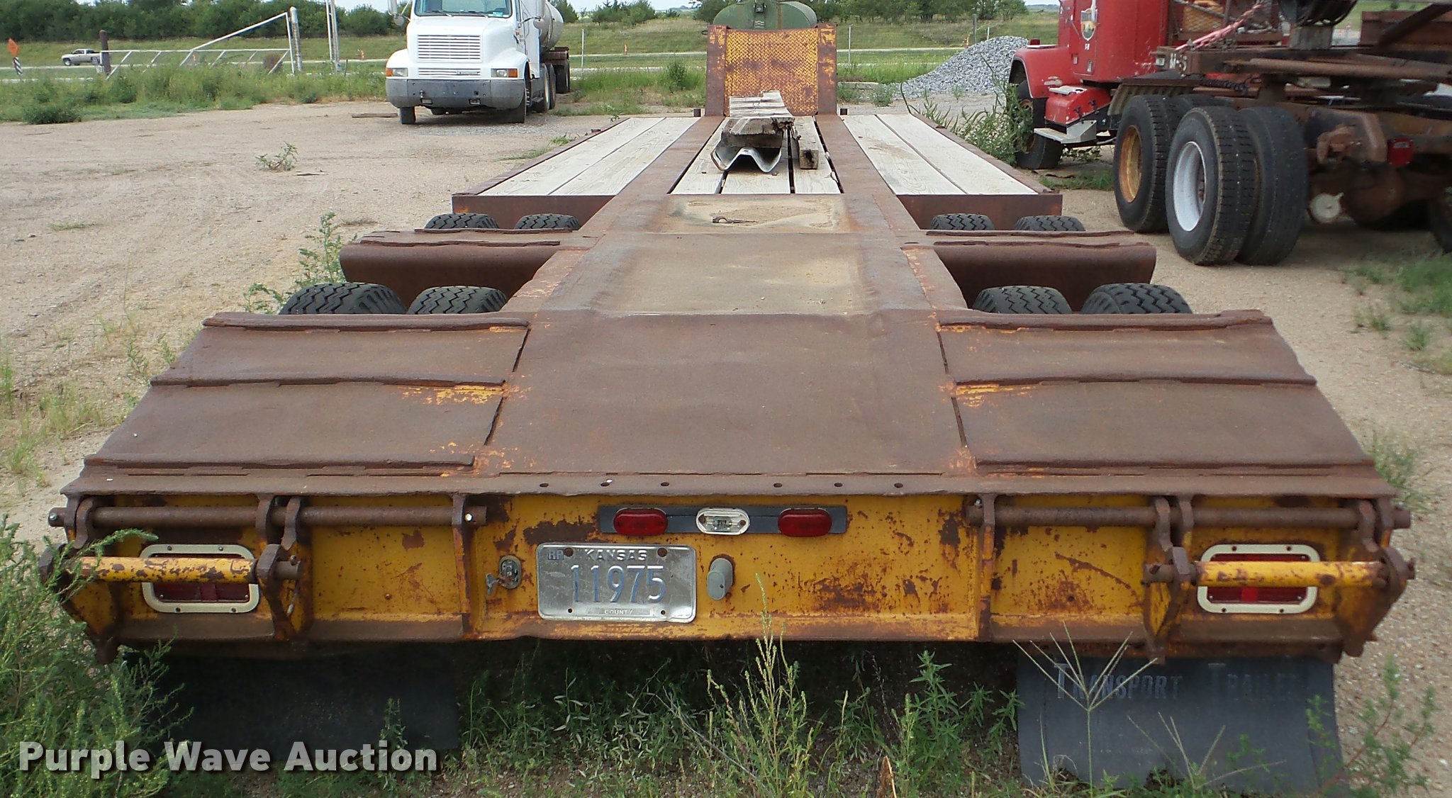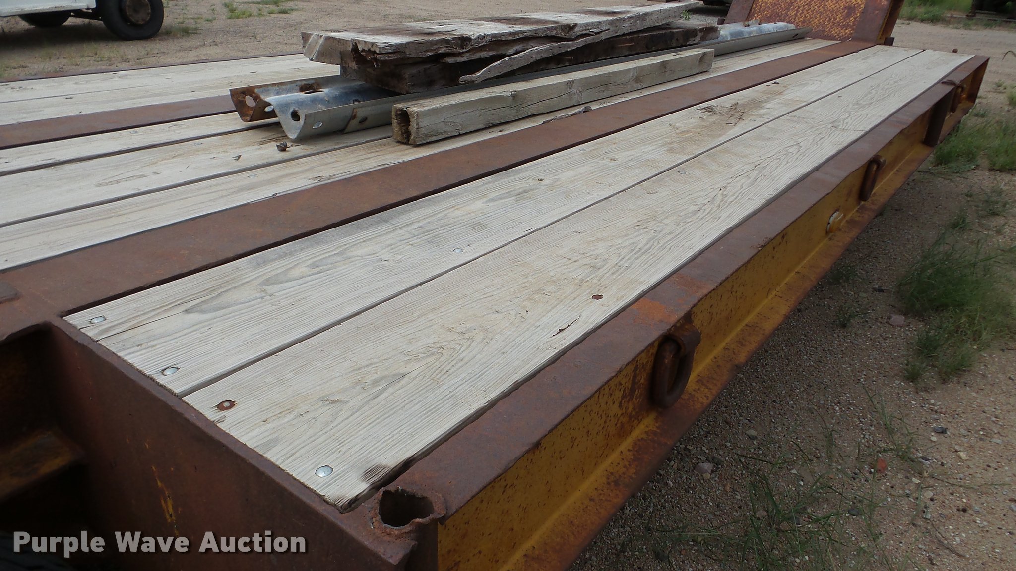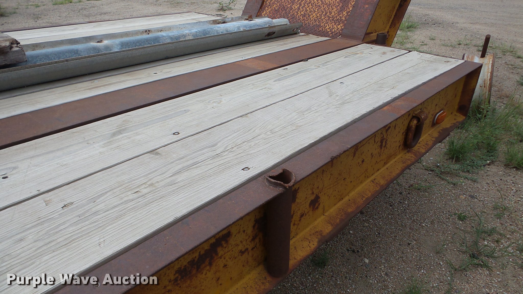Purple Wave is selling a used Equip. Trailer in Kansas. This item is a 1983 Transport Trailers equipment trailer with the following: Approximately 38' overall length, 26'L x 8'W, 17'L main deck, 53"L ramps, Wood deck, D-ring tie downs, Fifth wheel plate, Air brakes, Tandem axle, Steel wheels, 10.00-15 tires, GVWR 81,500 lbs