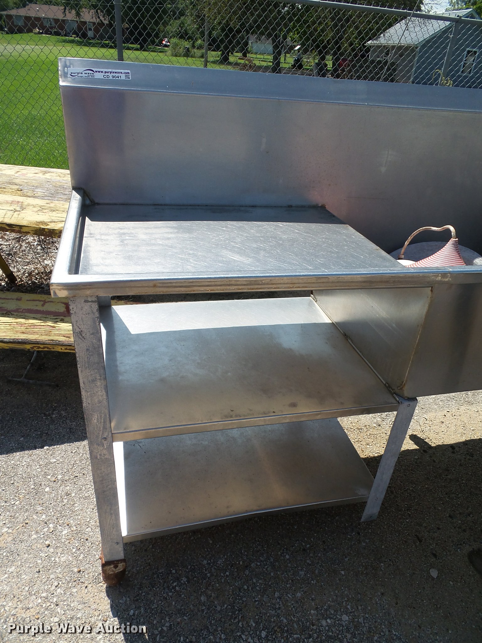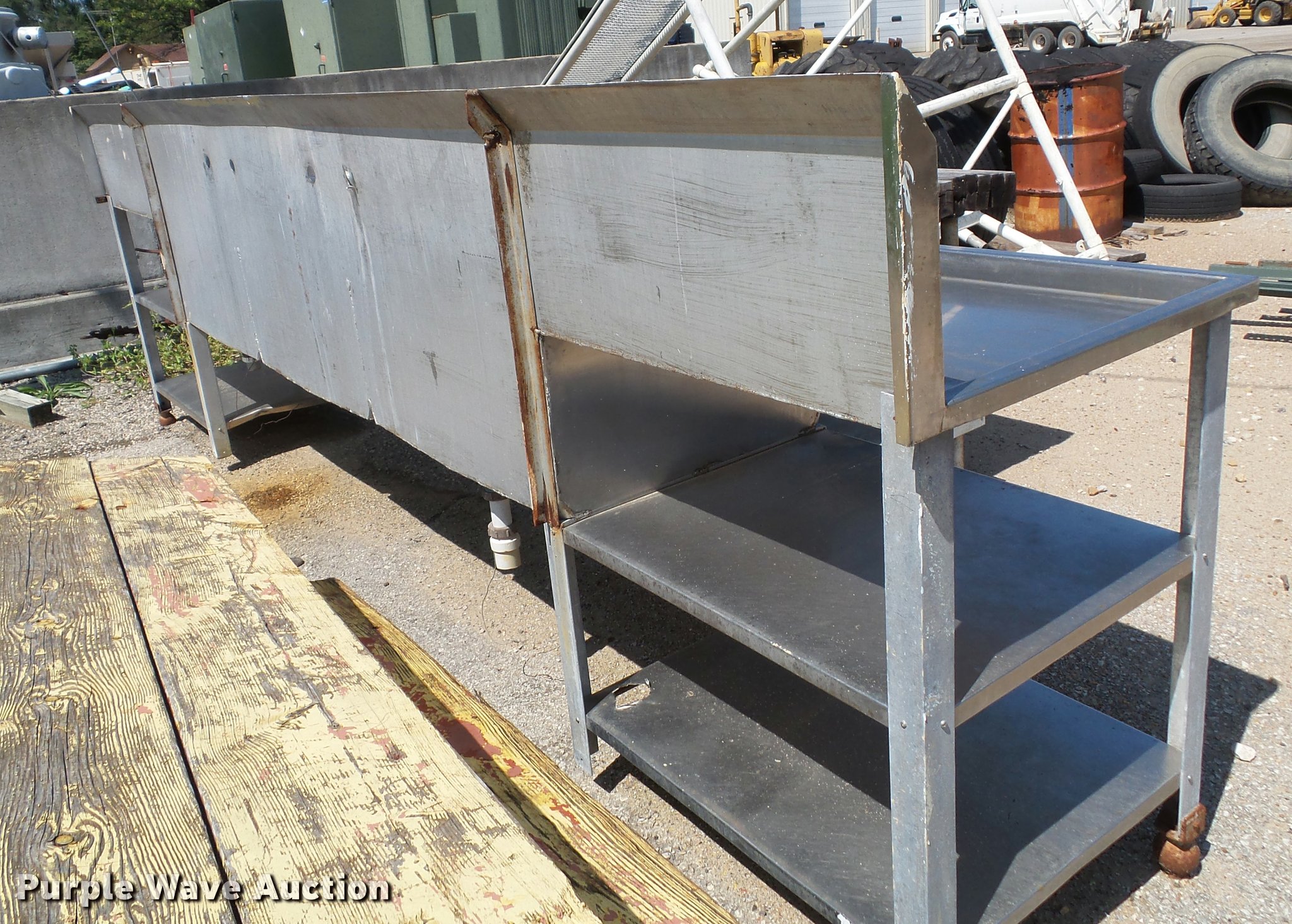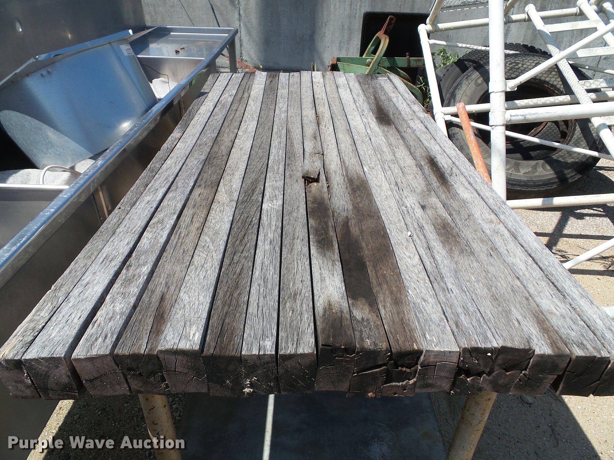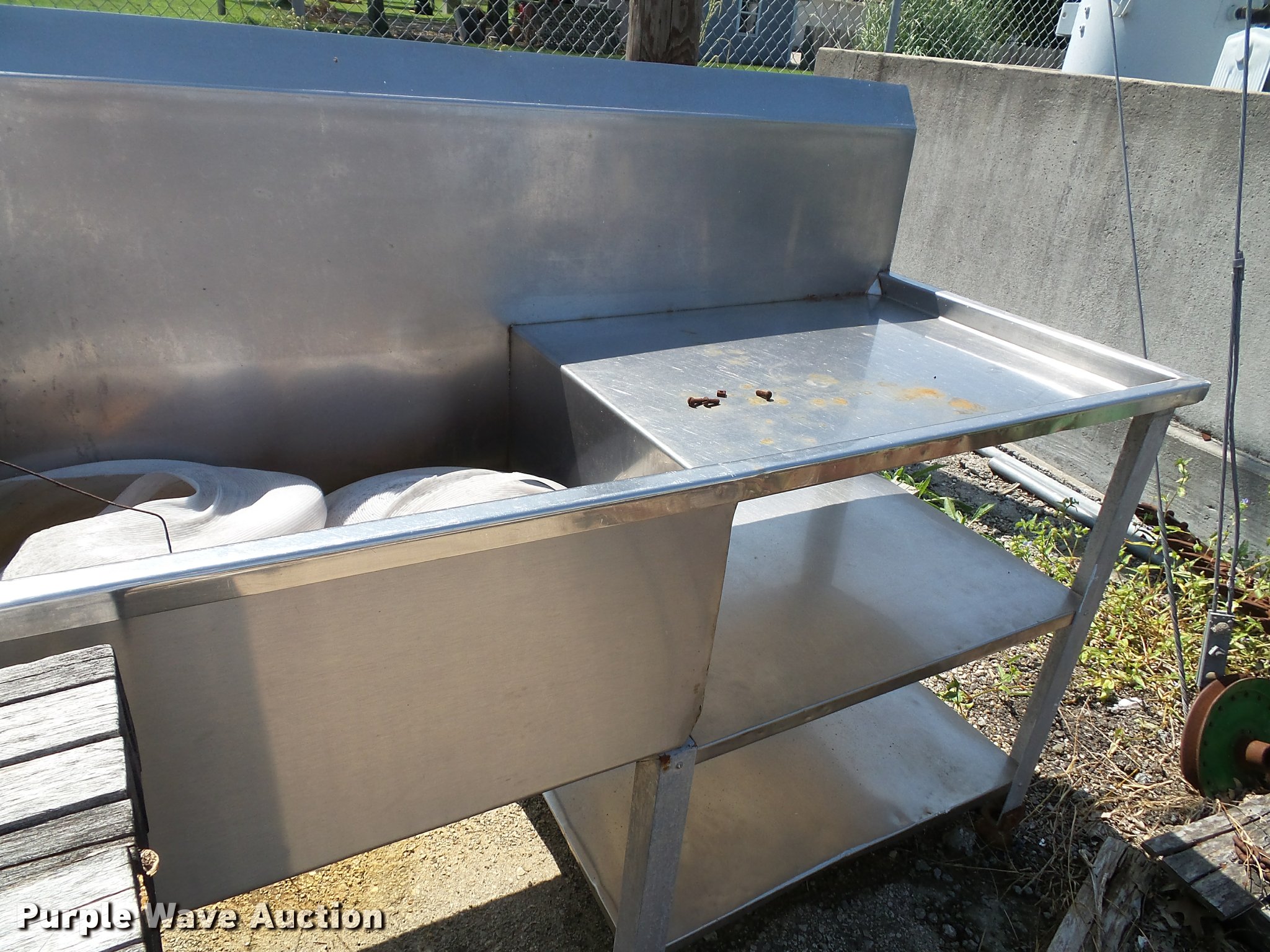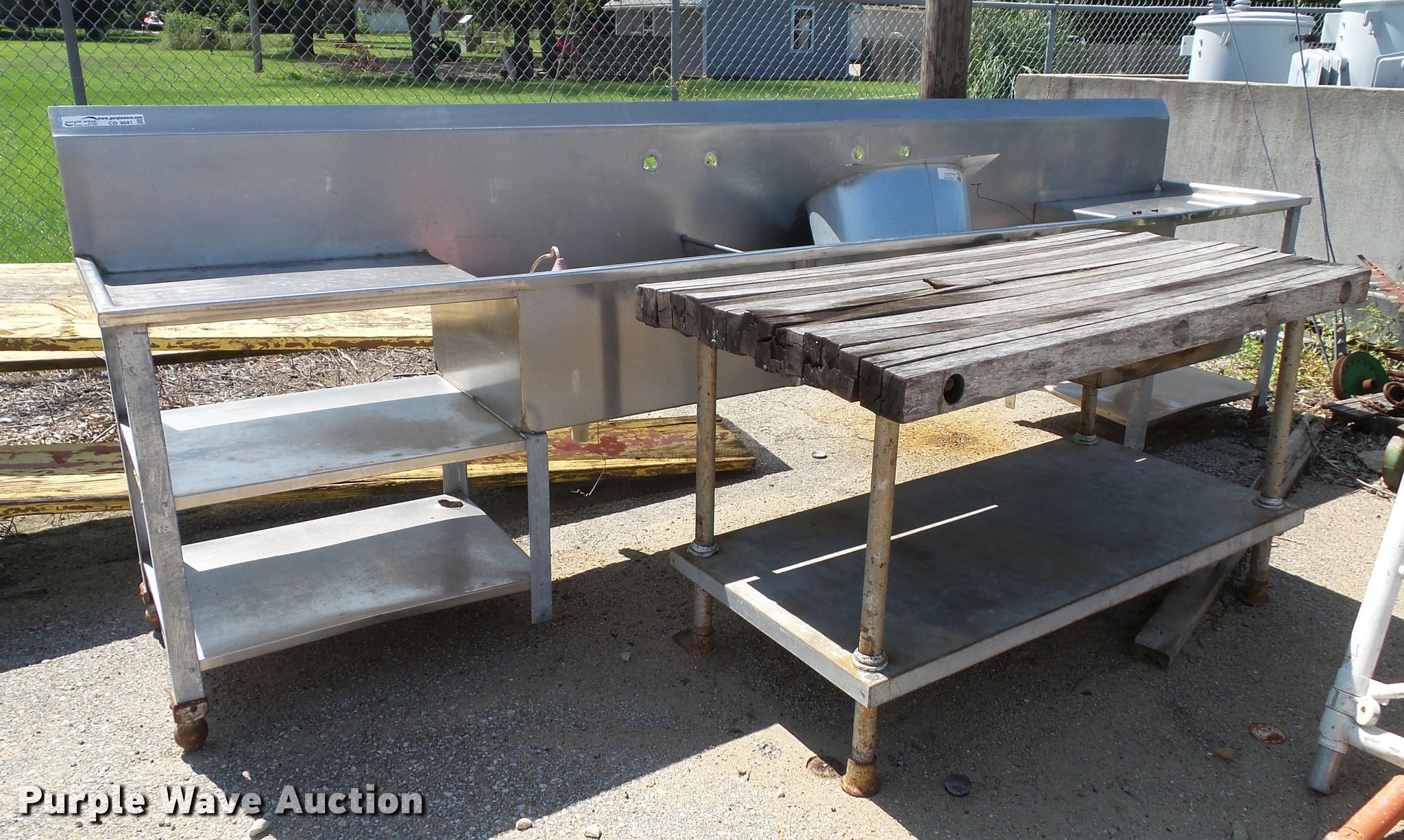 Purple Wave is selling a used Restaurant Equip. in Kansas. This item is a Restaurant equipment with the following: Three piece stainless steel sink, 150" x 26" x 48", No faucets, Wood top butcher block table, 60" x 33" x 35", Top needs replaced