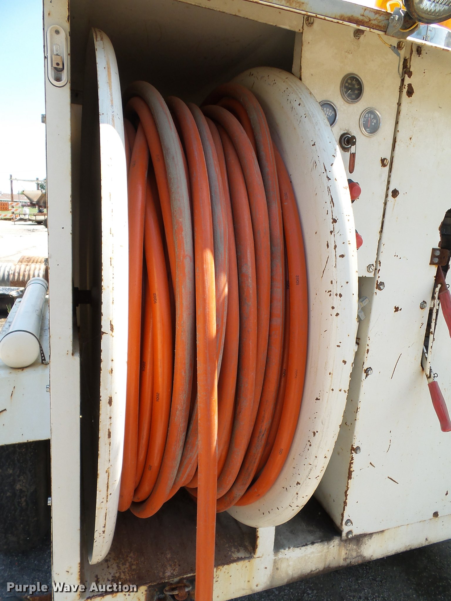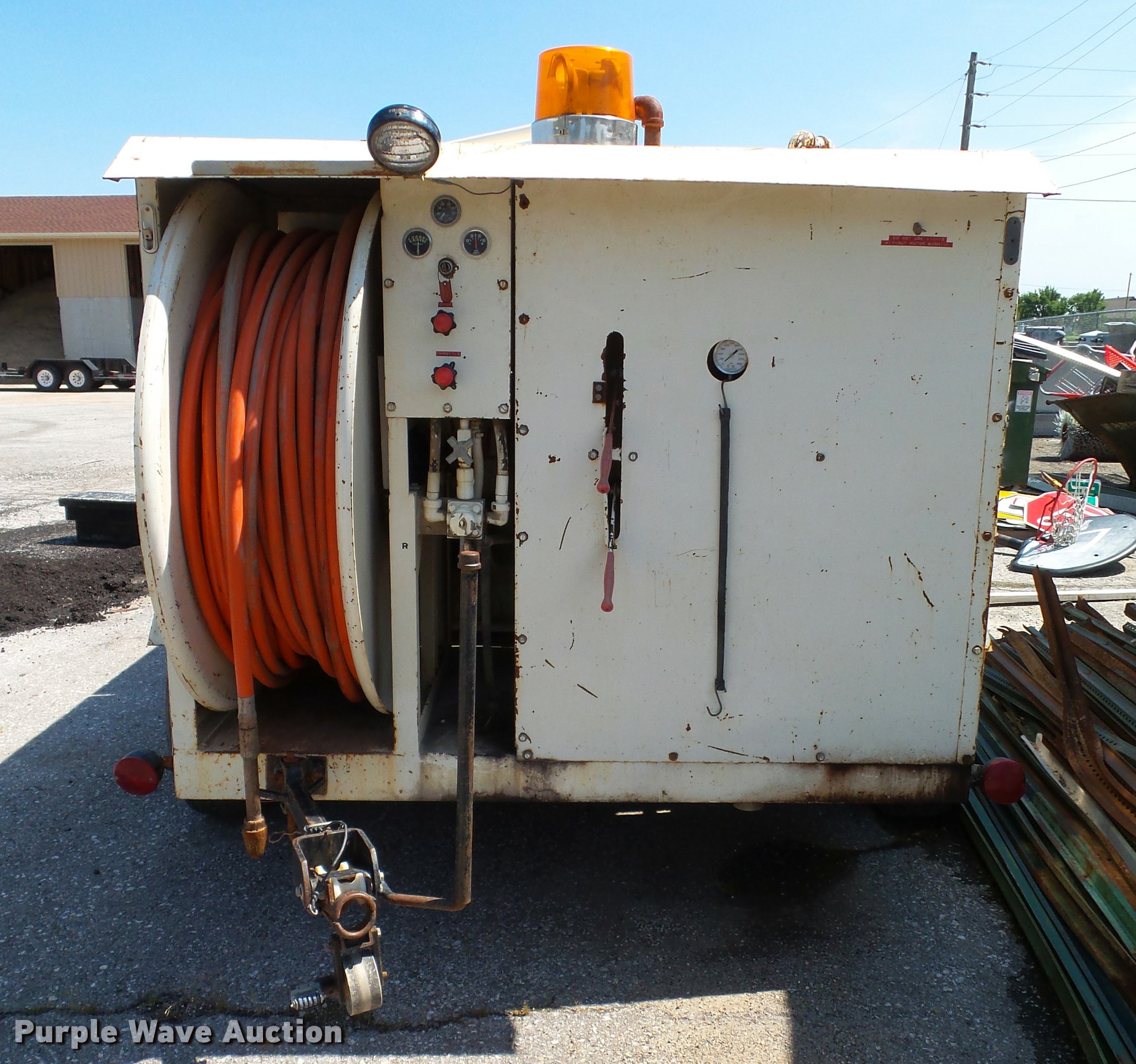 Purple Wave is selling a used Tools in Kansas. This item is a Water jet with the following: Model 747, Ford four cylinder engine, Rockford PTO, Work light, Strobe light, Approx. 500' hose with reel, Assorted nozzles, 300 to 400 lbs pump pressure, 2 5/16" ball hitch, Safety chains, Tandem axle, 15" tires