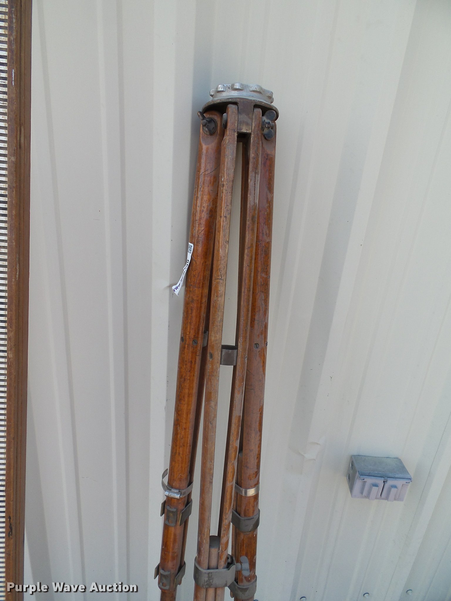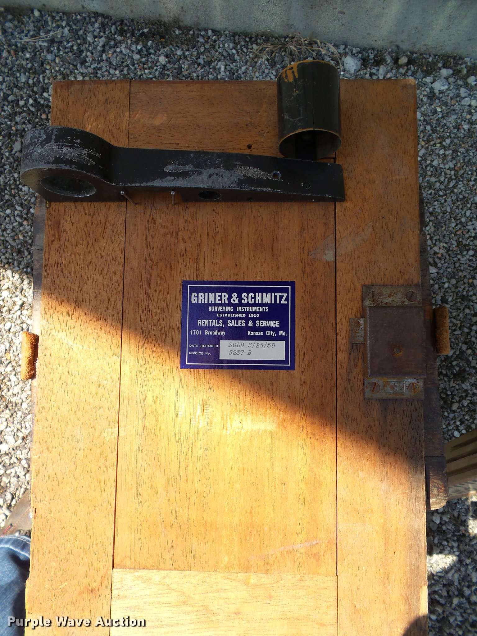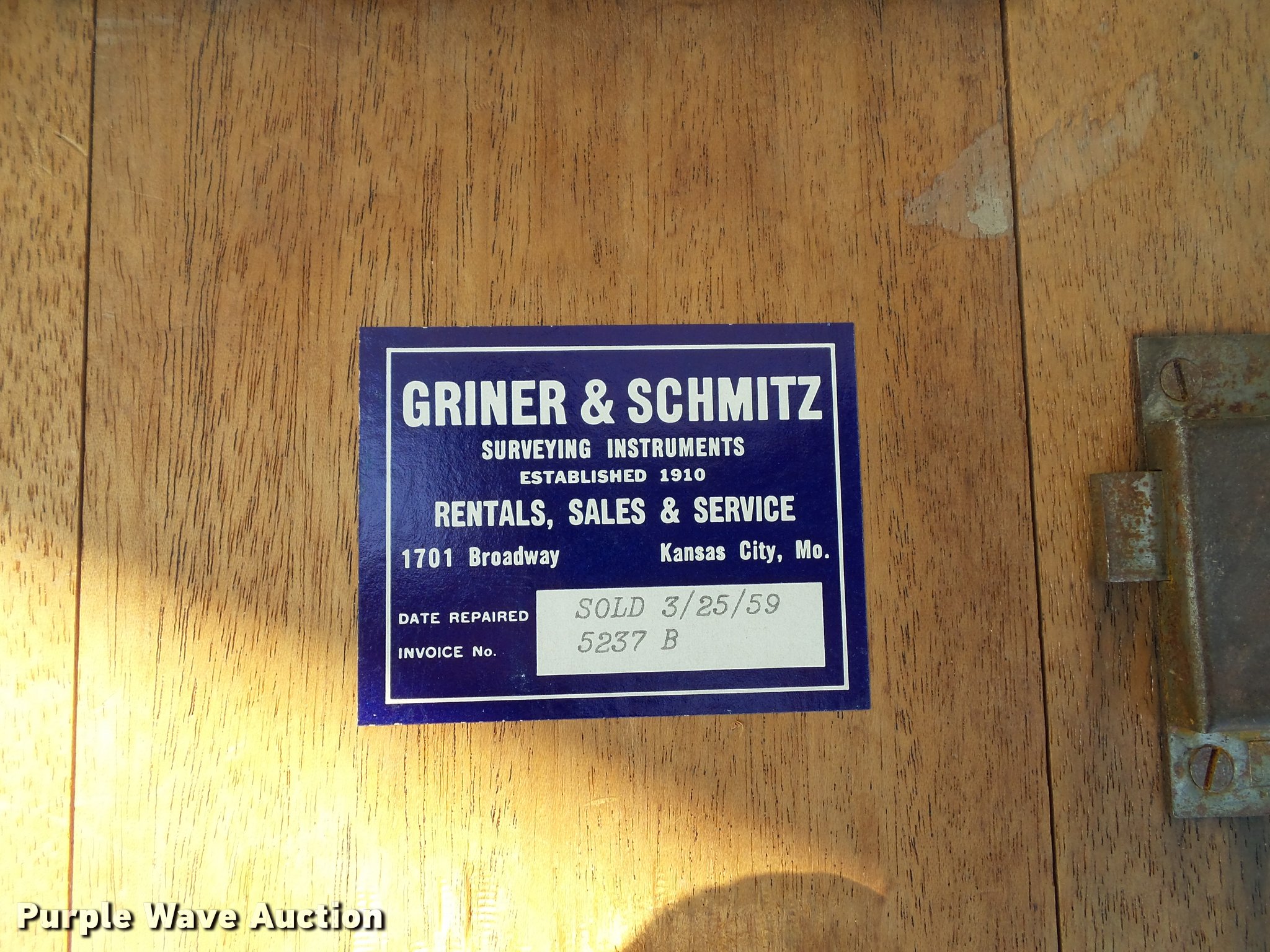 Purple Wave is selling a used Surveying Equip. in Kansas. This item is a Surveying equipment with the following: Wood tripod, (2) measuring sticks, 1959 Griner & Schmitz/Lietz transit level, Wood box