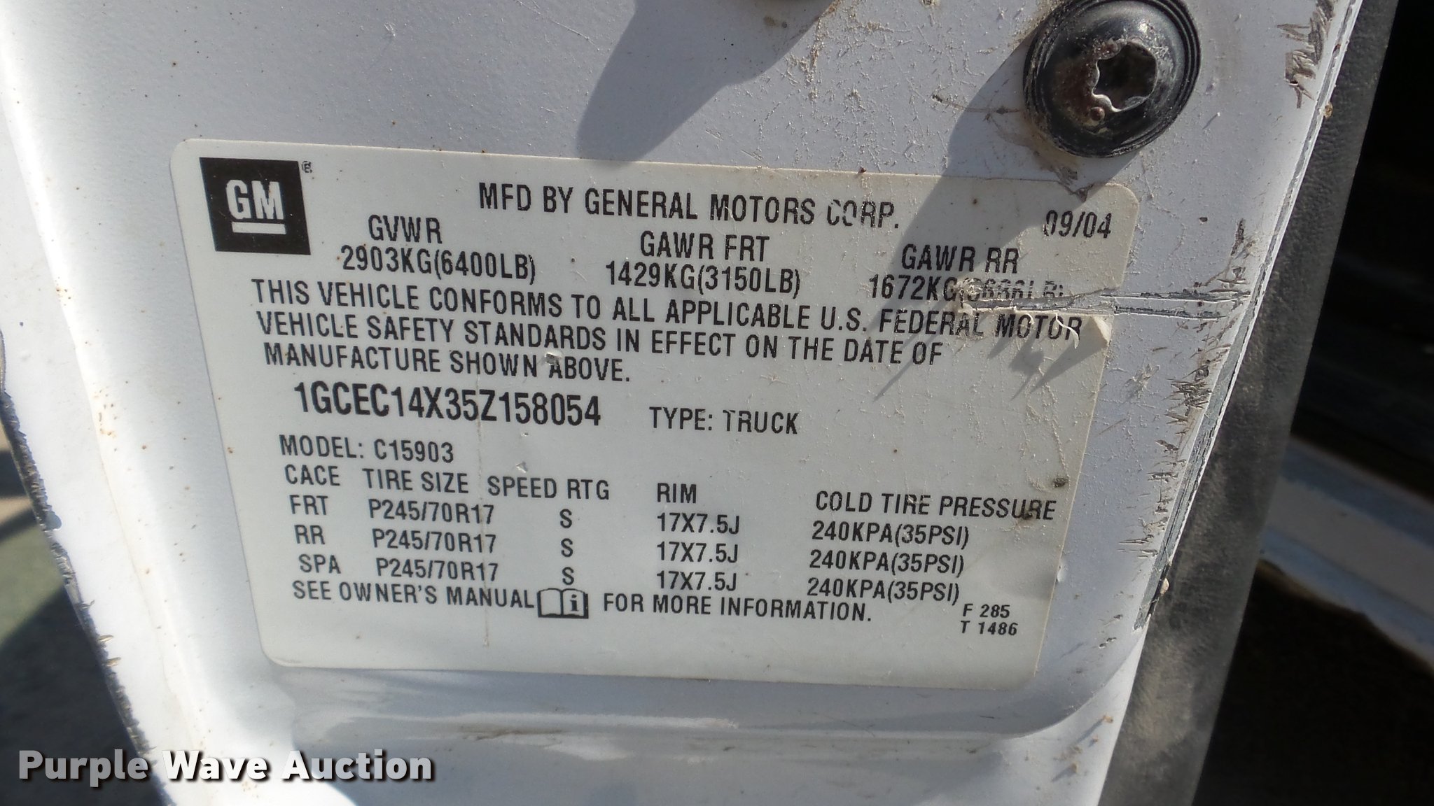 2005 Chevrolet Silverado 1500 pickup truck. 166,774 miles on odometer, 4.3L V6 OHV 12V gas engine, Automatic transmission, AC and heat, Tilt, AM/FM, Manual windows and locks, Cloth interior, Long bed, 245/70R17 tires, Rust. Kansas title. 1GCEC14X35Z158054. Miami County Road and Bridge. 23765 W. 327th. Paola, KS 66071