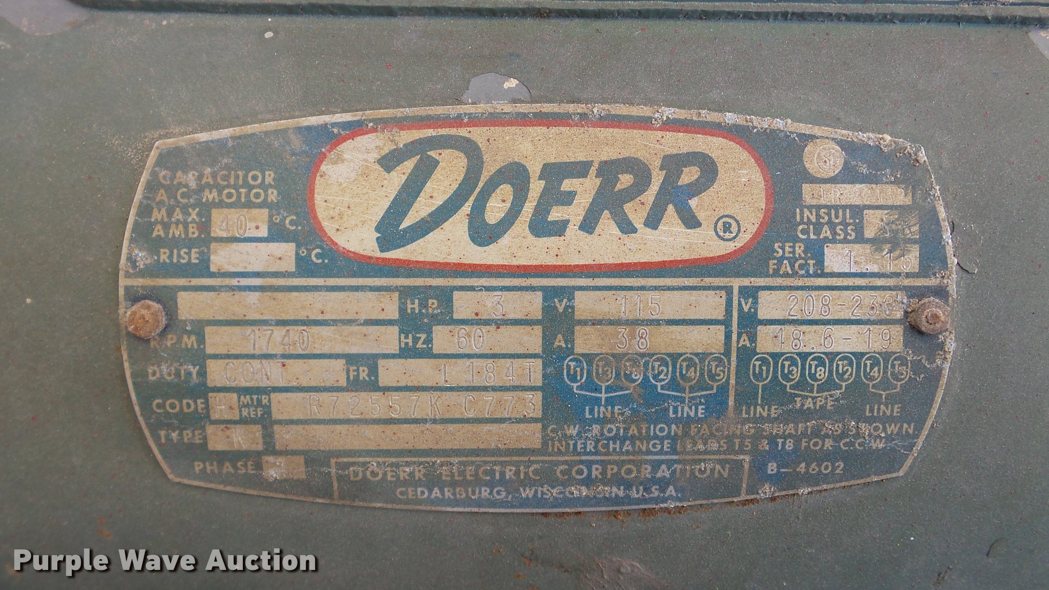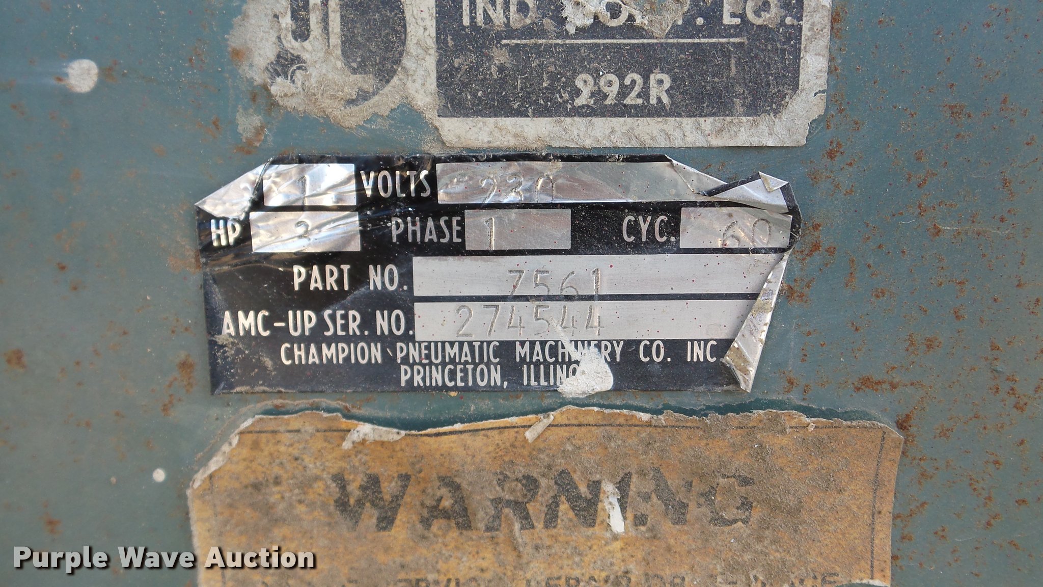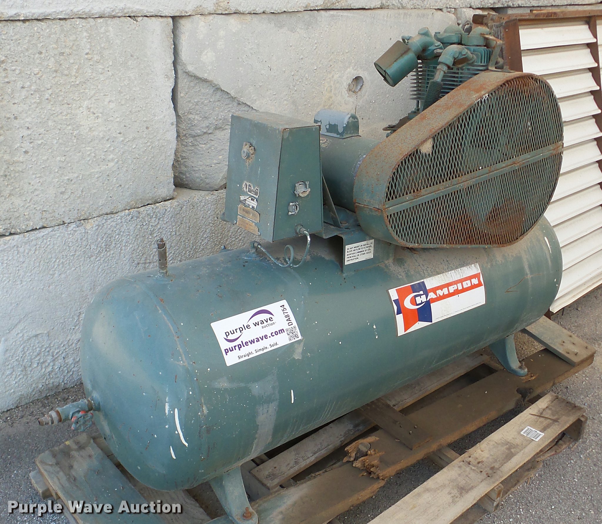 Purple Wave is selling a used Air Compressor in Kansas. This item is a Champion P1164 air compressor with the following: Electric motor, 3 HP, 230V, 5'L x 21"W, 60 gallon tank, Slow recovery