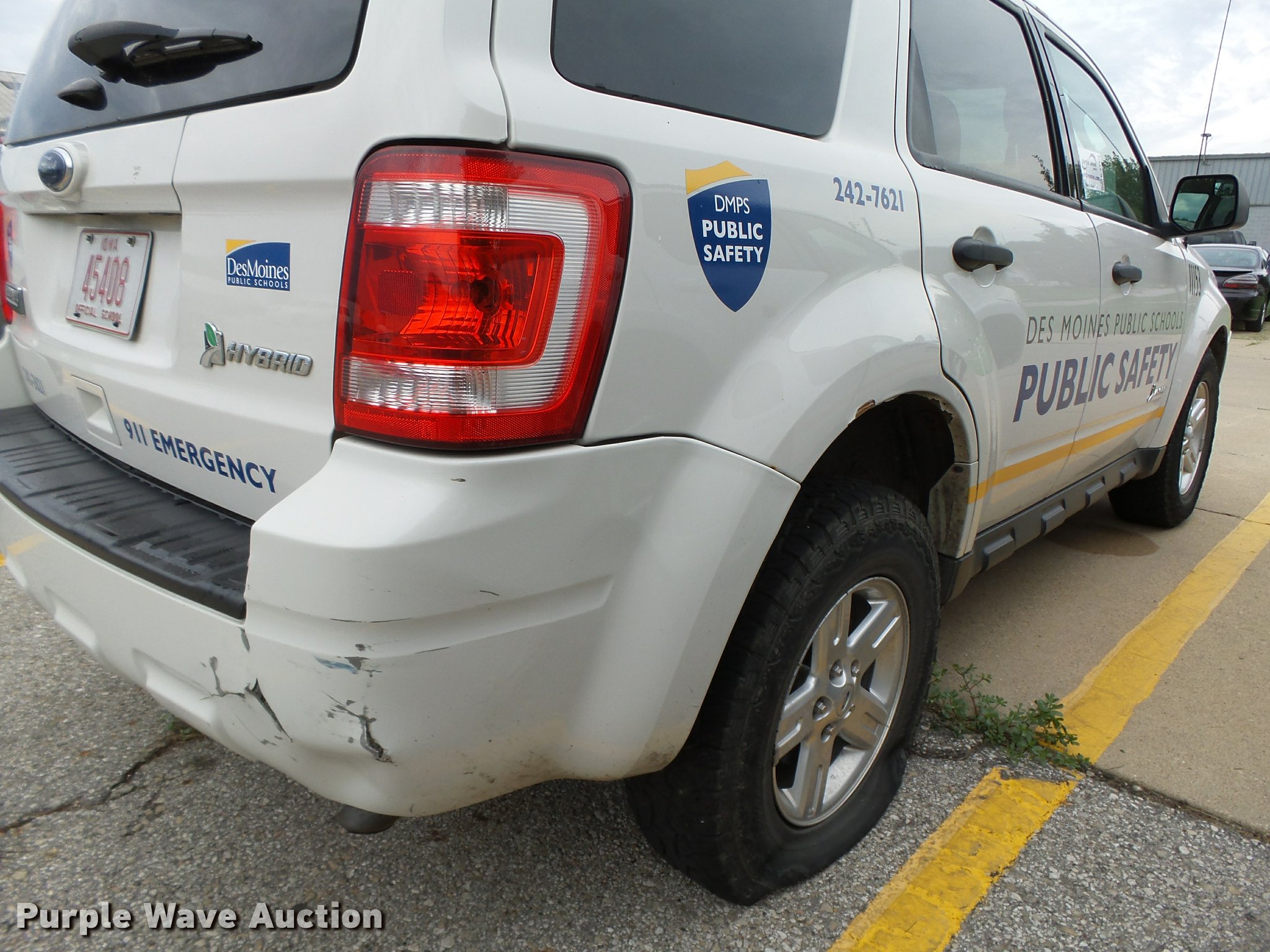 2012 Ford Escape Hybrid SUV. 203,196 miles on odometer, 2.5L L4 DOHC 16V hybrid gas engine, Automatic transmission, Four wheel drive, AC and heat, Tilt, Cruise, AM/FM/CD, Power windows, locks, mirrors, and seat, Cloth interior, Fog lights, P235/70R16 tires, Body damage, Right rear tire will be replaced prior to auction, Decals will be removed prior to auction, Unit# 11153. Iowa title. Seller is a government entity who will be assigning and distributing the title. Please contact the seller for distribution questions. 1FMCU5K3XCKA10156. Des Moines Public Schools. 1917 Dean Ave. Des Moines, IA 50316