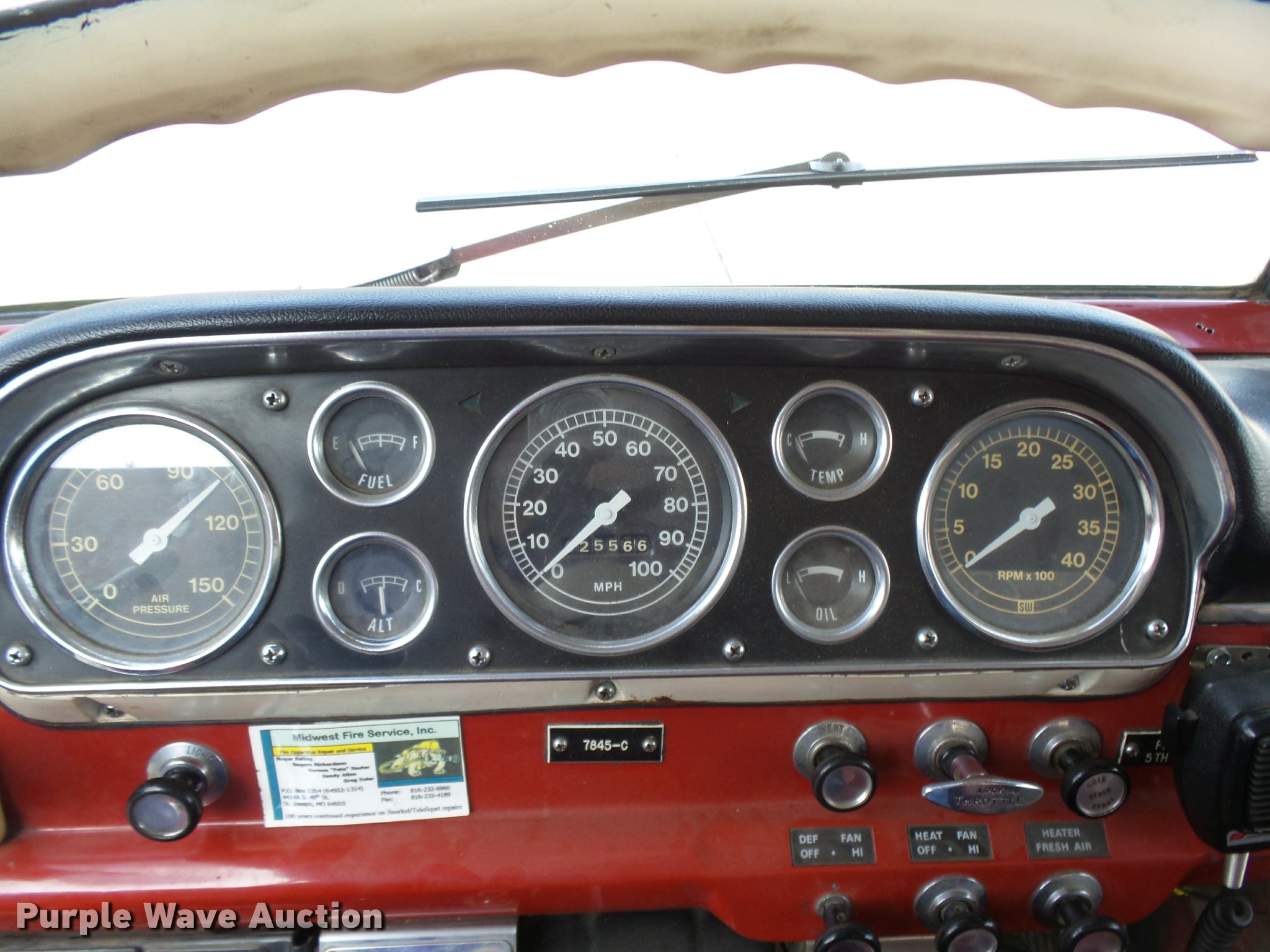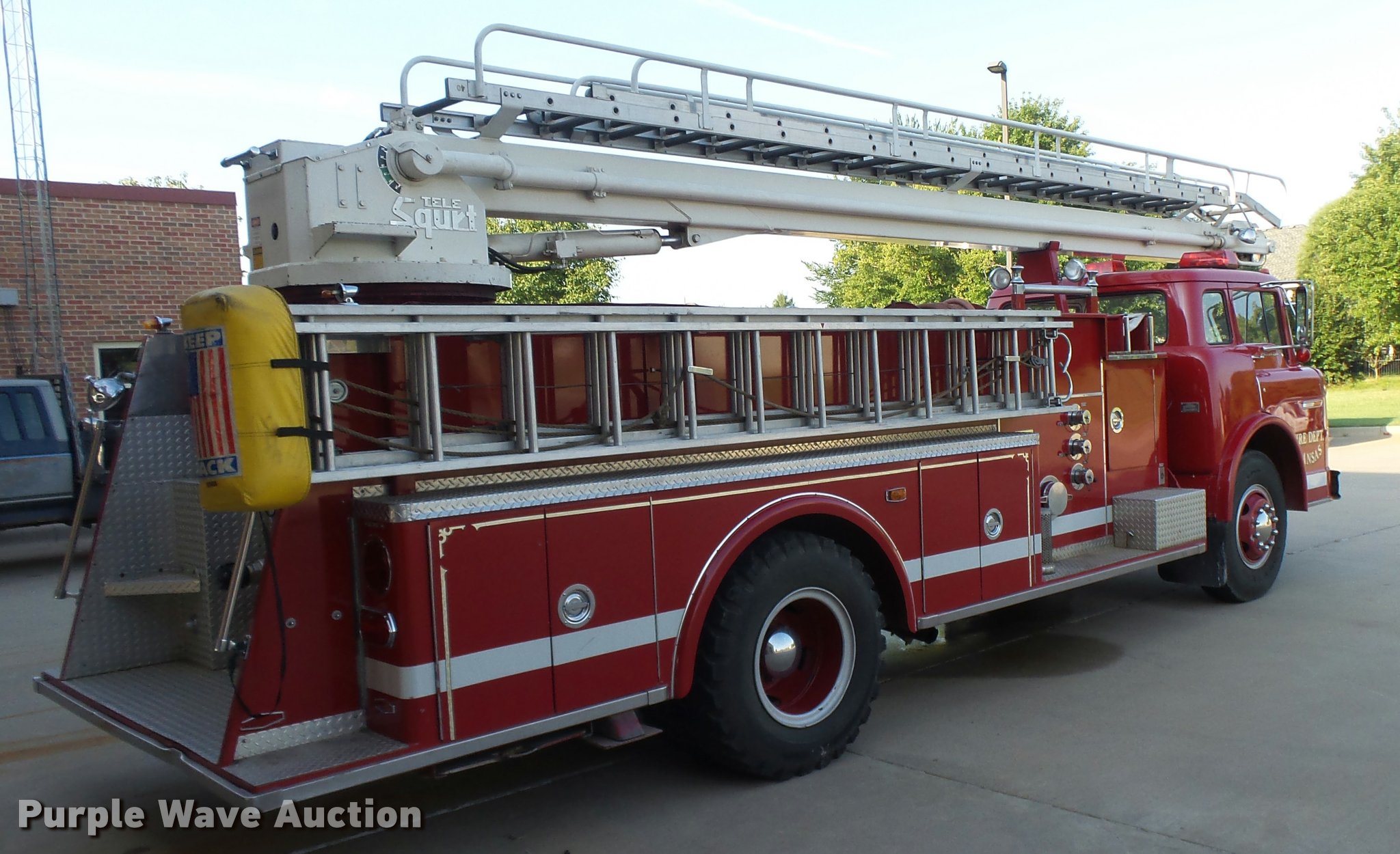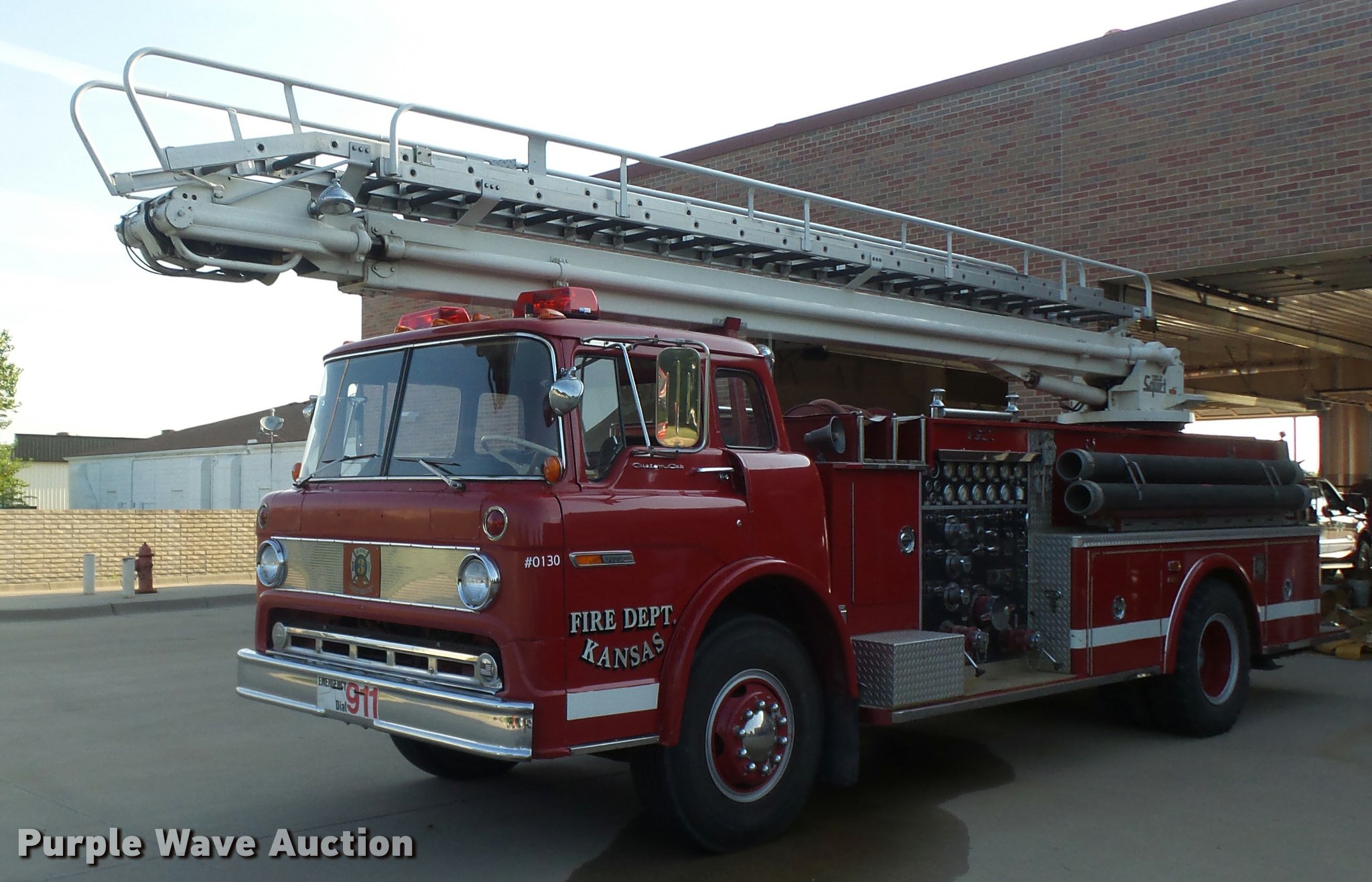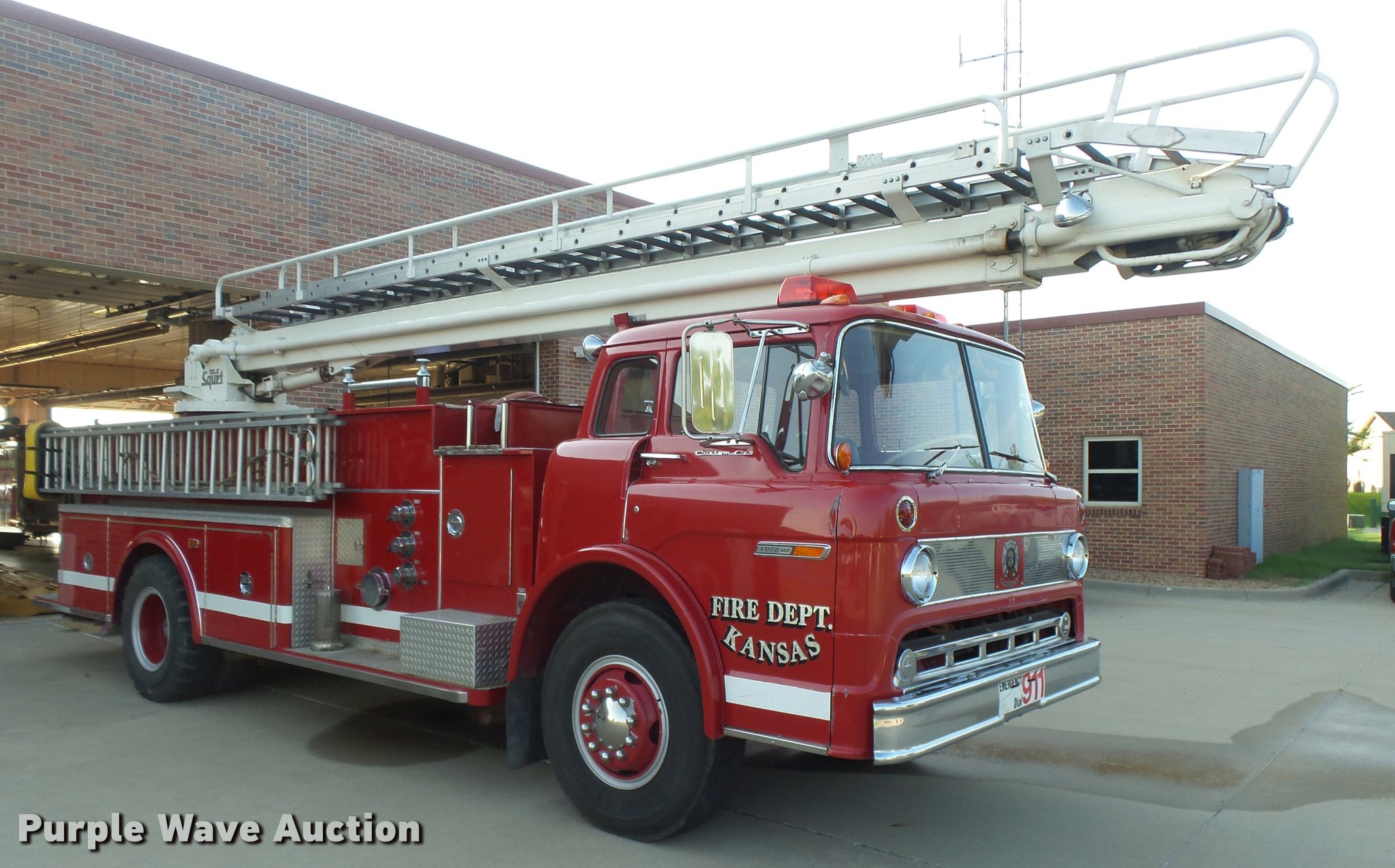 Purple Wave is selling a used Fire Truck or Emergency Vehicle in Kansas. This item is a 1973 Ford Quint B5042 Snorkel ladder fire truck with the following: 25,556 miles on odometer, Caterpillar 225 diesel engine, Five speed manual transmission, Manual windows and locks, 50' tela squirt ladder, 100' booster line on hose reel, (2) 10' x 6" hard suction lines, 35' extension ladder, 14' roof ladder, 10' attic ladder, 1,250 gpm pump, 500 gallon tank, Rear hydraulic outriggers, Air brakes, 11.00R20 tires