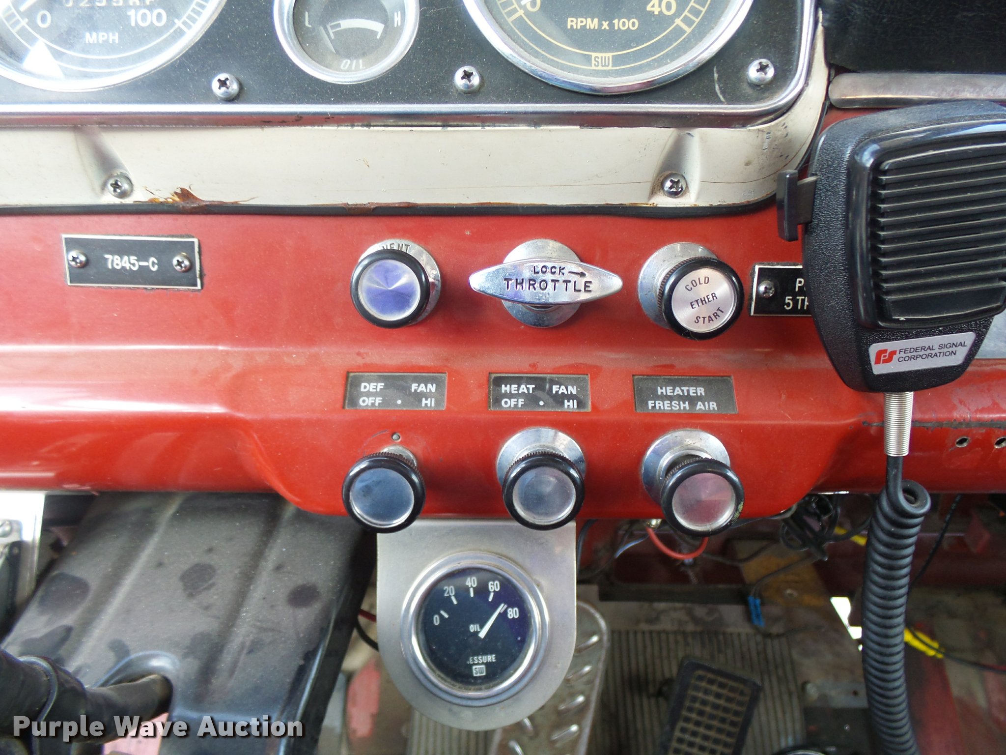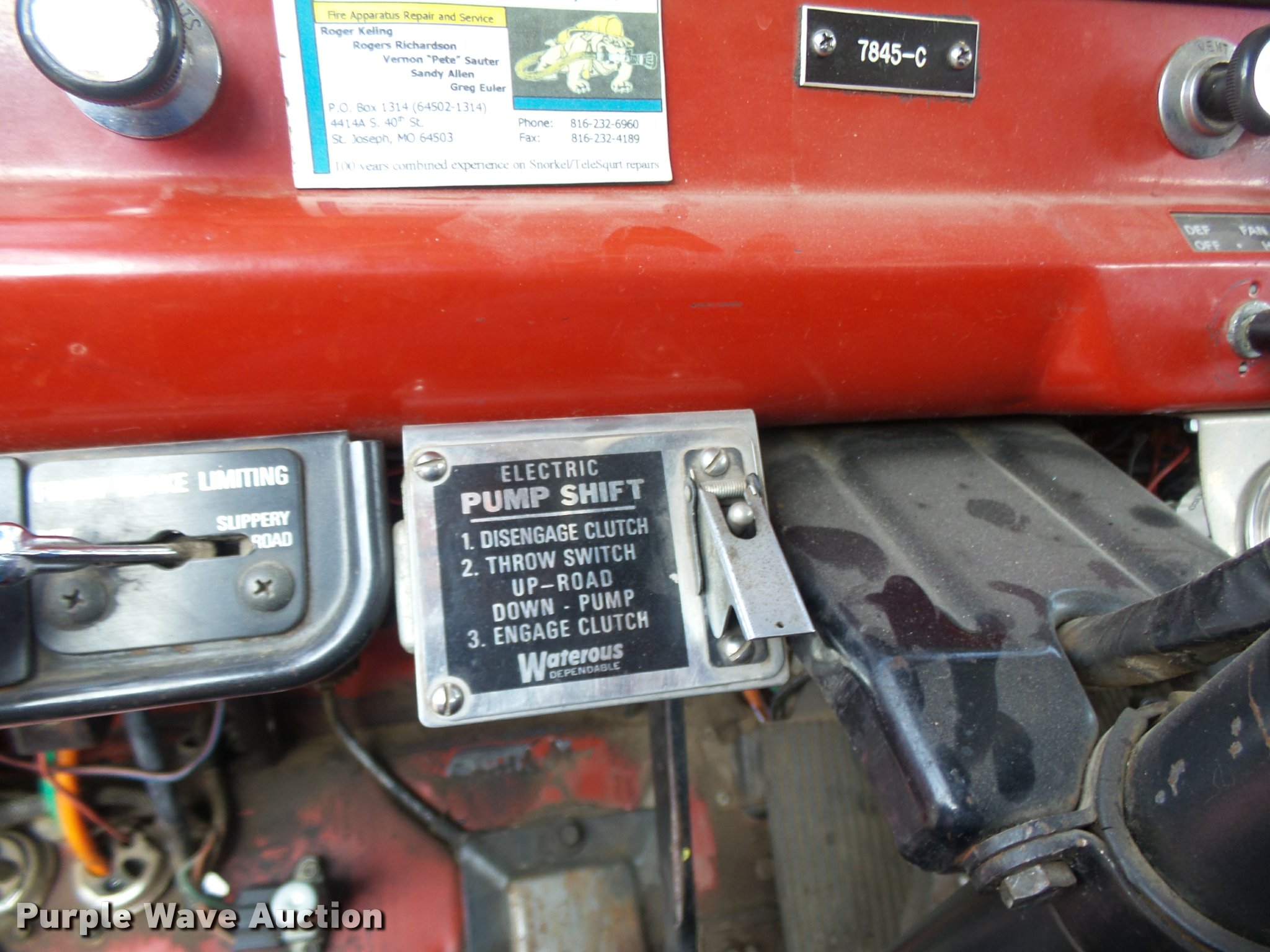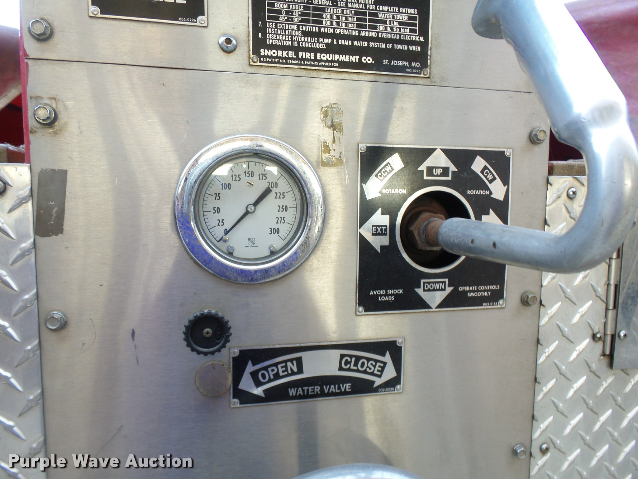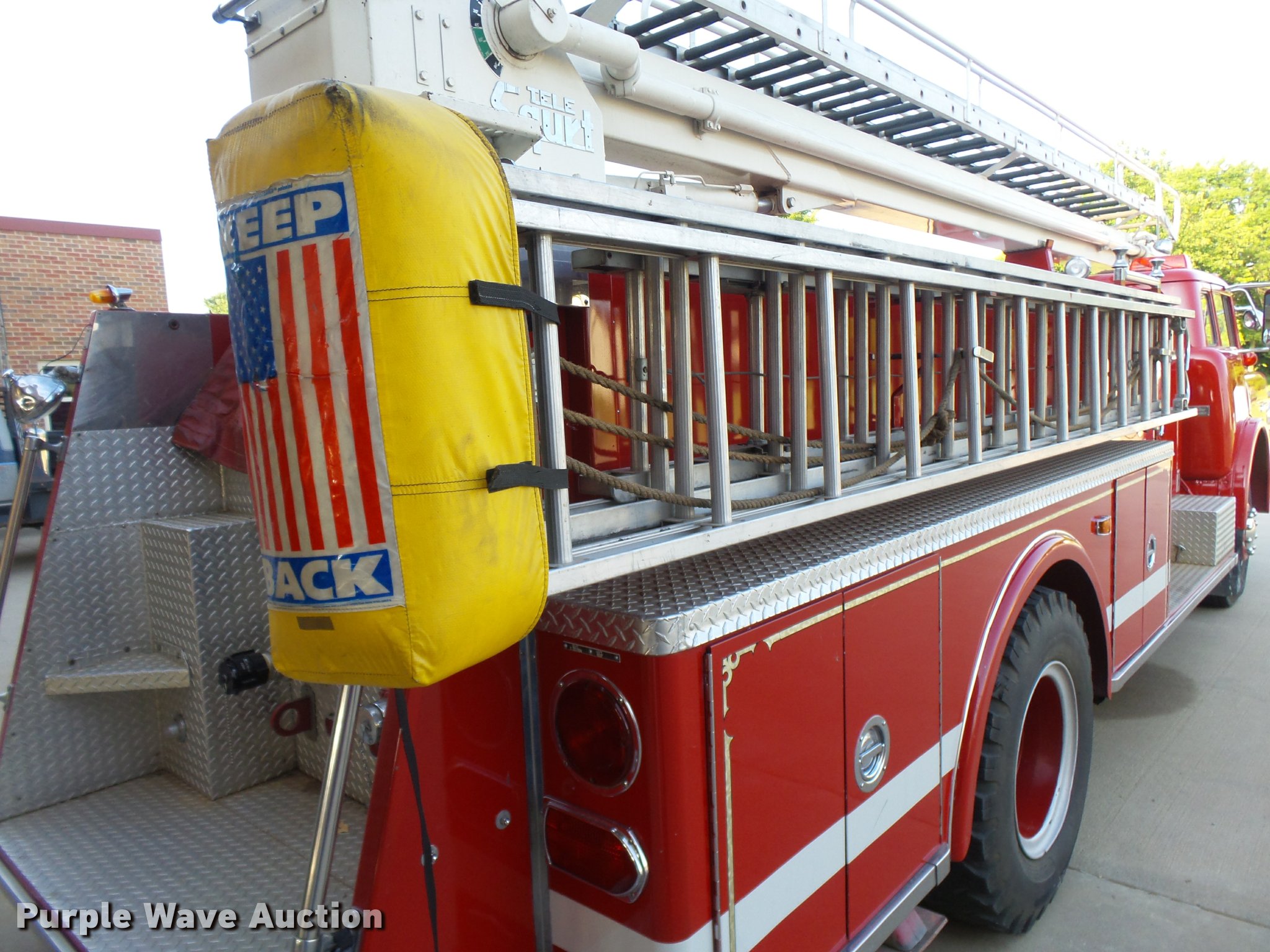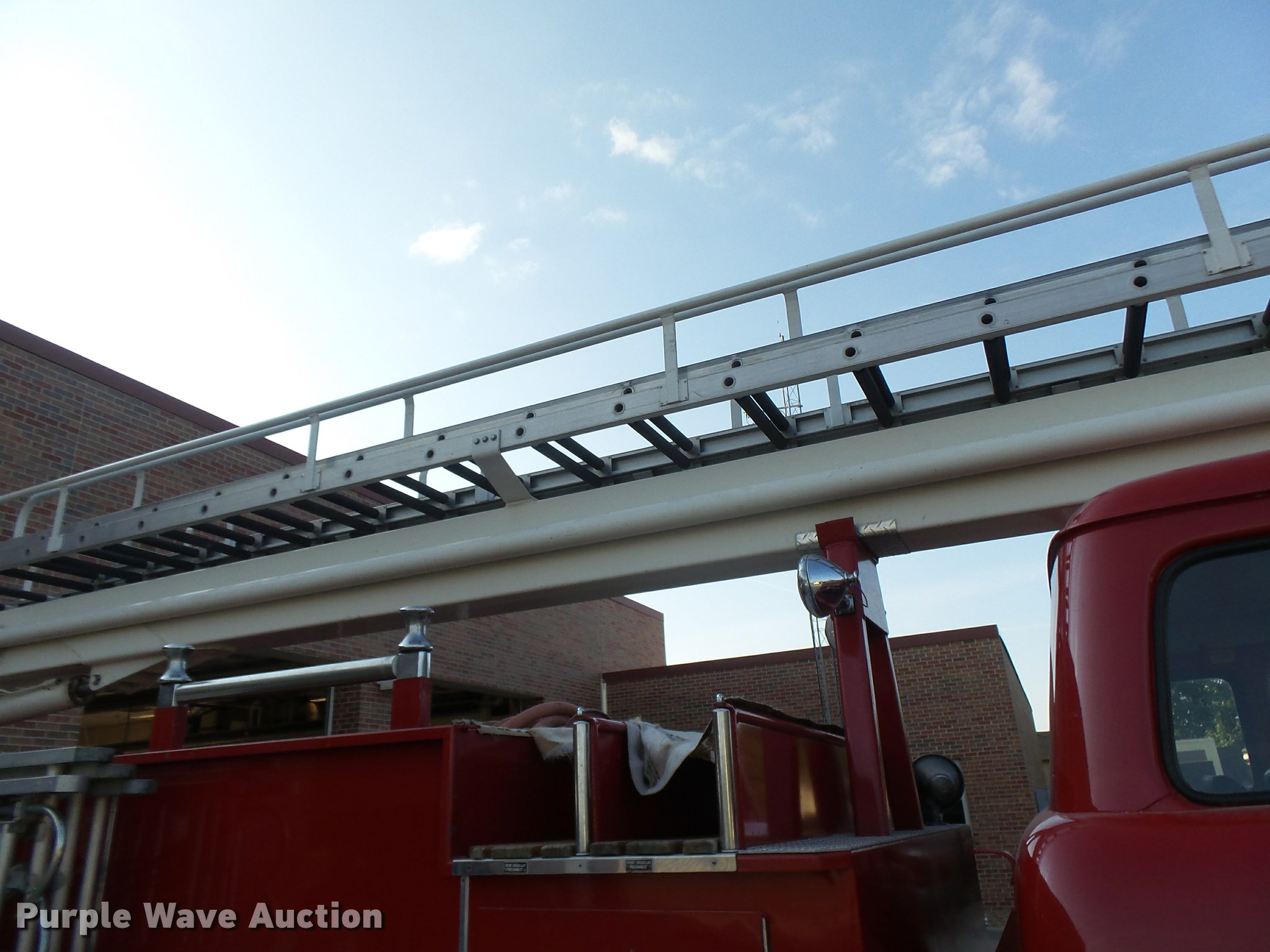 Purple Wave is selling a used Fire Truck or Emergency Vehicle in Kansas. This item is a 1973 Ford Quint B5042 Snorkel ladder fire truck with the following: 25,556 miles on odometer, Caterpillar 225 diesel engine, Five speed manual transmission, Manual windows and locks, 50' tela squirt ladder, 100' booster line on hose reel, (2) 10' x 6" hard suction lines, 35' extension ladder, 14' roof ladder, 10' attic ladder, 1,250 gpm pump, 500 gallon tank, Rear hydraulic outriggers, Air brakes, 11.00R20 tires