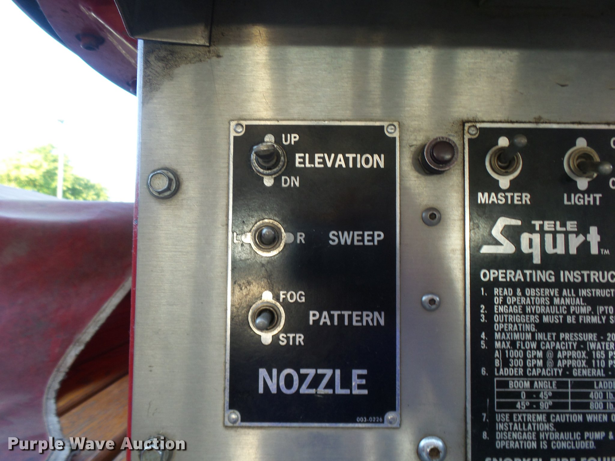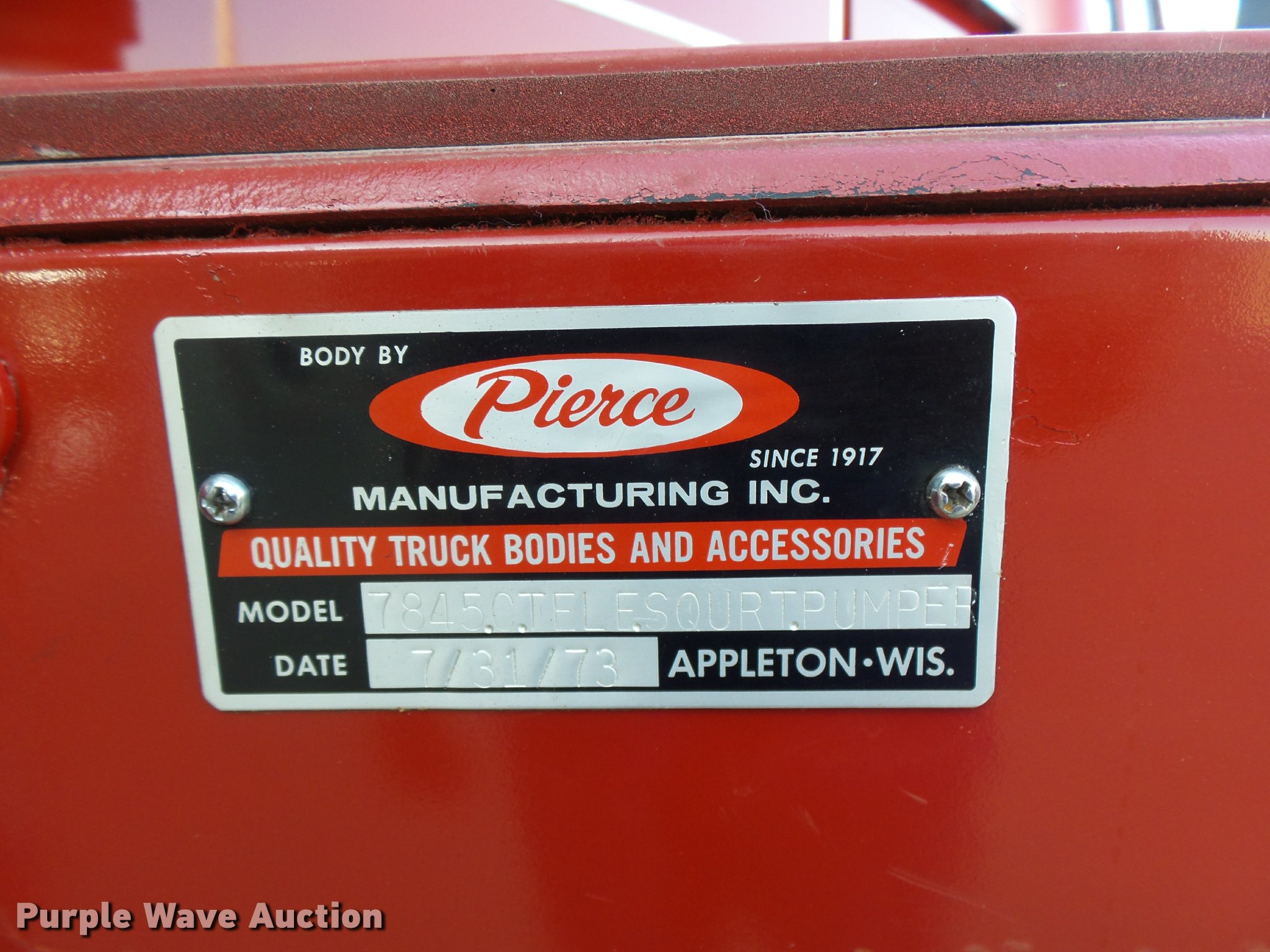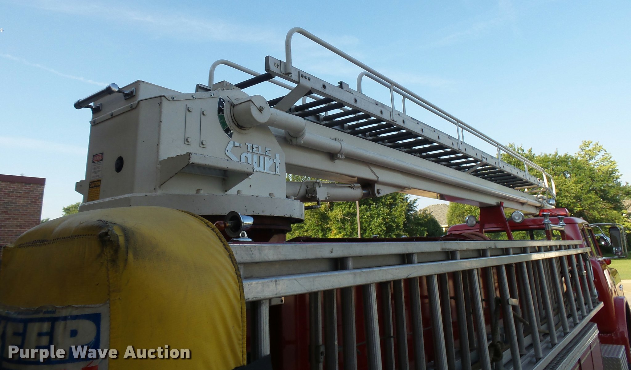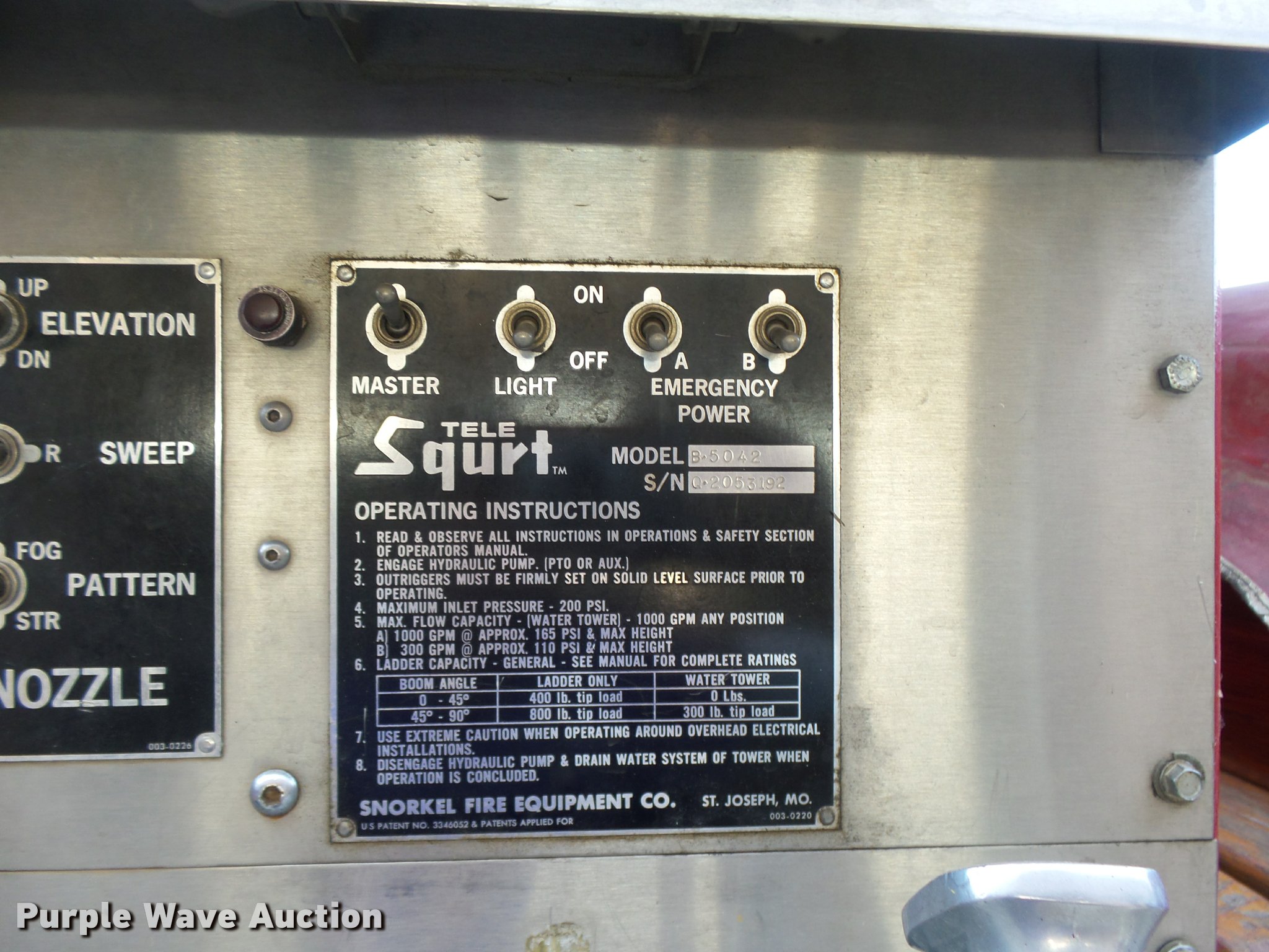 Purple Wave is selling a used Fire Truck or Emergency Vehicle in Kansas. This item is a 1973 Ford Quint B5042 Snorkel ladder fire truck with the following: 25,556 miles on odometer, Caterpillar 225 diesel engine, Five speed manual transmission, Manual windows and locks, 50' tela squirt ladder, 100' booster line on hose reel, (2) 10' x 6" hard suction lines, 35' extension ladder, 14' roof ladder, 10' attic ladder, 1,250 gpm pump, 500 gallon tank, Rear hydraulic outriggers, Air brakes, 11.00R20 tires