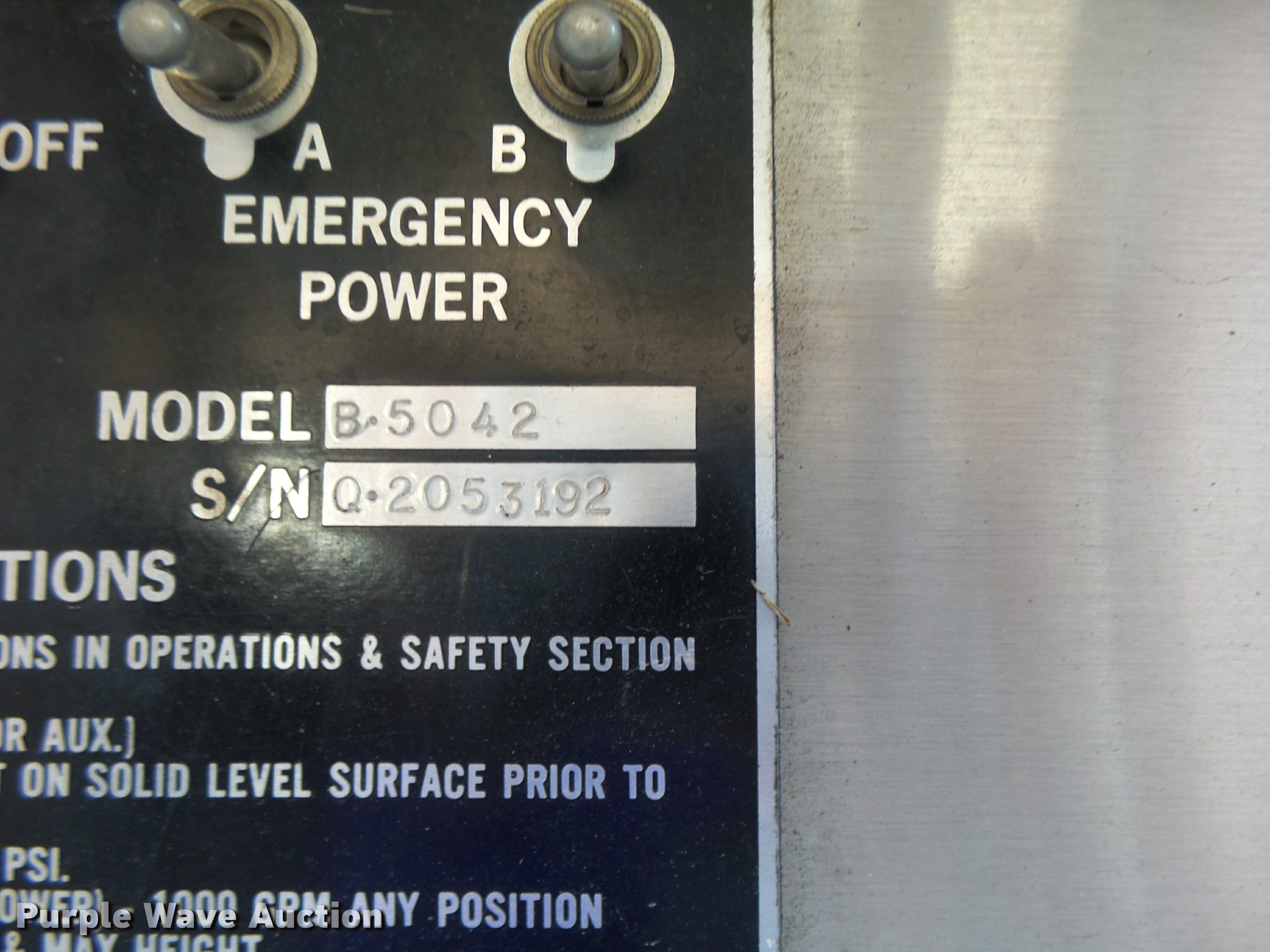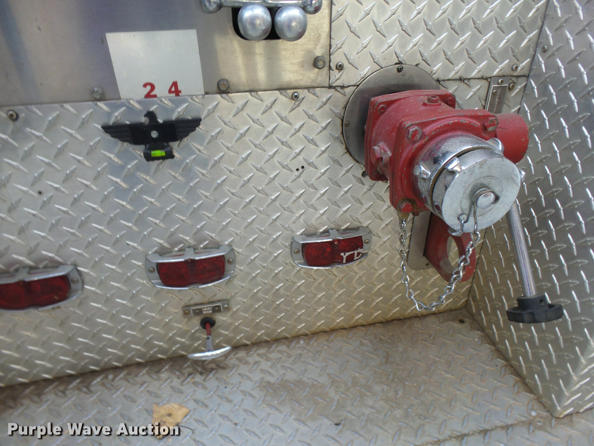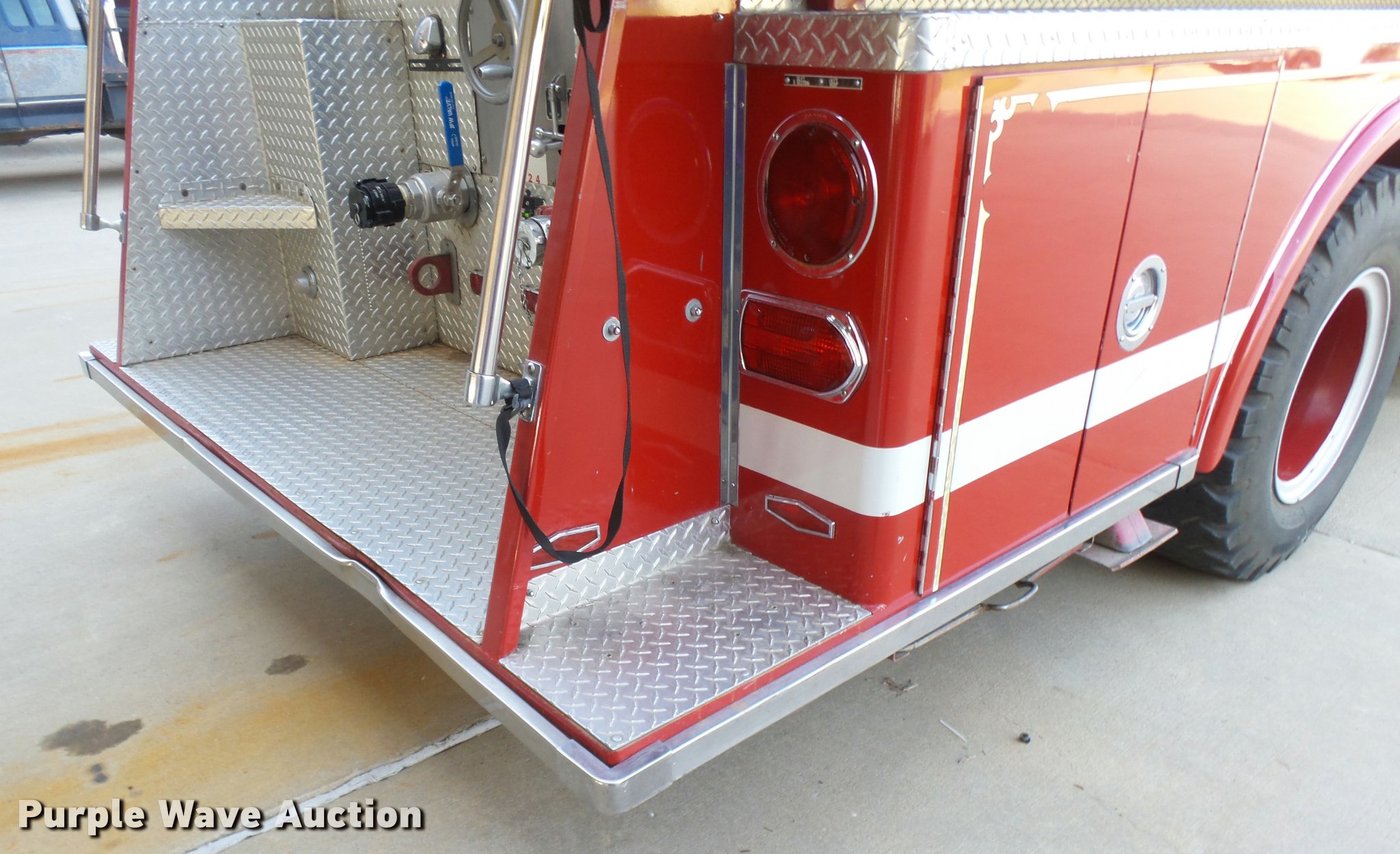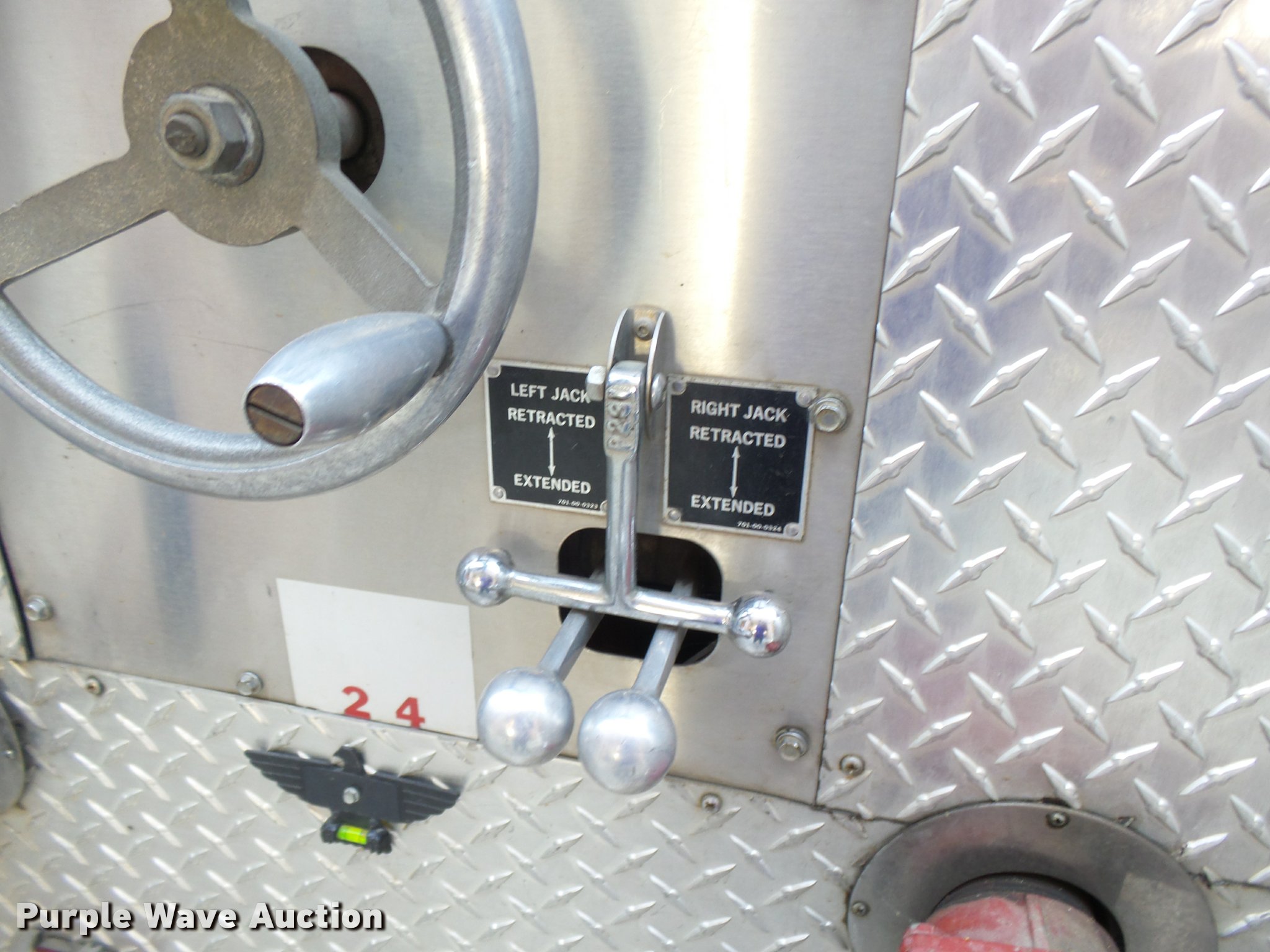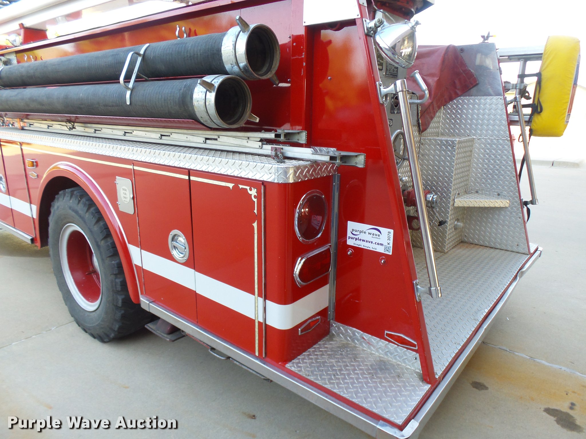 Purple Wave is selling a used Fire Truck or Emergency Vehicle in Kansas. This item is a 1973 Ford Quint B5042 Snorkel ladder fire truck with the following: 25,556 miles on odometer, Caterpillar 225 diesel engine, Five speed manual transmission, Manual windows and locks, 50' tela squirt ladder, 100' booster line on hose reel, (2) 10' x 6" hard suction lines, 35' extension ladder, 14' roof ladder, 10' attic ladder, 1,250 gpm pump, 500 gallon tank, Rear hydraulic outriggers, Air brakes, 11.00R20 tires