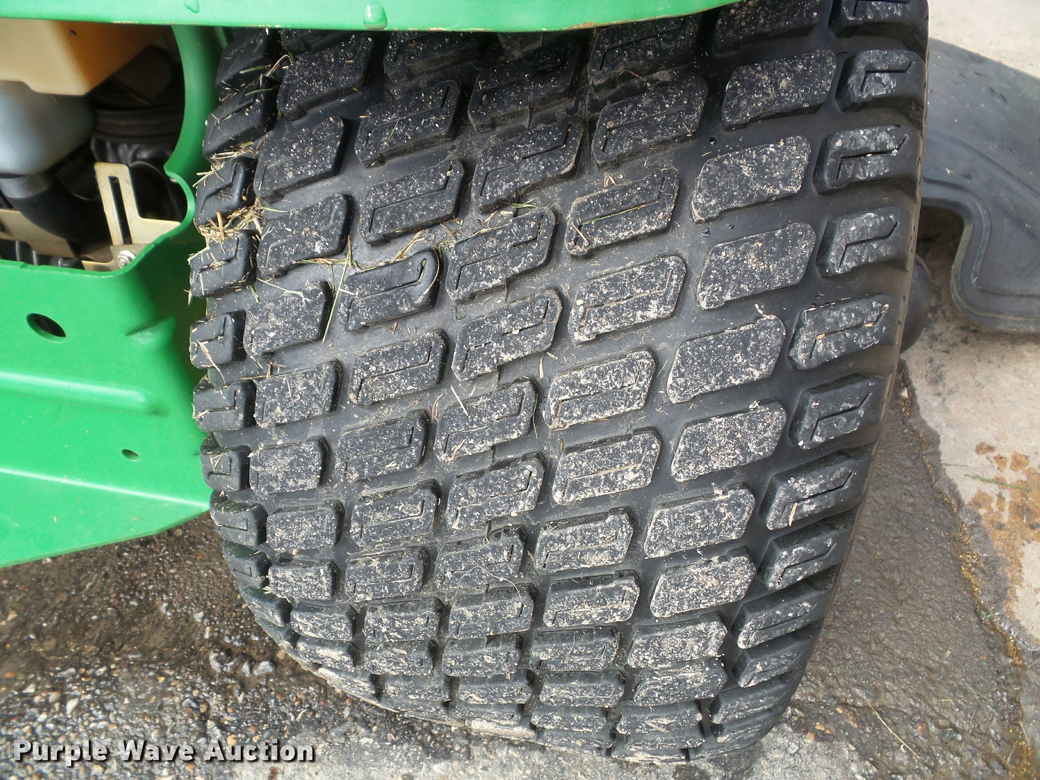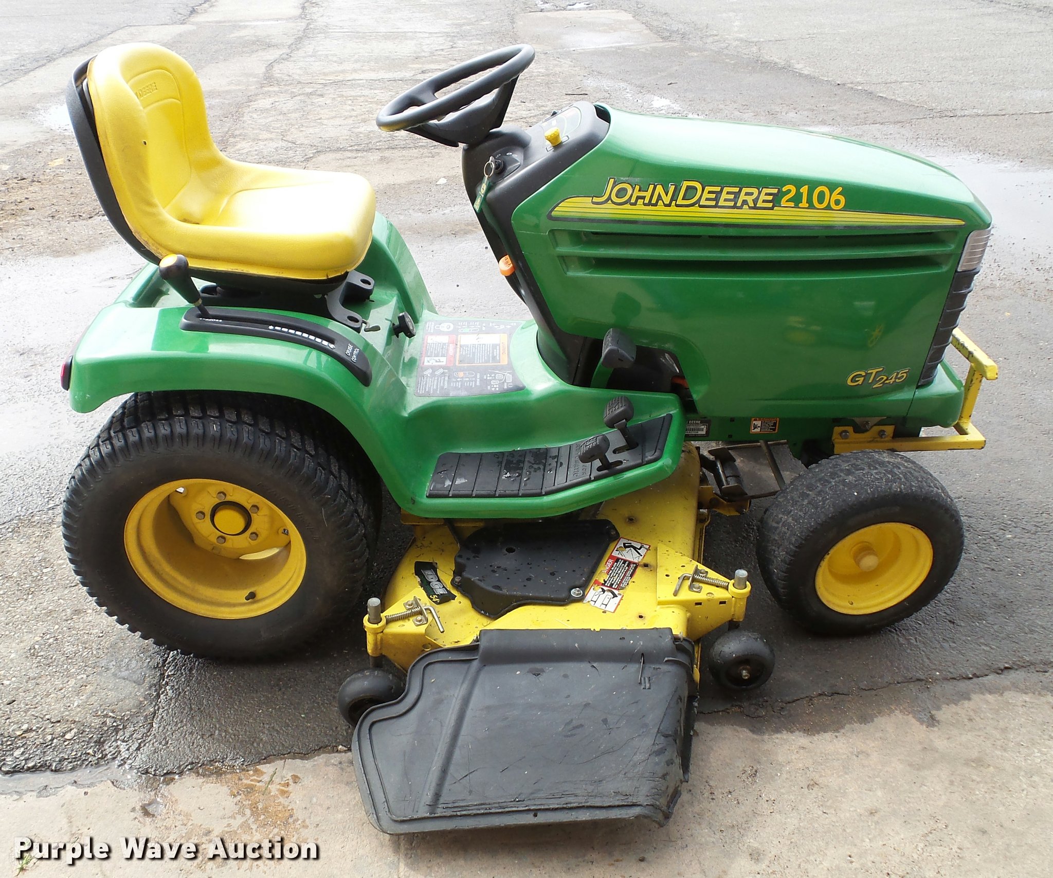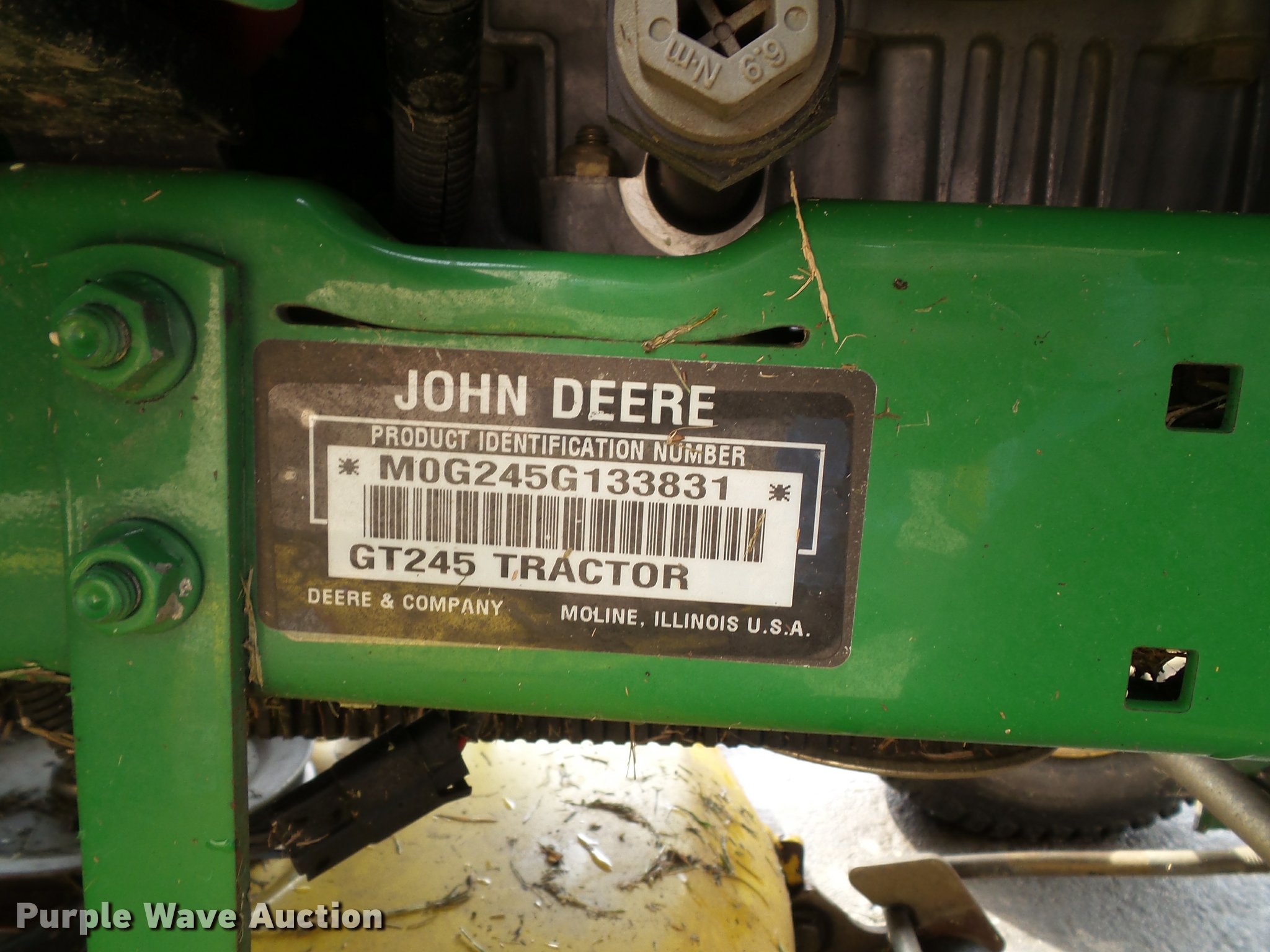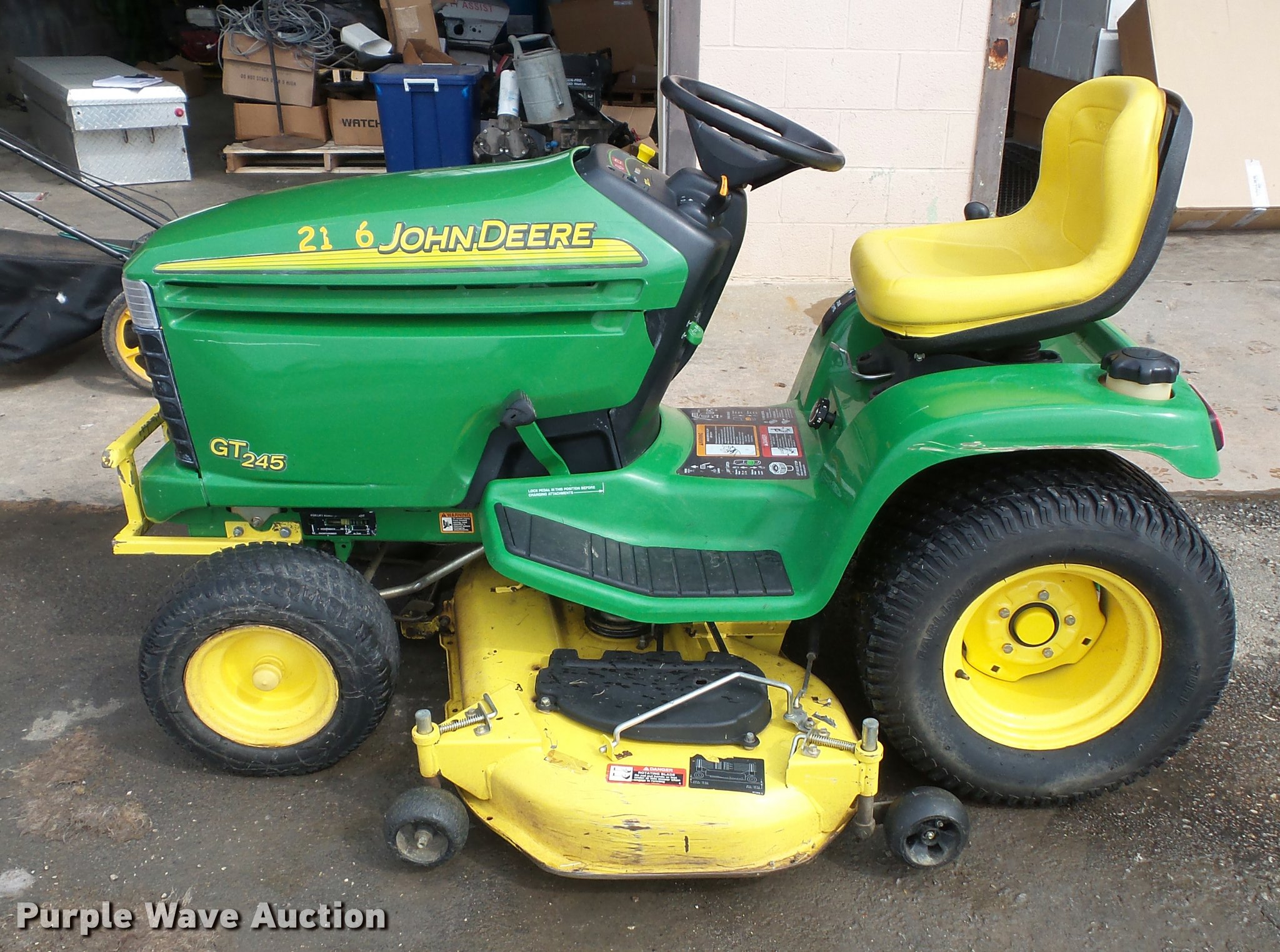 Purple Wave is selling a used Lawn Mower in Kansas. This item is a (2) lawn mowers with the following: John Deere GT245 lawn mower, 541 hours on meter, 54" cut, 20 HP gas engine, Automatic transmission, Twin touch clutch, Cruise, Bumper guard, 16x6.50-8 front tires, 24x12.00-12 rear tires, Front needs re-aligned, Hood damage on left side, Serial M0G245G133831, Unit# 2106, Yardman MTD push mower, 18" cut, Bagger, Hi-wheel, Front wheels worn