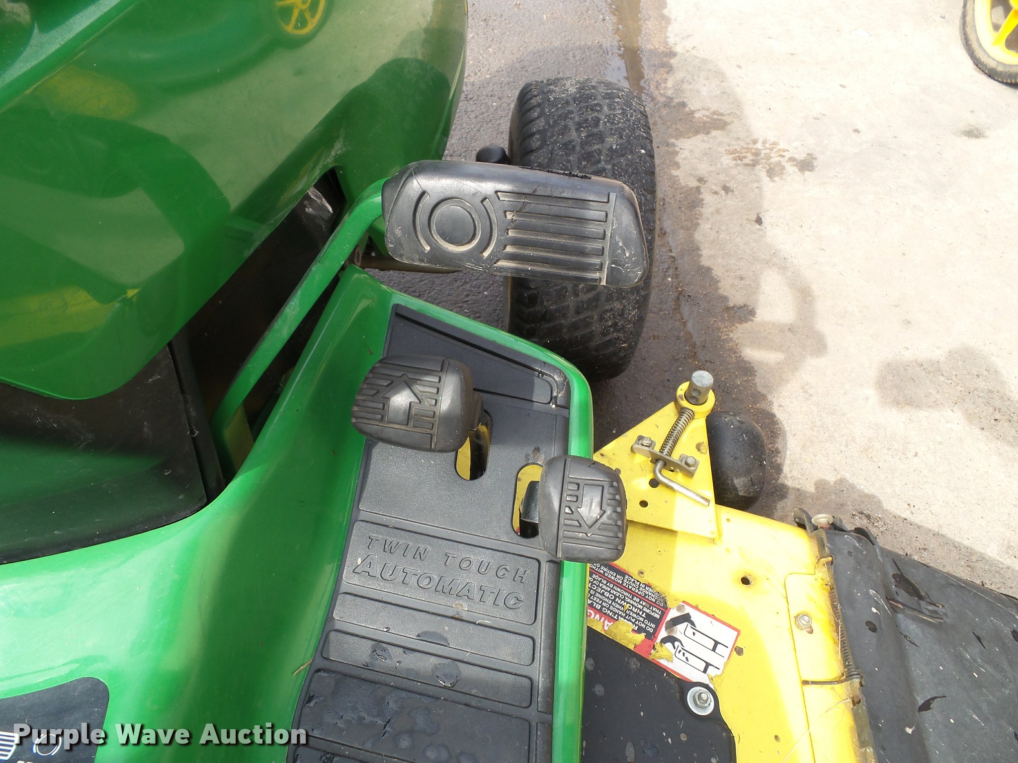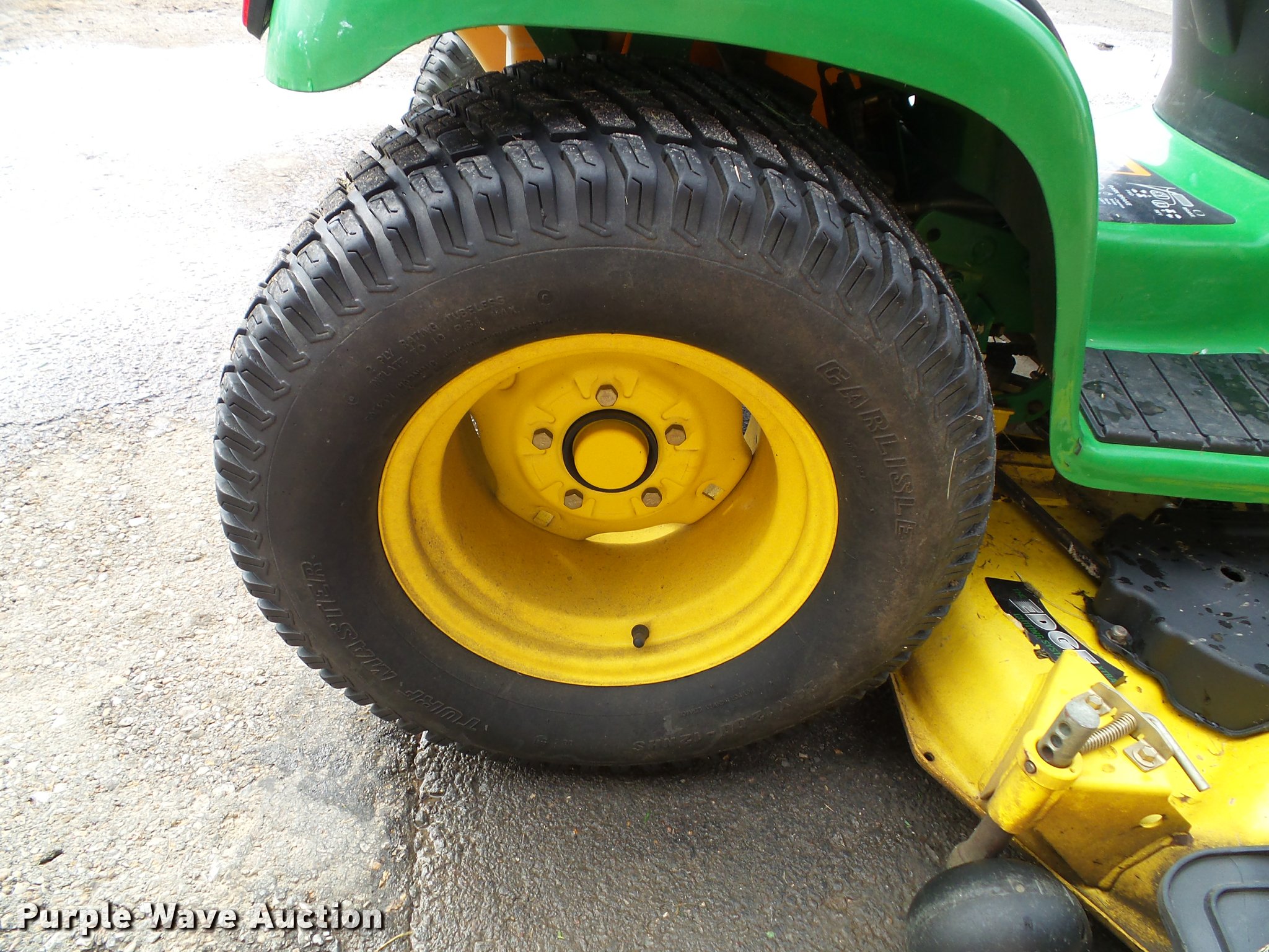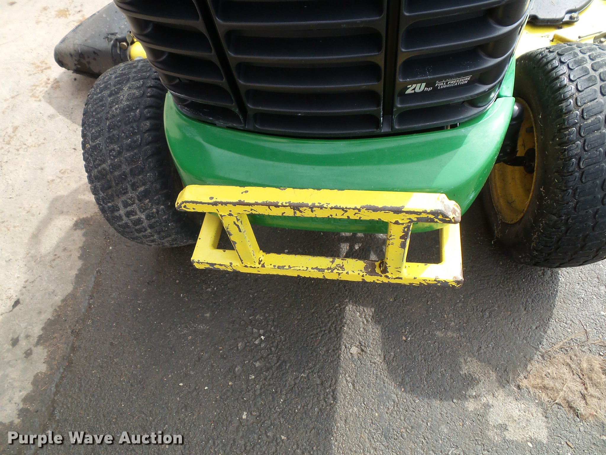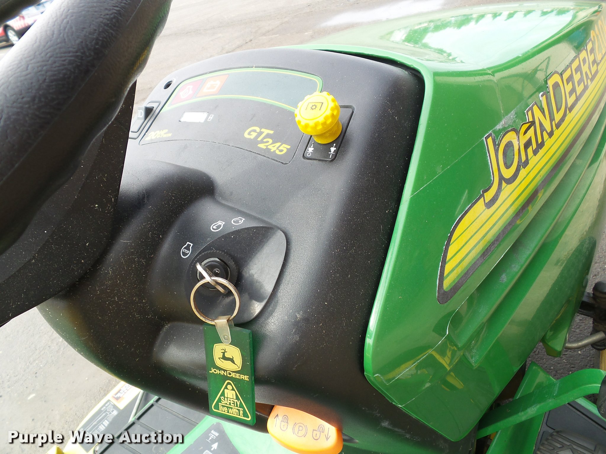 Purple Wave is selling a used Lawn Mower in Kansas. This item is a (2) lawn mowers with the following: John Deere GT245 lawn mower, 541 hours on meter, 54" cut, 20 HP gas engine, Automatic transmission, Twin touch clutch, Cruise, Bumper guard, 16x6.50-8 front tires, 24x12.00-12 rear tires, Front needs re-aligned, Hood damage on left side, Serial M0G245G133831, Unit# 2106, Yardman MTD push mower, 18" cut, Bagger, Hi-wheel, Front wheels worn