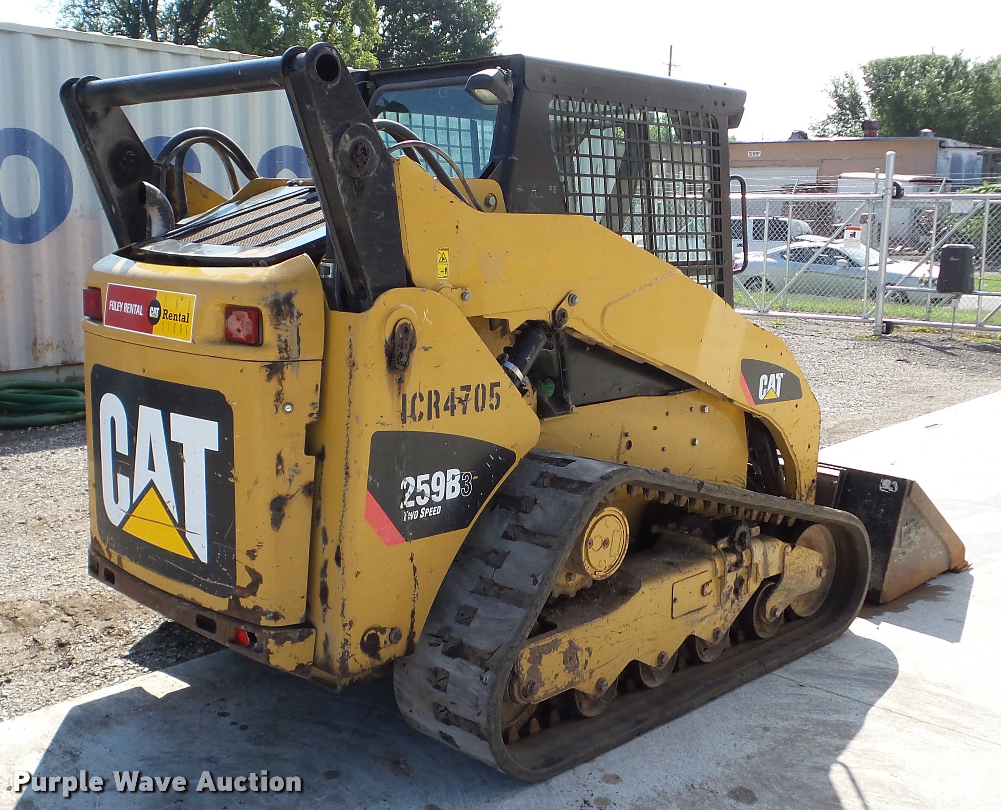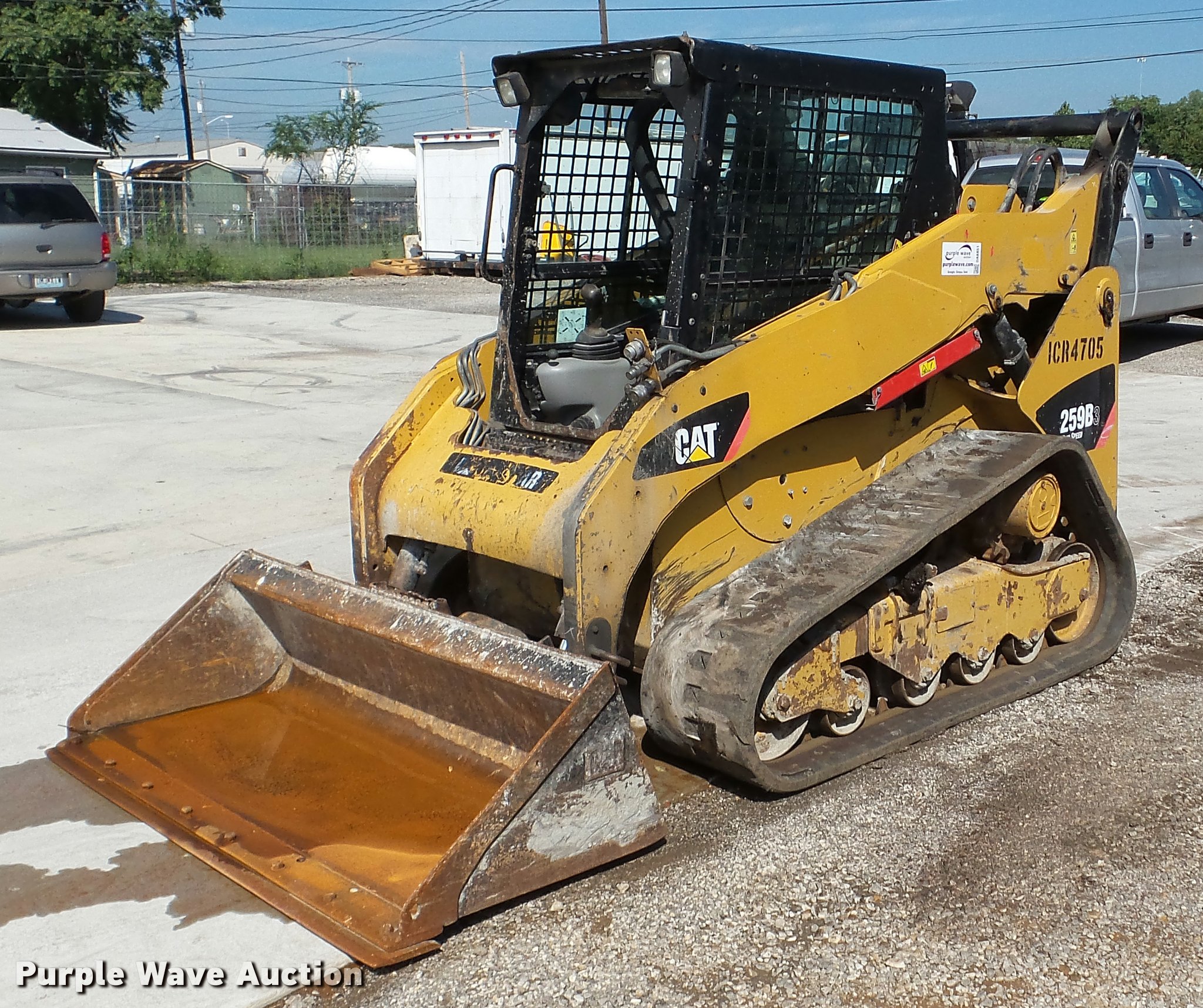 Purple Wave is selling a used Tracked Skid Steer Loader in Kansas. This item is a 2011 Caterpillar 259B skid steer with the following: 3,791 hours on meter, Four cylinder diesel engine, Enclosed cab, AC and heat, Joystick controls, Spring suspension seat, Front and rear work lights, 67"W bucket, Bolt-on cutting edge, Hydraulic quick coupler, Auxiliary hydraulics, 16"W tracks, Windshield broken, Non-operational AC and heat, Serial 0259BAYYZ00458