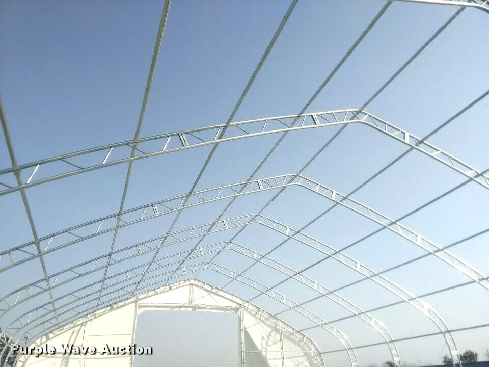 Purple Wave is selling a used Building Materials in Kansas. This item is a 40' x 80' x 23' double truss storage building with the following: 18'W x 16'H drive through doors, Base plates with mounting pegs, Double truss frame design, Galvanized finish, Steel frame, Roll up mechanical doors on both ends, Ratchet strap for drum tight fit, Anchoring system, 26.5 0z PVC fabric backed fabric, Instructions included, Unused