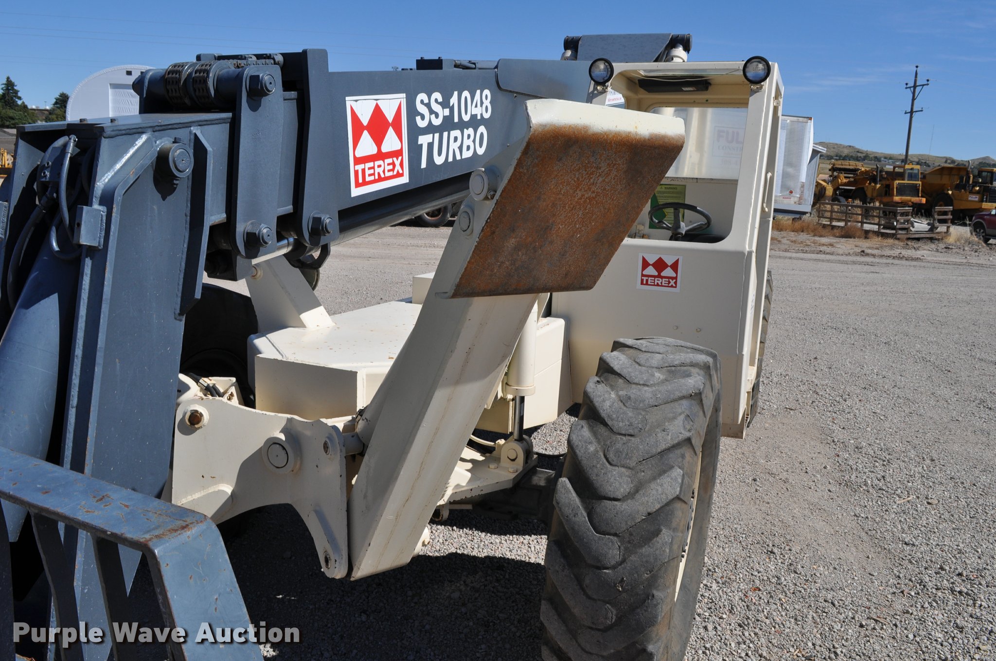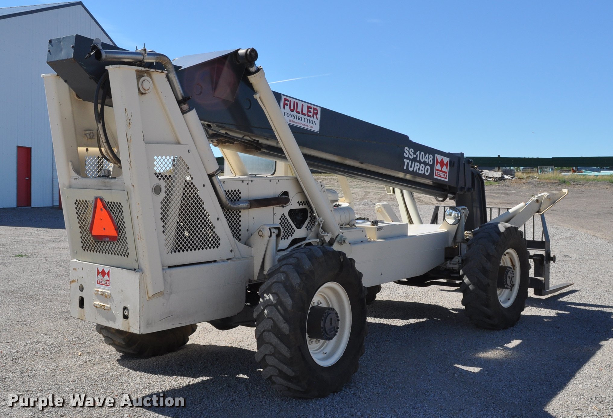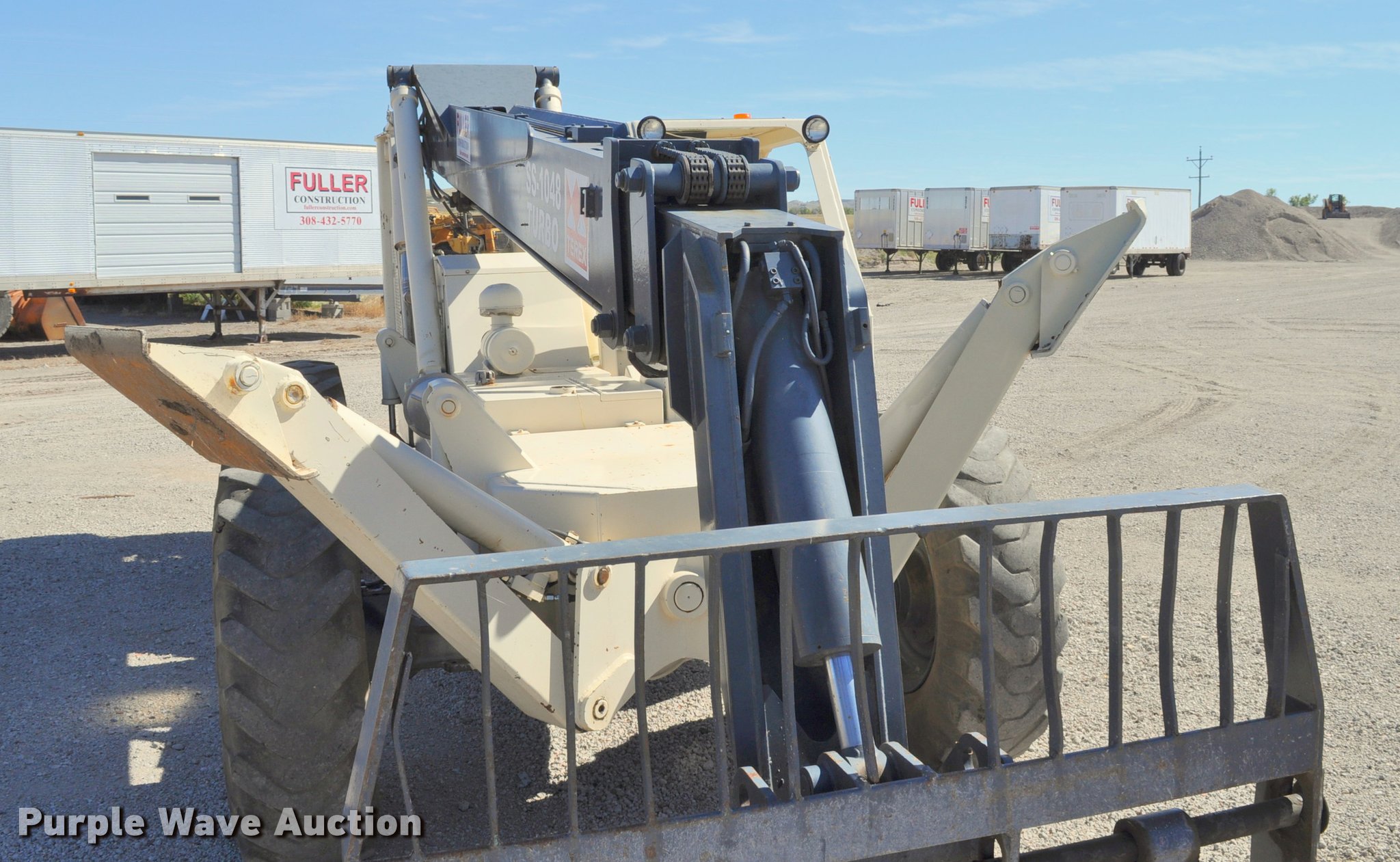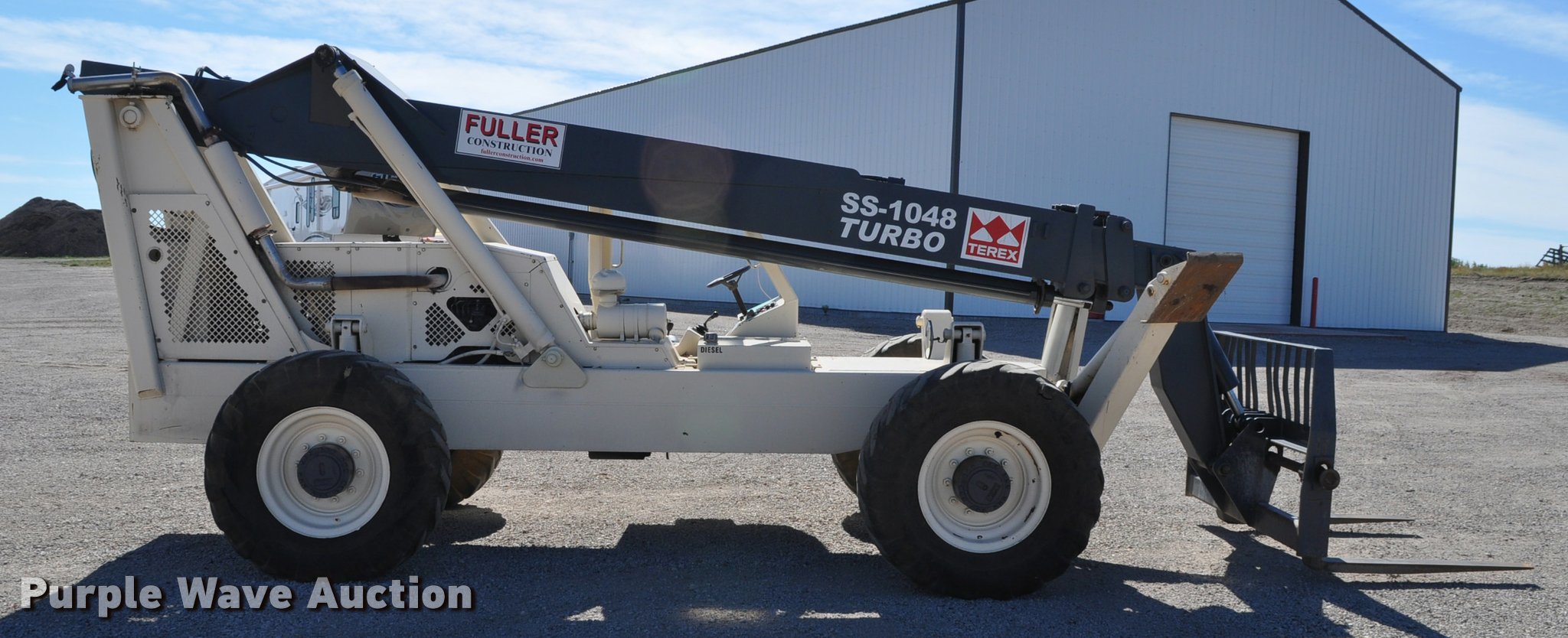 Terex SS1048 telehandler. 928 hours on meter, Four cylinder turbo diesel engine, Powershift transmission 3F-3R gears, Four wheel drive, Canopy, Work lights, Crab steering, Four wheel steering, 10,000 lbs max lift capacity, 48' max lift height, 28' max reach length, Three boom stages, 48"L forks, Hydraulic leveling, Hydraulic outriggers, 14.00-24 tires, Right stabilizer leaks down, Serial 992384. Fuller Construction. 555 S Stockade Rd. Chadron, NE 69337