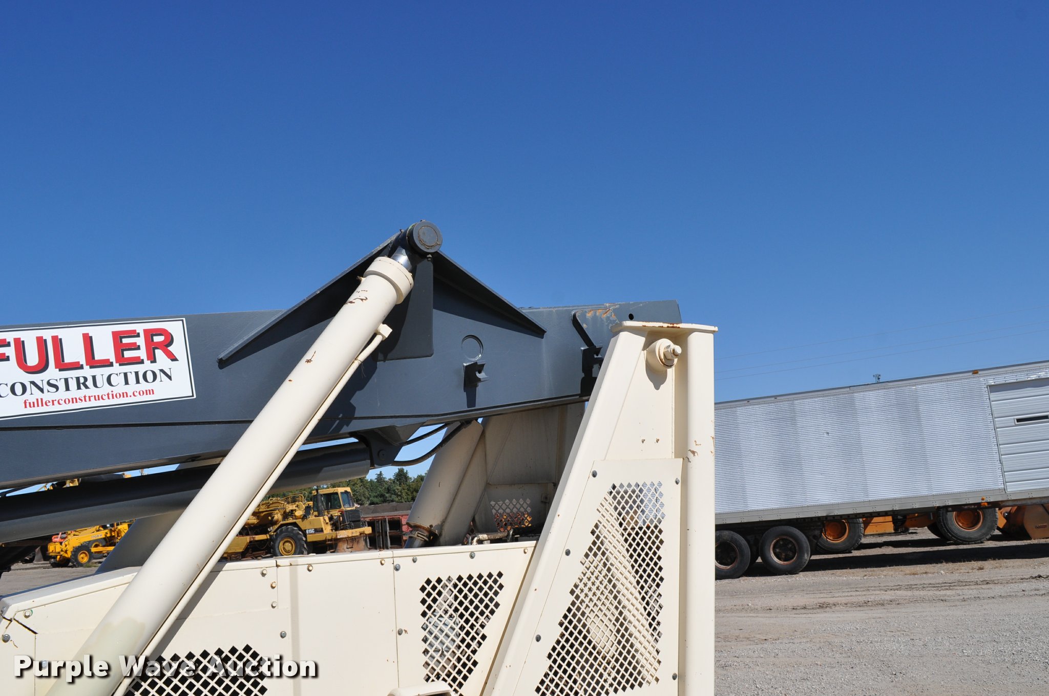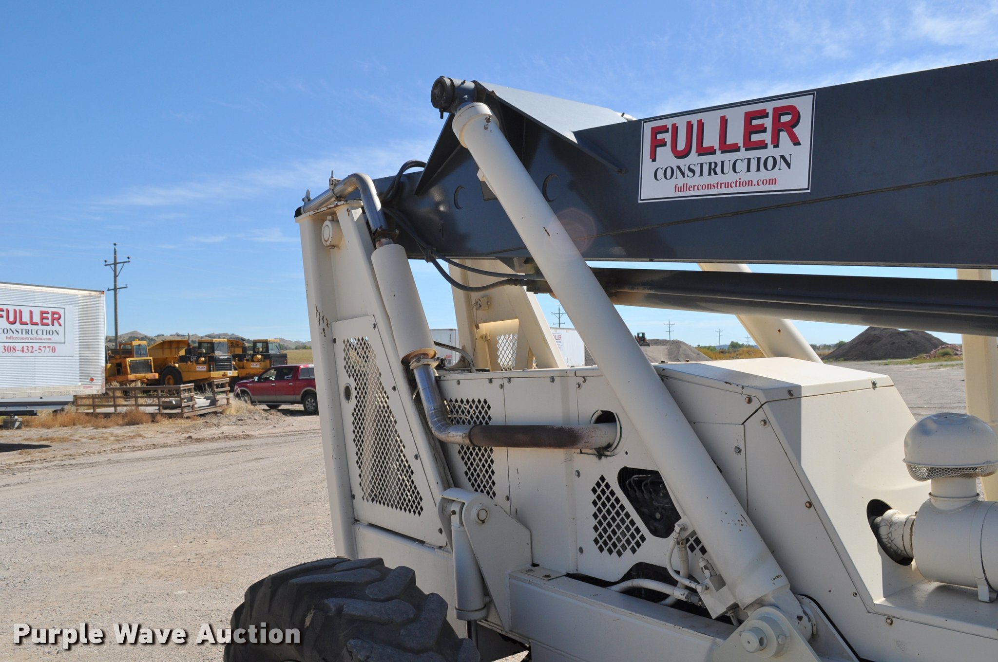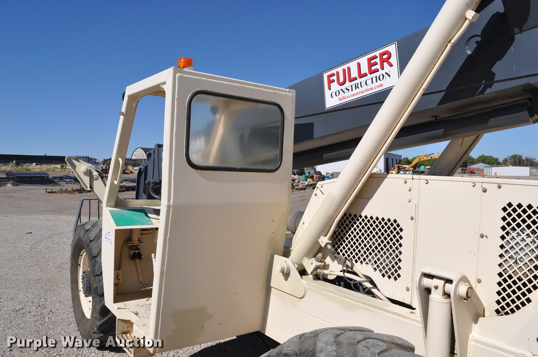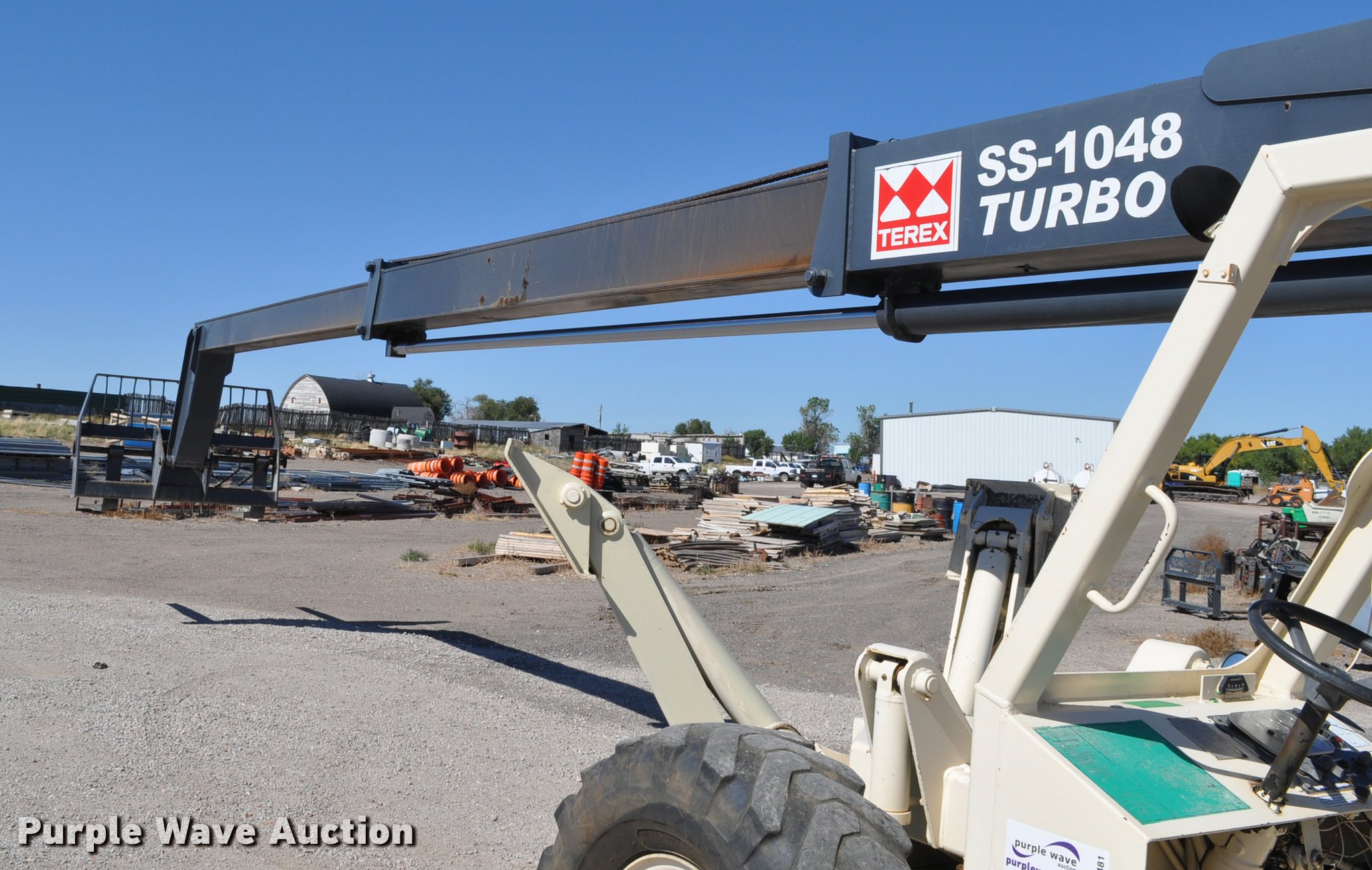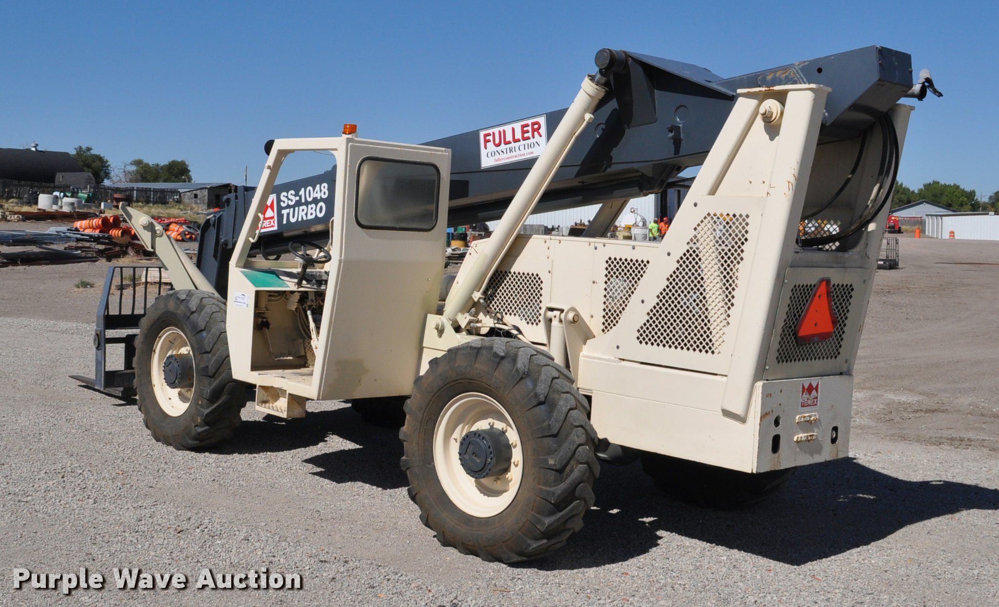 Terex SS1048 telehandler. 928 hours on meter, Four cylinder turbo diesel engine, Powershift transmission 3F-3R gears, Four wheel drive, Canopy, Work lights, Crab steering, Four wheel steering, 10,000 lbs max lift capacity, 48' max lift height, 28' max reach length, Three boom stages, 48"L forks, Hydraulic leveling, Hydraulic outriggers, 14.00-24 tires, Right stabilizer leaks down, Serial 992384. Fuller Construction. 555 S Stockade Rd. Chadron, NE 69337