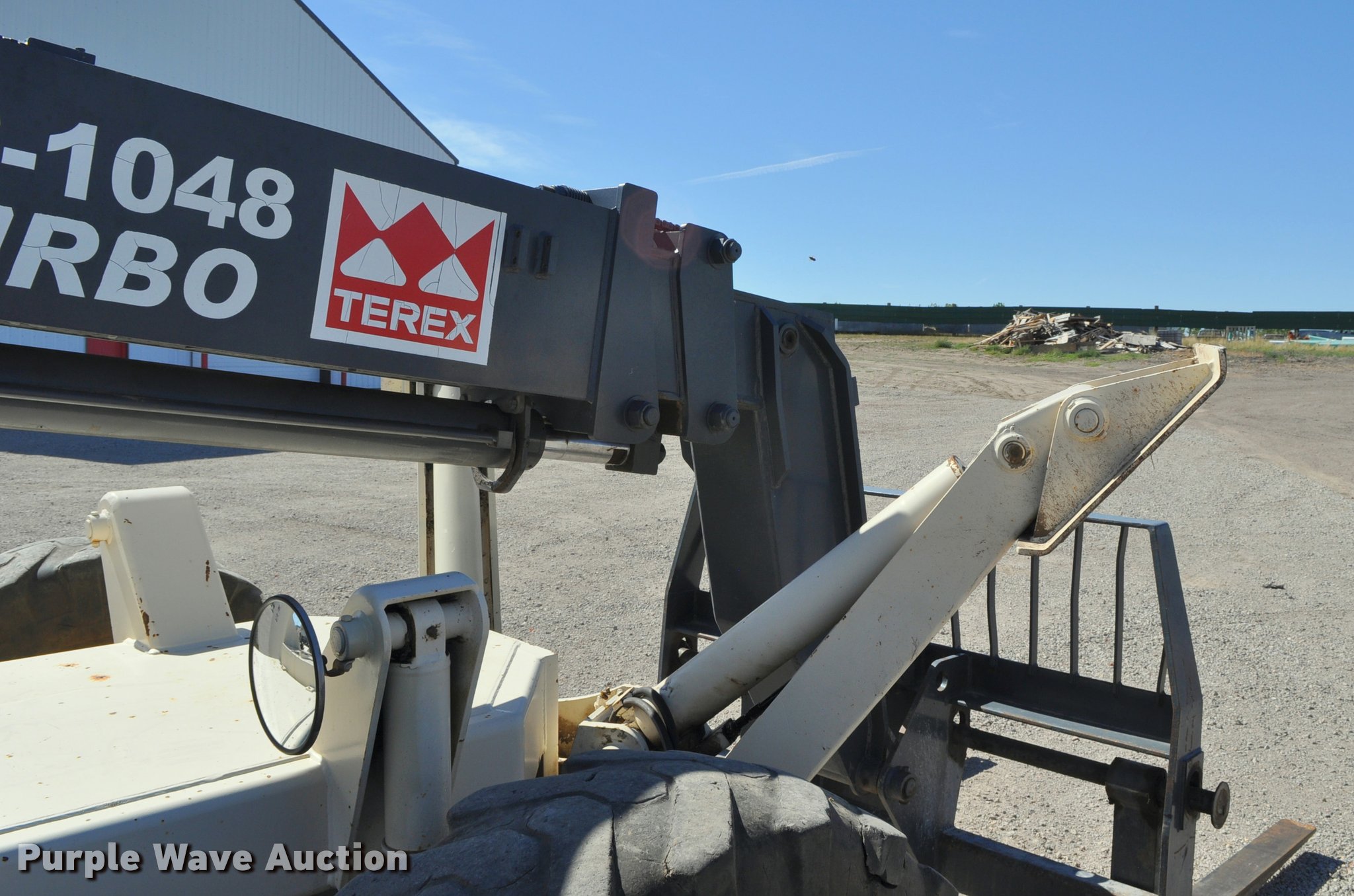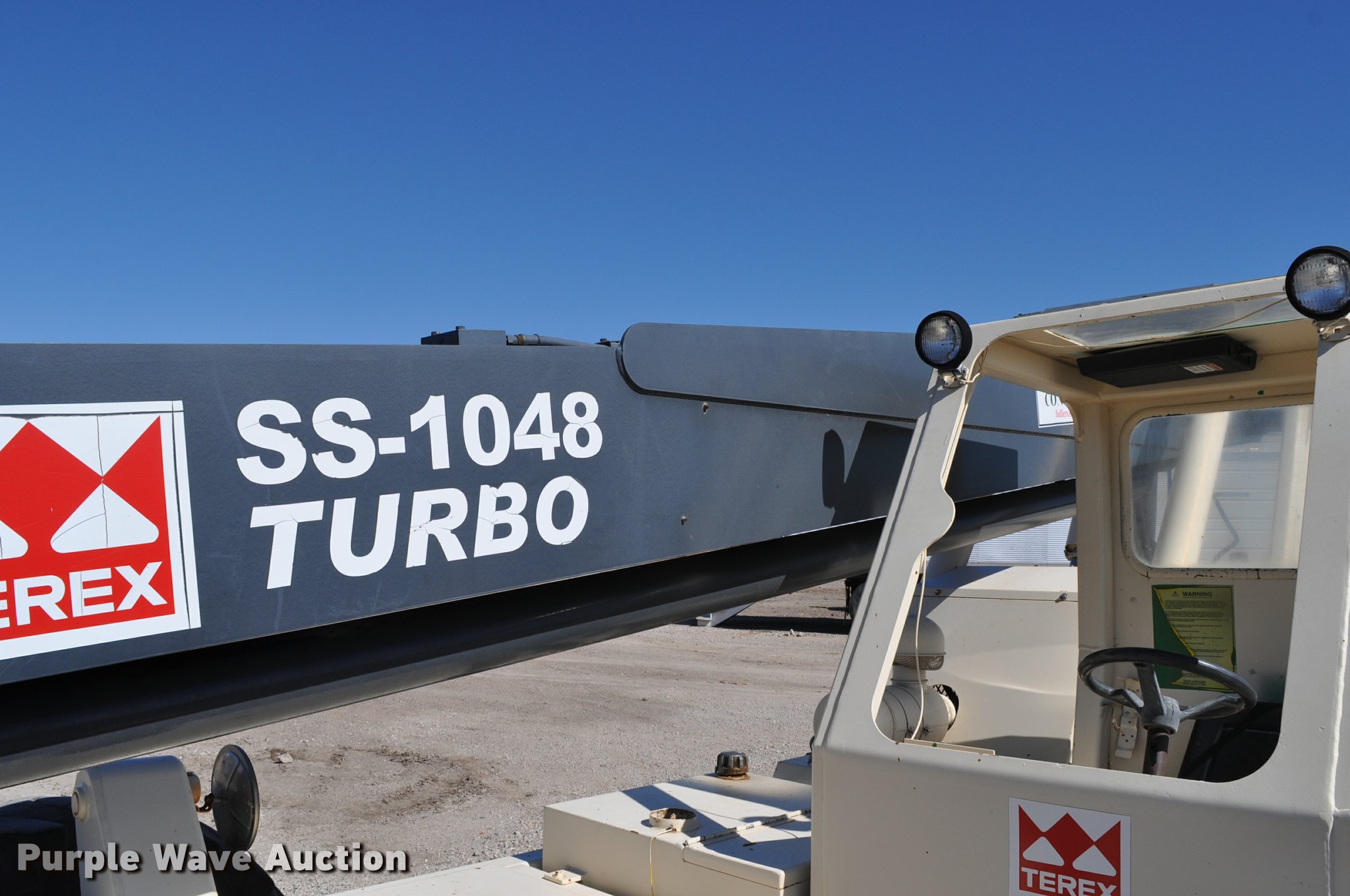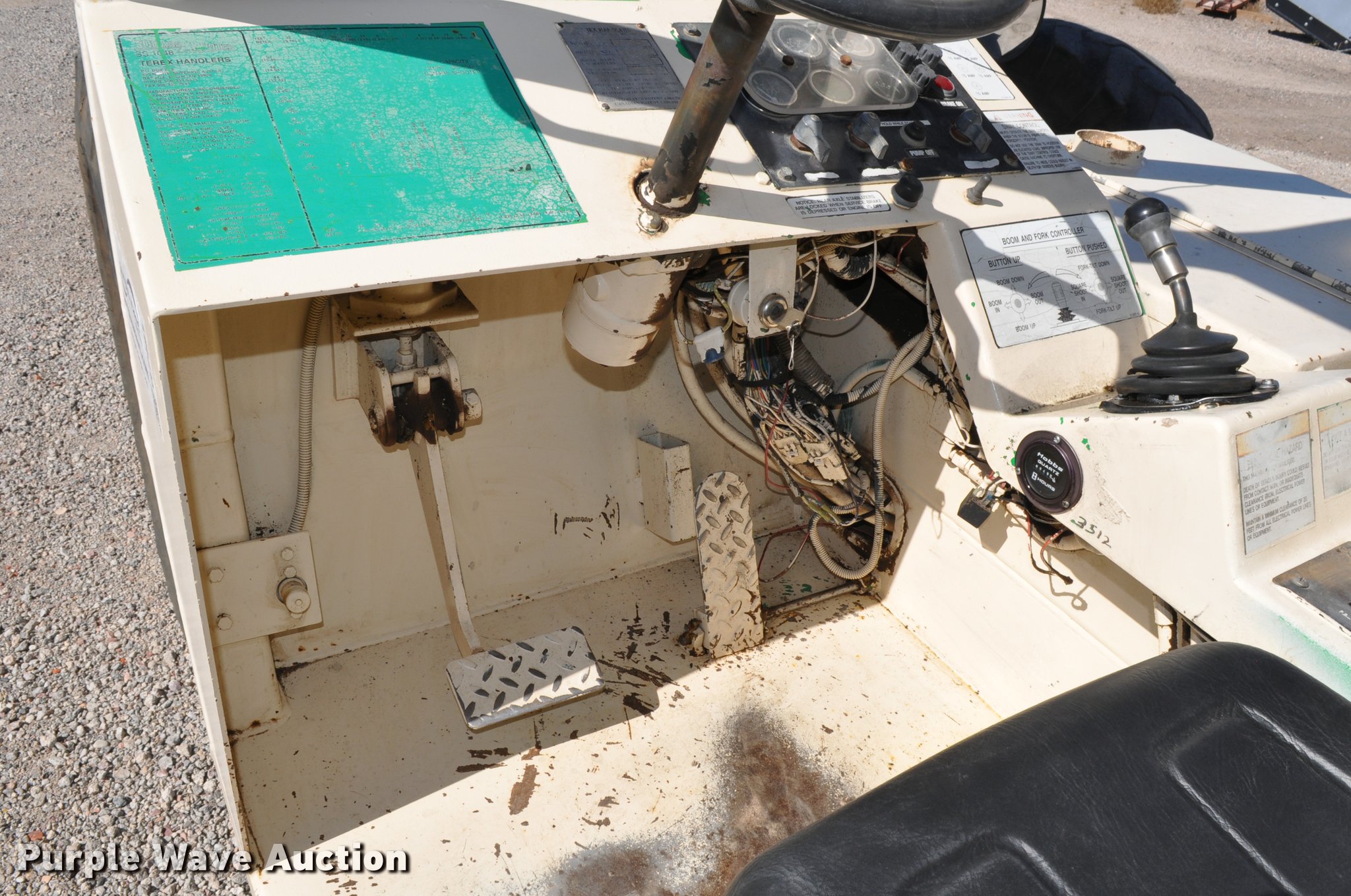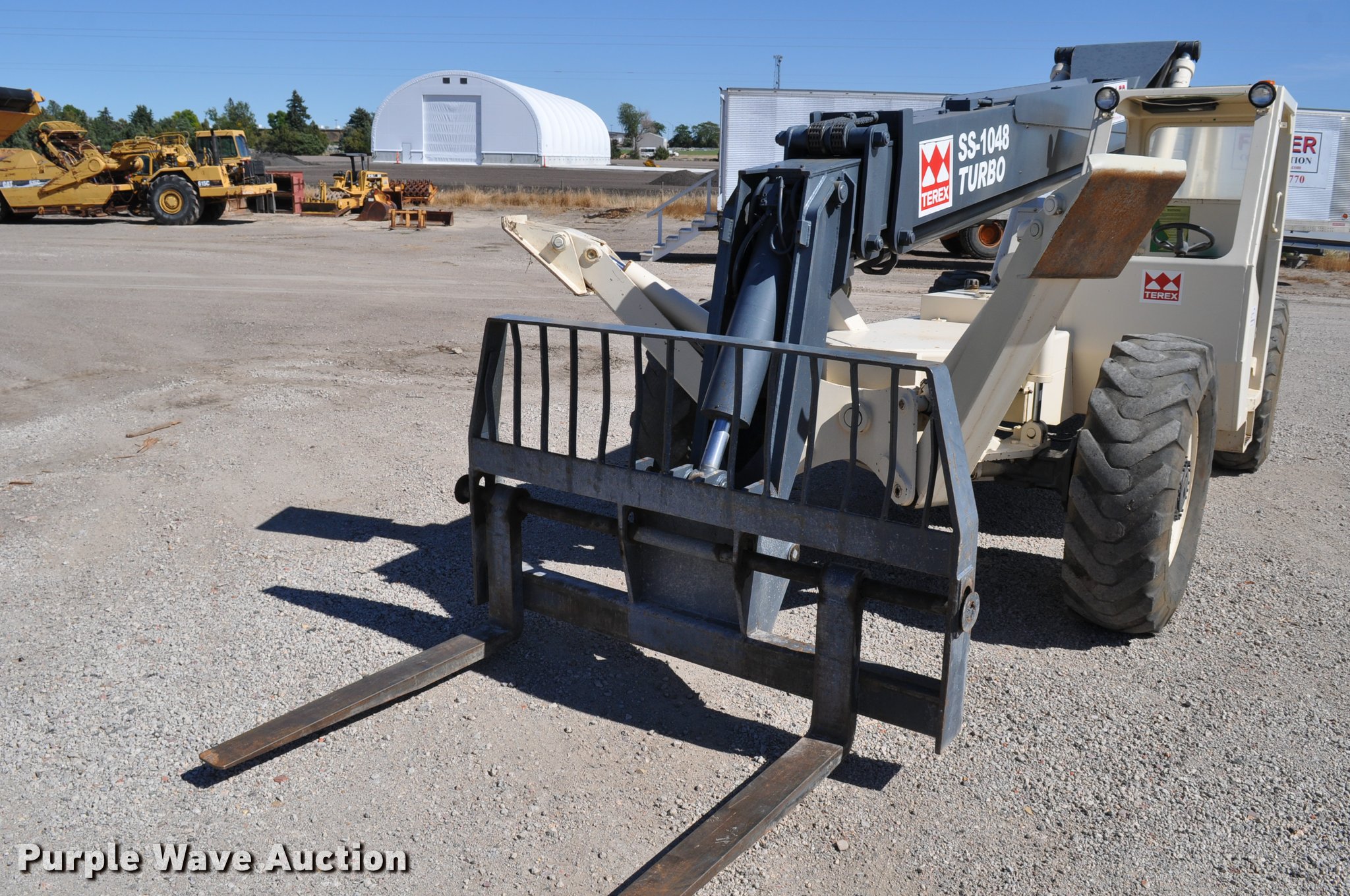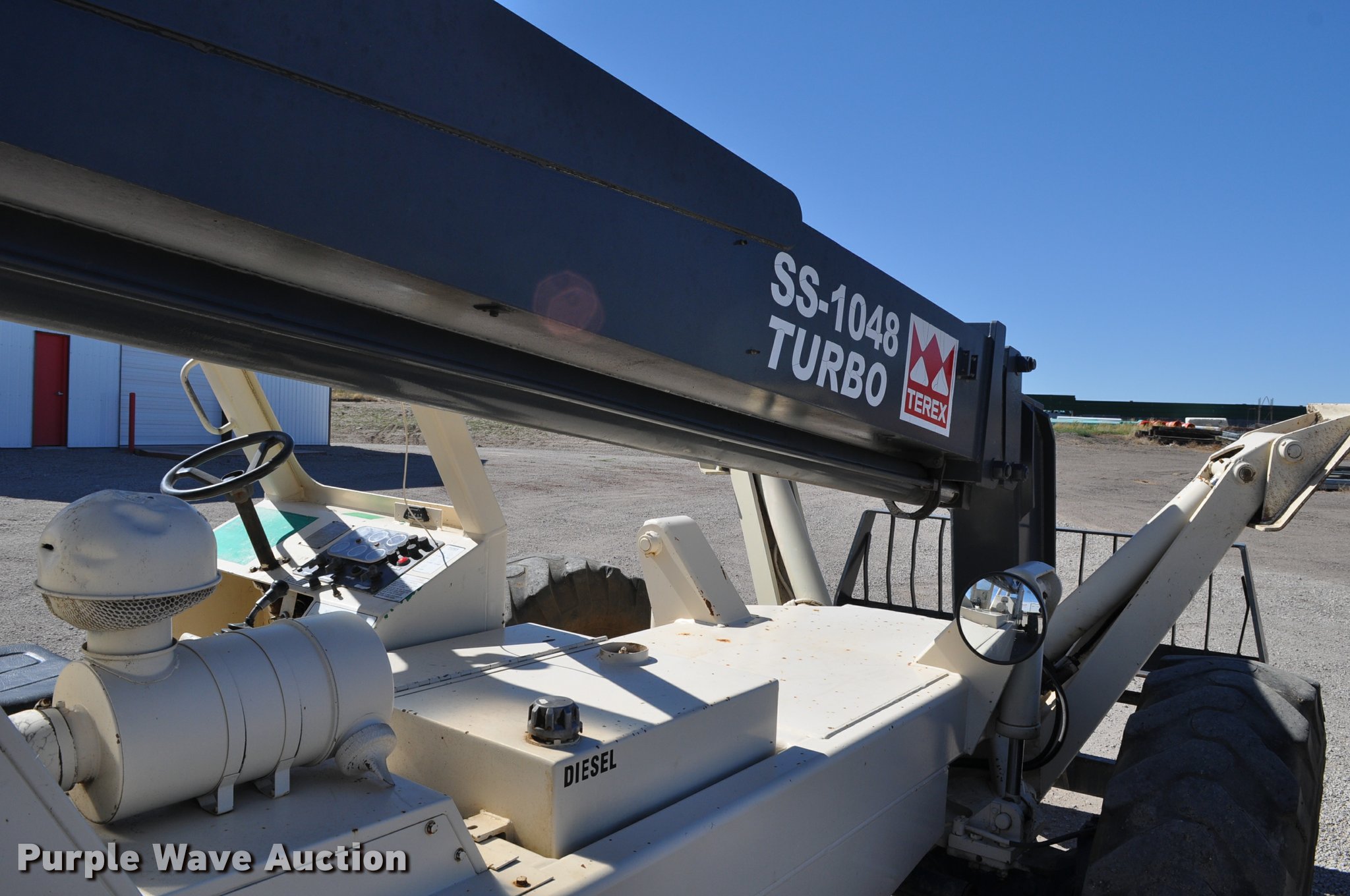 Purple Wave is selling a used Telehandler in Nebraska. This item is a Terex SS1048 telehandler with the following: 928 hours on meter, Four cylinder turbo diesel engine, Powershift transmission, 3F-3R gears, Four wheel drive, Canopy, Work lights, Crab steering, Four wheel steering, 10,000 lbs max lift capacity, 48' max lift height, 28' max reach length, Three boom stages, 48"L forks, Hydraulic leveling, Hydraulic outriggers, 14.00-24 tires, Right stabilizer leaks down, Serial 992384