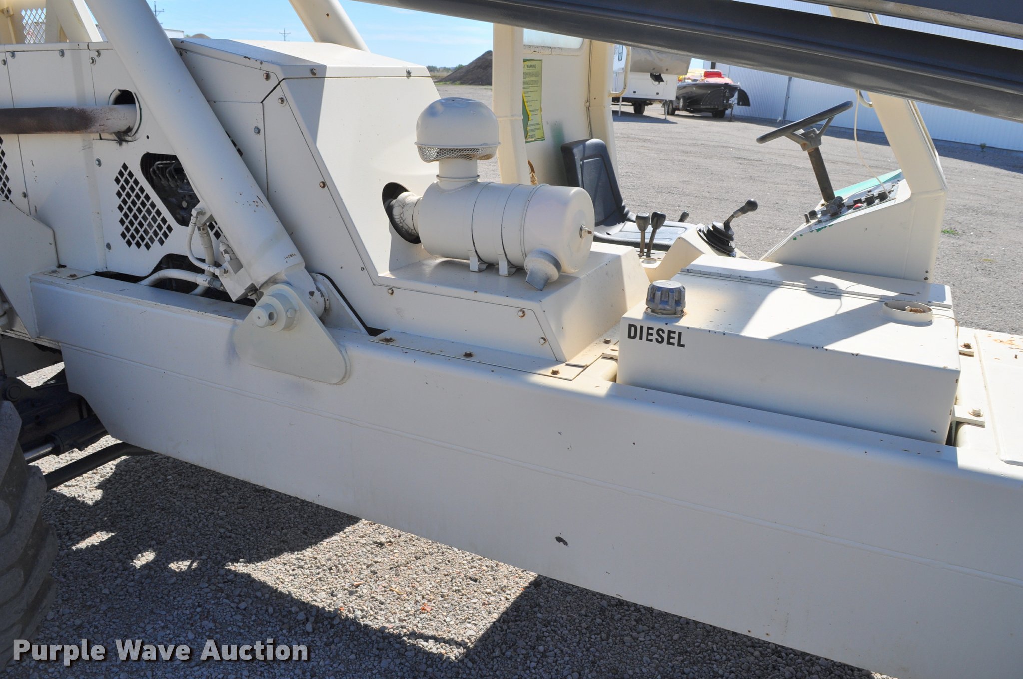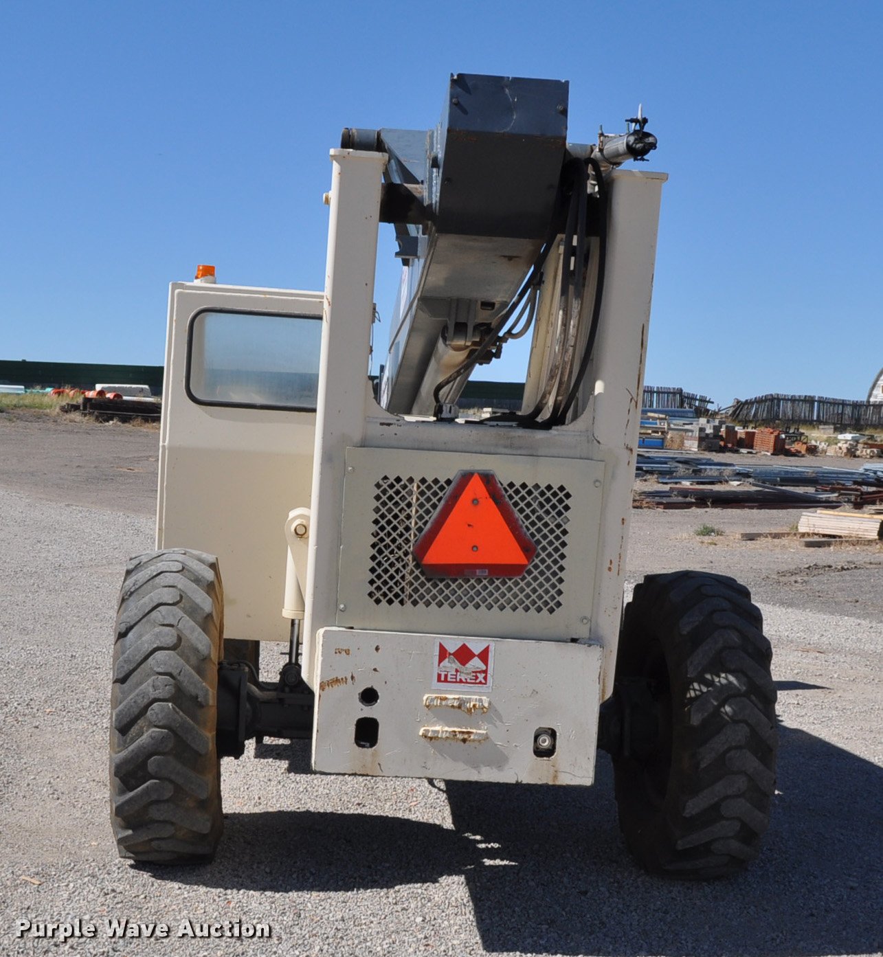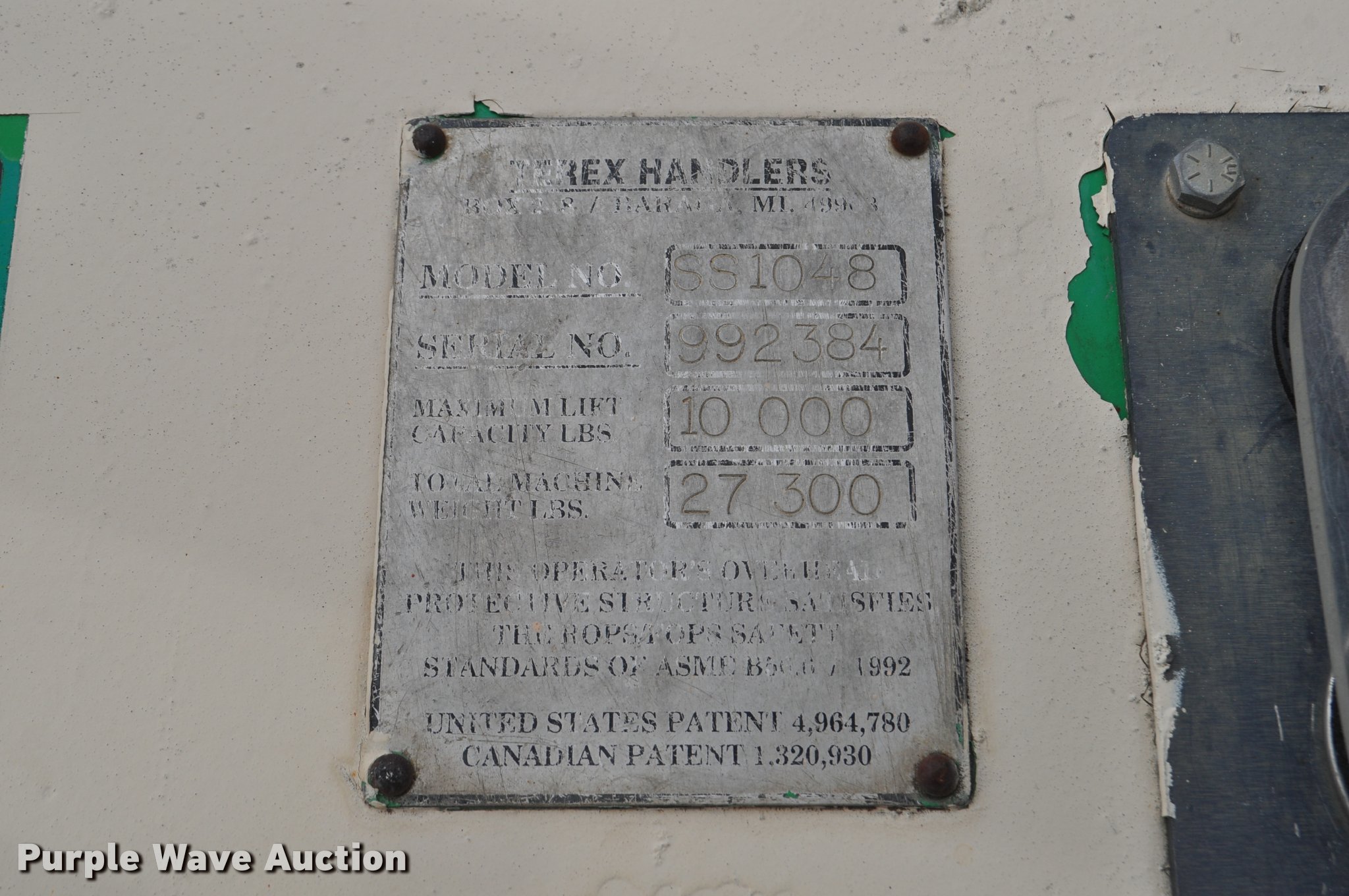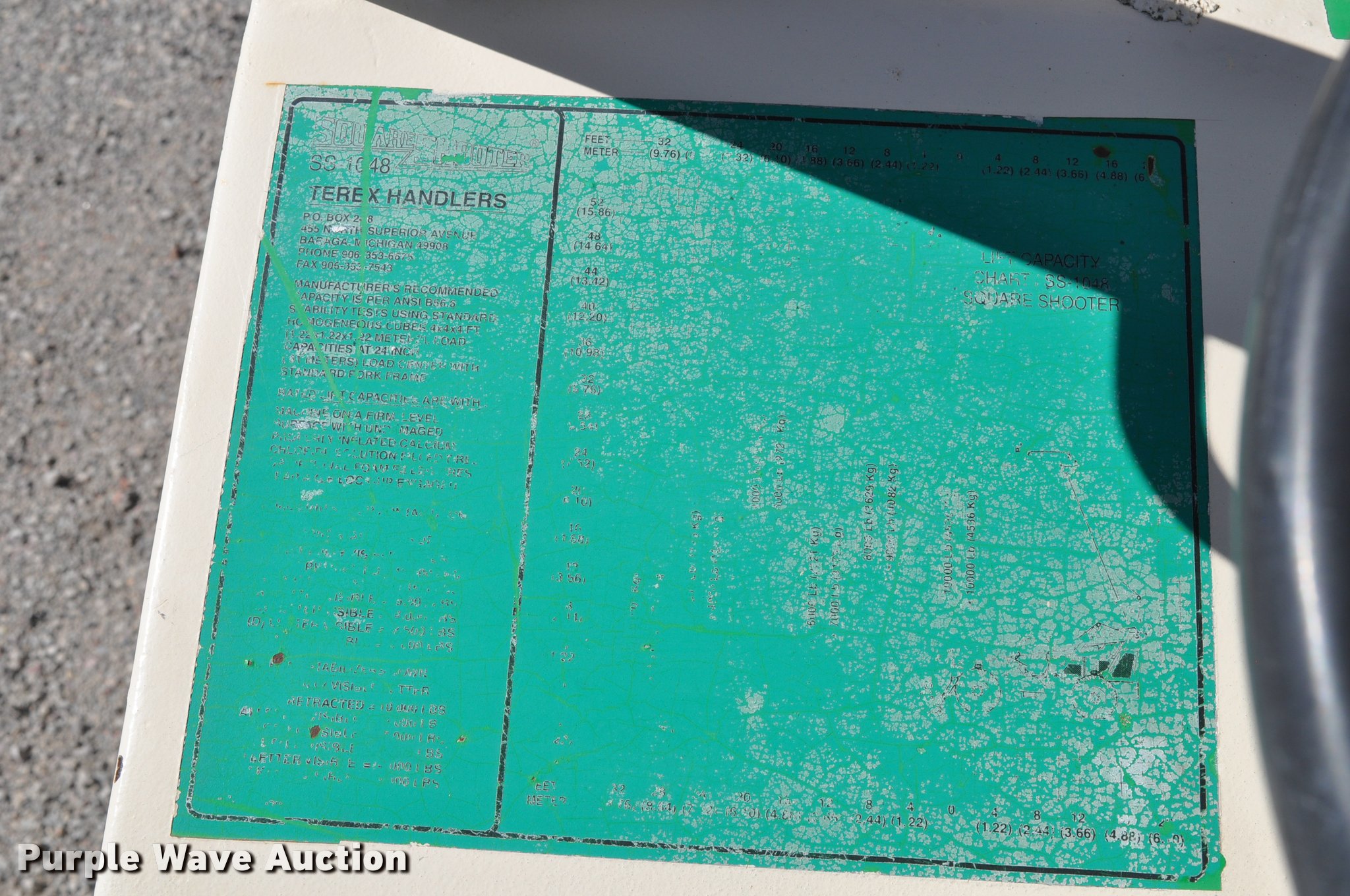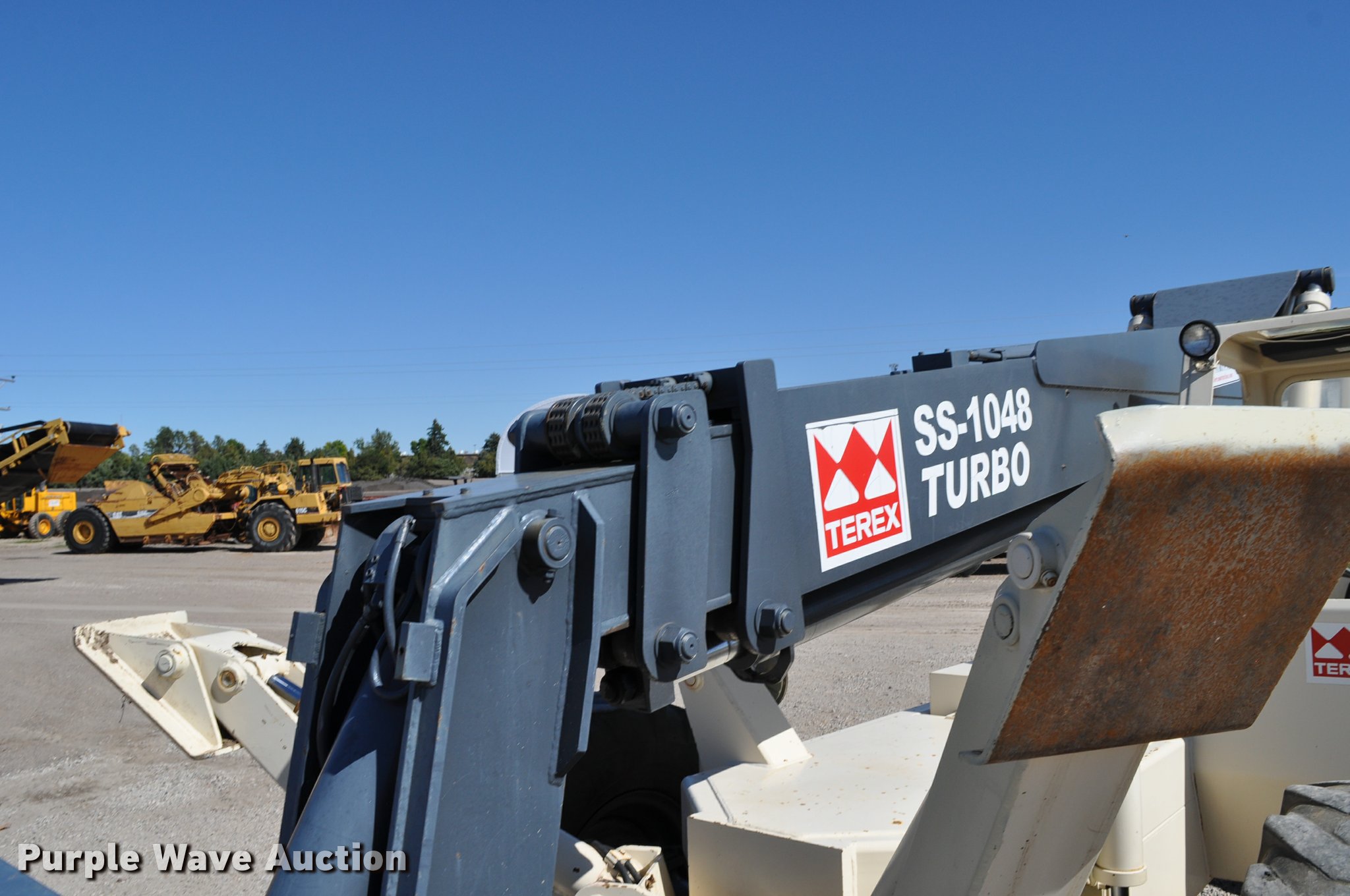 Purple Wave is selling a used Telehandler in Nebraska. This item is a Terex SS1048 telehandler with the following: 928 hours on meter, Four cylinder turbo diesel engine, Powershift transmission, 3F-3R gears, Four wheel drive, Canopy, Work lights, Crab steering, Four wheel steering, 10,000 lbs max lift capacity, 48' max lift height, 28' max reach length, Three boom stages, 48"L forks, Hydraulic leveling, Hydraulic outriggers, 14.00-24 tires, Right stabilizer leaks down, Serial 992384